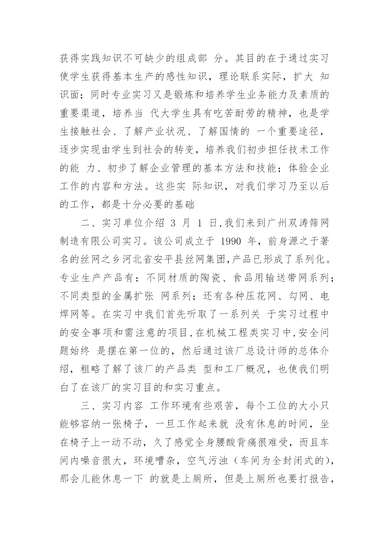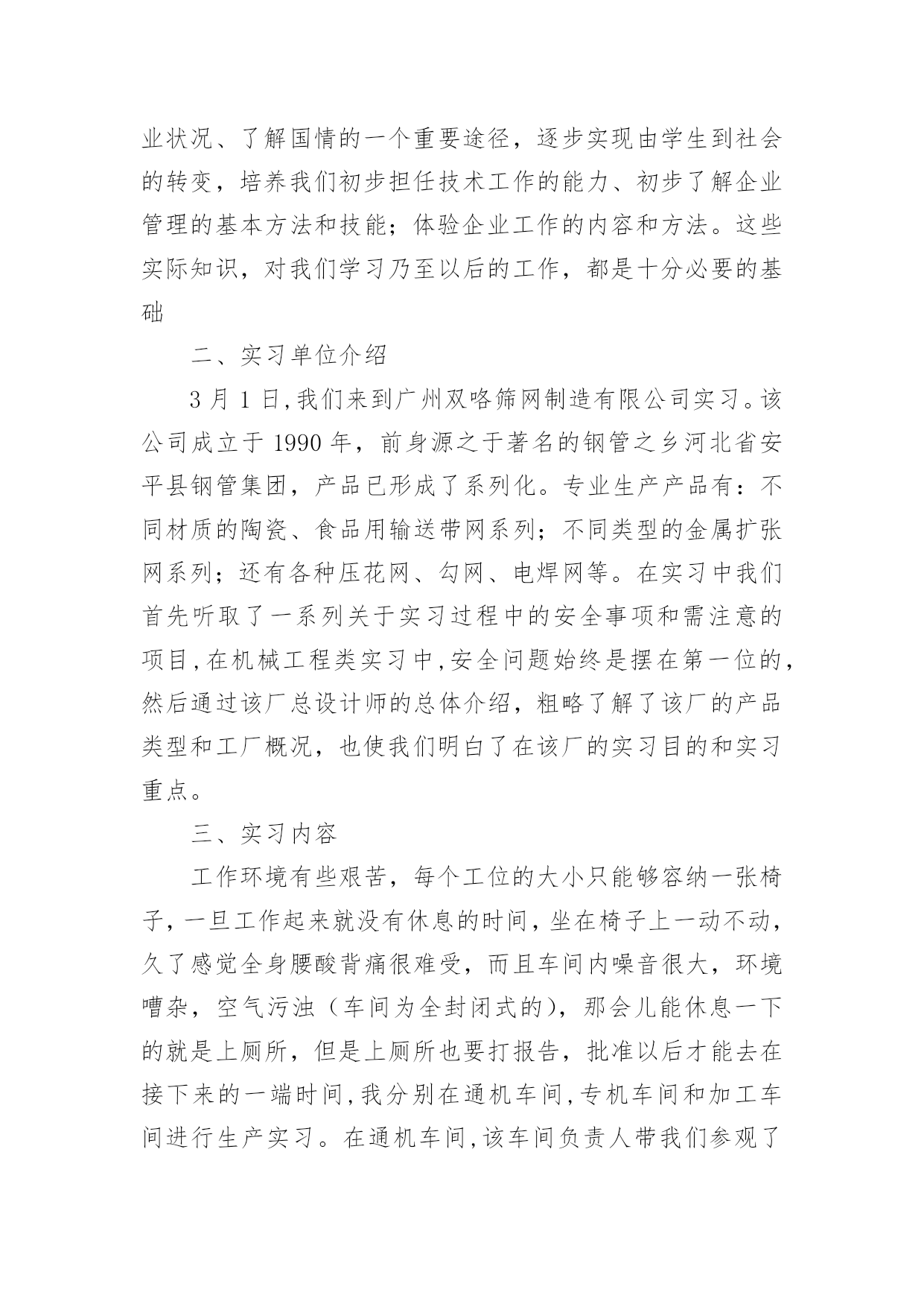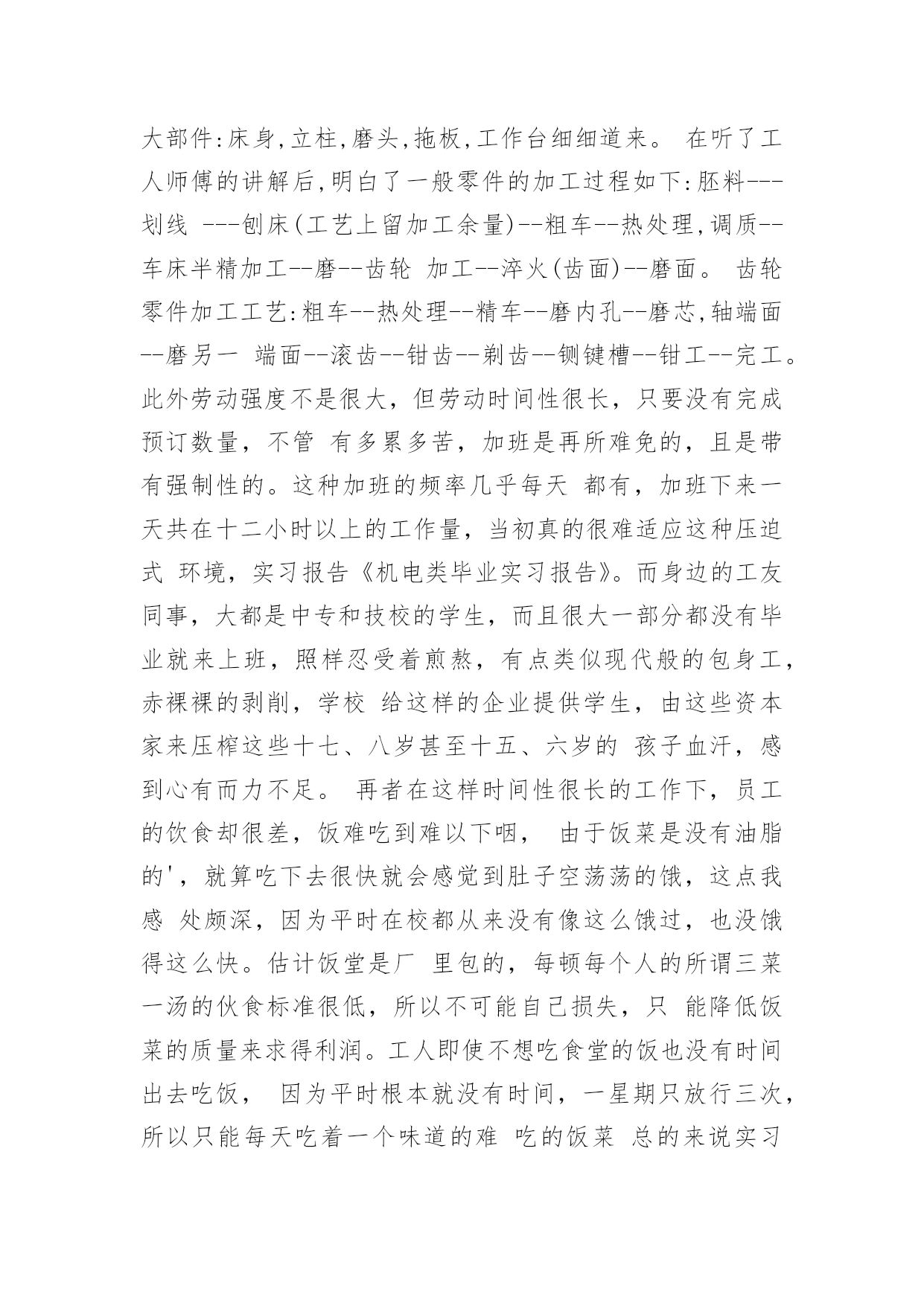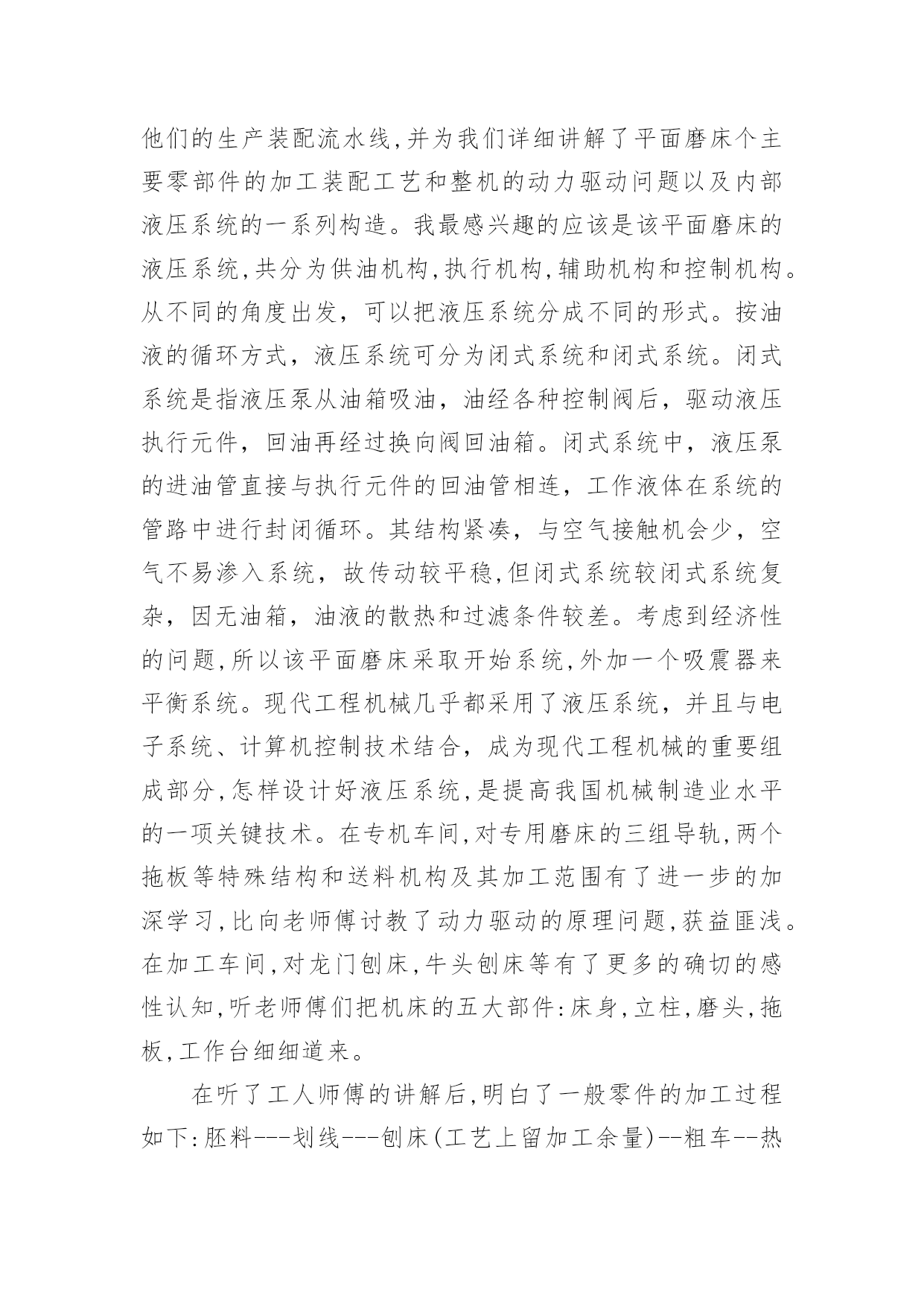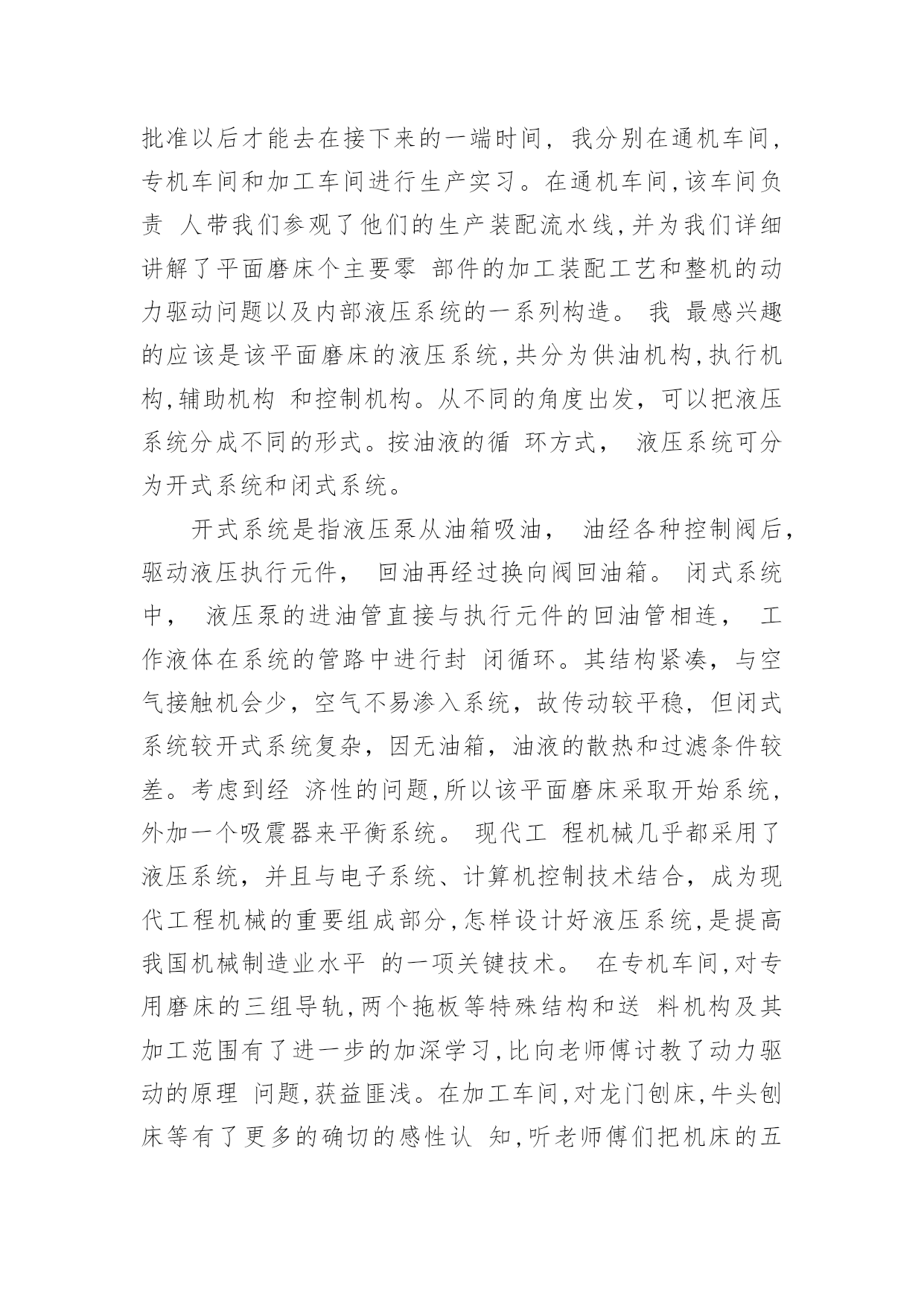 机电类实习报告机电类实习报告汇编13篇在我们平凡的日常里,越来越多人会去使用报告,不同的报告内容同样也是不同的。一听到写报告就拖延症懒癌齐复发?以下是小编整理的机电类实习报告,欢迎大家借鉴与参考,希望对大家有所帮助。机电类实习报告1现在回想起实习期间,往事还历历在目,有酸的,有甜的,有苦的,有辣的,自心中滋味也只有自己最清楚,机电类毕业实习报告。但是不可否认的却是这些经历将会是我人生当中不可多得的财富和经验的累积。毕业实习是每个大学生必须拥有的一段经历,它使我们在实践中了解社会,让我们学到了很多在课堂上根本就学不到的知识,也打开了视野,增长了见识,为我们以后进一步走向社会打下坚实的基础。近两个月的工作,通过了解工厂的生产情况,与本专业有关的各种知识,第一次亲身感受了所学知识与实际的应用,让我们大开眼界,也是对以前所学知识的一个初审。通过这次生产实习,进一步巩固和深化所学的理论知识,弥补以前单一理论教学的不足,为后续专业课学习和毕业设计打好基础。一、实习目的生产实习是我们制造专业理论学习之外,获得实践知识不可缺少的组成部分。其目的在于通过实习使学生获得基本生产的感性知识,理论联系实际,扩大知识面;同时专业实习又是锻炼和培养学生业务能力及素质的重要渠道,培养当代大学生具有吃苦耐劳的精神,也是学生接触社会、了解产业状况、了解国情的一个重要途径,逐步实现由学生到社会的转变,培养我们初步担任技术工作的能力、初步了解企业管理的基本方法和技能;体验企业工作的内容和方法。这些实际知识,对我们学习乃至以后的工作,都是十分必要的基础二、实习单位介绍3月1日,我们来到广州双涛筛网制造有限公司实习。该公司成立于1990年,前身源之于著名的丝网之乡河北省安平县丝网集团,产品已形成了系列化。专业生产产品有:不同材质的陶瓷、食品用输送带网系列;不同类型的金属扩张网系列;还有各种压花网、勾网、电焊网等。在实习中我们首先听取了一系列关于实习过程中的安全事项和需注意的项目,在机械工程类实习中,安全问题始终是摆在第一位的,然后通过该厂总设计师的总体介绍,粗略了解了该厂的产品类型和工厂概况,也使我们明白了在该厂的实习目的和实习重点。三、实习内容工作环境有些艰苦,每个工位的大小只能够容纳一张椅子,一旦工作起来就没有休息的时间,坐在椅子上一动不动,久了感觉全身腰酸背痛很难受,而且车间内噪音很大,环境嘈杂,空气污浊(车间为全封闭式的),那会儿能休息一下的就是上厕所,但是上厕所也要打报告,批准以后才能去在接下来的一端时间,我分别在通机车间,专机车间和加工车间进行生产实习。在通机车间,该车间负责人带我们参观了他们的生产装配流水线,并为我们详细讲解了平面磨床个主要零部件的加工装配工艺和整机的动力驱动问题以及内部液压系统的一系列构造。我最感兴趣的应该是该平面磨床的液压系统,共分为供油机构,执行机构,辅助机构和控制机构。从不同的角度出发,可以把液压系统分成不同的形式。按油液的循环方式,液压系统可分为开式系统和闭式系统。开式系统是指液压泵从油箱吸油,油经各种控制阀后,驱动液压执行元件,回油再经过换向阀回油箱。闭式系统中,液压泵的进油管直接与执行元件的回油管相连,工作液体在系统的管路中进行封闭循环。其结构紧凑,与空气接触机会少,空气不易渗入系统,故传动较平稳,但闭式系统较开式系统复杂,因无油箱,油液的散热和过滤条件较差。考虑到经济性的问题,所以该平面磨床采取开始系统,外加一个吸震器来平衡系统。现代工程机械几乎都采用了液压系统,并且与电子系统、计算机控制技术结合,成为现代工程机械的重要组成部分,怎样设计好液压系统,是提高我国机械制造业水平的一项关键技术。在专机车间,对专用磨床的三组导轨,两个拖板等特殊结构和送料机构及其加工范围有了进一步的加深学习,比向老师傅讨教了动力驱动的原理问题,获益匪浅。在加工车间,对龙门刨床,牛头刨床等有了更多的确切的感性认知,听老师傅们把机床的五大部件:床身,立柱,磨头,拖板,工作台细细道来。在听了工人师傅的讲解后,明白了一般零件的加工过程如下:胚料---划线---刨床(工艺上留加工余量)--粗车--热处理,调质--车床半精加工--磨--齿轮加工--淬火(齿面)--磨面。齿轮零件加工工艺:粗车--热处理--精车--磨内孔--磨芯,轴端面--磨另一端面--滚齿--钳齿--剃齿--铡键槽--钳工--完工。此外劳动强度不是很大,但劳动时间性很长,只要没有完成预订数量,不管有多累多苦,加班是再所难免的,且是带有强制性的。这种加班的频率几乎每天都有,加班下来一天共在十二小时以上的工作量,当初真的很难适应这种压迫式环境,实习报告《机电类毕业实习报告》。而身边的工友同事,大都是中专和技校的学生,而且很大一部分都没有毕业就来上班,照样忍受着煎熬,有点类似现代般的包身工,赤裸