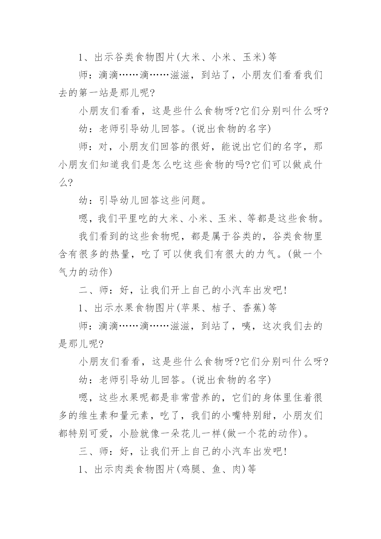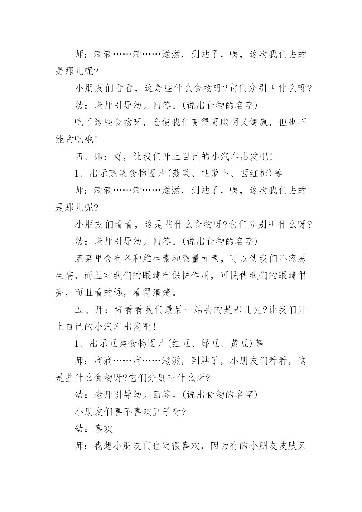 中班健康教案《食物王国》作为一名优秀的教育工作者,就难以避免地要准备教案,借助教案可以恰当地选择和运用教学方法,调动学生学习的积极性。那么大家知道正规的教案是怎么写的吗?下面是小编精心整理的中班健康教案《食物王国》,希望对大家有所帮助。活动目标1、使幼儿了解不同的食物有不同的营养,可满足身体各方面不同的需要。2、帮助幼儿克服不良的饮食习惯:如挑食、偏食等。3、知道人体需要各种不同的营养。4、培养良好的卫生习惯。5、初步了解健康的小常识。活动准备自制图片:肉类、蔬菜、水果、豆类、谷类活动过程小朋友们,大家好!很高兴认识大家,我作一下自我介绍,我姓张,大家可以叫我张老师。师:今天呀,张老师要带小朋友去一个食物王国旅游一趟,小朋友们想去吗?幼:想。一、师:好,让我们开上自己的小汽车出发吧!1、出示谷类食物图片(大米、小米、玉米)等师:滴滴……滴……滋滋,到站了,小朋友们看看我们去的第一站是那儿呢?小朋友们看看,这是些什么食物呀?它们分别叫什么呀?幼:老师引导幼儿回答。(说出食物的名字)师:对,小朋友们回答的很好,能说出它们的名字,那小朋友们知道我们是怎么吃这些食物的吗?它们可以做成什么?幼:引导幼儿回答这些问题。嗯,我们平里吃的大米、小米、玉米、等都是这些食物。我们看到的这些食物呢,都是属于谷类的,谷类食物里含有很多的热量,吃了可以使我们有很大的力气。(做一个气力的动作)二、师:好,让我们开上自己的小汽车出发吧!1、出示水果食物图片(苹果、桔子、香蕉)等师:滴滴……滴……滋滋,到站了,咦,这次我们去的是那儿呢?小朋友们看看,这是些什么食物呀?它们分别叫什么呀?幼:老师引导幼儿回答。(说出食物的名字)嗯,这些水果呢都是非常营养的,它们的身体里住着很多的维生素和量元素,吃了,我们的小嘴特别甜,小朋友们都特别可爱,小脸就像一朵花儿一样(做一个花的动作)。三、师:好,让我们开上自己的小汽车出发吧!1、出示肉类食物图片(鸡腿、鱼、肉)等师:滴滴……滴……滋滋,到站了,咦,这次我们去的是那儿呢?小朋友们看看,这是些什么食物呀?它们分别叫什么呀?幼:老师引导幼儿回答。(说出食物的名字)吃了这些食物呀,会使我们变得更聪明又健康,但也不能贪吃哦!四、师:好,让我们开上自己的小汽车出发吧!1、出示蔬菜食物图片(菠菜、胡萝卜、西红柿)等师:滴滴……滴……滋滋,到站了,咦,这次我们去的是那儿呢?小朋友们看看,这是些什么食物呀?它们分别叫什么呀?幼:老师引导幼儿回答。(说出食物的名字)蔬菜里含有各种维生素和微量元素,可以使我们不容易生病,而且对我们的眼睛有保护作用,可民使我们的眼睛很亮,而且看的远,看得清楚。五、师:好看看我们最后一站去的是那儿呢?让我们开上自己的小汽车出发吧!1、出示豆类食物图片(红豆、绿豆、黄豆)等师:滴滴……滴……滋滋,到站了,小朋友们看看,这是些什么食物呀?它们分别叫什么呀?幼:老师引导幼儿回答。(说出食物的名字)小朋友们喜不喜欢豆子呀?幼:喜欢师:我想小朋友们也定很喜欢,因为有的小朋友皮肤又白又嫩,就像白雪公主一样漂亮,这些豆类的身体里含有植物蛋白,吃了他,让我们长得健健康康的。我们逛了一天,小朋友们想一想我们今天去了几个地方旅游啊?幼:5个那小朋友们说一说我们分别是去的那地方呀?幼:分别说出5个地方。结束:现在小朋友们知道了这么多食物的优点,是不是