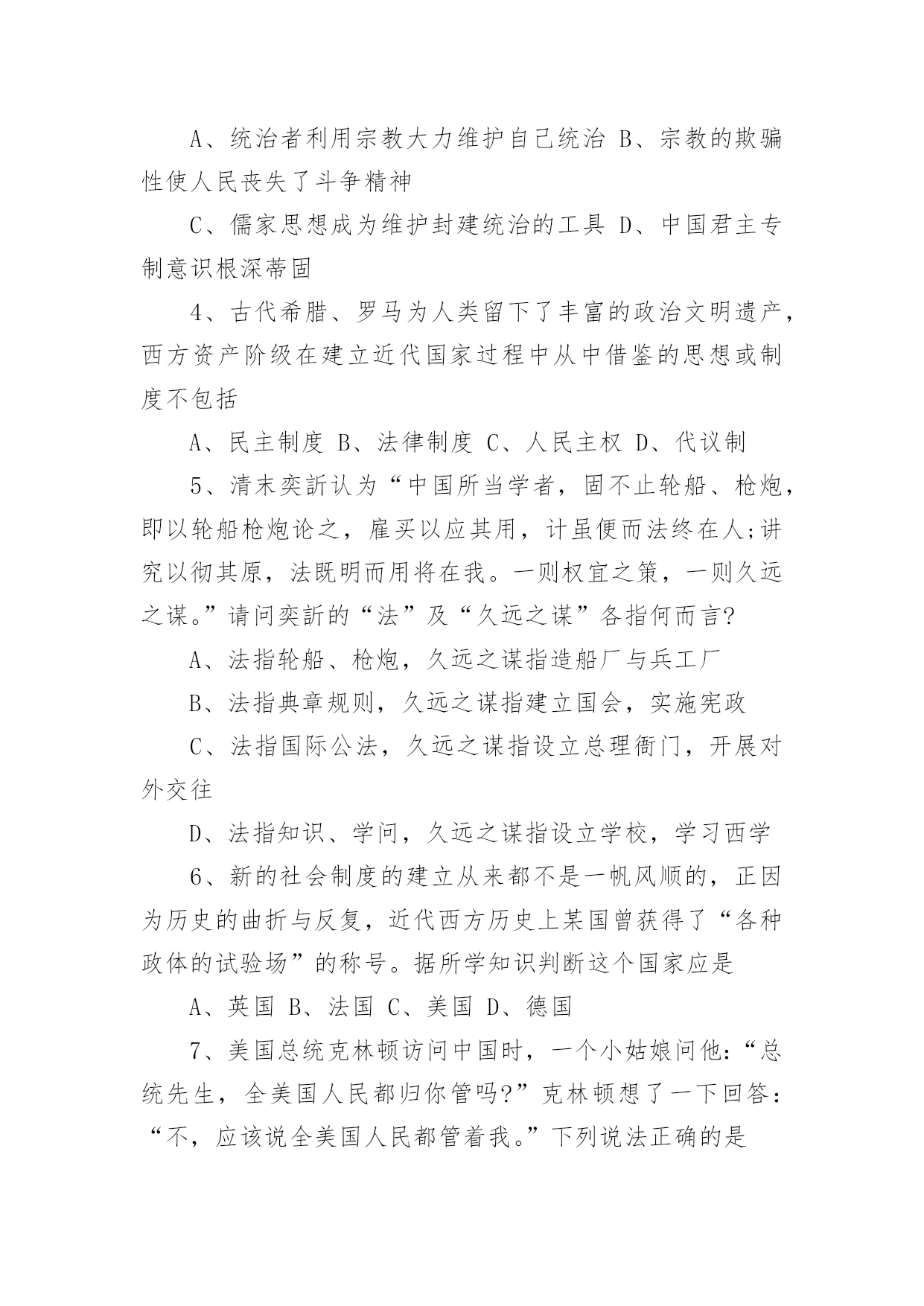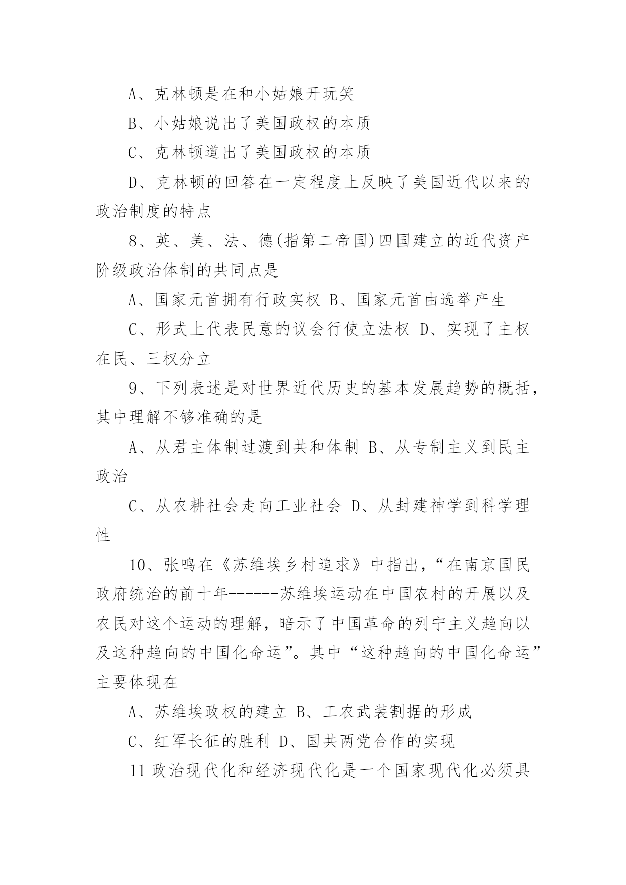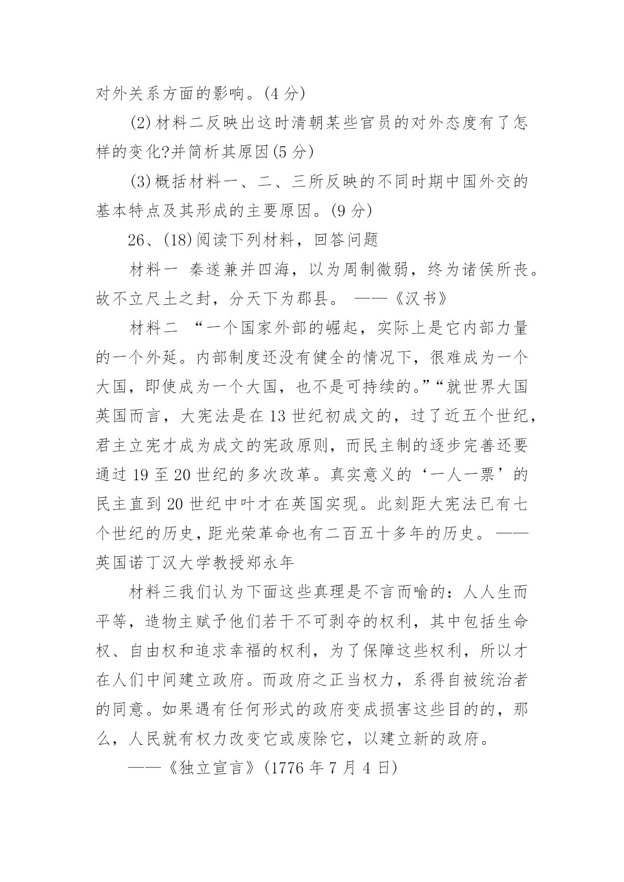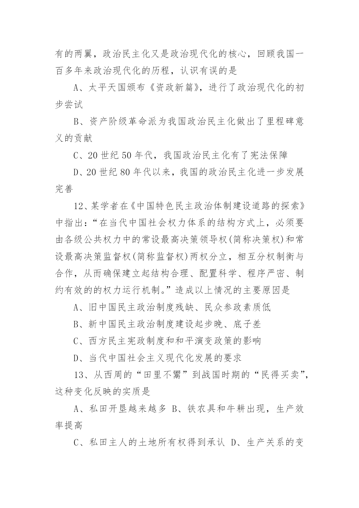 高三考试测试真题及答案2017年高三考试测试真题及答案导读:高三是人生的最关键时刻,有人说一考定终生,因此语文的学习是很关键的。下面是应届毕业生小编为大家搜集整理出来的有关于2017年高三考试测试真题及答案,想了解更多相关信息请持续关注我们应届毕业生考试网!一、选择(每小题2分,共48分)1、王国维在《殷周制度论》中说,“故天子诸侯之传世也,继统法之立子与立嫡也------立贤之利过于立嫡,人才之用优于资格,而终不以此易彼者,盖惧夫名之可藉,而争之易生,其弊将不可胜穷。”这段话意在揭示A、指出嫡长子继承制的弱点B、嫡长子的出现有其历史必然性C、嫡长子继承制不符合历史发展规律D、没有比嫡长子继承制更好的权力交接制度了2、雅典梭伦改革、秦朝实行郡县制和隋唐时期的科举制度,在历史上发挥的共同作用是A、加强了中央集权B、缓和了社会矛盾C、打破了世袭特权D、推进了民主政治进程3、梁启超在论及中国古代政治制度时,指出“盖权臣之消长,与专制政体之进化成比例,而中国专制政治之发达,其大原力有二端,一由于教义之浸淫,二由于雄主之布划。”材料中“教义之浸淫”指的是A、统治者利用宗教大力维护自己统治B、宗教的欺骗性使人民丧失了斗争精神C、儒家思想成为维护封建统治的工具D、中国君主专制意识根深蒂固4、古代希腊、罗马为人类留下了丰富的政治文明遗产,西方资产阶级在建立近代国家过程中从中借鉴的思想或制度不包括A、民主制度B、法律制度C、人民主权D、代议制5、清末奕訢认为“中国所当学者,固不止轮船、枪炮,即以轮船枪炮论之,雇买以应其用,计虽便而法终在人;讲究以彻其原,法既明而用将在我。一则权宜之策,一则久远之谋。”请问奕訢的“法”及“久远之谋”各指何而言?A、法指轮船、枪炮,久远之谋指造船厂与兵工厂B、法指典章规则,久远之谋指建立国会,实施宪政C、法指国际公法,久远之谋指设立总理衙门,开展对外交往D、法指知识、学问,久远之谋指设立学校,学习西学6、新的社会制度的建立从来都不是一帆风顺的,正因为历史的曲折与反复,近代西方历史上某国曾获得了“各种政体的试验场”的称号。据所学知识判断这个国家应是A、英国B、法国C、美国D、德国7、美国总统克林顿访问中国时,一个小姑娘问他:“总统先生,全美国人民都归你管吗?”克林顿想了一下回答:“不,应该说全美国人民都管着我。”下列说法正确的是A、克林顿是在和小姑娘开玩笑B、小姑娘说出了美国政权的本质C、克林顿道出了美国政权的本质D、克林顿的回答在一定程度上反映了美国近代以来的政治制度的特点8、英、美、法、德(指第二帝国)四国建立的近代资产阶级政治体制的共同点是A、国家元首拥有行政实权B、国家元首由选举产生C、形式上代表民意的议会行使立法权D、实现了主权在民、三权分立9、下列表述是对世界近代历史的基本发展趋势的概括,其中理解不够准确的是A、从君主体制过渡到共和体制B、从专制主义到民主政治C、从农耕社会走向工业社会D、从封建神学到科学理性10、张鸣在《苏维埃乡村追求》中指出,“在南京国民政府统治的前十年------苏维埃运动在中国农村的开展以及农民对这个运动的理解,暗示了中国革命的列宁主义趋向以及这种趋向的中国化命运”。其中“这种趋向的中国化命运”主要体现在A、苏维埃政权的建立B、工农武装割据的形成C、红军长征的胜利D、国共两党合作的实现11政治现代化和经济现代化是一个国家现代化必须具有的两翼,政治民主化又是政治现代化的核心,回顾我国一百多年来政治现代化的历程,认识有误的是A、太平天国颁布《资政新篇》,进行了政治现代化的初步尝试B、资产阶级革命派为我国政治民主化做出了里程碑意义的贡献C、20世纪50年代,我国政治民主化有了宪法保障D、20世纪80年代以来,我国的政治民主化进一步发展完善12、某学者在《中国特色民主政治体制建设道路的探索》中指出:“在当代中国社会权力体系的结构方式上,必须要由各级公共权力中的常设最高决策领导权(简称决策权)和常设最高决策监督权(简称监督权)两权分立,相互分权制衡与合作,从而确保建立起结构合理、配置科学、程序严密、制约有效的的权力运行机制。”造成以上情况的主要原因是A、旧中国民主政治制度残缺、民众参政素质低B、新中国民主政治制度建设起步晚、底子差C、西方民主宪政制度和和平演变政策的影响D、当代中国社会主义现代化发展的要求13、从西周的“田里不鬻”到战国时期的“民得买卖”,这种变化反映的实质是A、私田开垦越来越多B、铁农具和牛耕出现,生产效率提高C、私田主人的土地所有权得到承认D、生产关系的变革14、据《肇城志·东南十一·徽州府》记载:明朝中叶以后新安商人兴起,“商贾四出”,活跃于国内及日本、东南亚等地。对此种现象认识正确的是A、体现明清之际东南一带出现资本主义萌芽B、说明中国已经卷入资本主义世界市场C、