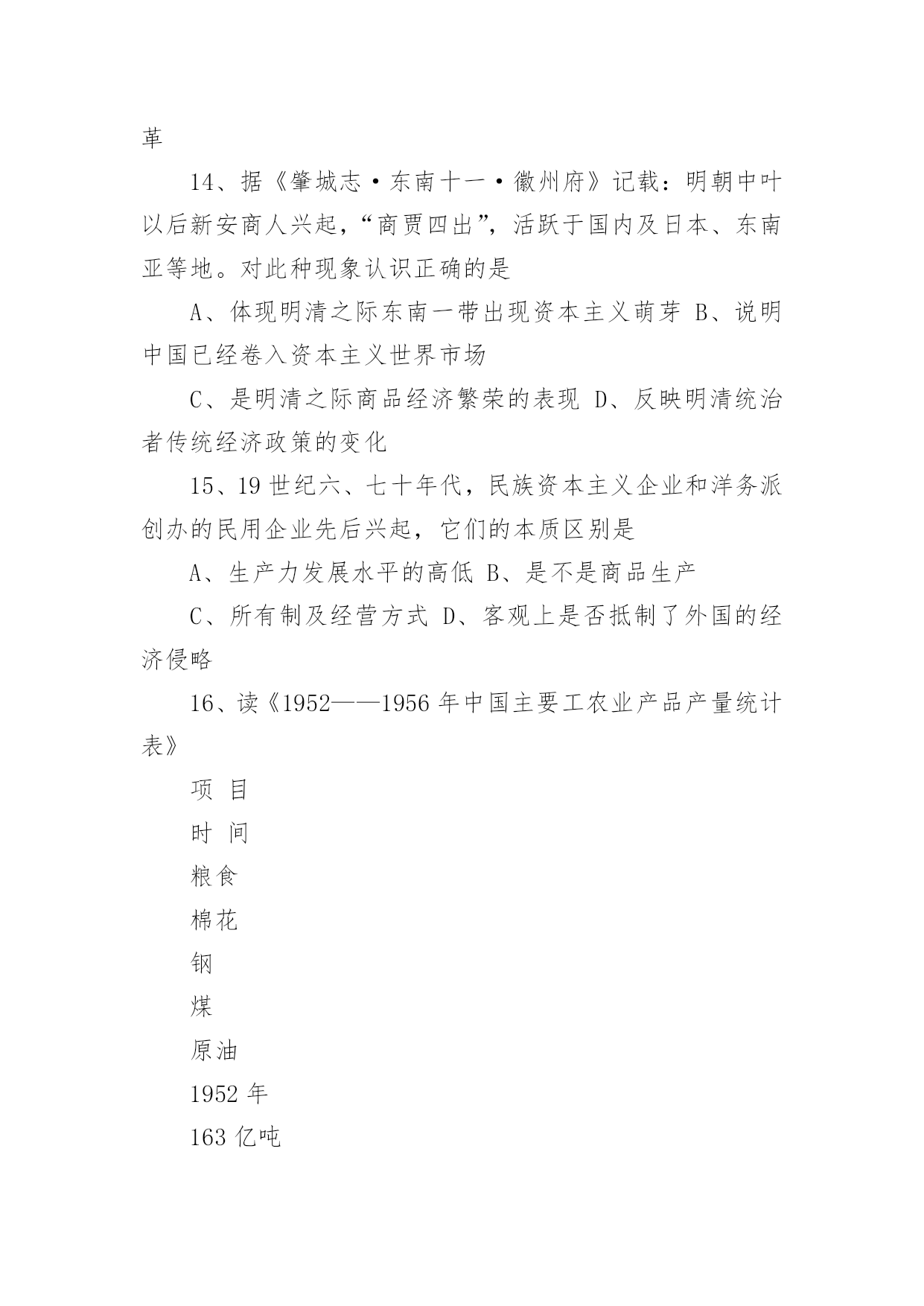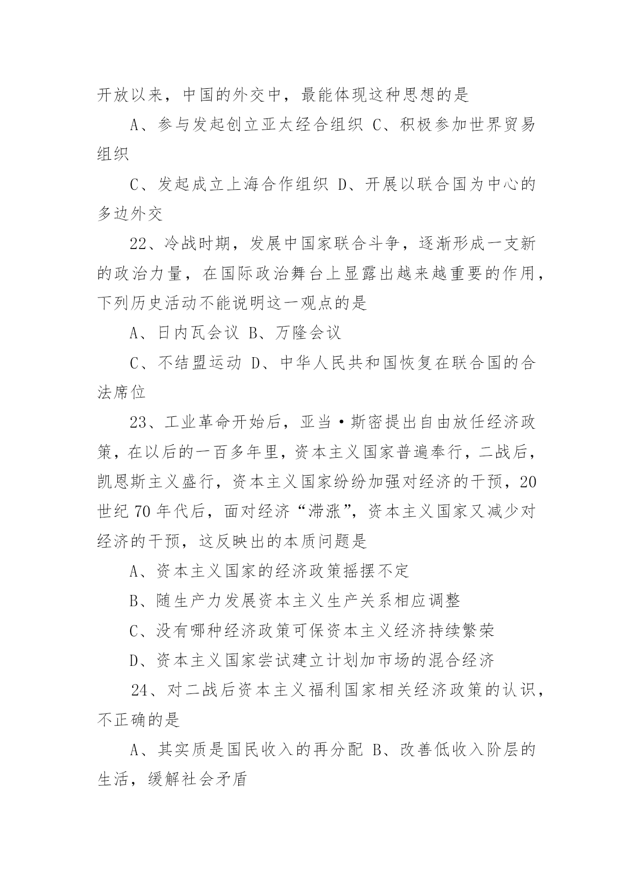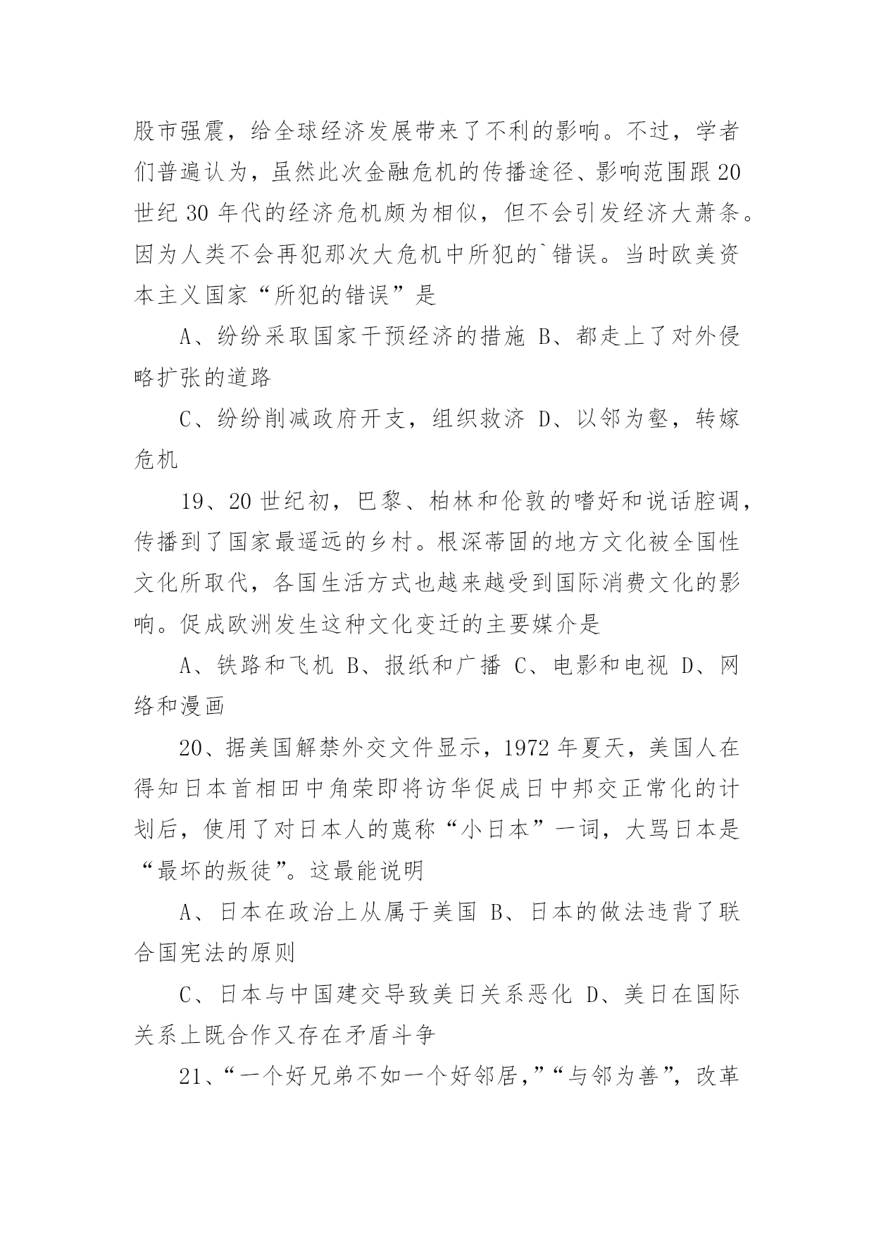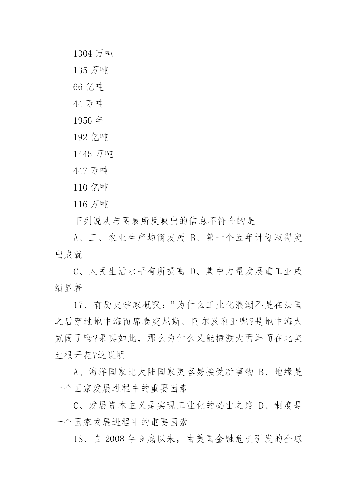 高三考试测试真题及答案2017年高三考试测试真题及答案导读:高三是人生的最关键时刻,有人说一考定终生,因此语文的学习是很关键的。下面是应届毕业生小编为大家搜集整理出来的有关于2017年高三考试测试真题及答案,想了解更多相关信息请持续关注我们应届毕业生考试网!一、选择(每小题2分,共48分)1、王国维在《殷周制度论》中说,“故天子诸侯之传世也,继统法之立子与立嫡也------立贤之利过于立嫡,人才之用优于资格,而终不以此易彼者,盖惧夫名之可藉,而争之易生,其弊将不可胜穷。”这段话意在揭示A、指出嫡长子继承制的弱点B、嫡长子的出现有其历史必然性C、嫡长子继承制不符合历史发展规律D、没有比嫡长子继承制更好的权力交接制度了2、雅典梭伦改革、秦朝实行郡县制和隋唐时期的科举制度,在历史上发挥的共同作用是A、加强了中央集权B、缓和了社会矛盾C、打破了世袭特权D、推进了民主政治进程3、梁启超在论及中国古代政治制度时,指出“盖权臣之消长,与专制政体之进化成比例,而中国专制政治之发达,其大原力有二端,一由于教义之浸淫,二由于雄主之布划。”材料中“教义之浸淫”指的是A、统治者利用宗教大力维护自己统治B、宗教的欺骗性使人民丧失了斗争精神C、儒家思想成为维护封建统治的工具D、中国君主专制意识根深蒂固4、古代希腊、罗马为人类留下了丰富的政治文明遗产,西方资产阶级在建立近代国家过程中从中借鉴的思想或制度不包括A、民主制度B、法律制度C、人民主权D、代议制5、清末奕訢认为“中国所当学者,固不止轮船、枪炮,即以轮船枪炮论之,雇买以应其用,计虽便而法终在人;讲究以彻其原,法既明而用将在我。一则权宜之策,一则久远之谋。”请问奕訢的“法”及“久远之谋”各指何而言?A、法指轮船、枪炮,久远之谋指造船厂与兵工厂B、法指典章规则,久远之谋指建立国会,实施宪政C、法指国际公法,久远之谋指设立总理衙门,开展对外交往D、法指知识、学问,久远之谋指设立学校,学习西学6、新的社会制度的建立从来都不是一帆风顺的,正因为历史的曲折与反复,近代西方历史上某国曾获得了“各种政体的试验场”的称号。据所学知识判断这个国家应是A、英国B、法国C、美国D、德国7、美国总统克林顿访问中国时,一个小姑娘问他:“总统先生,全美国人民都归你管吗?”克林顿想了一下回答:“不,应该说全美国人民都管着我。”下列说法正确的是A、克林顿是在和小姑娘开玩笑B、小姑娘说出了美国政权的本质C、克林顿道出了美国政权的本质D、克林顿的回答在一定程度上反映了美国近代以来的政治制度的特点8、英、美、法、德(指第二帝国)四国建立的近代资产阶级政治体制的共同点是A、国家元首拥有行政实权B、国家元首由选举产生C、形式上代表民意的议会行使立法权D、实现了主权在民、三权分立9、下列表述是对世界近代历史的基本发展趋势的概括,其中理解不够准确的是A、从君主体制过渡到共和体制B、从专制主义到民主政治C、从农耕社会走向工业社会D、从封建神学到科学理性10、张鸣在《苏维埃乡村追求》中指出,“在南京国民政府统治的前十年------苏维埃运动在中国农村的开展以及农民对这个运动的理解,暗示了中国革命的列宁主义趋向以及这种趋向的中国化命运”。其中“这种趋向的中国化命运”主要体现在A、苏维埃政权的建立B、工农武装割据的形成C、红军长征的胜利D、国共两党合作的实现11政治现代化和经济现代化是一个国家现代化必须具有的两翼,政治民主化又是政治现代化的核心,回顾我国一百多年来政治现代化的历程,认识有误的是A、太平天国颁布《资政新篇》,进行了政治现代化的初步尝试B、资产阶级革命派为我国政治民主化做出了里程碑意义的贡献C、20世纪50年代,我国政治民主化有了宪法保障D、20世纪80年代以来,我国的政治民主化进一步发展完善12、某学者在《中国特色民主政治体制建设道路的探索》中指出:“在当代中国社会权力体系的结构方式上,必须要由各级公共权力中的常设最高决策领导权(简称决策权)和常设最高决策监督权(简称监督权)两权分立,相互分权制衡与合作,从而确保建立起结构合理、配置科学、程序严密、制约有效的的权力运行机制。”造成以上情况的主要原因是A、旧中国民主政治制度残缺、民众参政素质低B、新中国民主政治制度建设起步晚、底子差C、西方民主宪政制度和和平演变政策的影响D、当代中国社会主义现代化发展的要求13、从西周的“田里不鬻”到战国时期的“民得买卖”,这种变化反映的实质是A、私田开垦越来越多B、铁农具和牛耕出现,生产效率提高C、私田主人的土地所有权得到承认D、生产关系的变革14、据《肇城志·东南十一·徽州府》记载:明朝中叶以后新安商人兴起,“商贾四出”,活跃于国内及日本、东南亚等地。对此种现象认识正确的是A、体现明清之际东南一带出现资本主义萌芽B、说明中国已经卷入资本主义世界市场C、