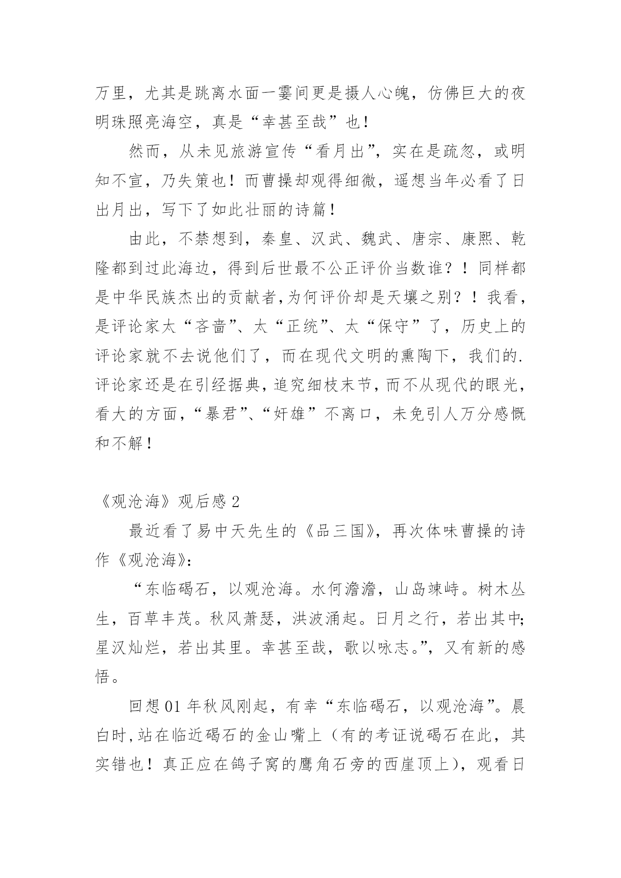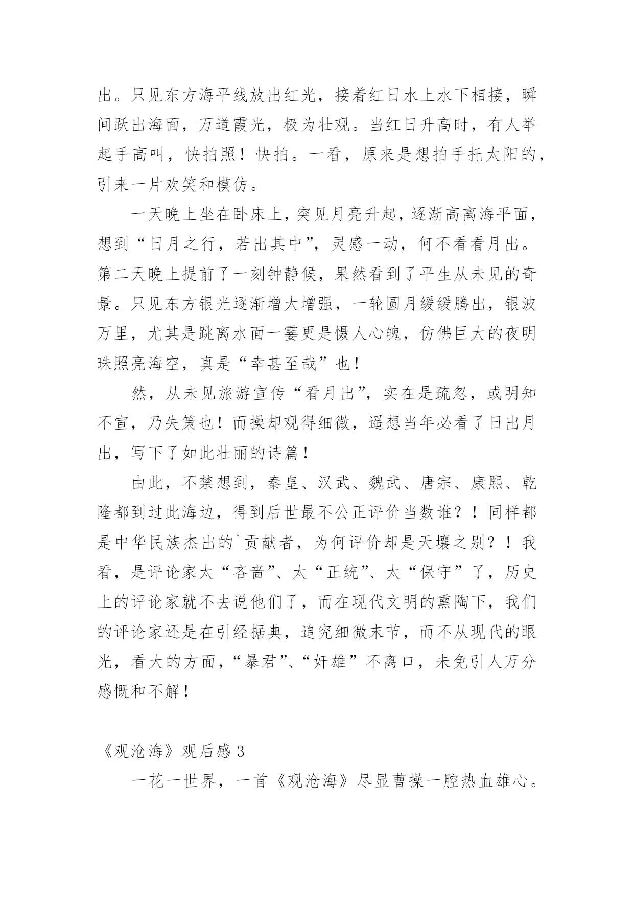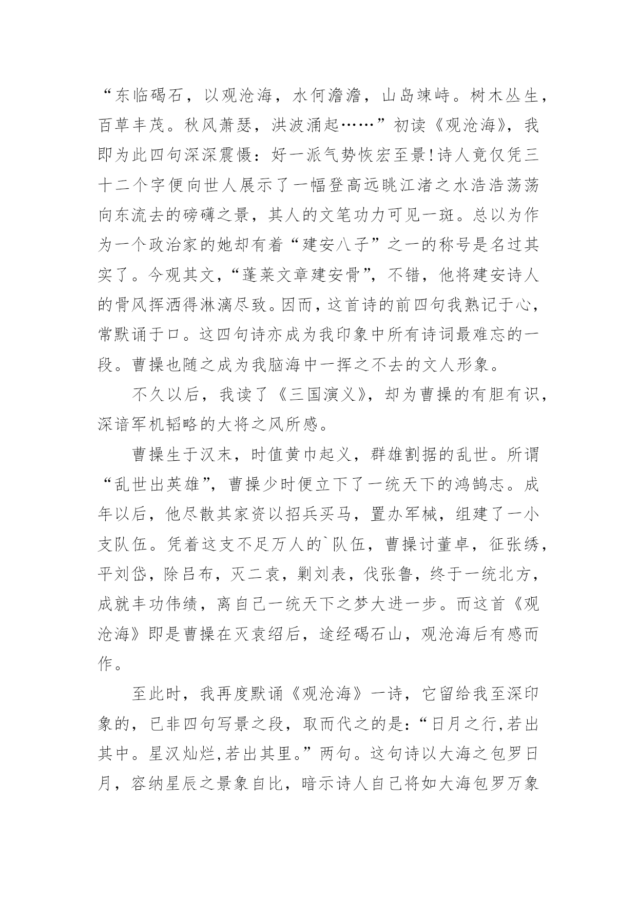 《观沧海》观后感当认真看完一部影视作品后,相信大家一定领会了不少东西,观后感就是看了一部影片,连续剧或参观展览等后,把具体感受和得到的启示写成的文章。可是观后感怎么写才合适呢?以下是小编为大家收集的《观沧海》观后感,欢迎阅读,希望大家能够喜欢。《观沧海》观后感1最近看了易中天先生的《品三国》,再次体味曹操的诗作《观沧海》:“东临碣石,以观沧海。水何澹澹,山岛竦峙。树木丛生,百草丰茂。秋风萧瑟,洪波涌起。日月之行,若出其中;星汉灿烂,若出其里。幸甚至哉,歌以咏志。”又有新的感悟。回想我也曾有幸“东临碣石,以观沧海”。晨白时,站在临近碣石的金山嘴上观看日出。只见东方海平线放出红光,接着红日水上水下相接,瞬间跃出海面,万道霞光,极为壮观。当红日升高时,有人举起手高叫,快拍照!快拍。一看,原来是想拍手托太阳的,引来一片欢笑和模仿。一天晚上坐在卧床上,突见月亮升起,逐渐高离海平面,想到“日月之行,若出其中”,灵感一动,何不看看月出。第二天晚上提前了一刻钟静候,果然看到了平生从未见的奇景。只见东方银光逐渐增大增强,一轮圆月缓缓腾出,银波万里,尤其是跳离水面一霎间更是摄人心魄,仿佛巨大的夜明珠照亮海空,真是“幸甚至哉”也!然而,从未见旅游宣传“看月出”,实在是疏忽,或明知不宣,乃失策也!而曹操却观得细微,遥想当年必看了日出月出,写下了如此壮丽的诗篇!由此,不禁想到,秦皇、汉武、魏武、唐宗、康熙、乾隆都到过此海边,得到后世最不公正评价当数谁?!同样都是中华民族杰出的贡献者,为何评价却是天壤之别?!我看,是评论家太“吝啬”、太“正统”、太“保守”了,历史上的评论家就不去说他们了,而在现代文明的熏陶下,我们的.评论家还是在引经据典,追究细枝末节,而不从现代的眼光,看大的方面,“暴君”、“奸雄”不离口,未免引人万分感慨和不解!《观沧海》观后感2最近看了易中天先生的《品三国》,再次体味曹操的诗作《观沧海》:“东临碣石,以观沧海。水何澹澹,山岛竦峙。树木丛生,百草丰茂。秋风萧瑟,洪波涌起。日月之行,若出其中;星汉灿烂,若出其里。幸甚至哉,歌以咏志。”,又有新的感悟。回想01年秋风刚起,有幸“东临碣石,以观沧海”。晨白时,站在临近碣石的金山嘴上(有的考证说碣石在此,其实错也!真正应在鸽子窝的鹰角石旁的西崖顶上),观看日出。只见东方海平线放出红光,接着红日水上水下相接,瞬间跃出海面,万道霞光,极为壮观。当红日升高时,有人举起手高叫,快拍照!快拍。一看,原来是想拍手托太阳的,引来一片欢笑和模仿。一天晚上坐在卧床上,突见月亮升起,逐渐高离海平面,想到“日月之行,若出其中”,灵感一动,何不看看月出。第二天晚上提前了一刻钟静候,果然看到了平生从未见的奇景。只见东方银光逐渐增大增强,一轮圆月缓缓腾出,银波万里,尤其是跳离水面一霎更是慑人心魄,仿佛巨大的夜明珠照亮海空,真是“幸甚至哉”也!然,从未见旅游宣传“看月出”,实在是疏忽,或明知不宣,乃失策也!而操却观得细微,遥想当年必看了日出月出,写下了如此壮丽的诗篇!由此,不禁想到,秦皇、汉武、魏武、唐宗、康熙、乾隆都到过此海边,得到后世最不公正评价当数谁?!同样都是中华民族杰出的`贡献者,为何评价却是天壤之别?!我看,是评论家太“吝啬”、太“正统”、太“保守”了,历史上的评论家就不去说他们了,而在现代文明的熏陶下,我们的评论家还是在引经据典,追究细微末节,而不从现代的眼光,看大的方面,“暴君”、“奸雄”不离口,未免引人万分感慨和不解!《观沧海》观后感3一花一世界,一首《观沧海》尽显曹操一腔热血雄心。“东临碣石,以观沧海,水何澹澹,山岛竦峙。树木丛生,百草丰茂。秋风萧瑟,洪波涌起……”初读《观沧海》,我即为此四句深深震慑:好一派气势恢宏至景!诗人竟仅凭三十二个字便向世人展示了一幅登高远眺江渚之水浩浩荡荡向东流去的磅礴之景,其人的文笔功力可见一斑。总以为作为一个政治家的她却有着“建安八子”之一的称号是名过其实了。今观其文,“蓬莱文章建安骨”,不错,他将建安诗人的骨风挥洒得淋漓尽致。因而,这首诗的前四句我熟记于心,常默诵于口。这四句诗亦成为我印象中所有诗词最难忘的一段。曹操也随之成为我脑海中一挥之不去的文人形象。不久以后,我读了《三国演义》,却为曹操的有胆有识,深谙军机韬略的大将之风所感。曹操生于汉末,时值黄巾起义,群雄割据的乱世。所谓“乱世出英雄”,曹操少时便立下了一统天下的鸿鹄志。成年以后,他尽散其家资以招兵买马,置办军械,组建了一小支队伍。凭着这支不足万人的`队伍,曹操讨董卓,征张绣,平刘岱,除吕布,灭二袁,剿刘表,伐张鲁,终于一统北方,成就丰功伟绩,离自己一统天下之梦大进一步。而这首《观沧海》即是曹操在灭袁绍后,途经碣石山,观沧海后有感而作。至此时,我再度默诵《观沧海》一诗,它留给我至深印象的,已非四句写景之段,取