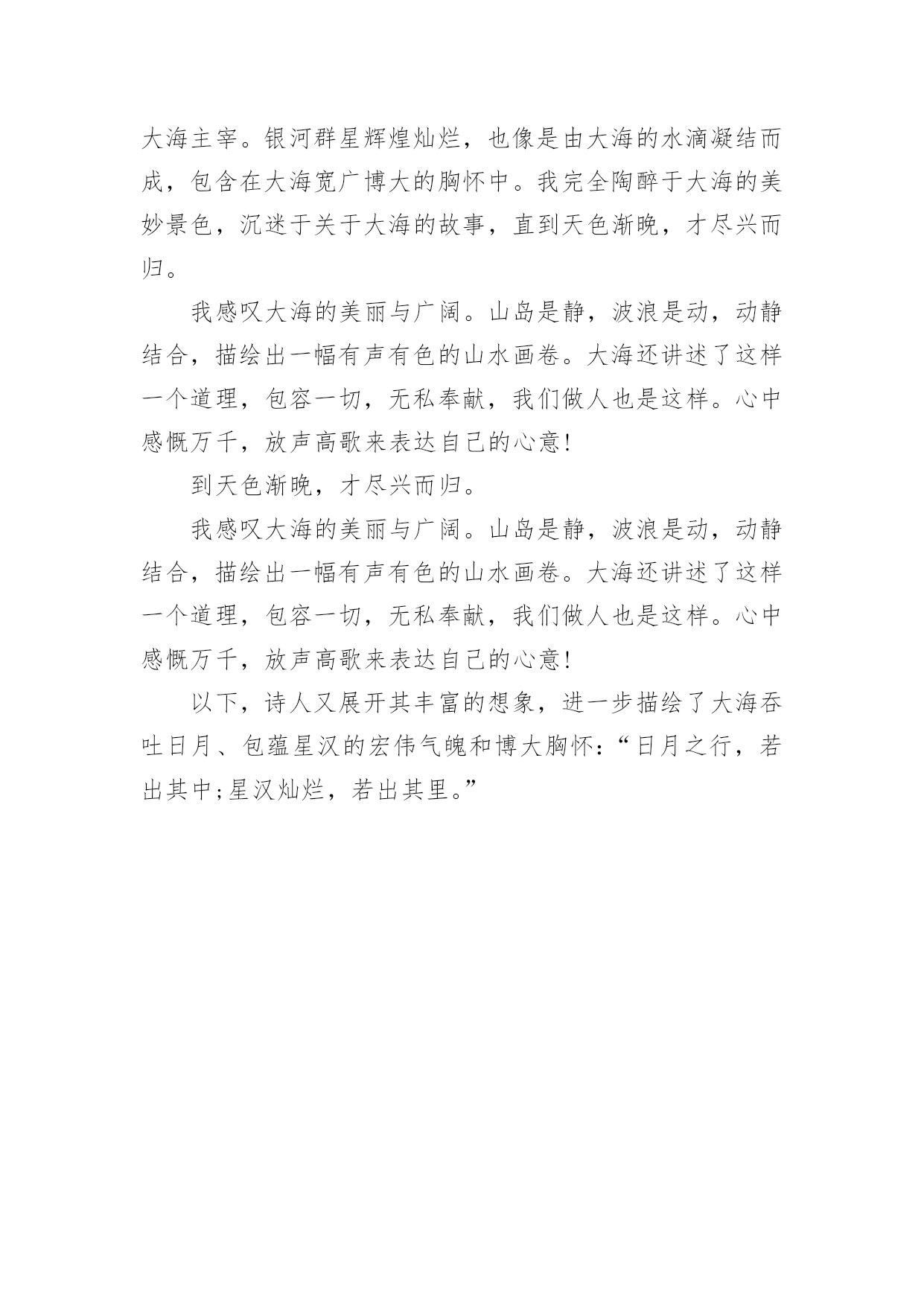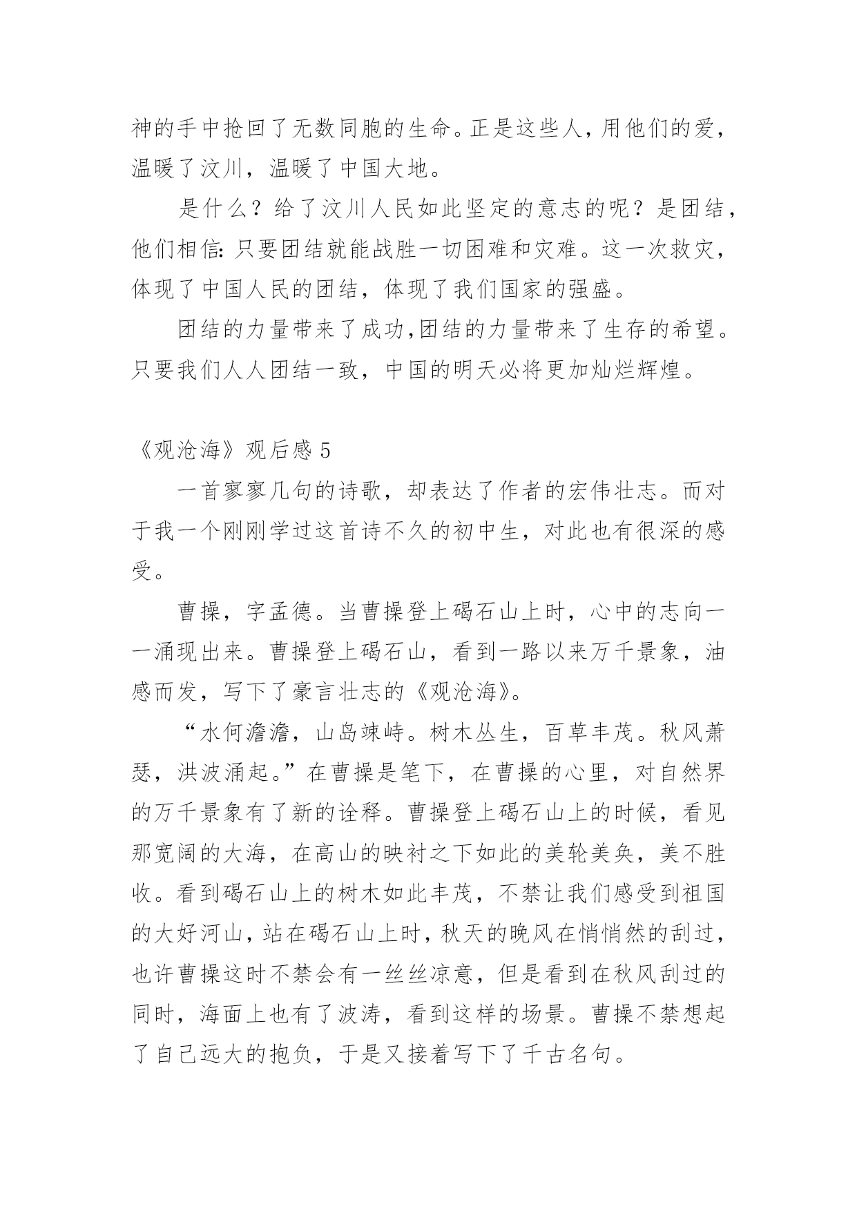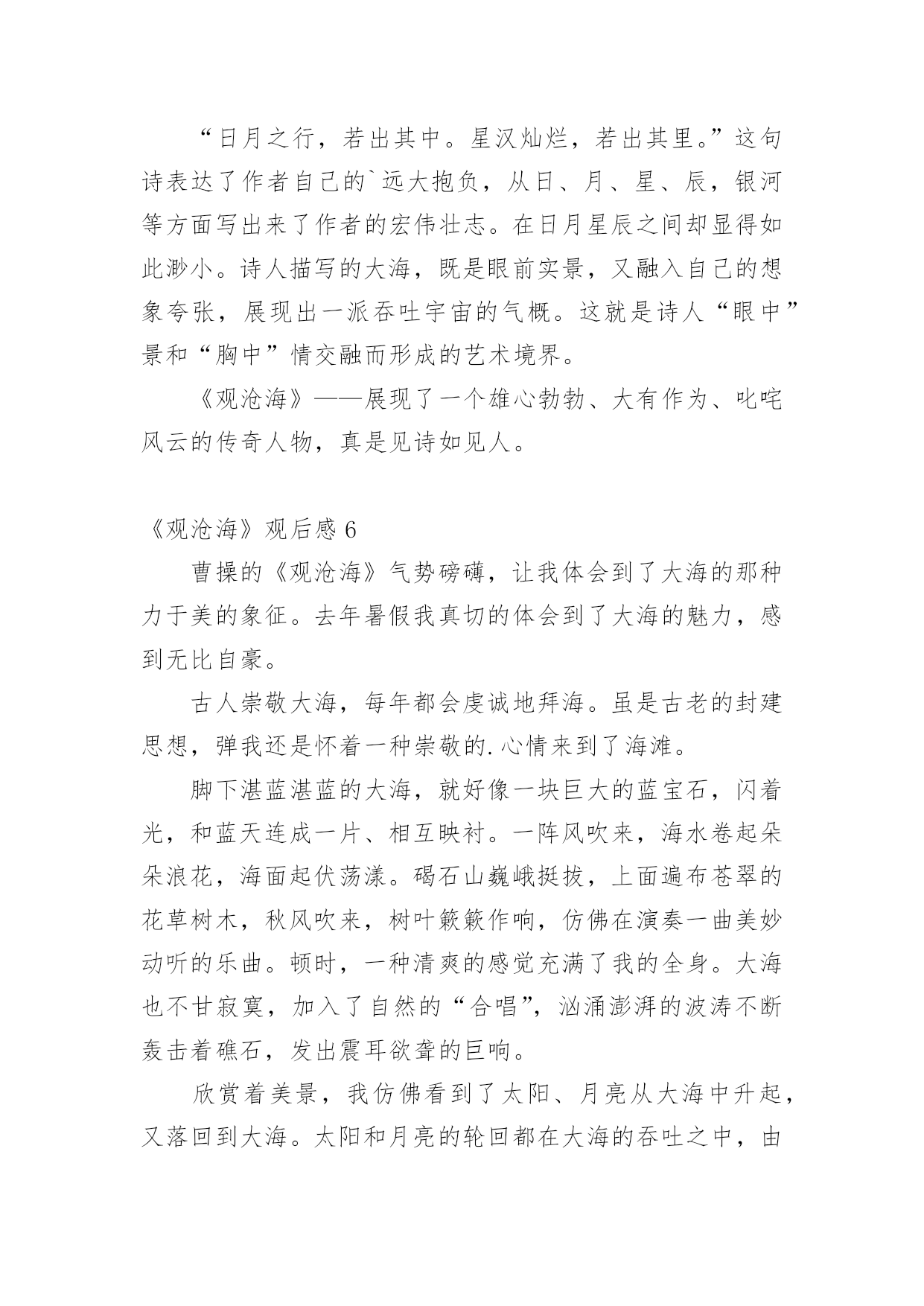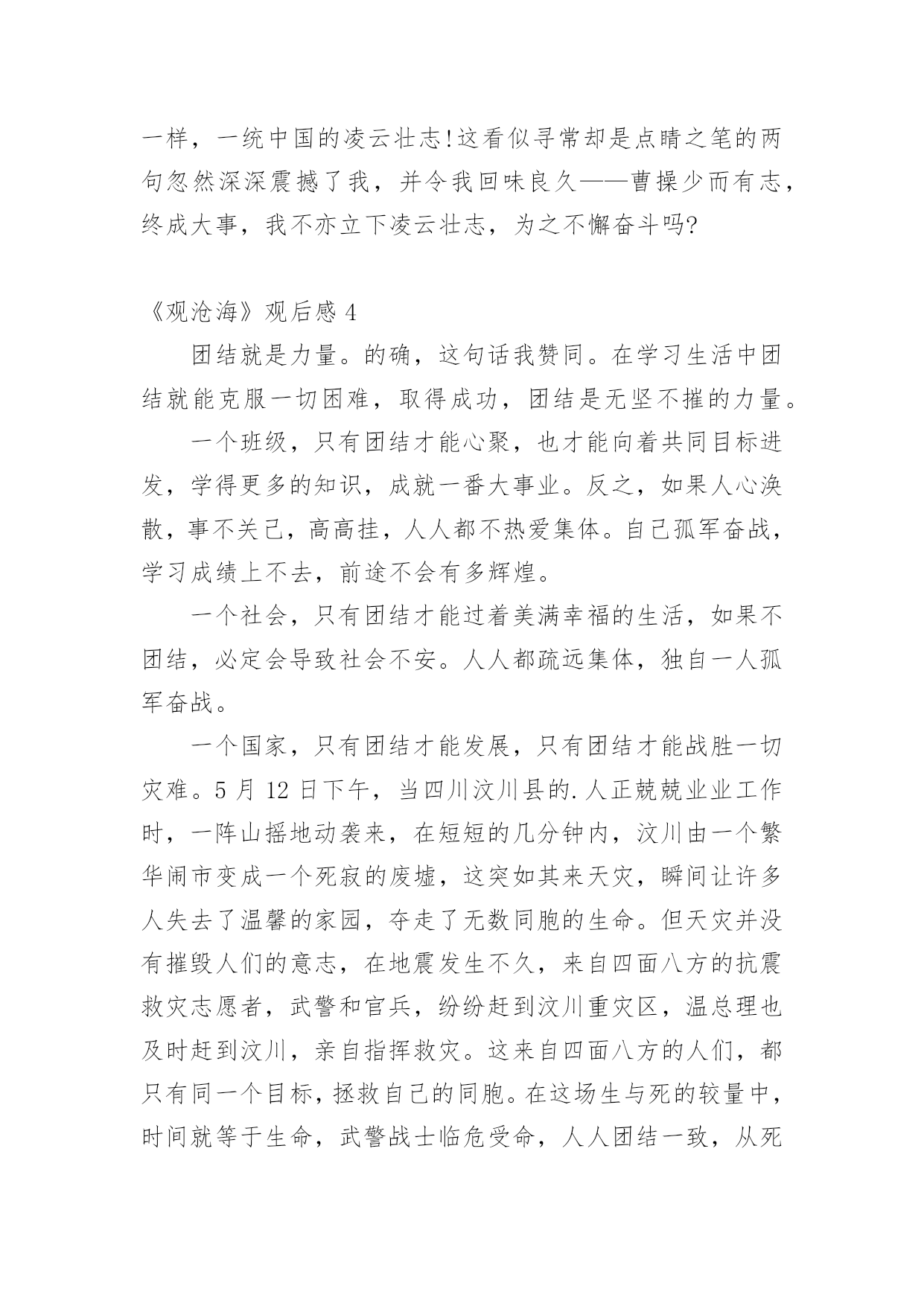 《观沧海》观后感当认真看完一部影视作品后,相信大家一定领会了不少东西,观后感就是看了一部影片,连续剧或参观展览等后,把具体感受和得到的启示写成的文章。可是观后感怎么写才合适呢?以下是小编为大家收集的《观沧海》观后感,欢迎阅读,希望大家能够喜欢。《观沧海》观后感1最近看了易中天先生的《品三国》,再次体味曹操的诗作《观沧海》:“东临碣石,以观沧海。水何澹澹,山岛竦峙。树木丛生,百草丰茂。秋风萧瑟,洪波涌起。日月之行,若出其中;星汉灿烂,若出其里。幸甚至哉,歌以咏志。”又有新的感悟。回想我也曾有幸“东临碣石,以观沧海”。晨白时,站在临近碣石的金山嘴上观看日出。只见东方海平线放出红光,接着红日水上水下相接,瞬间跃出海面,万道霞光,极为壮观。当红日升高时,有人举起手高叫,快拍照!快拍。一看,原来是想拍手托太阳的,引来一片欢笑和模仿。一天晚上坐在卧床上,突见月亮升起,逐渐高离海平面,想到“日月之行,若出其中”,灵感一动,何不看看月出。第二天晚上提前了一刻钟静候,果然看到了平生从未见的奇景。只见东方银光逐渐增大增强,一轮圆月缓缓腾出,银波万里,尤其是跳离水面一霎间更是摄人心魄,仿佛巨大的夜明珠照亮海空,真是“幸甚至哉”也!然而,从未见旅游宣传“看月出”,实在是疏忽,或明知不宣,乃失策也!而曹操却观得细微,遥想当年必看了日出月出,写下了如此壮丽的诗篇!由此,不禁想到,秦皇、汉武、魏武、唐宗、康熙、乾隆都到过此海边,得到后世最不公正评价当数谁?!同样都是中华民族杰出的贡献者,为何评价却是天壤之别?!我看,是评论家太“吝啬”、太“正统”、太“保守”了,历史上的评论家就不去说他们了,而在现代文明的熏陶下,我们的.评论家还是在引经据典,追究细枝末节,而不从现代的眼光,看大的方面,“暴君”、“奸雄”不离口,未免引人万分感慨和不解!《观沧海》观后感2最近看了易中天先生的《品三国》,再次体味曹操的诗作《观沧海》:“东临碣石,以观沧海。水何澹澹,山岛竦峙。树木丛生,百草丰茂。秋风萧瑟,洪波涌起。日月之行,若出其中;星汉灿烂,若出其里。幸甚至哉,歌以咏志。”,又有新的感悟。回想01年秋风刚起,有幸“东临碣石,以观沧海”。晨白时,站在临近碣石的金山嘴上(有的考证说碣石在此,其实错也!真正应在鸽子窝的鹰角石旁的西崖顶上),观看日出。只见东方海平线放出红光,接着红日水上水下相接,瞬间跃出海面,万道霞光,极为壮观。当红日升高时,有人举起手高叫,快拍照!快拍。一看,原来是想拍手托太阳的,引来一片欢笑和模仿。一天晚上坐在卧床上,突见月亮升起,逐渐高离海平面,想到“日月之行,若出其中”,灵感一动,何不看看月出。第二天晚上提前了一刻钟静候,果然看到了平生从未见的奇景。只见东方银光逐渐增大增强,一轮圆月缓缓腾出,银波万里,尤其是跳离水面一霎更是慑人心魄,仿佛巨大的夜明珠照亮海空,真是“幸甚至哉”也!然,从未见旅游宣传“看月出”,实在是疏忽,或明知不宣,乃失策也!而操却观得细微,遥想当年必看了日出月出,写下了如此壮丽的诗篇!由此,不禁想到,秦皇、汉武、魏武、唐宗、康熙、乾隆都到过此海边,得到后世最不公正评价当数谁?!同样都是中华民族杰出的`贡献者,为何评价却是天壤之别?!我看,是评论家太“吝啬”、太“正统”、太“保守”了,历史上的评论家就不去说他们了,而在现代文明的熏陶下,我们的评论家还是在引经据典,追究细微末节,而不从现代的眼光,看大的方面,“暴君”、“奸雄”不离口,未免引人万分感慨和不解!《观沧海》观后感3一花一世界,一首《观沧海》尽显曹操一腔热血雄心。“东临碣石,以观沧海,水何澹澹,山岛竦峙。树木丛生,百草丰茂。秋风萧瑟,洪波涌起……”初读《观沧海》,我即为此四句深深震慑:好一派气势恢宏至景!诗人竟仅凭三十二个字便向世人展示了一幅登高远眺江渚之水浩浩荡荡向东流去的磅礴之景,其人的文笔功力可见一斑。总以为作为一个政治家的她却有着“建安八子”之一的称号是名过其实了。今观其文,“蓬莱文章建安骨”,不错,他将建安诗人的骨风挥洒得淋漓尽致。因而,这首诗的前四句我熟记于心,常默诵于口。这四句诗亦成为我印象中所有诗词最难忘的一段。曹操也随之成为我脑海中一挥之不去的文人形象。不久以后,我读了《三国演义》,却为曹操的有胆有识,深谙军机韬略的大将之风所感。曹操生于汉末,时值黄巾起义,群雄割据的乱世。所谓“乱世出英雄”,曹操少时便立下了一统天下的鸿鹄志。成年以后,他尽散其家资以招兵买马,置办军械,组建了一小支队伍。凭着这支不足万人的`队伍,曹操讨董卓,征张绣,平刘岱,除吕布,灭二袁,剿刘表,伐张鲁,终于一统北方,成就丰功伟绩,离自己一统天下之梦大进一步。而这首《观沧海》即是曹操在灭袁绍后,途经碣石山,观沧海后有感而作。至此时,我再度默诵《观沧海》一诗,它留给我至深印象的,已非四句写景之段,取