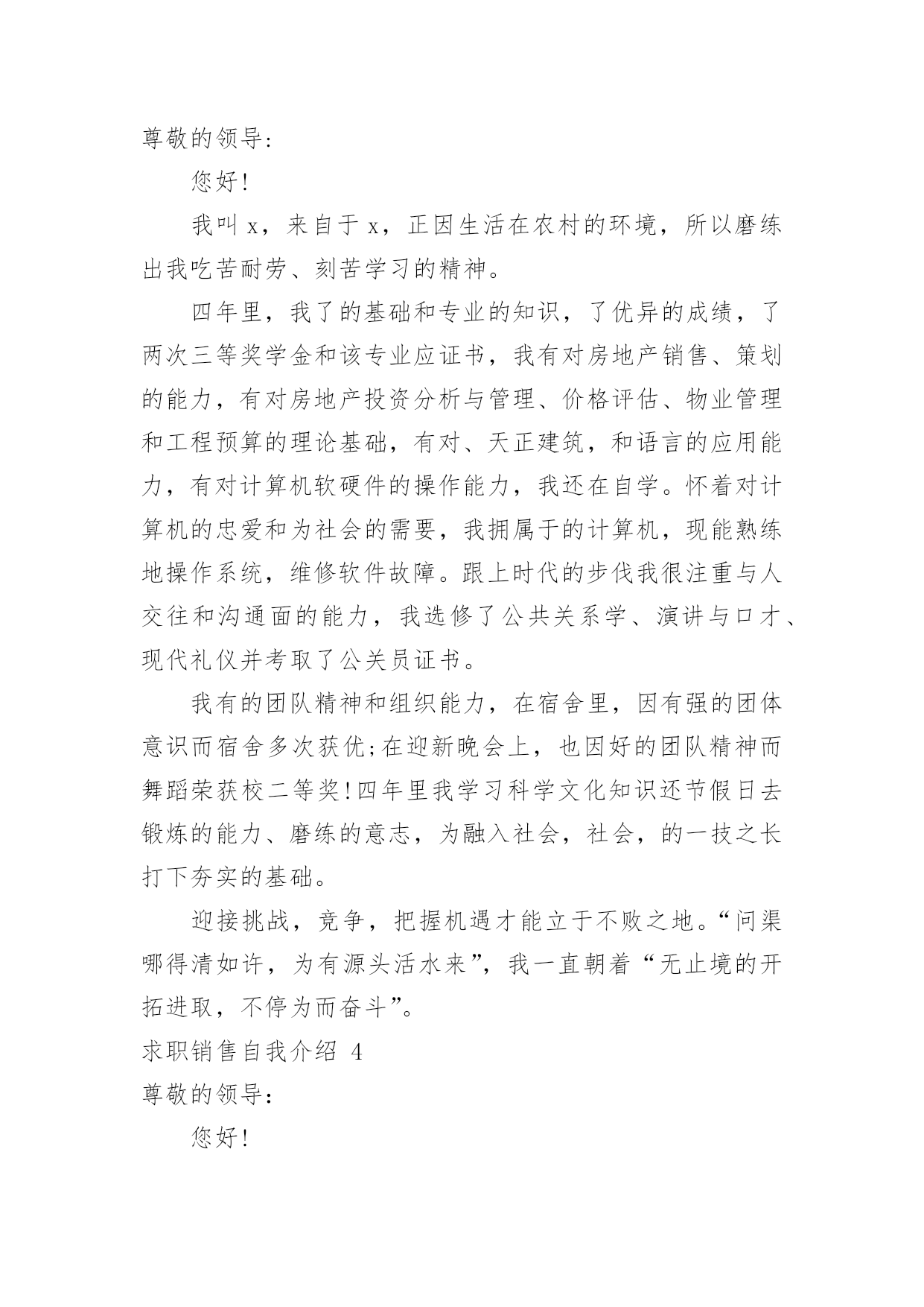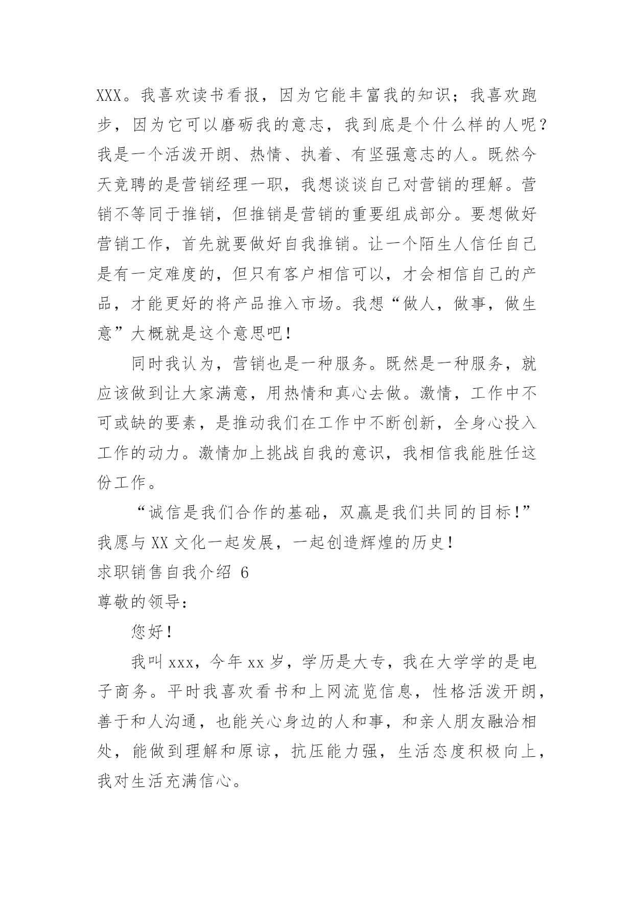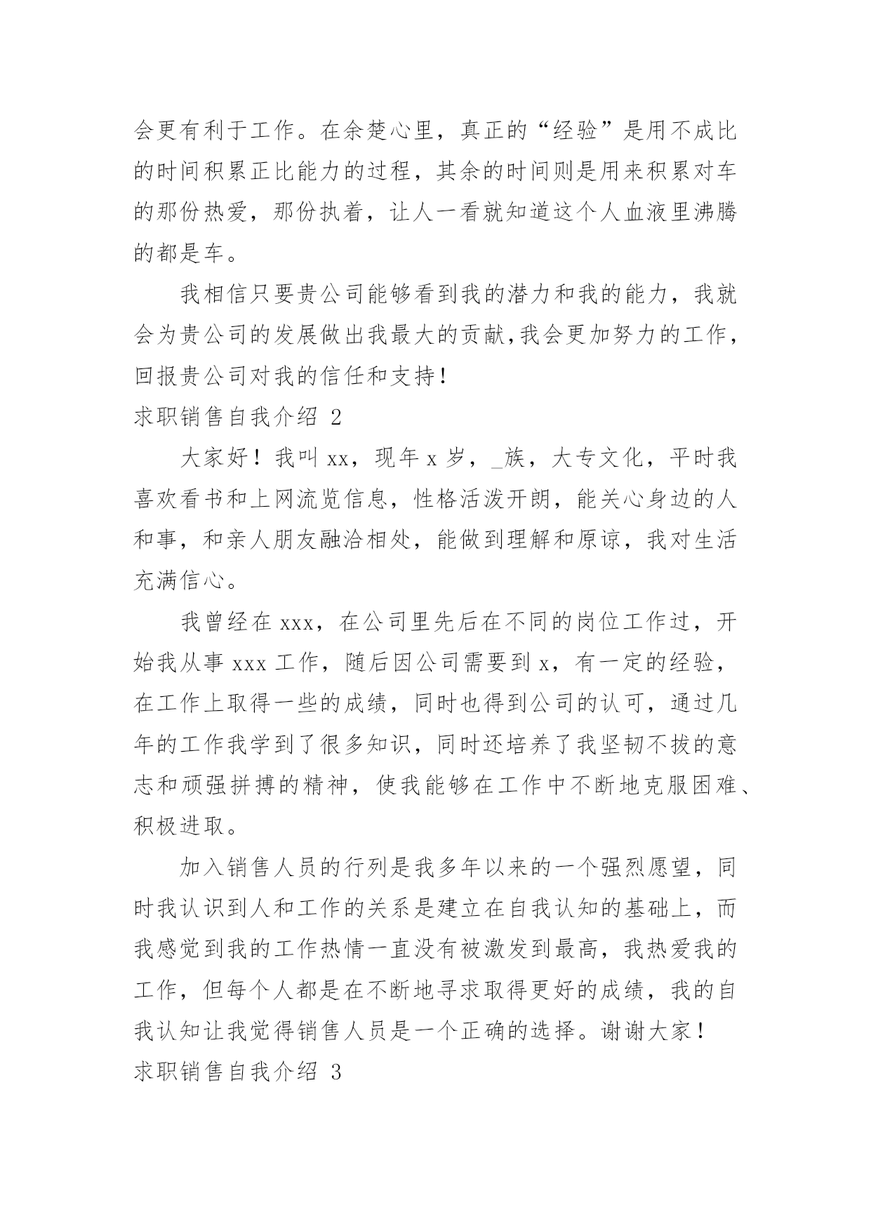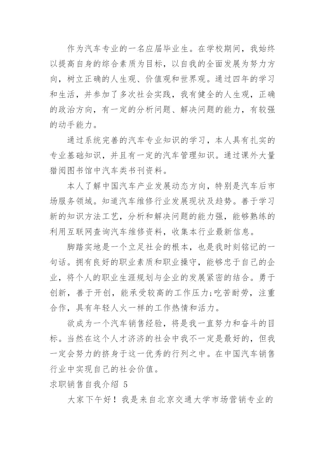 求职销售自我介绍求职销售自我介绍当我们在一个新环境中,我们时常会需要作自我介绍,自我介绍可以唤起他人对我们的兴趣。那要怎么写好自我介绍呢?下面是小编为大家整理的求职销售自我介绍,欢迎大家分享。求职销售自我介绍1我是一名应届毕业硕士研究生,名叫xx。xxx年,我从家乡长春考入北京理工大学电子工程系。并在xxx年毕业之际以优异的成绩考入中国科学院研究生院。本科时我多次获得人民奖学金,在就读研究生之后由于在学习和学生工作以及社会活动中的优秀表现,我被评为中国科学院三好学生。本人一直以来对汽车销售倍有兴趣。在网上投了关于汽车“销售顾问”的简历不下二百份,有机会面试的也就是二次,被拒绝的理由是“没有从业经验”。那么,我有一个疑问:那些有经验的兄弟姐妹不也是从没经验到有经验的吗?如果说“没有经验”是一个幌子,拒绝余楚的理由是余楚的能力不行,这就更不是理由了,我能应聘上其他的营销工作就是一个很好的证明。在余楚看来,经验只是一个时间的积累,与能力的积累不成正比。当然,余楚并不是说有经验有什么不好,有丰富的经验会更有利于工作。在余楚心里,真正的“经验”是用不成比的时间积累正比能力的过程,其余的时间则是用来积累对车的那份热爱,那份执着,让人一看就知道这个人血液里沸腾的都是车。我相信只要贵公司能够看到我的潜力和我的能力,我就会为贵公司的发展做出我最大的贡献,我会更加努力的工作,回报贵公司对我的信任和支持!求职销售自我介绍2大家好!我叫xx,现年x岁,_族,大专文化,平时我喜欢看书和上网流览信息,性格活泼开朗,能关心身边的人和事,和亲人朋友融洽相处,能做到理解和原谅,我对生活充满信心。我曾经在xxx,在公司里先后在不同的岗位工作过,开始我从事xxx工作,随后因公司需要到x,有一定的经验,在工作上取得一些的成绩,同时也得到公司的认可,通过几年的工作我学到了很多知识,同时还培养了我坚韧不拔的意志和顽强拼搏的精神,使我能够在工作中不断地克服困难、积极进取。加入销售人员的行列是我多年以来的一个强烈愿望,同时我认识到人和工作的关系是建立在自我认知的基础上,而我感觉到我的工作热情一直没有被激发到最高,我热爱我的工作,但每个人都是在不断地寻求取得更好的成绩,我的自我认知让我觉得销售人员是一个正确的选择。谢谢大家!求职销售自我介绍3尊敬的领导:您好!我叫x,来自于x,正因生活在农村的环境,所以磨练出我吃苦耐劳、刻苦学习的精神。四年里,我了的基础和专业的知识,了优异的成绩,了两次三等奖学金和该专业应证书,我有对房地产销售、策划的能力,有对房地产投资分析与管理、价格评估、物业管理和工程预算的理论基础,有对、天正建筑,和语言的应用能力,有对计算机软硬件的操作能力,我还在自学。怀着对计算机的忠爱和为社会的需要,我拥属于的计算机,现能熟练地操作系统,维修软件故障。跟上时代的步伐我很注重与人交往和沟通面的能力,我选修了公共关系学、演讲与口才、现代礼仪并考取了公关员证书。我有的团队精神和组织能力,在宿舍里,因有强的团体意识而宿舍多次获优;在迎新晚会上,也因好的团队精神而舞蹈荣获校二等奖!四年里我学习科学文化知识还节假日去锻炼的能力、磨练的意志,为融入社会,社会,的一技之长打下夯实的基础。迎接挑战,竞争,把握机遇才能立于不败之地。“问渠哪得清如许,为有源头活水来”,我一直朝着“无止境的开拓进取,不停为而奋斗”。求职销售自我介绍4尊敬的领导:您好!作为汽车专业的一名应届毕业生。在学校期间,我始终以提高自身的综合素质为目标,以自我的全面发展为努力方向,树立正确的人生观、价值观和世界观。通过四年的学习和生活,并参加了多次社会实践,我有健全的人生观,正确的政治方向,有一定的分析问题、解决问题的能力,有较强的动手能力。通过系统完善的汽车专业知识的学习,本人具有扎实的专业基础知识,并且有一定的汽车管理知识。通过课外大量猎阅图书馆中汽车类书刊资料。本人了解中国汽车产业发展动态方向,特别是汽车后市场服务领域。知道汽车维修行业发展现状及趋势。善于学习新的知识方法工艺,分析和解决问题的能力强,能够熟练的利用互联网查询汽车维修资料,收集本行业最新信息。脚踏实地是一个立足社会的根本,也是我时刻铭记的一句话。拥有良好的职业素质和职业操守,能够忠于自己的企业,将个人的职业生涯规划与企业的发展紧密的结合。勇于创新,善于开创,能承受较高的工作压力;吃苦耐劳,注重合作,具有年轻人火一样的工作热情和活力。欲成为一个汽车销售经验,将是我一直努力和奋斗的目标。当然在这个人才济济的社会中我不一定是最好的,但我一定会努力的挤身于这一优秀的行列之中。在中国汽车销售行业中实现自己的社会价值。求职销售自我介绍5大家下午好!我是来自北京交通大学市场营销专业的XXX。我喜欢读书看报,因为它能丰富我的知识;我喜欢跑步,因为它可以磨砺