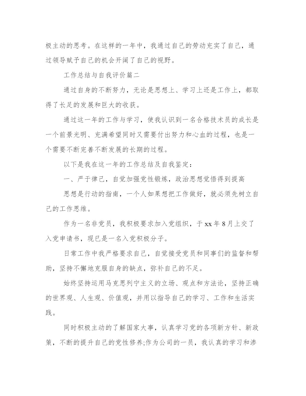 工作总结与自我评价(优质8篇)总结的内容必须要完全忠于自身的客观实践,其材料必须以客观事实为依据,不允许东拼西凑,要真实、客观地分析情况、总结经验。总结书写有哪些要求呢?我们怎样才能写好一篇总结呢?那么下面我就给大家讲一讲总结怎么写才比较好,我们一起来看一看吧。工作总结与自我评价篇一今年是我成为上班族以来的第一个整年。土建工程师是我从事的第一份工作,是我职业生涯的一个起点,我对此也十分珍惜,尽最大努力去适应这一岗位。通过一年来的不断学习,以及同事、领导的帮助,我已完全融入到了这个大家庭中,个人的工作技能也有了明显的提高,虽然工作中还存在这样那样的不足之处,但应该说这一年付出了不少,也收获了很多,我自己感到成长了,也逐渐成熟了。现在就20__年的工作情况总结如下:一、一年来经过我的不懈努力,完成了一期、二期工程施工资料整理及移交工作、二期工程景观、绿化工作、c组团前期开工准备工作、c组团样板房工程等公司领导交付的其他工作。1.一、二期工程施工资料整理及移交工作。今年上半年二期工程顺利交工并交付业主使用,工程交工前必须先把施工资料整理交接完毕,我认真检查把每一栋楼的施工资料都仔细查阅,力争做到一张不漏、一张不缺、目录整齐、保证资料齐全,交房前二期13栋楼所有的户型图、质保保证书、使用说明书,我都要提前准备齐全,已备交房时给业主以充分的保障。二期13栋楼的备案资料全部经由我手整理完毕,再领导的指导下,我顺利的完成了交房前所有资料的整理工作。交房后由于资料过多及其重要性,需移交公司档案室保管,移交期间,我必须对一、二期30栋楼的100多盒资料重新整理,做到每张都有记录并制定出能够从中找出任意一张资料的目录。期间我花费大量精力,花费将近一月的时间,终于不负领导所托吧所有资料都重新整理完毕。2.二期工程景观、绿化工作。年初,我接手二期工程景观、绿化工作。景观、绿化工作相对于现代化小区,比重虽小,但是意义重大。它是现代化新生活小区不可或缺的。由于准备充足,二期的景观、绿化工作进行的很顺利。但是,后期验收时,由于苗木规格、种类繁多给我们的验收工作带来了很大的麻烦,最终,我通过与技术部通力合作,把所有苗木的种类、数量、规格全部核查到位。最终顺利的完成了领导交付的此项工作。3、工程。在接到领导指示后,我快速的投入到实际工作当中去,为了达到预期效果,我2天内3次定位放线,最终满足了领导的预期效果。在施工过程中,我不惧辛苦,任劳任怨,努力做到了上班在现场,下班后由于工程需要多次加班加点工作。后期由于装饰公司的介入,这就需要良好的协调能力与组织能力。努力处理好双方在施工过程中所发生的摩擦和矛盾。最终顺利的在开盘前完成了样板房工程。为公司开盘后可观的销售情况及扭亏为营做出了应有的贡献。在顺利开盘后,我又与技术部合作。参与了样板房后期的决算事宜。二、一年来的工作心得。1、保持良好的心态与积极进去的工作态度。我作为一分子,自觉遵守公司的各项规章制度,服从上级领导的工作安排;以对公司绝对忠诚的态度投入到各项工作中去,把公司的事情当作自己家里的事情去做,在解决现场施工管理、协调等工作上,依据现场实际情况积极主动的思考,自己考虑应该完成的各项工作,而不是等领导来安排。以主人翁的心态投入到各项工作中去,维护公司的形象和利益不受损害。2、把自己融入到公司的大集体中去,依靠集体的智慧及力量完成各项工作。在我今年完成的许多工作中,得到各级领导和同事们的支持和帮助。3、通过一年来的工作发现自己还有很多不足之处:在工作中处理现场事宜,管理力度不够;处理问题还不是太细心,这些问题我将在崭新的20__年多加注意克服。20__年,对于我来说是探索、学习、进步的一年,面对着与以前不一样的工作内容,我摆正了自己的心态,充分发挥主管能动性,积极主动的思考。在这样的一年中,我通过自己的劳动充实了自己,通过领导赋予自己的机会开阔了自己的视野。工作总结与自我评价篇二通过自身的不断努力,无论是思想上、学习上还是工作上,都取得了长足的发展和巨大的收获。通过这一年的工作与学习,使我认识到一名合格技术员的成长是一个前景光明、充满希望同时又需要付出努力和心血的过程,也是一个需要不断完善不断发展的长期的过程。以下是我在这一年的工作总结及自我鉴定:一、严于律己,自觉加强党性锻炼,政治思想觉悟得到提高思想是行动的指南,一个人如果想把工作做好,就必须先树立自己的工作思维。作为一名非党员,我积极要求加入党组织,于xx年8月上交了入党申请书,现已是一名入党积极分子。日常工作中我严格要求自己,自觉接受党员和同事们的监督和帮助,坚持不懈地克服自身的缺点,弥补自己的不足。始终坚持运用马克思列宁主义的立场、观点和方法论,坚持正确的世界观、人生观、价值观,并用以指导自己的