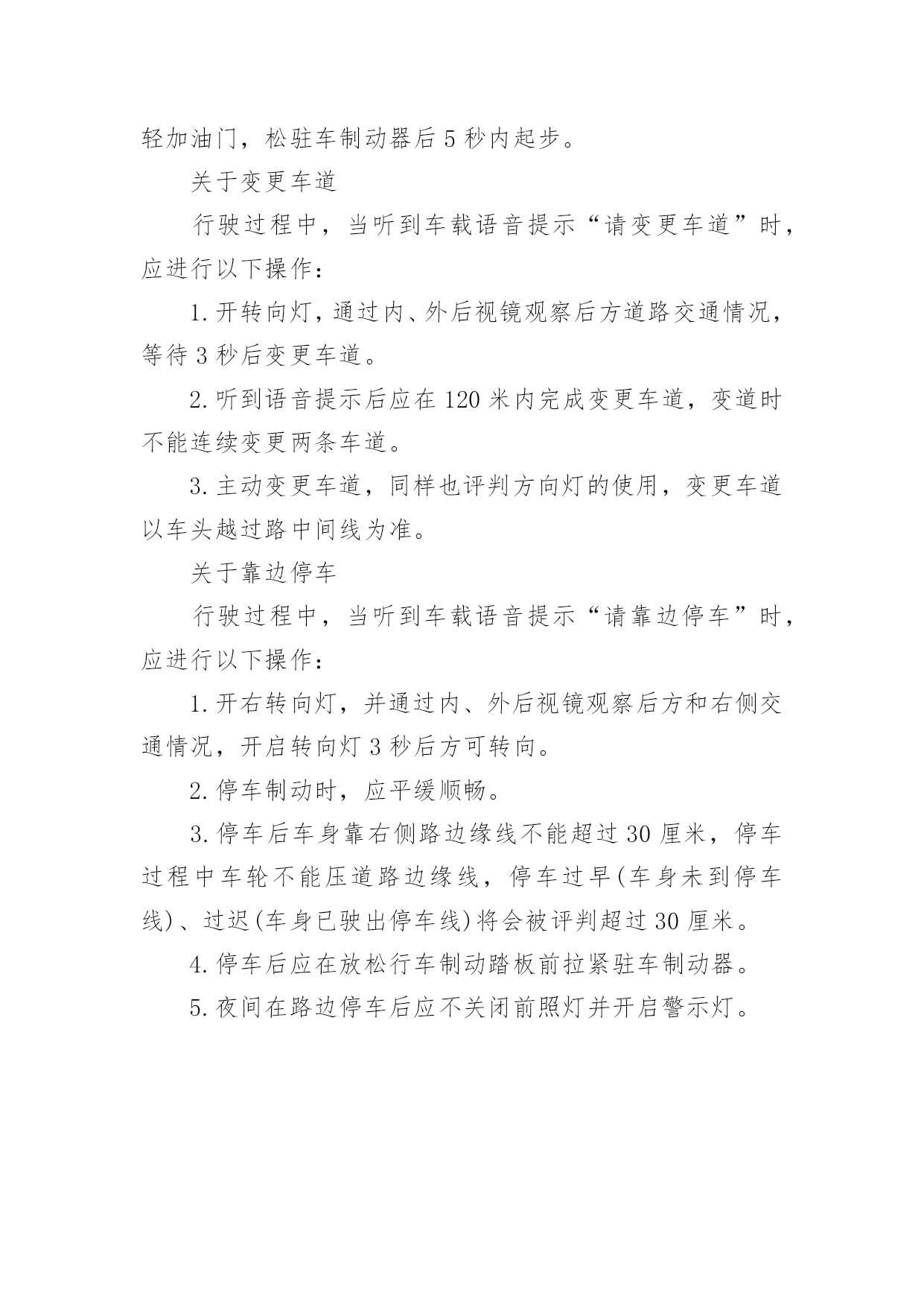 科目三考试难点细节科目三考试难点细节关于上车准备1.上车前应绕车一周检查车辆外观及安全状况。2.打开车门前应观察后方交通情况。关于模拟夜间驾驶1.起步前应开启前照灯。2.在通过急弯、坡路、拱桥、人行横道或者没有交通信号灯控制的路口时,应交替使用远、近光灯示意。3.在路口转弯时,不得使用远光灯。4.在有路灯、照明良好的'道路上行驶时,不得使用远光灯。关于起步1.上车后关闭车门,并调整驾驶座椅、后视镜,检查仪表盘。2.开始考试后,若发动机未启动,车载语音提示“请启动发动机”。3.发动机启动后,按语音指令及时打开对应的灯。根据语音提示关闭所有灯,起步继续考试。4.起步前,应通过后视镜并向左方侧头,观察左后方交通情况。5.打开转向灯,挂1挡,慢松离合器到半联动状态时,轻加油门,松驻车制动器后5秒内起步。关于变更车道行驶过程中,当听到车载语音提示“请变更车道”时,应进行以下操作:1.开转向灯,通过内、外后视镜观察后方道路交通情况,等待3秒后变更车道。2.听到语音提示后应在120米内完成变更车道,变道时不能连续变更两条车道。3.主动变更车道,同样也评判方向灯的使用,变更车道以车头越过路中间线为准。关于靠边停车行驶过程中,当听到车载语音提示“请靠边停车”时,应进行以下操作:1.开右转向灯,并通过内、外后视镜观察后方和右侧交通情况,开启转向灯3秒后方可转向。2.停车制动时,应平缓顺畅。3.停车后车身靠右侧路边缘线不能超过30厘米,停车过程中车轮不能压道路边缘线,停车过早(车身未到停车线)、过迟(车身已驶出停车线)将会被评判超过30厘米。4.停车后应在放松行车制动踏板前拉紧驻车制动器。5.夜间在路边停车后应不关闭前照灯并开启警示灯。