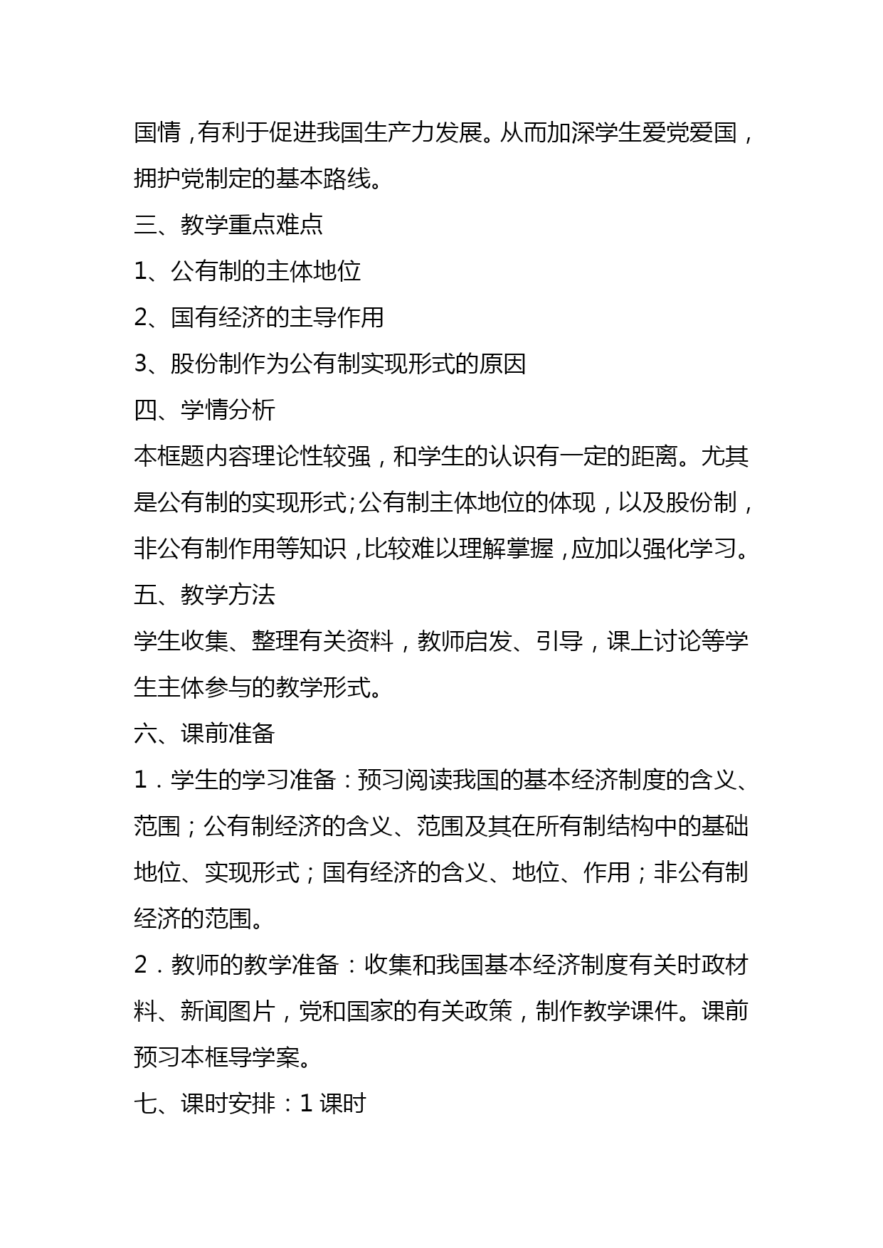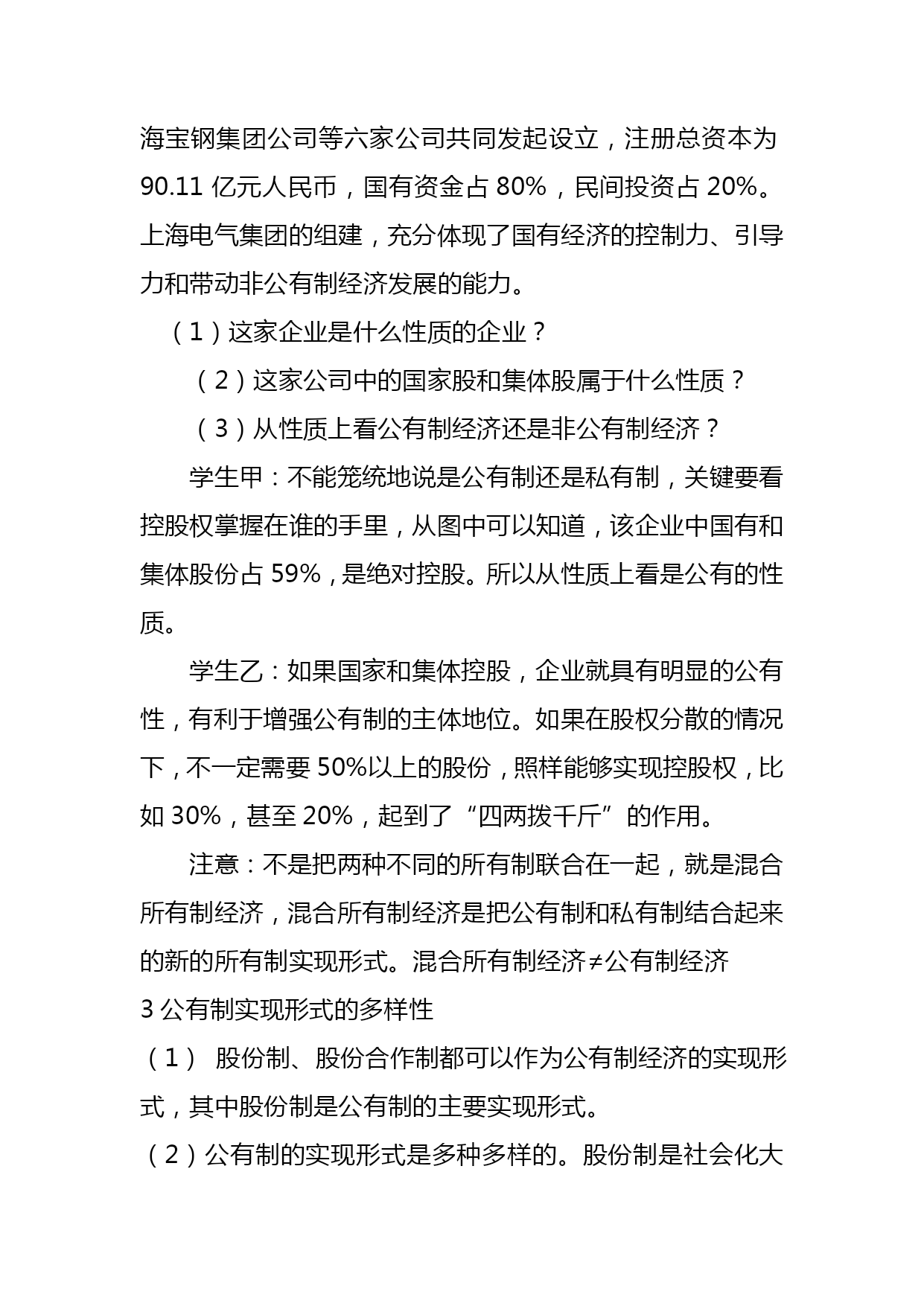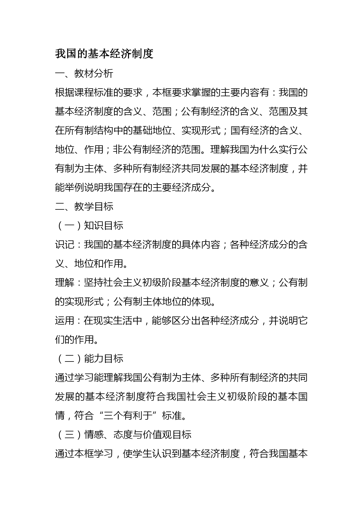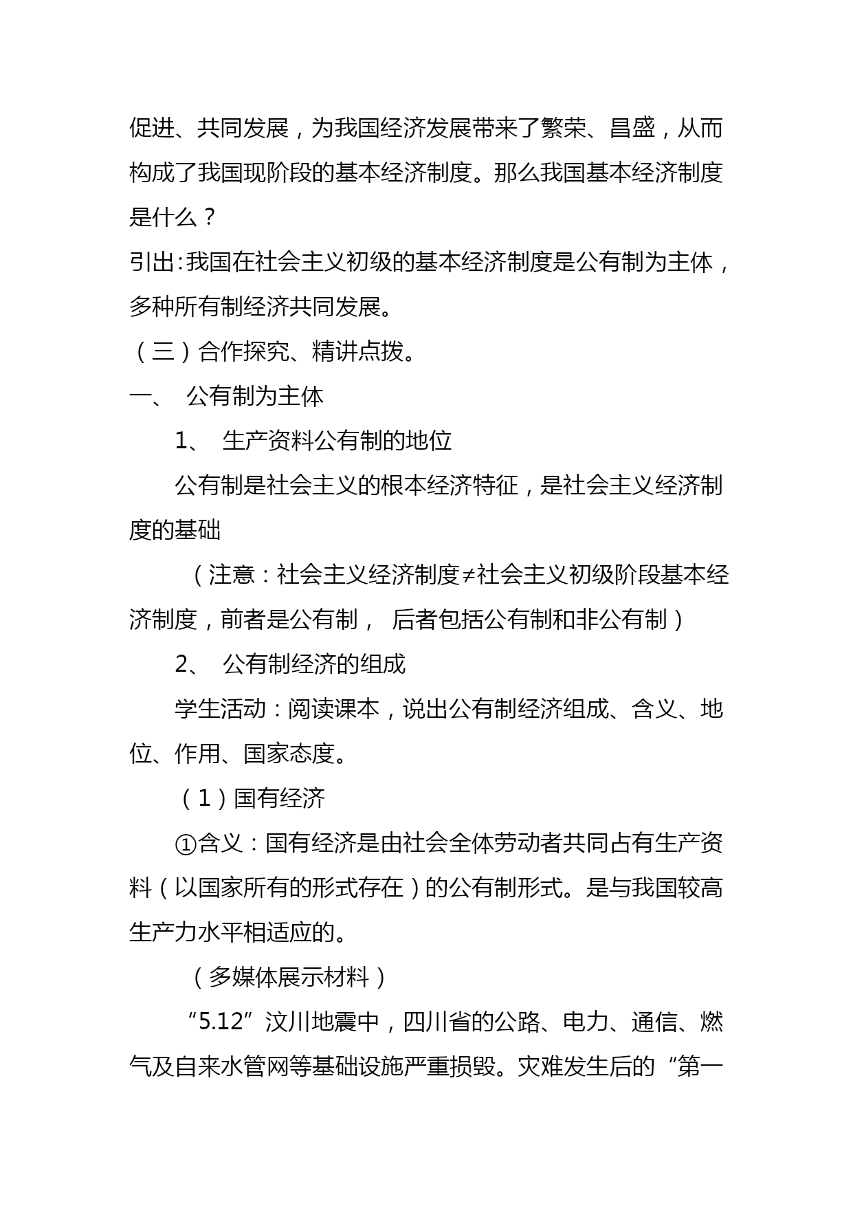 我国的基本经济制度教案(完整版)资料(可以直接使用,可编辑优秀版资料,欢迎下载)我国的基本经济制度一、教材分析根据课程标准的要求,本框要求掌握的主要内容有:我国的基本经济制度的含义、范围;公有制经济的含义、范围及其在所有制结构中的基础地位、实现形式;国有经济的含义、地位、作用;非公有制经济的范围。理解我国为什么实行公有制为主体、多种所有制经济共同发展的基本经济制度,并能举例说明我国存在的主要经济成分。二、教学目标(一)知识目标识记:我国的基本经济制度的具体内容;各种经济成分的含义、地位和作用。理解:坚持社会主义初级阶段基本经济制度的意义;公有制的实现形式;公有制主体地位的体现。运用:在现实生活中,能够区分出各种经济成分,并说明它们的作用。(二)能力目标通过学习能理解我国公有制为主体、多种所有制经济的共同发展的基本经济制度符合我国社会主义初级阶段的基本国情,符合“三个有利于”标准。(三)情感、态度与价值观目标通过本框学习,使学生认识到基本经济制度,符合我国基本国情,有利于促进我国生产力发展。从而加深学生爱党爱国,拥护党制定的基本路线。三、教学重点难点1、公有制的主体地位2、国有经济的主导作用3、股份制作为公有制实现形式的原因四、学情分析本框题内容理论性较强,和学生的认识有一定的距离。尤其是公有制的实现形式;公有制主体地位的体现,以及股份制,非公有制作用等知识,比较难以理解掌握,应加以强化学习。五、教学方法学生收集、整理有关资料,教师启发、引导,课上讨论等学生主体参与的教学形式。六、课前准备1.学生的学习准备:预习阅读我国的基本经济制度的含义、范围;公有制经济的含义、范围及其在所有制结构中的基础地位、实现形式;国有经济的含义、地位、作用;非公有制经济的范围。2.教师的教学准备:收集和我国基本经济制度有关时政材料、新闻图片,党和国家的有关政策,制作教学课件。课前预习本框导学案。七、课时安排:1课时八、教学过程(一)预习检查、总结疑惑检查落实了学生的预习情况并了解了学生的疑惑,使教学具有了针对性。(二)情景导入、展示目标。情境导入:中学生张丽周末回到家中,刚进屋,一家亲戚就围坐在一起,畅谈幸福生活......。爸爸:“我在村上开的小旅馆规模又扩大了,请了18个员工,国庆节之前就有旅客用预定房间了。”妈妈:“我们那个果汁原料加工厂是乡镇企业,特别注重科技研发,厂里还经常组织我们外出学习。今年又引进了一套先进生产流水线,光是税收就上缴了30万元。”表哥王强:“我们铁路运输部门每到逢年过节就特别忙碌。瞧,国庆节没过完我就得赶回去上班了。”表姐王芳:“我自己开的油茶店生意好得不得了,有时候客人来晚了还找不到座位。”请你结合材料内容,简单介绍一下张丽一家从事的各个行业的情况,从中你得到什么启示?学生活动:略教师归纳:从中大致可以反映出我国有私营经济、集体经济、个体经济、国有经济、外资经济等经济成分。这些形形色色的经济成分在我国经济发展中互相竞争、互相促进、共同发展,为我国经济发展带来了繁荣、昌盛,从而构成了我国现阶段的基本经济制度。那么我国基本经济制度是什么?引出:我国在社会主义初级的基本经济制度是公有制为主体,多种所有制经济共同发展。(三)合作探究、精讲点拨。一、公有制为主体1、生产资料公有制的地位公有制是社会主义的根本经济特征,是社会主义经济制度的基础(注意:社会主义经济制度≠社会主义初级阶段基本经济制度,前者是公有制,后者包括公有制和非公有制)2、公有制经济的组成学生活动:阅读课本,说出公有制经济组成、含义、地位、作用、国家态度。(1)国有经济①含义:国有经济是由社会全体劳动者共同占有生产资料(以国家所有的形式存在)的公有制形式。是与我国较高生产力水平相适应的。(多媒体展示材料)“5.12”汶川地震中,四川省的公路、电力、通信、燃气及自来水管网等基础设施严重损毁。灾难发生后的“第一时间”内,中央在川企业和省属企业,以最快的速度调配技术设备和技术抢险人员奔赴重灾区,充分发挥了国有企业在设备、技术、人才、经验等方面的优势.中石油、中石化公司采取定点加油站、流动加油站,24小时不间断加油,保证抢险车辆的油料需求。省水电集团等企业抓紧抢修设备,迅速恢复电力供应保障。全省通信企业采取派出通信车、空投通讯设备等措施为灾区群众、抢险人员提供服务,尽最大努力保障灾区应急通讯铁路、航空、公交等企业集结运力,在运输灾区急需物资(如:帐篷、日常生活用品……探究:(1)上述材料说明了什么问题?(2)在社会主义市场经济的今天,国有经济在国民经济中起主导作用,是不是要求国有经济应当覆盖全社会各个行业、各个领域?在各行业、各领域都占支配地位?学生活动
