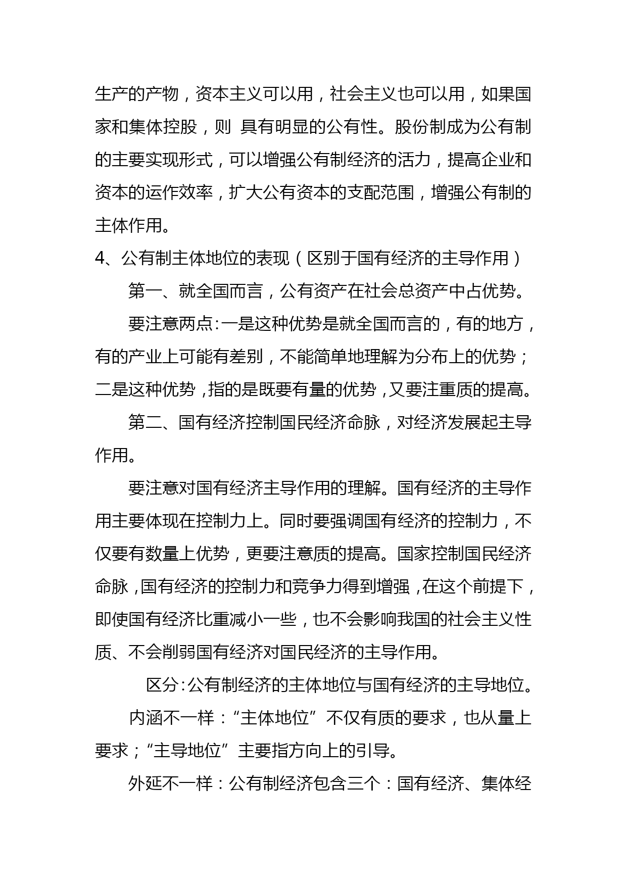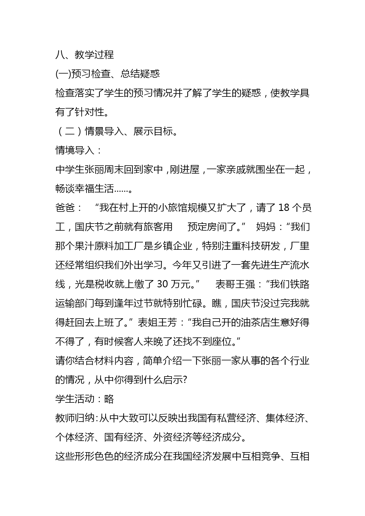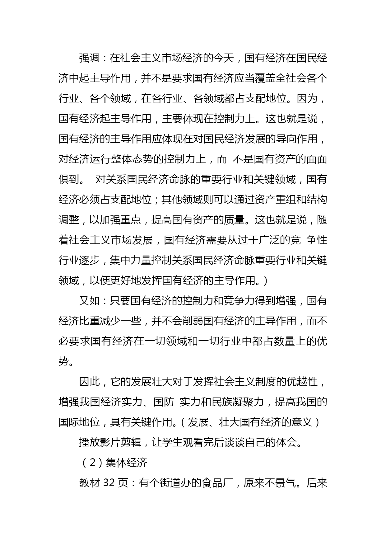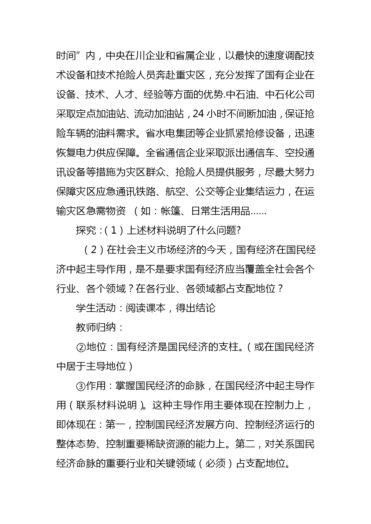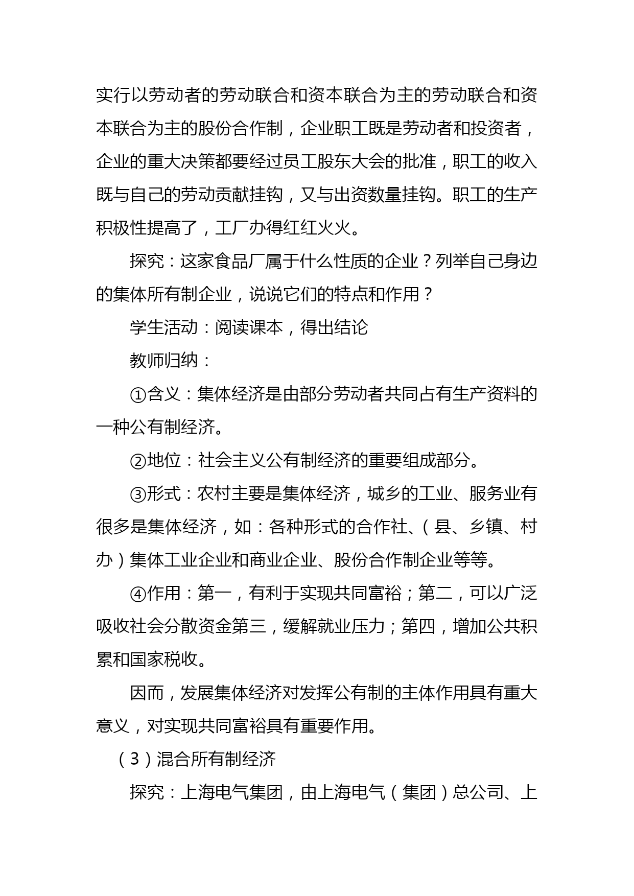我国的基本经济制度教案(完整版)资料(可以直接使用,可编辑优秀版资料,欢迎下载)我国的基本经济制度一、教材分析根据课程标准的要求,本框要求掌握的主要内容有:我国的基本经济制度的含义、范围;公有制经济的含义、范围及其在所有制结构中的基础地位、实现形式;国有经济的含义、地位、作用;非公有制经济的范围。理解我国为什么实行公有制为主体、多种所有制经济共同发展的基本经济制度,并能举例说明我国存在的主要经济成分。二、教学目标(一)知识目标识记:我国的基本经济制度的具体内容;各种经济成分的含义、地位和作用。理解:坚持社会主义初级阶段基本经济制度的意义;公有制的实现形式;公有制主体地位的体现。运用:在现实生活中,能够区分出各种经济成分,并说明它们的作用。(二)能力目标通过学习能理解我国公有制为主体、多种所有制经济的共同发展的基本经济制度符合我国社会主义初级阶段的基本国情,符合“三个有利于”标准。(三)情感、态度与价值观目标通过本框学习,使学生认识到基本经济制度,符合我国基本国情,有利于促进我国生产力发展。从而加深学生爱党爱国,拥护党制定的基本路线。三、教学重点难点1、公有制的主体地位2、国有经济的主导作用3、股份制作为公有制实现形式的原因四、学情分析本框题内容理论性较强,和学生的认识有一定的距离。尤其是公有制的实现形式;公有制主体地位的体现,以及股份制,非公有制作用等知识,比较难以理解掌握,应加以强化学习。五、教学方法学生收集、整理有关资料,教师启发、引导,课上讨论等学生主体参与的教学形式。六、课前准备1.学生的学习准备:预习阅读我国的基本经济制度的含义、范围;公有制经济的含义、范围及其在所有制结构中的基础地位、实现形式;国有经济的含义、地位、作用;非公有制经济的范围。2.教师的教学准备:收集和我国基本经济制度有关时政材料、新闻图片,党和国家的有关政策,制作教学课件。课前预习本框导学案。七、课时安排:1课时八、教学过程(一)预习检查、总结疑惑检查落实了学生的预习情况并了解了学生的疑惑,使教学具有了针对性。(二)情景导入、展示目标。情境导入:中学生张丽周末回到家中,刚进屋,一家亲戚就围坐在一起,畅谈幸福生活......。爸爸:“我在村上开的小旅馆规模又扩大了,请了18个员工,国庆节之前就有旅客用预定房间了。”妈妈:“我们那个果汁原料加工厂是乡镇企业,特别注重科技研发,厂里还经常组织我们外出学习。今年又引进了一套先进生产流水线,光是税收就上缴了30万元。”表哥王强:“我们铁路运输部门每到逢年过节就特别忙碌。瞧,国庆节没过完我就得赶回去上班了。”表姐王芳:“我自己开的油茶店生意好得不得了,有时候客人来晚了还找不到座位。”请你结合材料内容,简单介绍一下张丽一家从事的各个行业的情况,从中你得到什么启示?学生活动:略教师归纳:从中大致可以反映出我国有私营经济、集体经济、个体经济、国有经济、外资经济等经济成分。这些形形色色的经济成分在我国经济发展中互相竞争、互相促进、共同发展,为我国经济发展带来了繁荣、昌盛,从而构成了我国现阶段的基本经济制度。那么我国基本经济制度是什么?引出:我国在社会主义初级的基本经济制度是公有制为主体,多种所有制经济共同发展。(三)合作探究、精讲点拨。一、公有制为主体1、生产资料公有制的地位公有制是社会主义的根本经济特征,是社会主义经济制度的基础(注意:社会主义经济制度≠社会主义初级阶段基本经济制度,前者是公有制,后者包括公有制和非公有制)2、公有制经济的组成学生活动:阅读课本,说出公有制经济组成、含义、地位、作用、国家态度。(1)国有经济①含义:国有经济是由社会全体劳动者共同占有生产资料(以国家所有的形式存在)的公有制形式。是与我国较高生产力水平相适应的。(多媒体展示材料)“5.12”汶川地震中,四川省的公路、电力、通信、燃气及自来水管网等基础设施严重损毁。灾难发生后的“第一时间”内,中央在川企业和省属企业,以最快的速度调配技术设备和技术抢险人员奔赴重灾区,充分发挥了国有企业在设备、技术、人才、经验等方面的优势.中石油、中石化公司采取定点加油站、流动加油站,24小时不间断加油,保证抢险车辆的油料需求。省水电集团等企业抓紧抢修设备,迅速恢复电力供应保障。全省通信企业采取派出通信车、空投通讯设备等措施为灾区群众、抢险人员提供服务,尽最大努力保障灾区应急通讯铁路、航空、公交等企业集结运力,在运输灾区急需物资(如:帐篷、日常生活用品……探究:(1)上述材料说明了什么问题?(2)在社会主义市场经济的今天,国有经济在国民经济中起主导作用,是不是要求国有经济应当覆盖全社会各个行业、各个领域?在各行业、各领域都占支配地位?学生活动