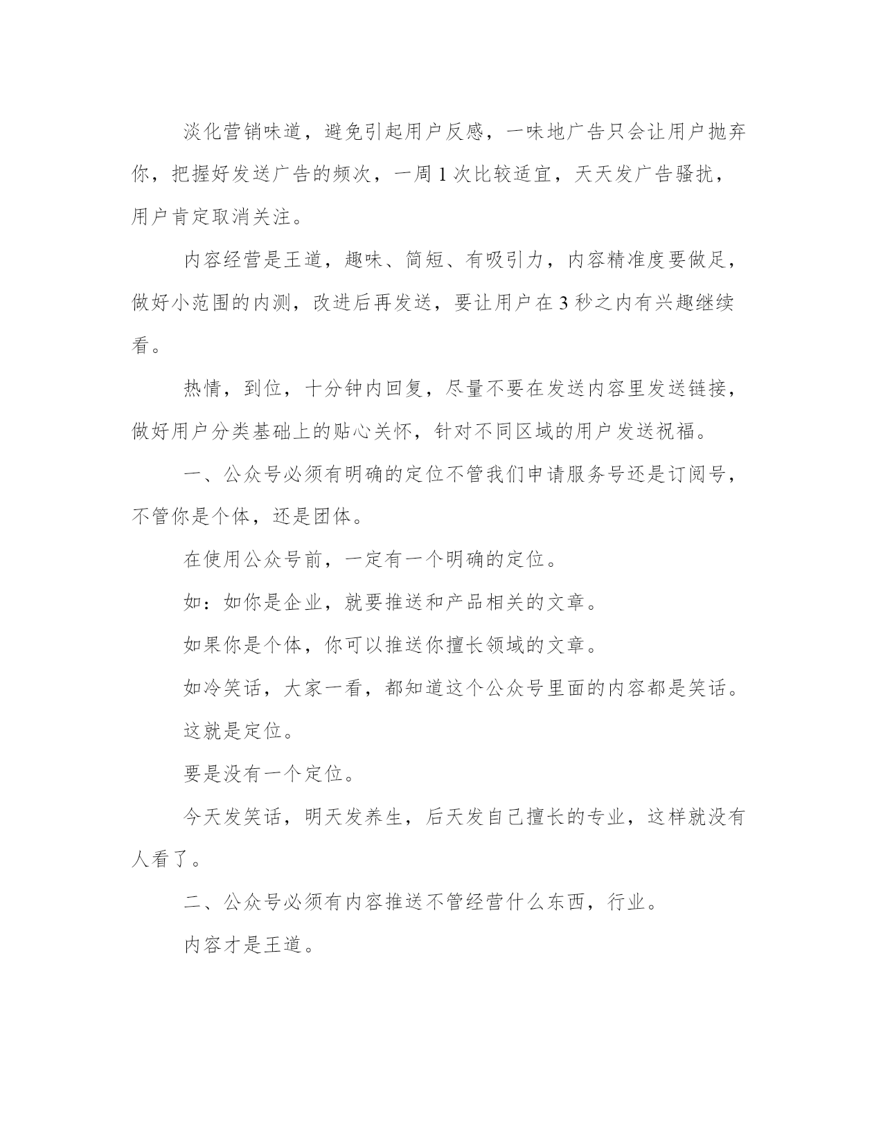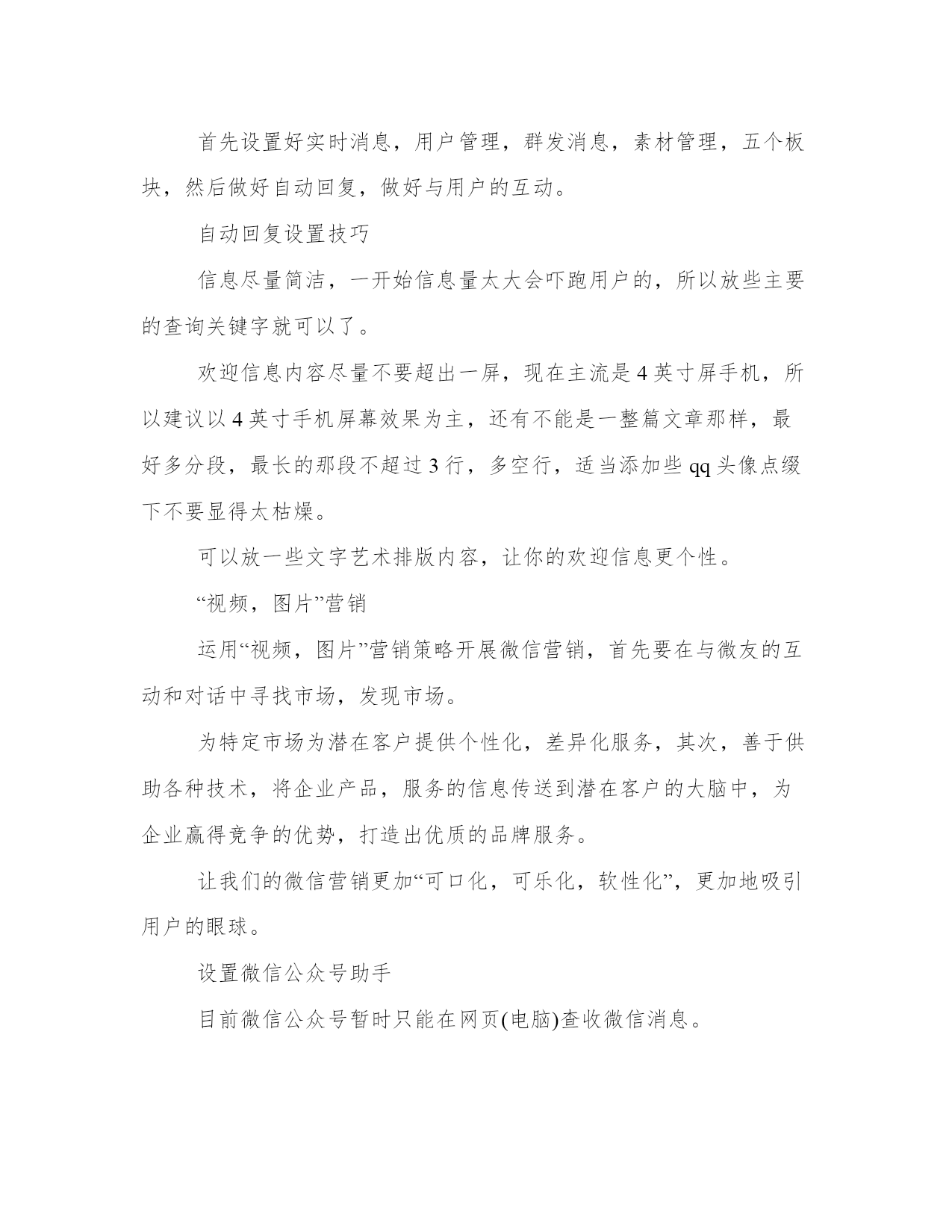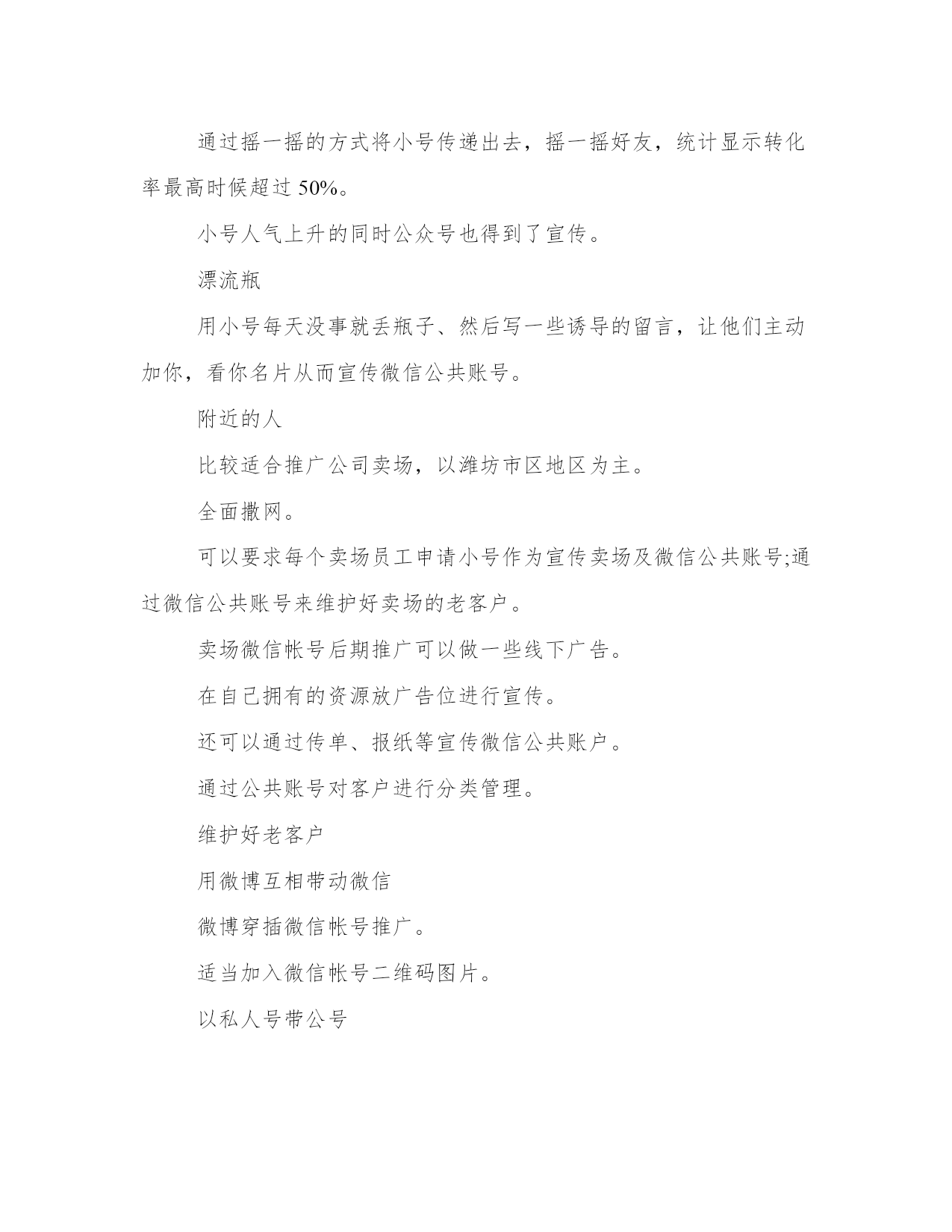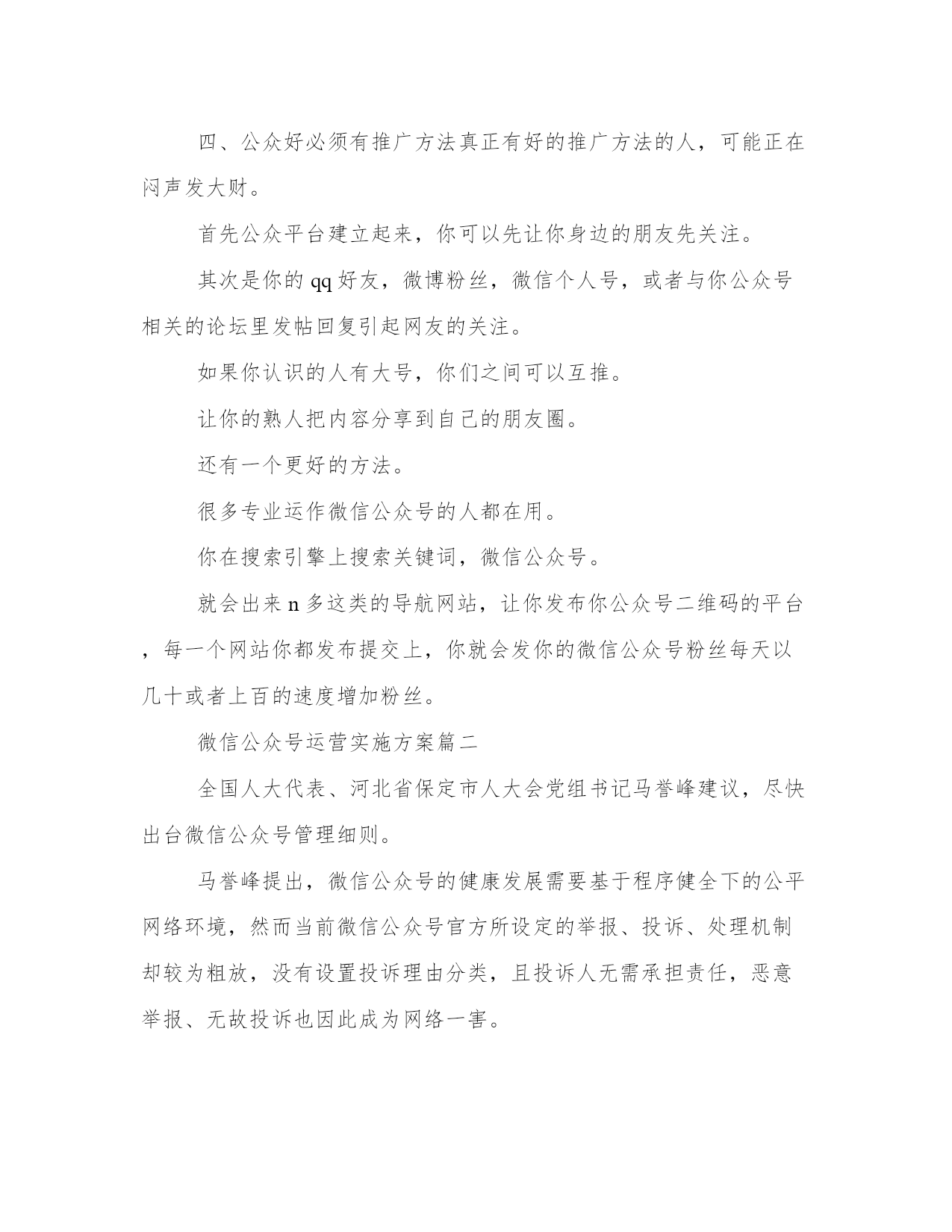 优质微信公众号运营实施方案(汇总23篇)方案的制定是一个策略性的过程,它需要我们对问题的全面了解和深入分析,从而找到最适合的解决方案。在制定方案的过程中,我们需要考虑到各种可能的情况和变数,并进行充分的前期准备工作。一个好的方案不仅需要满足基本需求,还需要考虑到未来的发展和可持续性。制定方案时,需要充分考虑不同利益相关者的意见和建议。没有最好的方案,只有最适合的方案。微信公众号运营实施方案篇一微信现在已经完全地走进人们的生活。微信公众号的层出不穷。那么微信公众号要怎么更好地运营下去呢?小编为大家整理了微信公众号运营策划书,希望对你有所帮助!了解微信营销的价值以后的互联都是移动互联,微信是移动互联真正对话营销时代的未来。移动互联相比,更加的简单快捷,而且占的比例越来越大,作为微信来讲是移动互联中不可忽视的一股用户群,同时也为我们提供了一个超过3亿人使用的宣传平台。微信的传播率高于微博,精准度高于微博,到达率100%。微信不同于微博,微信可以说是跟短信一样,一定会提示用户去看的。这样子我们就要在内容上下功夫,做到内容为王。微信营销是亲民不扰民,用户可以许可式选择和接受,当用户感觉你推送的信息属于垃圾这一类时,那么你就被用户抛弃了,及时推送对用户有用的信息,让用户选择你。渐渐的才能掌握用户的需求,来宣传我们的品牌产品。微信不偏向传统营销,更贴近于真正对话。微信公共账号不是推的广告。不能当作传统广告来推送那样子用户有权利去抛弃你。当然微信也会让用会觉得你体验了vip的一对一服务。微信不是媒体,可以作为crm工具使用。对用户进行分类一般一般可以分为abcd四类,a为老用户,对其进行维护确保客户不流失,b类潜在客户对我们品牌产品都很有兴趣。与我们公共账号互动频繁的。逐渐发展成我们的顾客。c类开发中客户,多进行一些产品知识的内容推送。和促销信息的推送让用户感觉你专业化,官方化。渐渐对拟建立信任从而成为你的客户,d类也就是每天新增的关注,可以通过沟通了解来判定用户的需求从而进行分类,让用户从d到a的这个转换过程就是我们要做的。微信公共账号自身设定首先设置好实时消息,用户管理,群发消息,素材管理,五个板块,然后做好自动回复,做好与用户的互动。自动回复设置技巧信息尽量简洁,一开始信息量太大会吓跑用户的,所以放些主要的查询关键字就可以了。欢迎信息内容尽量不要超出一屏,现在主流是4英寸屏手机,所以建议以4英寸手机屏幕效果为主,还有不能是一整篇文章那样,最好多分段,最长的那段不超过3行,多空行,适当添加些qq头像点缀下不要显得太枯燥。可以放一些文字艺术排版内容,让你的欢迎信息更个性。“视频,图片”营销运用“视频,图片”营销策略开展微信营销,首先要在与微友的互动和对话中寻找市场,发现市场。为特定市场为潜在客户提供个性化,差异化服务,其次,善于供助各种技术,将企业产品,服务的信息传送到潜在客户的大脑中,为企业赢得竞争的优势,打造出优质的品牌服务。让我们的微信营销更加“可口化,可乐化,软性化”,更加地吸引用户的眼球。设置微信公众号助手目前微信公众号暂时只能在网页(电脑)查收微信消息。粉丝回复的信息不支持通过公众助手在手机接收,公众助手仅提供群发的一个功能。通过附近的人能搜到微信公共帐号这是微信与商家合作推出的活动,目前处于内测阶段,暂不支持主动申请。微信公共账号推广网站论坛发帖,行业网站发帖贴吧、手机行业网站、(如威锋网、机锋网、中关村手机、手机中国等)网络技术类网站、(如雷锋网、站长之家等)发帖,做宣传。微信互推用个人帐号带动公共账号。通过小号多做宣传。位置签名形式:在签名档上放广告,用户查找附近人,或者摇一摇时会看到。这类似小广告,强制收看,优点是可以针对附近用户,全面宣传摇一摇摇一摇是一种趣味交友的模式。为了成功利用这一部分人好奇心与交友欲,可以规划美女传播主题计划。通过摇一摇的方式将小号传递出去,摇一摇好友,统计显示转化率最高时候超过50%。小号人气上升的同时公众号也得到了宣传。漂流瓶用小号每天没事就丢瓶子、然后写一些诱导的留言,让他们主动加你,看你名片从而宣传微信公共账号。附近的人比较适合推广公司卖场,以潍坊市区地区为主。全面撒网。可以要求每个卖场员工申请小号作为宣传卖场及微信公共账号;通过微信公共账号来维护好卖场的老客户。卖场微信帐号后期推广可以做一些线下广告。在自己拥有的资源放广告位进行宣传。还可以通过传单、报纸等宣传微信公共账户。通过公共账号对客户进行分类管理。维护好老客户用微博互相带动微信微博穿插微信帐号推广。适当加入微信帐号二维码图片。以私人号带公号用自己的私人号的'朋友,把公共号分享到朋友圈,发动身边的
