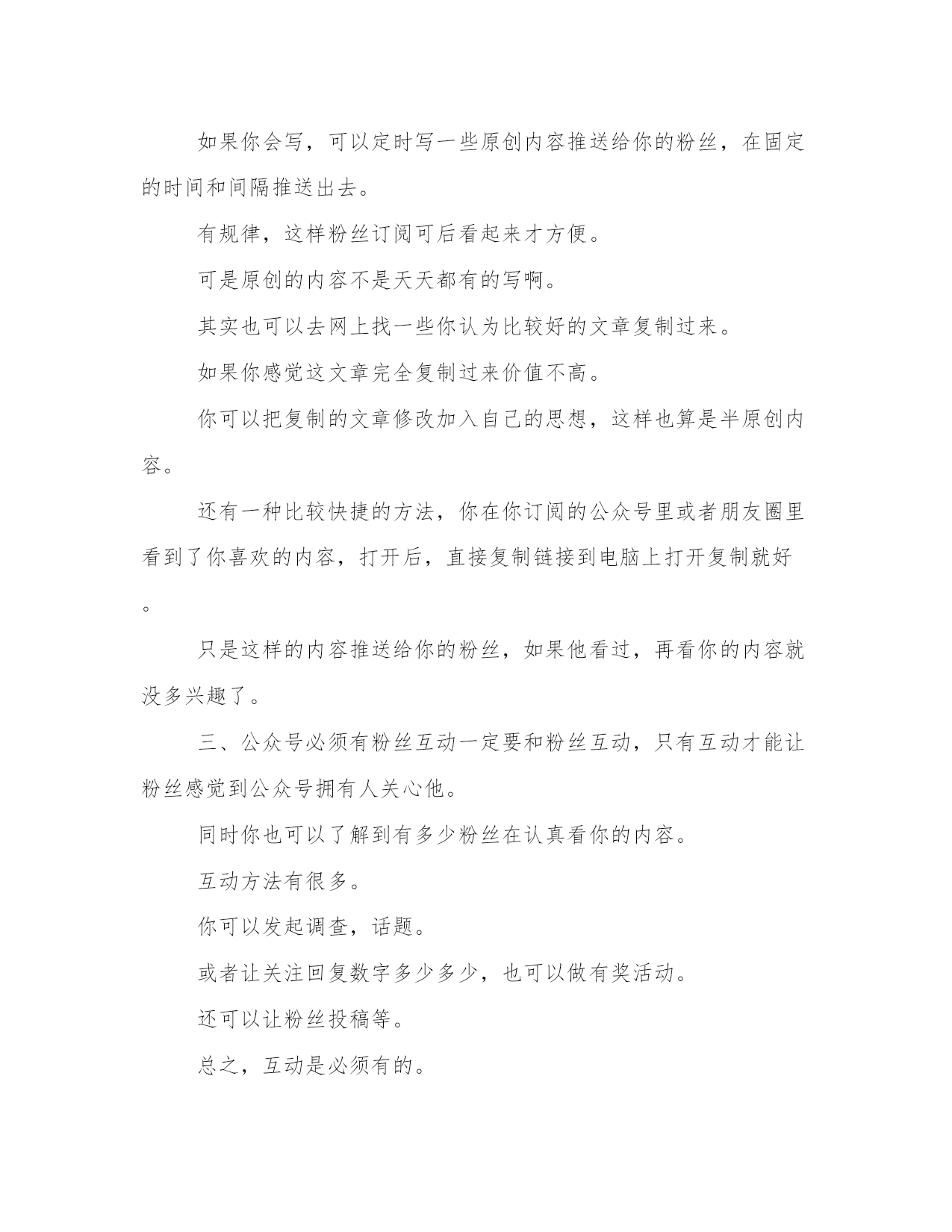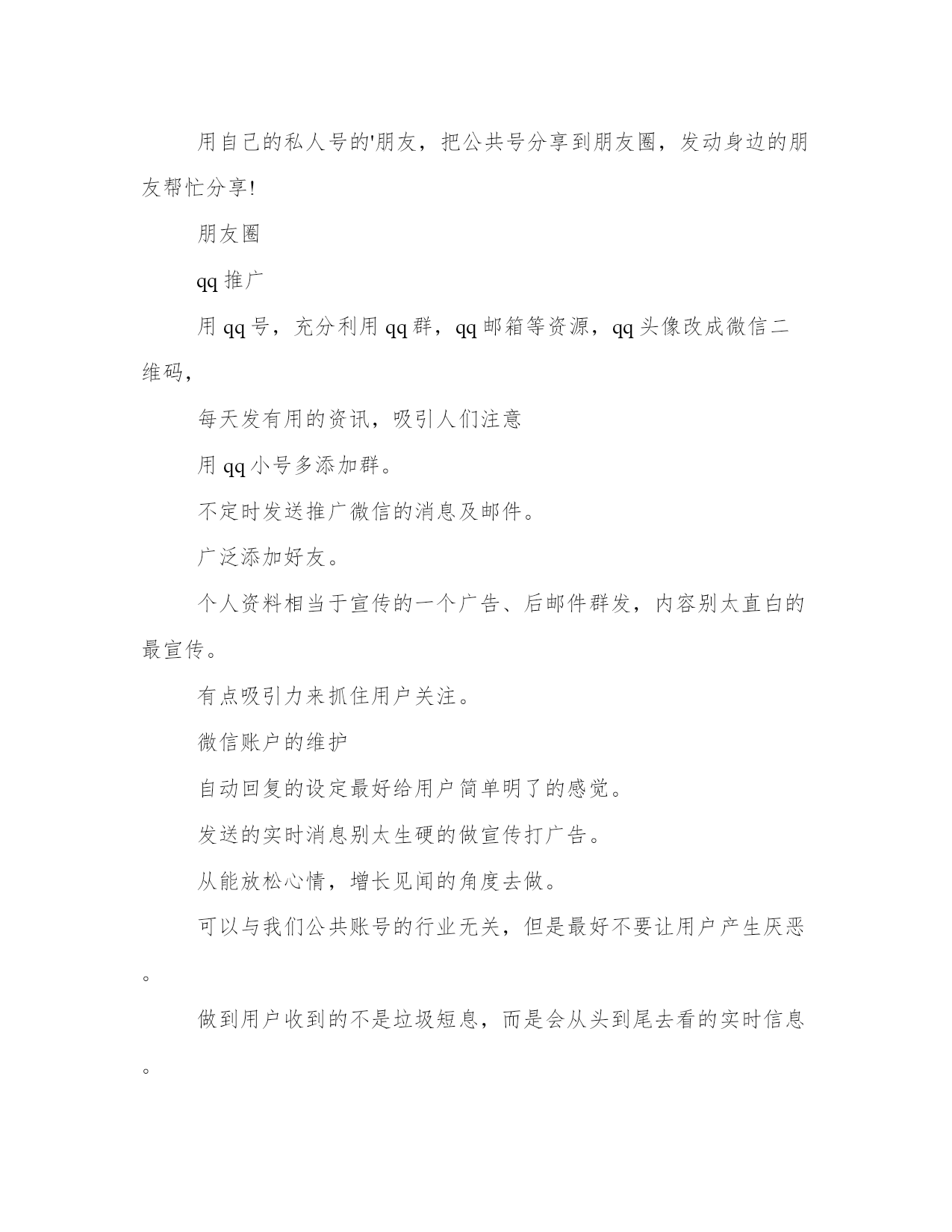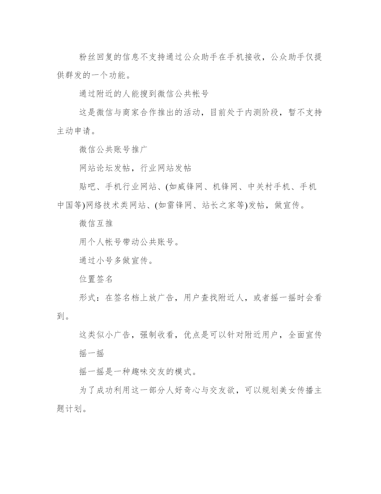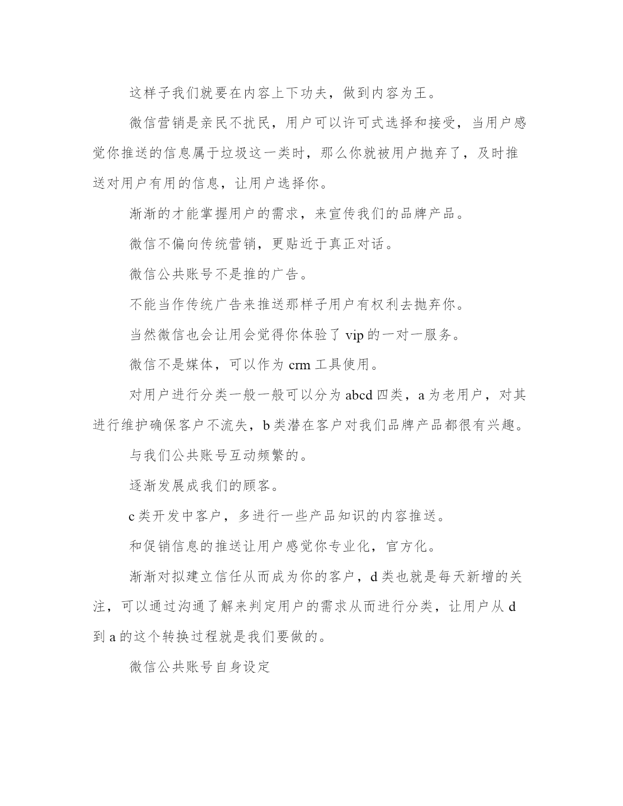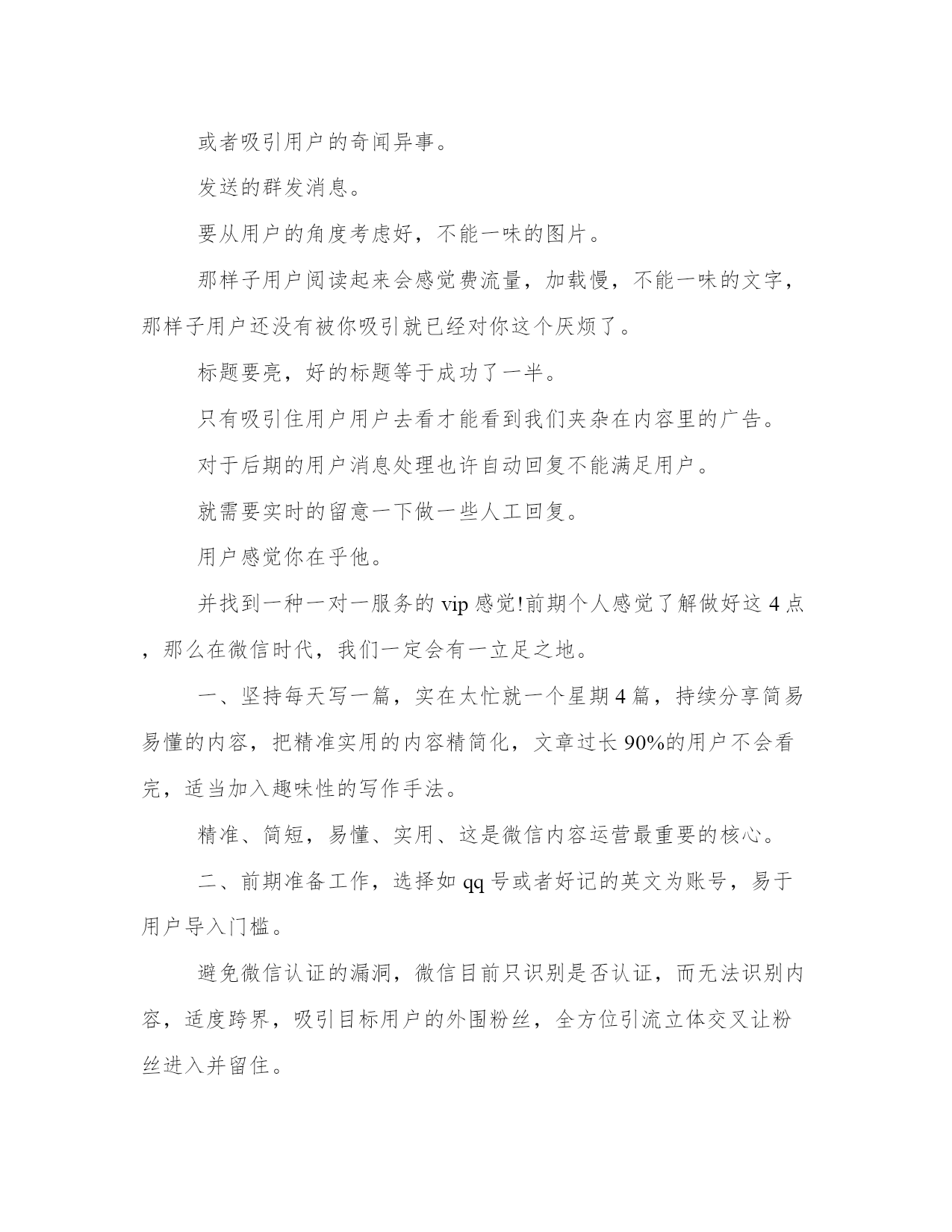 优质微信公众号运营实施方案(汇总23篇)方案的制定是一个策略性的过程,它需要我们对问题的全面了解和深入分析,从而找到最适合的解决方案。在制定方案的过程中,我们需要考虑到各种可能的情况和变数,并进行充分的前期准备工作。一个好的方案不仅需要满足基本需求,还需要考虑到未来的发展和可持续性。制定方案时,需要充分考虑不同利益相关者的意见和建议。没有最好的方案,只有最适合的方案。微信公众号运营实施方案篇一微信现在已经完全地走进人们的生活。微信公众号的层出不穷。那么微信公众号要怎么更好地运营下去呢?小编为大家整理了微信公众号运营策划书,希望对你有所帮助!了解微信营销的价值以后的互联都是移动互联,微信是移动互联真正对话营销时代的未来。移动互联相比,更加的简单快捷,而且占的比例越来越大,作为微信来讲是移动互联中不可忽视的一股用户群,同时也为我们提供了一个超过3亿人使用的宣传平台。微信的传播率高于微博,精准度高于微博,到达率100%。微信不同于微博,微信可以说是跟短信一样,一定会提示用户去看的。这样子我们就要在内容上下功夫,做到内容为王。微信营销是亲民不扰民,用户可以许可式选择和接受,当用户感觉你推送的信息属于垃圾这一类时,那么你就被用户抛弃了,及时推送对用户有用的信息,让用户选择你。渐渐的才能掌握用户的需求,来宣传我们的品牌产品。微信不偏向传统营销,更贴近于真正对话。微信公共账号不是推的广告。不能当作传统广告来推送那样子用户有权利去抛弃你。当然微信也会让用会觉得你体验了vip的一对一服务。微信不是媒体,可以作为crm工具使用。对用户进行分类一般一般可以分为abcd四类,a为老用户,对其进行维护确保客户不流失,b类潜在客户对我们品牌产品都很有兴趣。与我们公共账号互动频繁的。逐渐发展成我们的顾客。c类开发中客户,多进行一些产品知识的内容推送。和促销信息的推送让用户感觉你专业化,官方化。渐渐对拟建立信任从而成为你的客户,d类也就是每天新增的关注,可以通过沟通了解来判定用户的需求从而进行分类,让用户从d到a的这个转换过程就是我们要做的。微信公共账号自身设定首先设置好实时消息,用户管理,群发消息,素材管理,五个板块,然后做好自动回复,做好与用户的互动。自动回复设置技巧信息尽量简洁,一开始信息量太大会吓跑用户的,所以放些主要的查询关键字就可以了。欢迎信息内容尽量不要超出一屏,现在主流是4英寸屏手机,所以建议以4英寸手机屏幕效果为主,还有不能是一整篇文章那样,最好多分段,最长的那段不超过3行,多空行,适当添加些qq头像点缀下不要显得太枯燥。可以放一些文字艺术排版内容,让你的欢迎信息更个性。“视频,图片”营销运用“视频,图片”营销策略开展微信营销,首先要在与微友的互动和对话中寻找市场,发现市场。为特定市场为潜在客户提供个性化,差异化服务,其次,善于供助各种技术,将企业产品,服务的信息传送到潜在客户的大脑中,为企业赢得竞争的优势,打造出优质的品牌服务。让我们的微信营销更加“可口化,可乐化,软性化”,更加地吸引用户的眼球。设置微信公众号助手目前微信公众号暂时只能在网页(电脑)查收微信消息。粉丝回复的信息不支持通过公众助手在手机接收,公众助手仅提供群发的一个功能。通过附近的人能搜到微信公共帐号这是微信与商家合作推出的活动,目前处于内测阶段,暂不支持主动申请。微信公共账号推广网站论坛发帖,行业网站发帖贴吧、手机行业网站、(如威锋网、机锋网、中关村手机、手机中国等)网络技术类网站、(如雷锋网、站长之家等)发帖,做宣传。微信互推用个人帐号带动公共账号。通过小号多做宣传。位置签名形式:在签名档上放广告,用户查找附近人,或者摇一摇时会看到。这类似小广告,强制收看,优点是可以针对附近用户,全面宣传摇一摇摇一摇是一种趣味交友的模式。为了成功利用这一部分人好奇心与交友欲,可以规划美女传播主题计划。通过摇一摇的方式将小号传递出去,摇一摇好友,统计显示转化率最高时候超过50%。小号人气上升的同时公众号也得到了宣传。漂流瓶用小号每天没事就丢瓶子、然后写一些诱导的留言,让他们主动加你,看你名片从而宣传微信公共账号。附近的人比较适合推广公司卖场,以潍坊市区地区为主。全面撒网。可以要求每个卖场员工申请小号作为宣传卖场及微信公共账号;通过微信公共账号来维护好卖场的老客户。卖场微信帐号后期推广可以做一些线下广告。在自己拥有的资源放广告位进行宣传。还可以通过传单、报纸等宣传微信公共账户。通过公共账号对客户进行分类管理。维护好老客户用微博互相带动微信微博穿插微信帐号推广。适当加入微信帐号二维码图片。以私人号带公号用自己的私人号的'朋友,把公共号分享到朋友圈,发动身边的