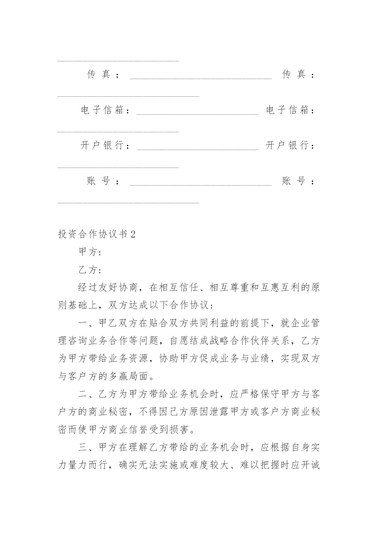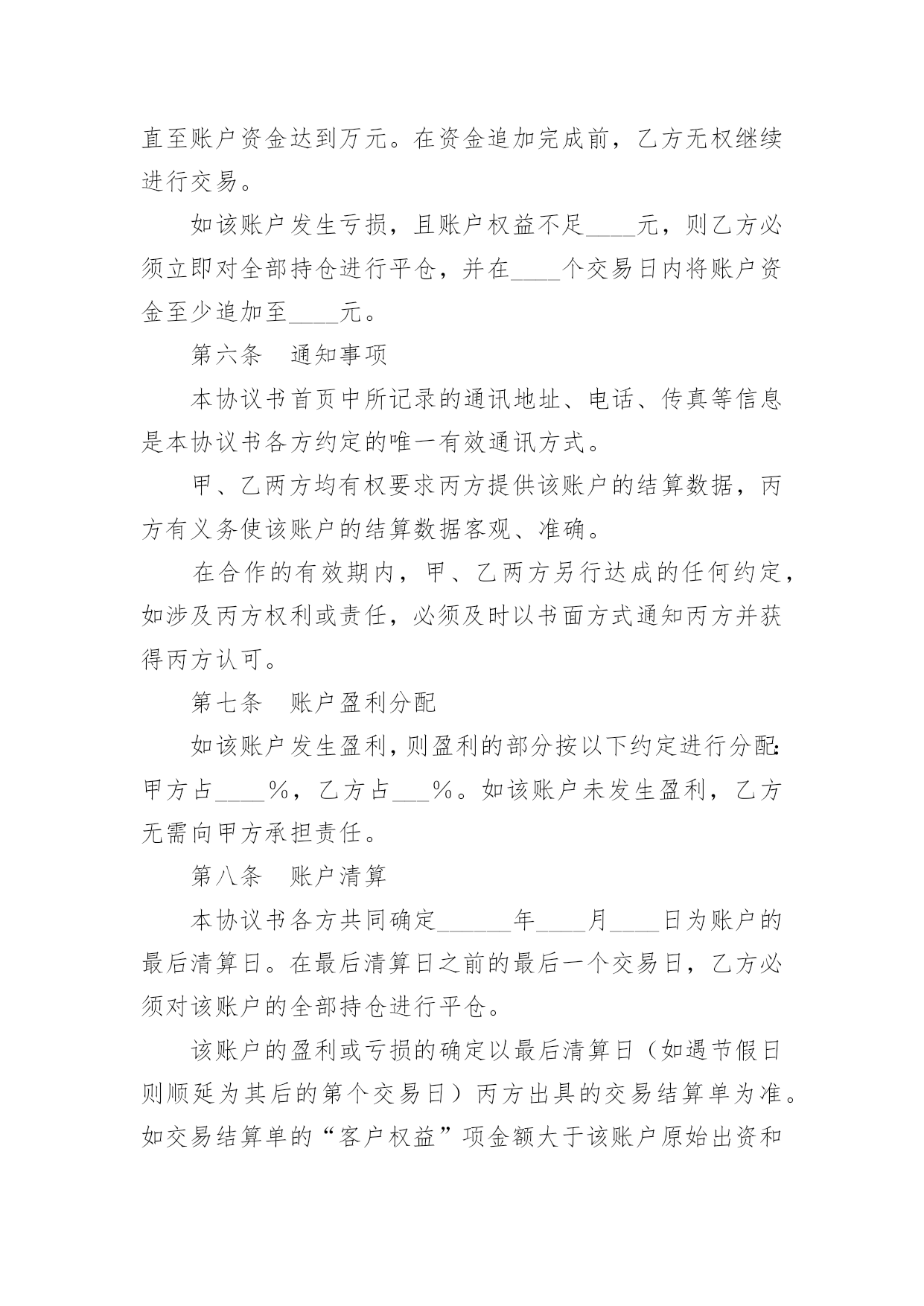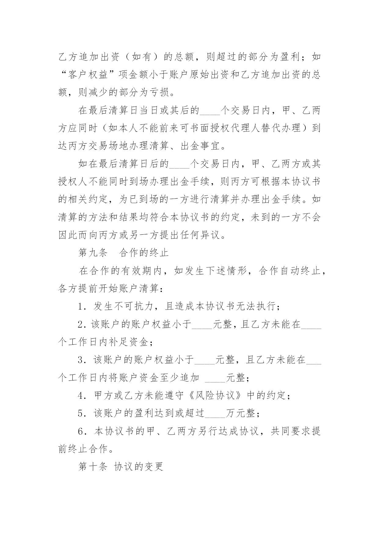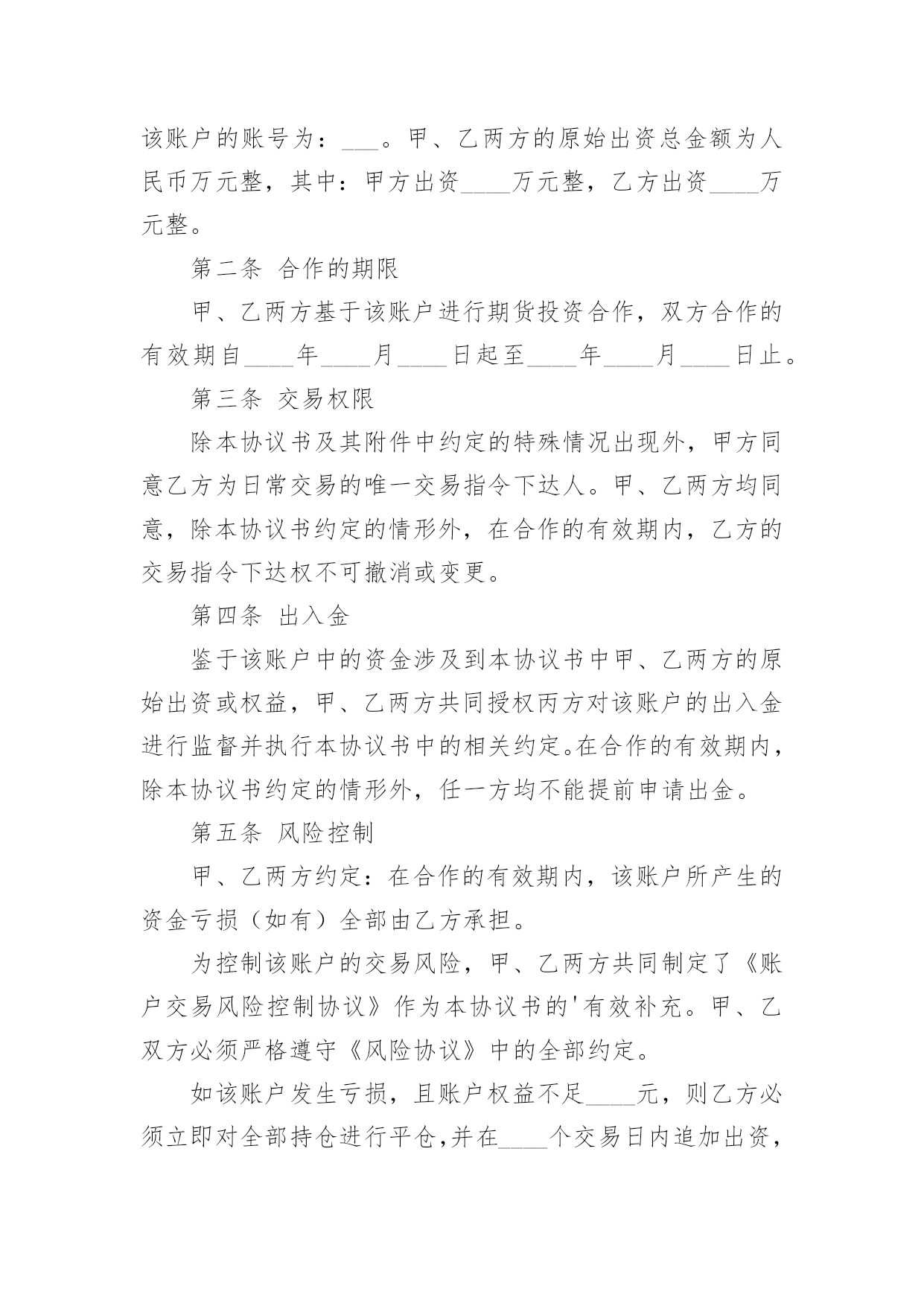 投资合作协议书投资合作协议书精品[15篇]在学习、工作生活中,协议在生活中的使用越来越广泛,协议的签订是双方或数方之间权利义务的最好规范。什么样的协议才是有效的呢?以下是小编帮大家整理的投资合作协议书,欢迎大家分享。投资合作协议书1甲方:___________________________合同编号:___________________法定代表人:_____________________签订地址:___________________乙方:___________________________签订日期:______年____月___日法定代表人:_____________________甲乙双方本着互惠互利,共同受益的原则,经过友好协商,根据《中华人民共和国合同法》的有关规定,就期货投资合作事宜,在互惠互利的基础上达成以下协议,并承诺共同遵守。第一条原始出资甲、乙两方共同出资在丙方处开设期货交易账户,交易账户的名称为:___(即甲方名称,以下简称“该账户”),该账户的账号为:___。甲、乙两方的原始出资总金额为人民币万元整,其中:甲方出资____万元整,乙方出资____万元整。第二条合作的期限甲、乙两方基于该账户进行期货投资合作,双方合作的有效期自____年____月____日起至____年____月____日止。第三条交易权限除本协议书及其附件中约定的特殊情况出现外,甲方同意乙方为日常交易的唯一交易指令下达人。甲、乙两方均同意,除本协议书约定的情形外,在合作的有效期内,乙方的交易指令下达权不可撤消或变更。第四条出入金鉴于该账户中的资金涉及到本协议书中甲、乙两方的原始出资或权益,甲、乙两方共同授权丙方对该账户的出入金进行监督并执行本协议书中的相关约定。在合作的有效期内,除本协议书约定的情形外,任一方均不能提前申请出金。第五条风险控制甲、乙两方约定:在合作的有效期内,该账户所产生的资金亏损(如有)全部由乙方承担。为控制该账户的交易风险,甲、乙两方共同制定了《账户交易风险控制协议》作为本协议书的'有效补充。甲、乙双方必须严格遵守《风险协议》中的全部约定。如该账户发生亏损,且账户权益不足____元,则乙方必须立即对全部持仓进行平仓,并在____个交易日内追加出资,直至账户资金达到万元。在资金追加完成前,乙方无权继续进行交易。如该账户发生亏损,且账户权益不足____元,则乙方必须立即对全部持仓进行平仓,并在____个交易日内将账户资金至少追加至____元。第六条通知事项本协议书首页中所记录的通讯地址、电话、传真等信息是本协议书各方约定的唯一有效通讯方式。甲、乙两方均有权要求丙方提供该账户的结算数据,丙方有义务使该账户的结算数据客观、准确。在合作的有效期内,甲、乙两方另行达成的任何约定,如涉及丙方权利或责任,必须及时以书面方式通知丙方并获得丙方认可。第七条账户盈利分配如该账户发生盈利,则盈利的部分按以下约定进行分配:甲方占____%,乙方占___%。如该账户未发生盈利,乙方无需向甲方承担责任。第八条账户清算本协议书各方共同确定______年____月____日为账户的最后清算日。在最后清算日之前的最后一个交易日,乙方必须对该账户的全部持仓进行平仓。该账户的盈利或亏损的确定以最后清算日(如遇节假日则顺延为其后的第个交易日)丙方出具的交易结算单为准。如交易结算单的“客户权益”项金额大于该账户原始出资和乙方追加出资(如有)的总额,则超过的部分为盈利;如“客户权益”项金额小于账户原始出资和乙方追加出资的总额,则减少的部分为亏损。在最后清算日当日或其后的____个交易日内,甲、乙两方应同时(如本人不能前来可书面授权代理人替代办理)到达丙方交易场地办理清算、出金事宜。如在最后清算日后的____个交易日内,甲、乙两方或其授权人不能同时到场办理出金手续,则丙方可根据本协议书的相关约定,为已到场的一方进行清算并办理出金手续。如清算的方法和结果均符合本协议书的约定,未到的一方不会因此而向丙方或另一方提出任何异议。第九条合作的终止在合作的有效期内,如发生下述情形,合作自动终止,各方提前开始账户清算:1.发生不可抗力,且造成本协议书无法执行;2.该账户的账户权益小于____元整,且乙方未能在____个工作日内补足资金;3.该账户的账户权益小于____元整,且乙方未能在___个工作日内将账户资金至少追加____元整;4.甲方或乙方未能遵守《风险协议》中的约定;5.该账户的盈利达到或超过____万元整;6.本协议书的甲、乙两方另行达成协议,共同要求提前终止合作。第十条协议的变更对本协议书及其附件的任何变更,均需本协议书的三方另行达成协议。第十一条协议的附件《账户交易风险控制协议》是本协议书的附件一,是本协议书不可分割的组成部分,与本协议书具有相同的约束力。
