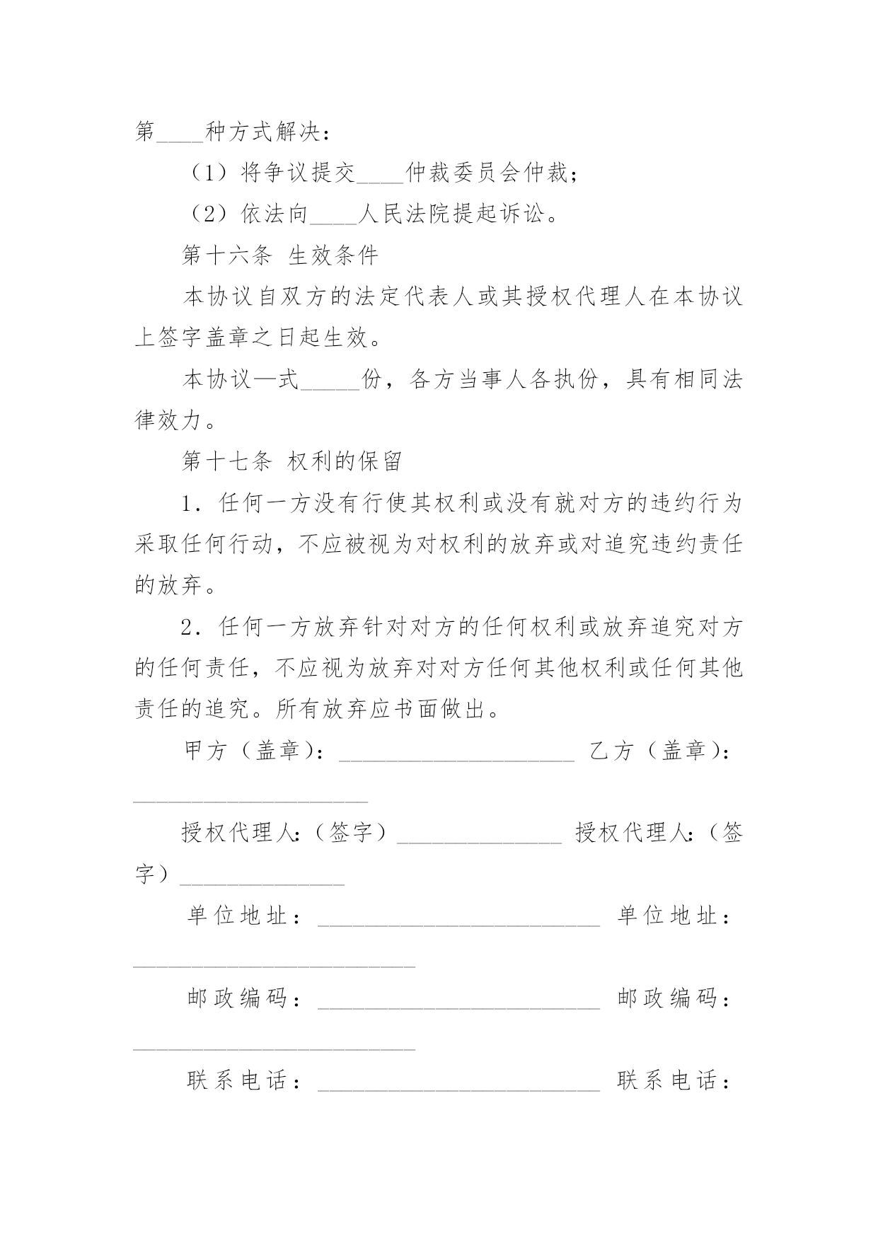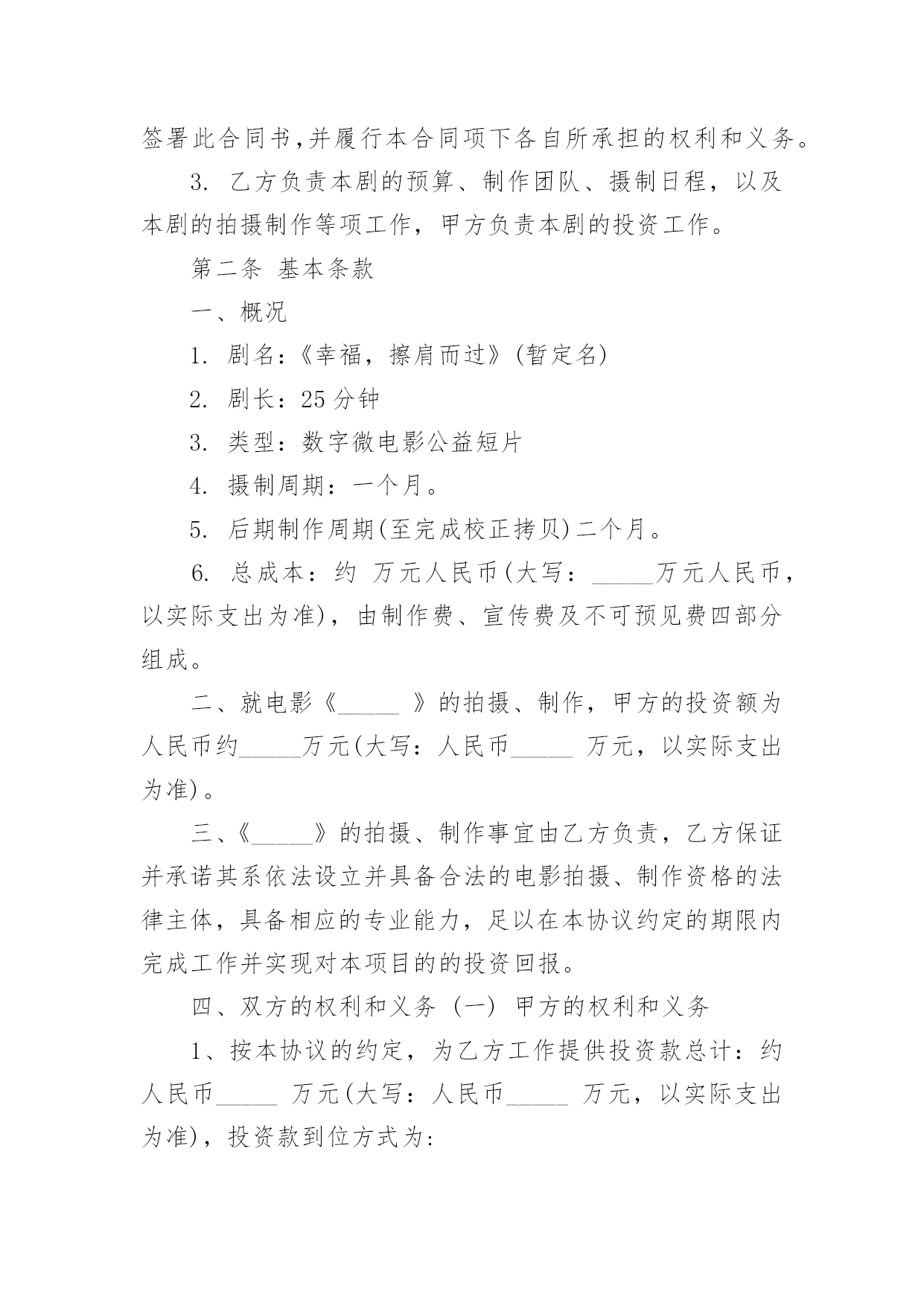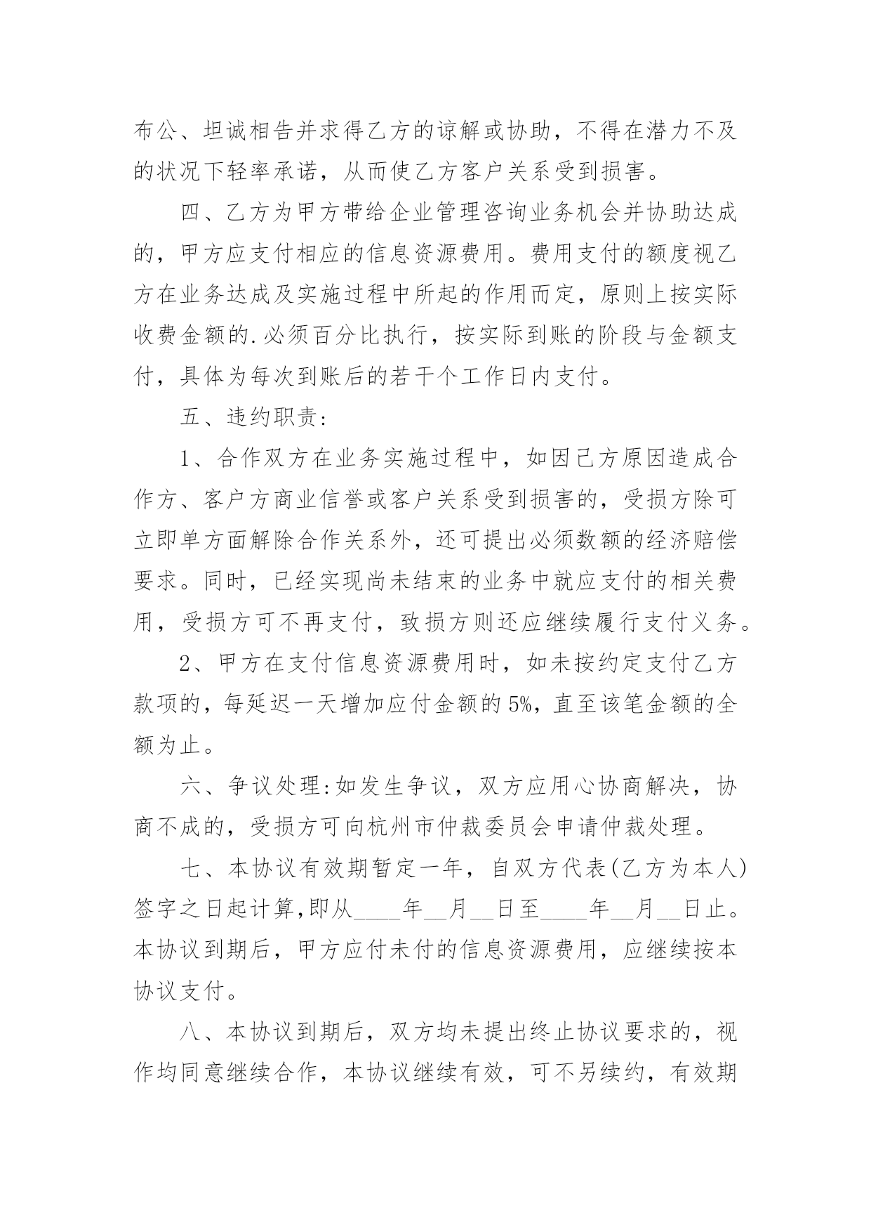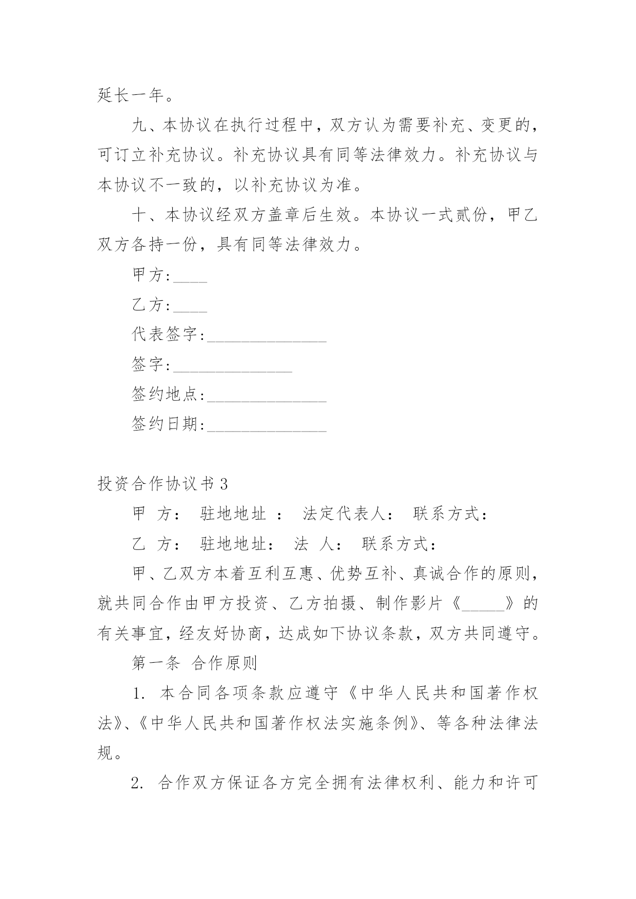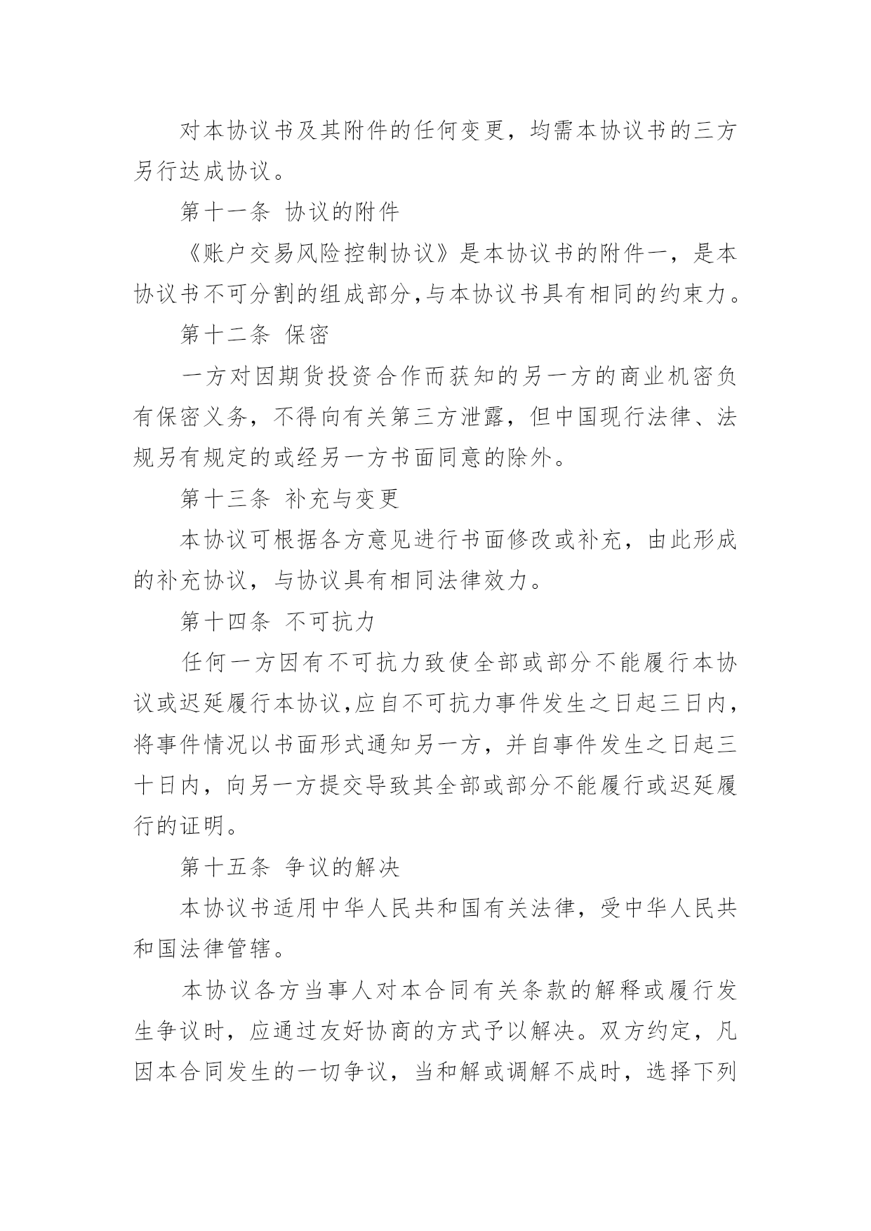 投资合作协议书投资合作协议书精品[15篇]在学习、工作生活中,协议在生活中的使用越来越广泛,协议的签订是双方或数方之间权利义务的最好规范。什么样的协议才是有效的呢?以下是小编帮大家整理的投资合作协议书,欢迎大家分享。投资合作协议书1甲方:___________________________合同编号:___________________法定代表人:_____________________签订地址:___________________乙方:___________________________签订日期:______年____月___日法定代表人:_____________________甲乙双方本着互惠互利,共同受益的原则,经过友好协商,根据《中华人民共和国合同法》的有关规定,就期货投资合作事宜,在互惠互利的基础上达成以下协议,并承诺共同遵守。第一条原始出资甲、乙两方共同出资在丙方处开设期货交易账户,交易账户的名称为:___(即甲方名称,以下简称“该账户”),该账户的账号为:___。甲、乙两方的原始出资总金额为人民币万元整,其中:甲方出资____万元整,乙方出资____万元整。第二条合作的期限甲、乙两方基于该账户进行期货投资合作,双方合作的有效期自____年____月____日起至____年____月____日止。第三条交易权限除本协议书及其附件中约定的特殊情况出现外,甲方同意乙方为日常交易的唯一交易指令下达人。甲、乙两方均同意,除本协议书约定的情形外,在合作的有效期内,乙方的交易指令下达权不可撤消或变更。第四条出入金鉴于该账户中的资金涉及到本协议书中甲、乙两方的原始出资或权益,甲、乙两方共同授权丙方对该账户的出入金进行监督并执行本协议书中的相关约定。在合作的有效期内,除本协议书约定的情形外,任一方均不能提前申请出金。第五条风险控制甲、乙两方约定:在合作的有效期内,该账户所产生的资金亏损(如有)全部由乙方承担。为控制该账户的交易风险,甲、乙两方共同制定了《账户交易风险控制协议》作为本协议书的'有效补充。甲、乙双方必须严格遵守《风险协议》中的全部约定。如该账户发生亏损,且账户权益不足____元,则乙方必须立即对全部持仓进行平仓,并在____个交易日内追加出资,直至账户资金达到万元。在资金追加完成前,乙方无权继续进行交易。如该账户发生亏损,且账户权益不足____元,则乙方必须立即对全部持仓进行平仓,并在____个交易日内将账户资金至少追加至____元。第六条通知事项本协议书首页中所记录的通讯地址、电话、传真等信息是本协议书各方约定的唯一有效通讯方式。甲、乙两方均有权要求丙方提供该账户的结算数据,丙方有义务使该账户的结算数据客观、准确。在合作的有效期内,甲、乙两方另行达成的任何约定,如涉及丙方权利或责任,必须及时以书面方式通知丙方并获得丙方认可。第七条账户盈利分配如该账户发生盈利,则盈利的部分按以下约定进行分配:甲方占____%,乙方占___%。如该账户未发生盈利,乙方无需向甲方承担责任。第八条账户清算本协议书各方共同确定______年____月____日为账户的最后清算日。在最后清算日之前的最后一个交易日,乙方必须对该账户的全部持仓进行平仓。该账户的盈利或亏损的确定以最后清算日(如遇节假日则顺延为其后的第个交易日)丙方出具的交易结算单为准。如交易结算单的“客户权益”项金额大于该账户原始出资和乙方追加出资(如有)的总额,则超过的部分为盈利;如“客户权益”项金额小于账户原始出资和乙方追加出资的总额,则减少的部分为亏损。在最后清算日当日或其后的____个交易日内,甲、乙两方应同时(如本人不能前来可书面授权代理人替代办理)到达丙方交易场地办理清算、出金事宜。如在最后清算日后的____个交易日内,甲、乙两方或其授权人不能同时到场办理出金手续,则丙方可根据本协议书的相关约定,为已到场的一方进行清算并办理出金手续。如清算的方法和结果均符合本协议书的约定,未到的一方不会因此而向丙方或另一方提出任何异议。第九条合作的终止在合作的有效期内,如发生下述情形,合作自动终止,各方提前开始账户清算:1.发生不可抗力,且造成本协议书无法执行;2.该账户的账户权益小于____元整,且乙方未能在____个工作日内补足资金;3.该账户的账户权益小于____元整,且乙方未能在___个工作日内将账户资金至少追加____元整;4.甲方或乙方未能遵守《风险协议》中的约定;5.该账户的盈利达到或超过____万元整;6.本协议书的甲、乙两方另行达成协议,共同要求提前终止合作。第十条协议的变更对本协议书及其附件的任何变更,均需本协议书的三方另行达成协议。第十一条协议的附件《账户交易风险控制协议》是本协议书的附件一,是本协议书不可分割的组成部分,与本协议书具有相同的约束力。