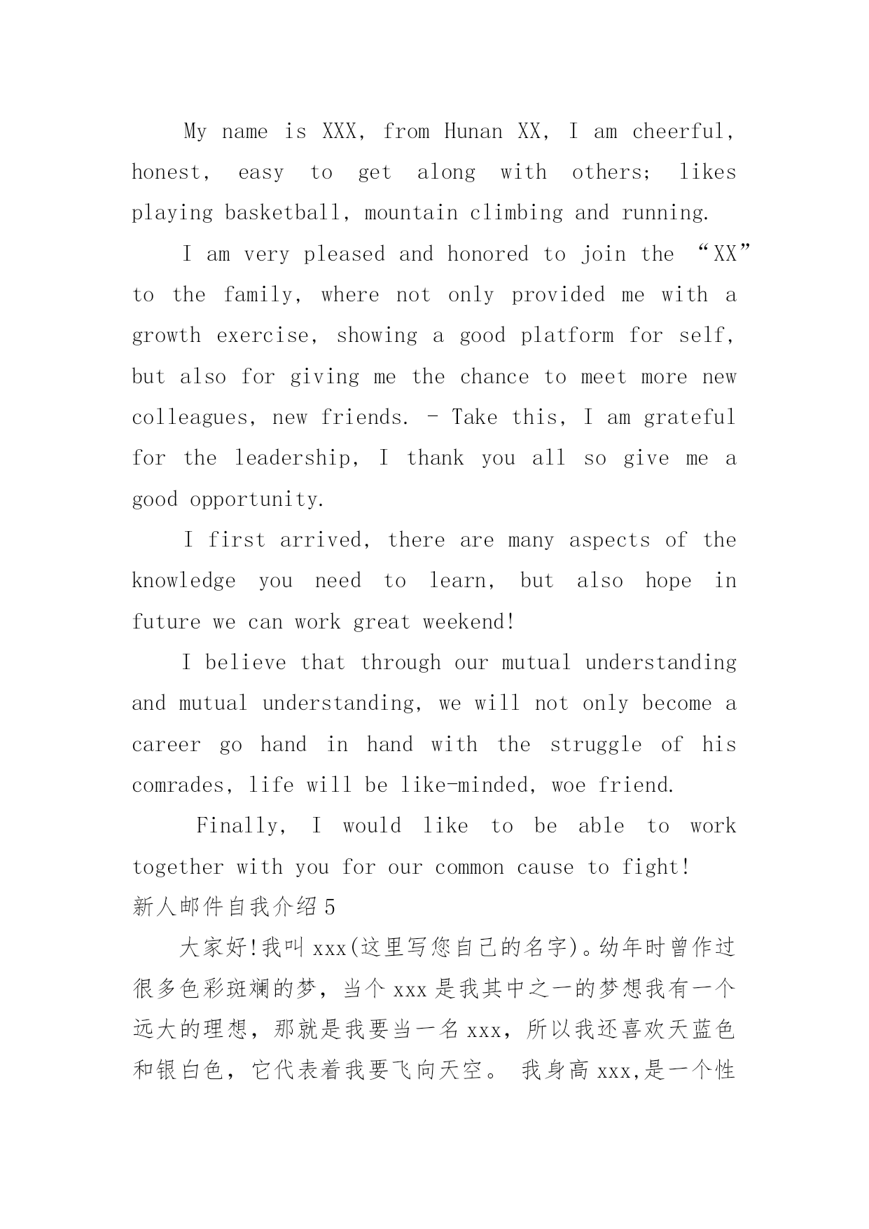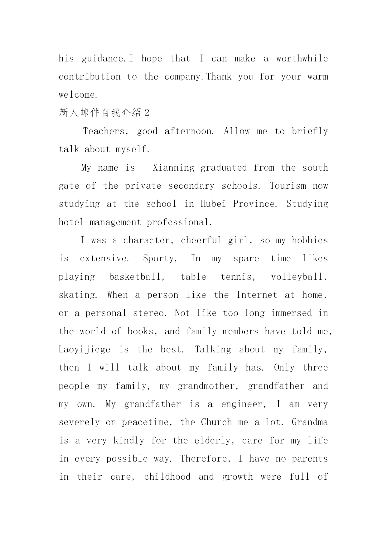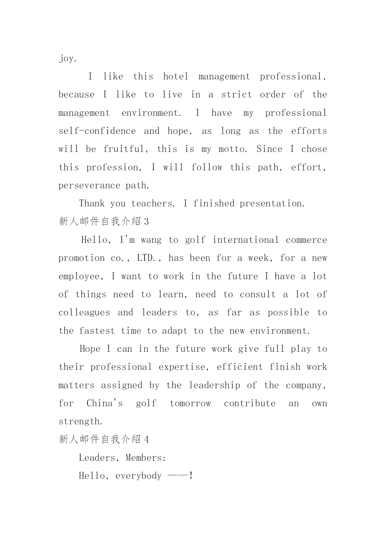 新人邮件自我介绍新人邮件自我介绍处在一个陌生场合时,我们总少不了要向他人介绍自己,自我介绍是我们重新认识自己的开始。那么自我介绍有什么格式呢?以下是小编收集整理的新人邮件自我介绍,仅供参考,欢迎大家阅读。新人邮件自我介绍1Hello,everybody,I'mgladtomeetallofyou.Letmetellyoualittlebitaboutmyself.Bepatientwithme,I'malittlebitnervous.MynameisLouis.I'mreaIlyexcitedtohavethechancetojointheteamhereatLiYangCrazyEnglish.I'mlookingforwardtogettingtoknowallofyou.IrecentlygraduatedfromHarvardwithadegree.inpoliticalscience.MyhobbiesarewatchingTV.andpaintingwatercolors.Myfavoritesportisvolleyball.Beingthenewguyheremakesmefeelalittlebitoutofplace.soIwon'tembarrassmyselfbycallingMr.Leebysomeoneelse's.I'mtryingtoremembername.IfIdomakeamistake,pleaseforgiveme.everybody'snameI'vestudiedthereportsofpastmeetings,andI'veaskedMr.Leeforhisguidance.IhopethatIcanmakeaworthwhilecontributiontothecompany.Thankyouforyourwarmwelcome.新人邮件自我介绍2Teachers,goodafternoon.Allowmetobrieflytalkaboutmyself.Mynameis-Xianninggraduatedfromthesouthgateoftheprivatesecondaryschools.TourismnowstudyingattheschoolinHubeiProvince.Studyinghotelmanagementprofessional.Iwasacharacter,cheerfulgirl,somyhobbiesisextensive.Sporty.Inmysparetimelikesplayingbasketball,tabletennis,volleyball,skating.WhenapersonliketheInternetathome,orapersonalstereo.Notliketoolongimmersedintheworldofbooks,andfamilymembershavetoldme,Laoyijiegeisthebest.Talkingaboutmyfamily,thenIwilltalkaboutmyfamilyhas.Onlythreepeoplemyfamily,mygrandmother,grandfatherandmyown.Mygrandfatherisaengineer,Iamveryseverelyonpeacetime,theChurchmealot.Grandmaisaverykindlyfortheelderly,careformylifeineverypossibleway.Therefore,Ihavenoparentsintheircare,childhoodandgrowthwerefullofjoy.Ilikethishotelmanagementprofessional,becauseIliketoliveinastrictorderofthemanagementenvironment.Ihavemyprofessionalself-confidenceandhope,aslongastheeffortswillbefruitful,thisismymotto.SinceIchosethisprofession,Iwillfollowthispath,effort,perseverancepath.Thankyouteachers.Ifinishedpresentation.新人邮件自我介绍3Hello,I'mwangtogolfinternationalcommercepromotionco.,LTD.,hasbeenforaweek,foranewemployee,Iwanttowork