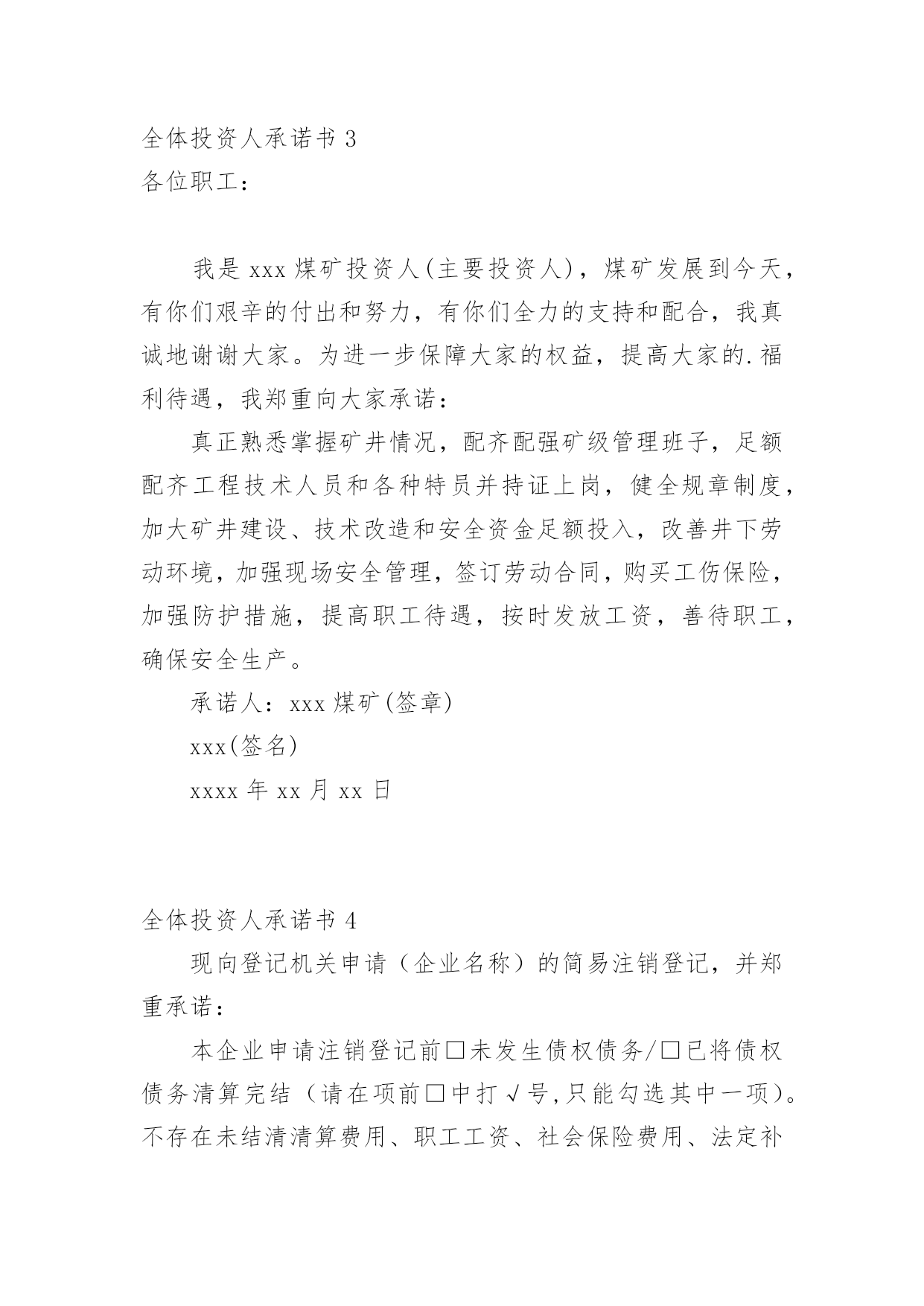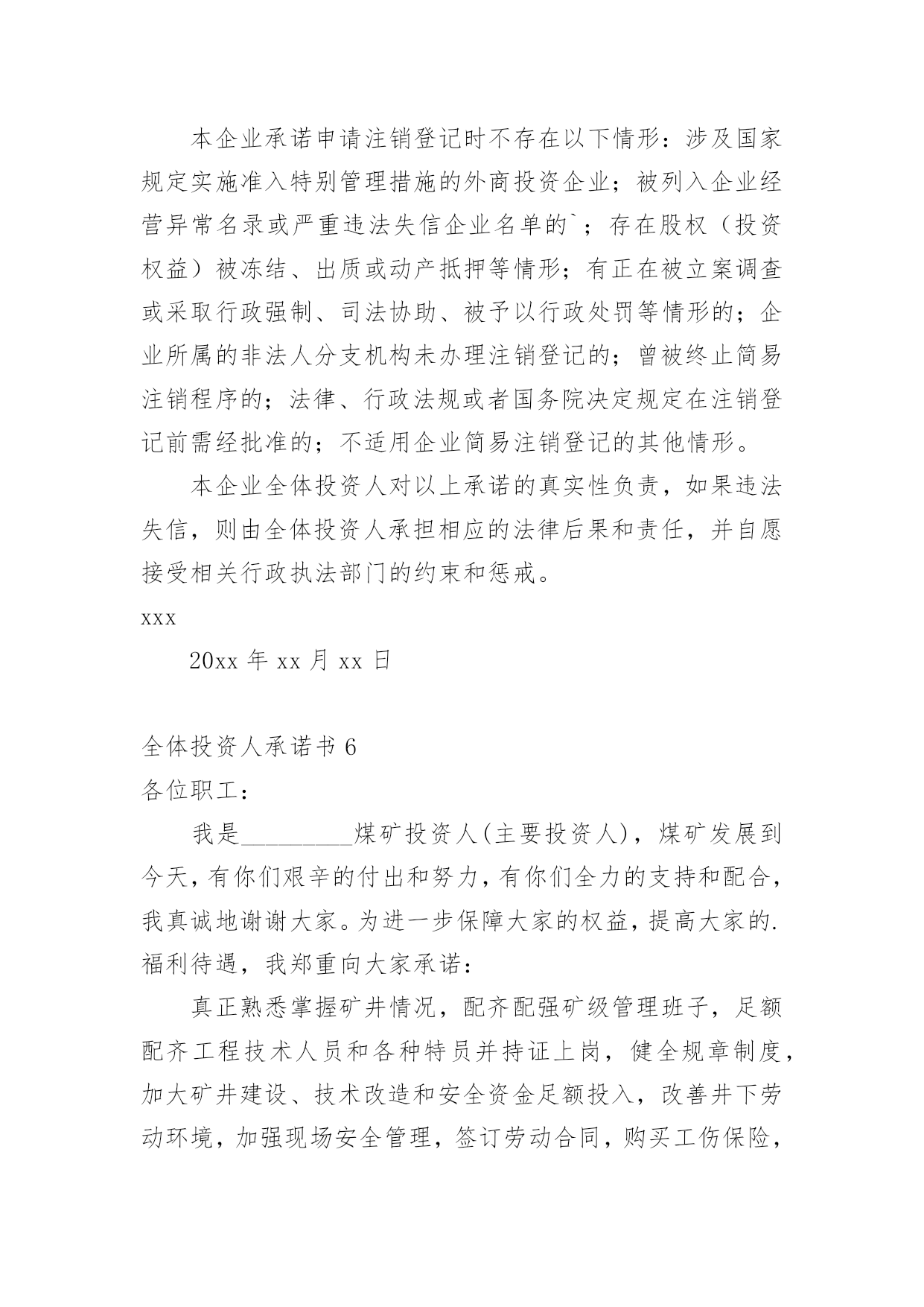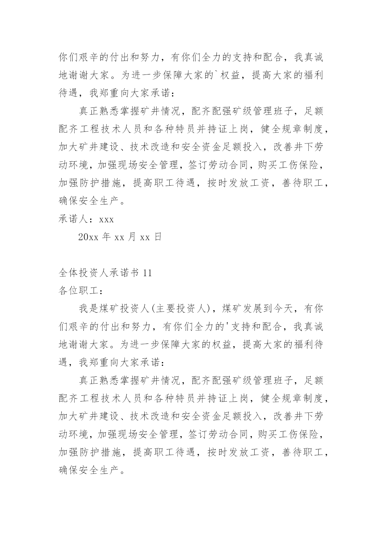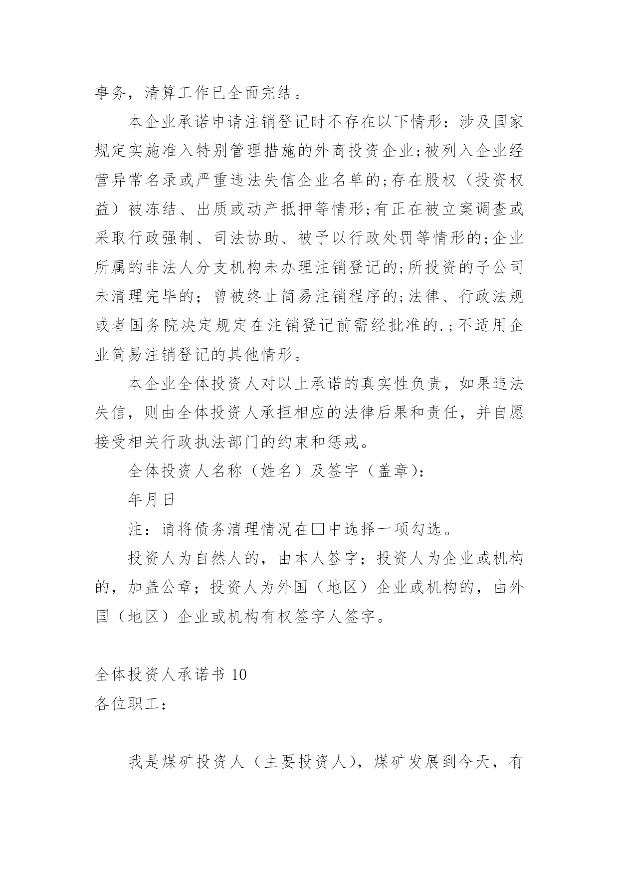 全体投资人承诺书全体投资人承诺书11篇在快速变化和不断变革的新时代,需要使用承诺书的事情愈发增多,不同的承诺书内容同样也是不同的。那要怎么写好承诺书呢?以下是小编为大家收集的全体投资人承诺书,希望对大家有所帮助。全体投资人承诺书1各位职工:你们好!我是xxx煤矿投资人(主要投资人),煤矿发展到今天,有你们艰辛的.付出和努力,有你们全力的支持和配合,我真诚地谢谢大家。为进一步保障大家的权益,提高大家的福利待遇,我郑重向大家承诺:真正熟悉掌握矿井情况,配齐配强矿级管理班子,足额配齐工程技术人员和各种特员并持证上岗,健全规章制度,加大矿井建设、技术改造和安全资金足额投入,改善井下劳动环境,加强现场安全管理,签订劳动合同,购买工伤保险,加强防护措施,提高职工待遇,按时发放工资,善待职工,确保安全生产。xxx20xx年x月x日全体投资人承诺书2现向登记机关申请(企业名称)(统一代码/注册号)的简易注销登记,并郑重承诺:本企业申请注销登记前□未发生债权债务□已将债权债务清算完结,不存在未结清清算费用、职工工资、社会保险费用、法定补偿金和未交清的应缴纳税款及其他未了结事务,清算工作已全面完结。本企业承诺申请注销登记时不存在以下情形:涉及国家规定实施准入特别管理措施的外商投资企业;被列入企业经营异常名录或严重违法失信企业名单的;存在股权(投资权益)被冻结、出质或动产抵押等情形;有正在被立案调查或采取行政强制、司法协助、被予以行政处罚等情形的;企业所属的非法人分支机构未办理注销登记的;所投资的子公司未清理完毕的;曾被终止简易注销程序的;法律、行政法规或者国务院决定规定在注销登记前需经批准的`;不适用企业简易注销登记的其他情形。本企业全体投资人对以上承诺的真实性负责,如果违法失信,则由全体投资人承担相应的法律后果和责任,并自愿接受相关行政执法部门的约束和惩戒。全体投资人名称(姓名)及签字(盖章):xxxxxx年xx月xx日全体投资人承诺书3各位职工:我是xxx煤矿投资人(主要投资人),煤矿发展到今天,有你们艰辛的付出和努力,有你们全力的支持和配合,我真诚地谢谢大家。为进一步保障大家的权益,提高大家的.福利待遇,我郑重向大家承诺:真正熟悉掌握矿井情况,配齐配强矿级管理班子,足额配齐工程技术人员和各种特员并持证上岗,健全规章制度,加大矿井建设、技术改造和安全资金足额投入,改善井下劳动环境,加强现场安全管理,签订劳动合同,购买工伤保险,加强防护措施,提高职工待遇,按时发放工资,善待职工,确保安全生产。承诺人:xxx煤矿(签章)xxx(签名)xxxx年xx月xx日全体投资人承诺书4现向登记机关申请(企业名称)的简易注销登记,并郑重承诺:本企业申请注销登记前□未发生债权债务/□已将债权债务清算完结(请在项前□中打√号,只能勾选其中一项)。不存在未结清清算费用、职工工资、社会保险费用、法定补偿金和未交清的应缴纳税款及其他未了结事务,清算工作已全面完结。本企业承诺申请注销登记时不存在以下情形:涉及国家规定实施准入特别管理措施的.外商投资企业;被列入企业经营异常名录或严重违法失信企业名单的;存在股权(投资权益)被冻结、出质或动产抵押等情形;有正在被立案调查或采取行政强制、司法协助、被予以行政处罚等情形的;企业所属的非法人分支机构未办理注销登记的;曾被终止简易注销程序的;法律、行政法规或者国务院决定规定在注销登记前需经批准的;不适用企业简易注销登记的其他情形。本企业全体投资人对以上承诺的真实性负责,如果违法失信,则由全体投资人承担相应的法律后果和责任,并自愿接受相关行政执法部门的约束和惩戒。全体投资人签字(盖章):年月日注:填写后将全体投资人承诺书照片(大小不超过300KB)上传,照片务必清晰,否则无法通过简易注销。全体投资人承诺书5xxx的简易注销登记,并郑重承诺:本企业申请注销登记前未发生债权债务/已将债权债务清算完结,不存在未结清清算费用、职工工资、社会保险费用、法定补偿金和未交清的应缴纳税款及其他未了结事务,清算工作已全面完结。本企业承诺申请注销登记时不存在以下情形:涉及国家规定实施准入特别管理措施的外商投资企业;被列入企业经营异常名录或严重违法失信企业名单的`;存在股权(投资权益)被冻结、出质或动产抵押等情形;有正在被立案调查或采取行政强制、司法协助、被予以行政处罚等情形的;企业所属的非法人分支机构未办理注销登记的;曾被终止简易注销程序的;法律、行政法规或者国务院决定规定在注销登记前需经批准的;不适用企业简易注销登记的其他情形。本企业全体投资人对以上承诺的真实性负责,如果违法失信,则由全体投资人承担相应的法律后果和责任,并自愿接受相关行政执法部门的约束和惩戒。xxx20xx年xx月xx日全体投资人承诺书6各位职工:我是_________煤矿投资人(主