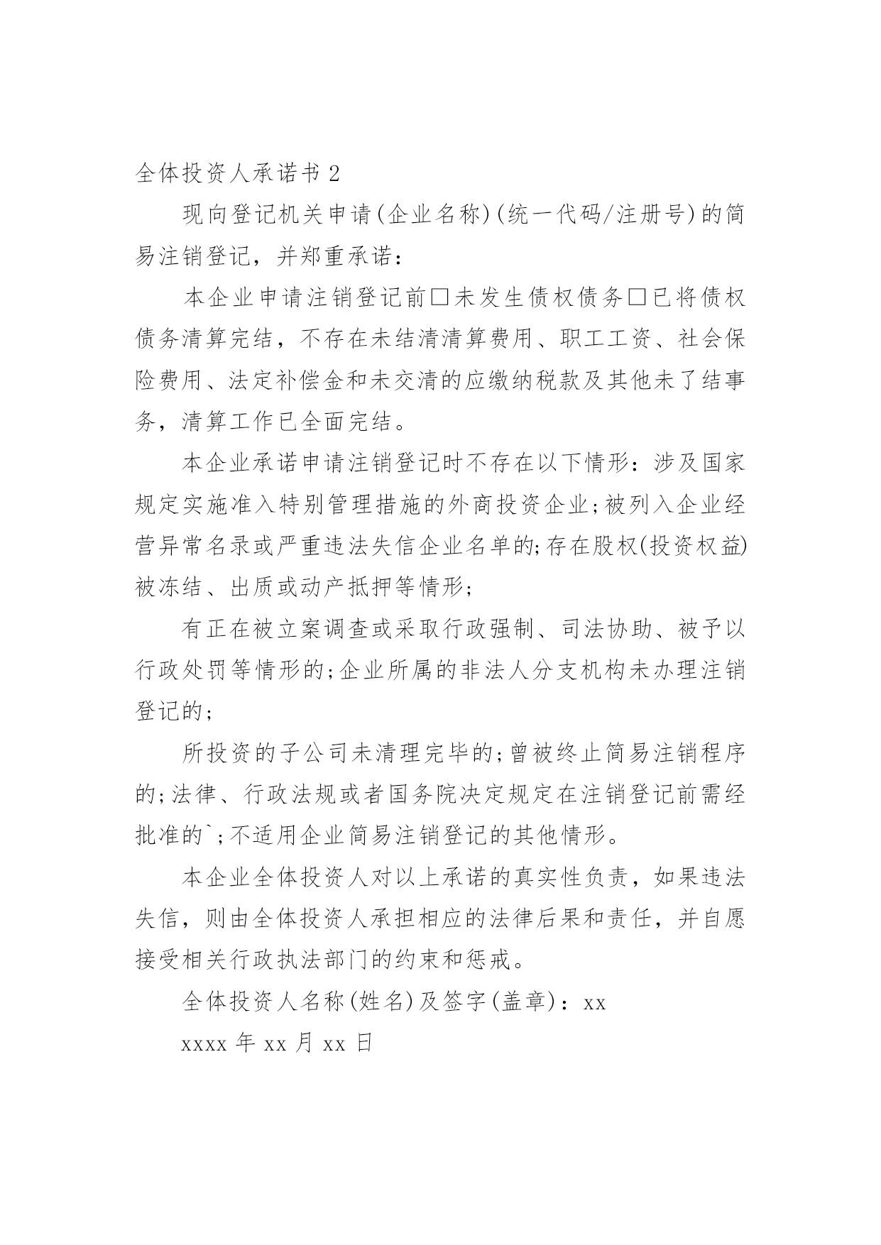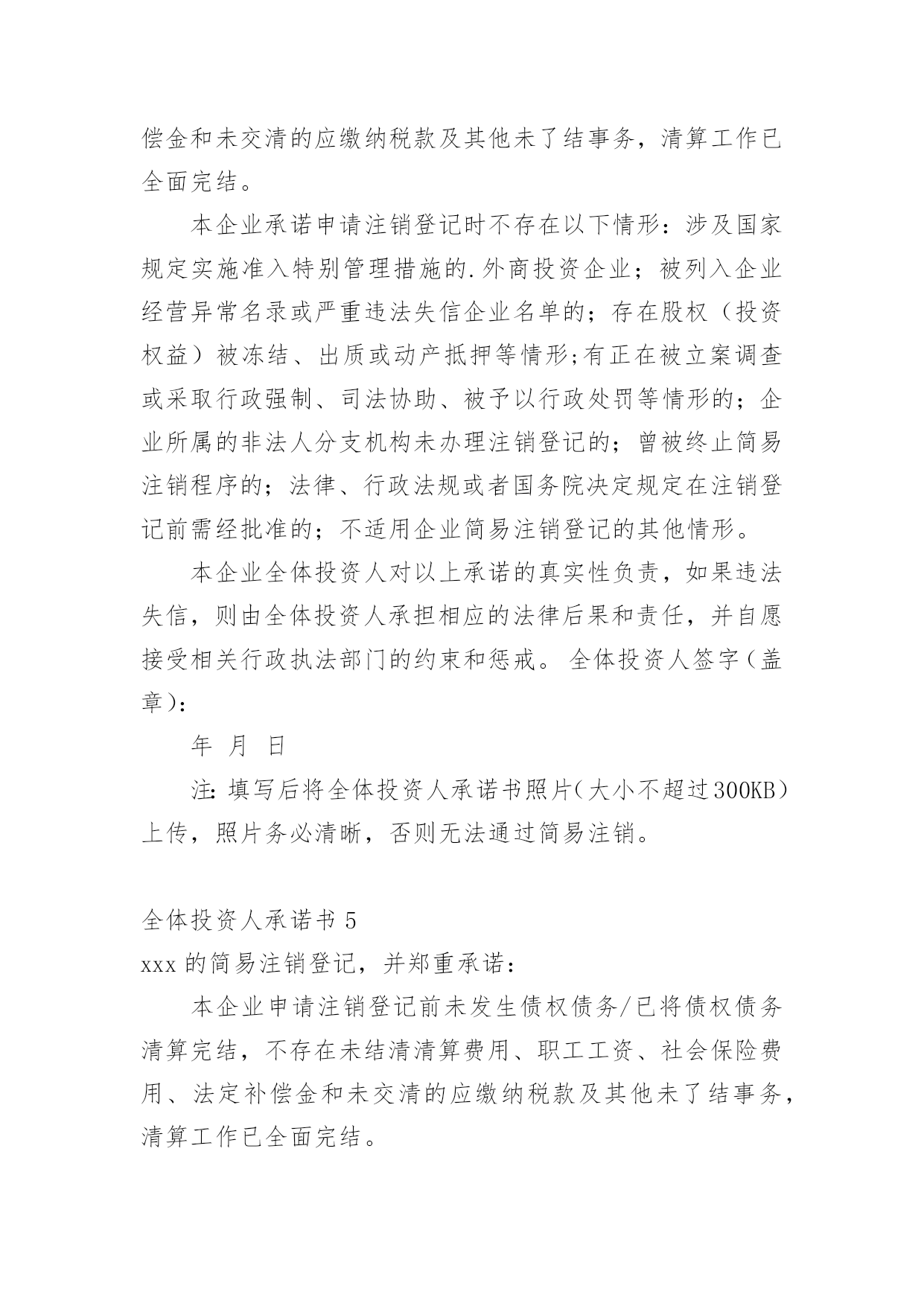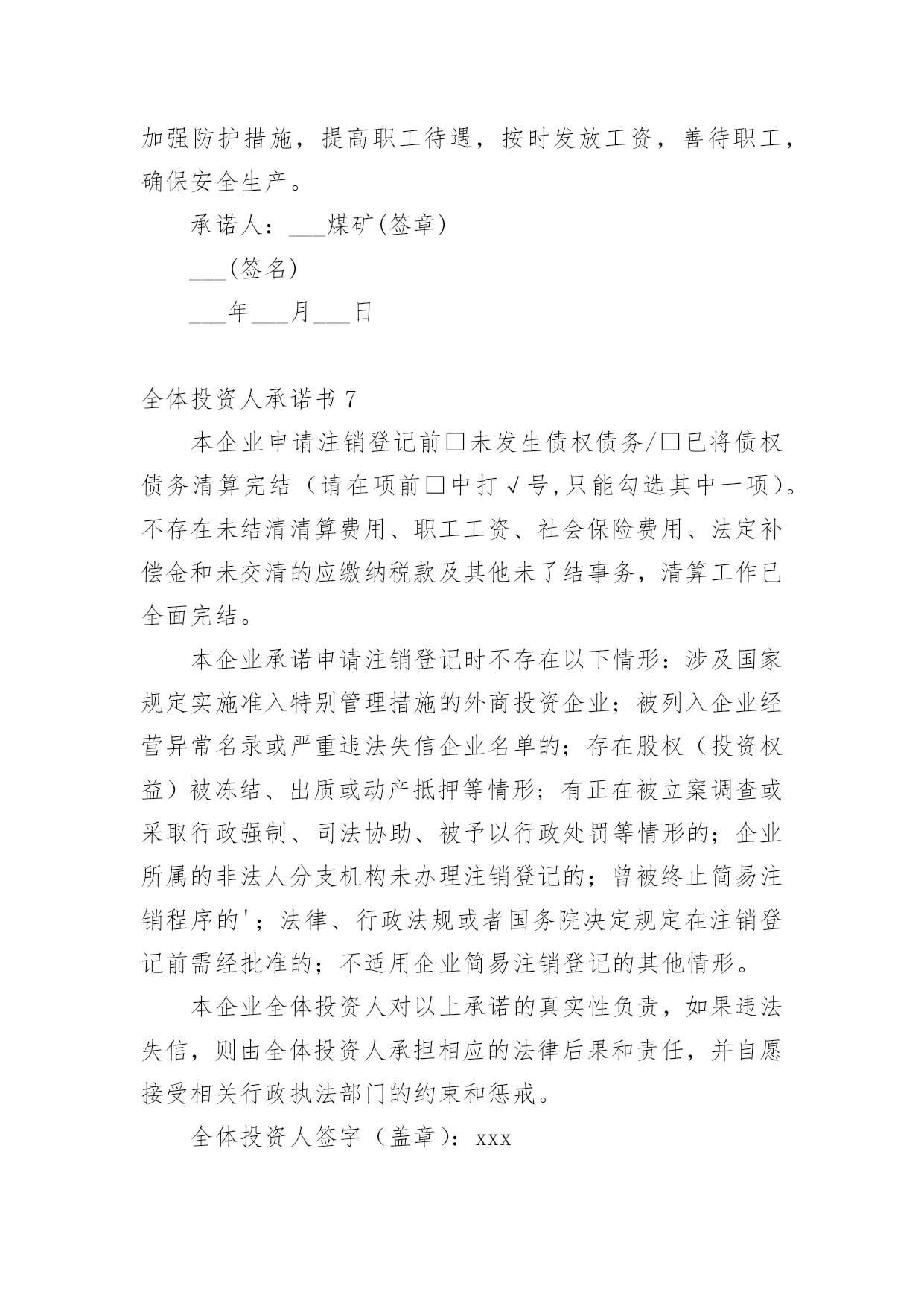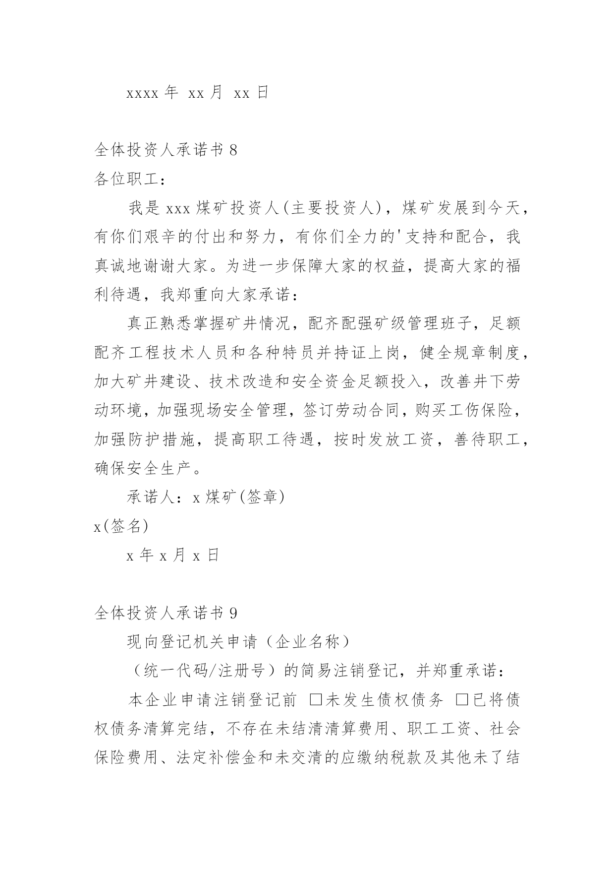 全体投资人承诺书全体投资人承诺书11篇在快速变化和不断变革的新时代,需要使用承诺书的事情愈发增多,不同的承诺书内容同样也是不同的。那要怎么写好承诺书呢?以下是小编为大家收集的全体投资人承诺书,希望对大家有所帮助。全体投资人承诺书1各位职工:你们好!我是xxx煤矿投资人(主要投资人),煤矿发展到今天,有你们艰辛的.付出和努力,有你们全力的支持和配合,我真诚地谢谢大家。为进一步保障大家的权益,提高大家的福利待遇,我郑重向大家承诺:真正熟悉掌握矿井情况,配齐配强矿级管理班子,足额配齐工程技术人员和各种特员并持证上岗,健全规章制度,加大矿井建设、技术改造和安全资金足额投入,改善井下劳动环境,加强现场安全管理,签订劳动合同,购买工伤保险,加强防护措施,提高职工待遇,按时发放工资,善待职工,确保安全生产。xxx20xx年x月x日全体投资人承诺书2现向登记机关申请(企业名称)(统一代码/注册号)的简易注销登记,并郑重承诺:本企业申请注销登记前□未发生债权债务□已将债权债务清算完结,不存在未结清清算费用、职工工资、社会保险费用、法定补偿金和未交清的应缴纳税款及其他未了结事务,清算工作已全面完结。本企业承诺申请注销登记时不存在以下情形:涉及国家规定实施准入特别管理措施的外商投资企业;被列入企业经营异常名录或严重违法失信企业名单的;存在股权(投资权益)被冻结、出质或动产抵押等情形;有正在被立案调查或采取行政强制、司法协助、被予以行政处罚等情形的;企业所属的非法人分支机构未办理注销登记的;所投资的子公司未清理完毕的;曾被终止简易注销程序的;法律、行政法规或者国务院决定规定在注销登记前需经批准的`;不适用企业简易注销登记的其他情形。本企业全体投资人对以上承诺的真实性负责,如果违法失信,则由全体投资人承担相应的法律后果和责任,并自愿接受相关行政执法部门的约束和惩戒。全体投资人名称(姓名)及签字(盖章):xxxxxx年xx月xx日全体投资人承诺书3各位职工:我是xxx煤矿投资人(主要投资人),煤矿发展到今天,有你们艰辛的付出和努力,有你们全力的支持和配合,我真诚地谢谢大家。为进一步保障大家的权益,提高大家的.福利待遇,我郑重向大家承诺:真正熟悉掌握矿井情况,配齐配强矿级管理班子,足额配齐工程技术人员和各种特员并持证上岗,健全规章制度,加大矿井建设、技术改造和安全资金足额投入,改善井下劳动环境,加强现场安全管理,签订劳动合同,购买工伤保险,加强防护措施,提高职工待遇,按时发放工资,善待职工,确保安全生产。承诺人:xxx煤矿(签章)xxx(签名)xxxx年xx月xx日全体投资人承诺书4现向登记机关申请(企业名称)的简易注销登记,并郑重承诺:本企业申请注销登记前□未发生债权债务/□已将债权债务清算完结(请在项前□中打√号,只能勾选其中一项)。不存在未结清清算费用、职工工资、社会保险费用、法定补偿金和未交清的应缴纳税款及其他未了结事务,清算工作已全面完结。本企业承诺申请注销登记时不存在以下情形:涉及国家规定实施准入特别管理措施的.外商投资企业;被列入企业经营异常名录或严重违法失信企业名单的;存在股权(投资权益)被冻结、出质或动产抵押等情形;有正在被立案调查或采取行政强制、司法协助、被予以行政处罚等情形的;企业所属的非法人分支机构未办理注销登记的;曾被终止简易注销程序的;法律、行政法规或者国务院决定规定在注销登记前需经批准的;不适用企业简易注销登记的其他情形。本企业全体投资人对以上承诺的真实性负责,如果违法失信,则由全体投资人承担相应的法律后果和责任,并自愿接受相关行政执法部门的约束和惩戒。全体投资人签字(盖章):年月日注:填写后将全体投资人承诺书照片(大小不超过300KB)上传,照片务必清晰,否则无法通过简易注销。全体投资人承诺书5xxx的简易注销登记,并郑重承诺:本企业申请注销登记前未发生债权债务/已将债权债务清算完结,不存在未结清清算费用、职工工资、社会保险费用、法定补偿金和未交清的应缴纳税款及其他未了结事务,清算工作已全面完结。本企业承诺申请注销登记时不存在以下情形:涉及国家规定实施准入特别管理措施的外商投资企业;被列入企业经营异常名录或严重违法失信企业名单的`;存在股权(投资权益)被冻结、出质或动产抵押等情形;有正在被立案调查或采取行政强制、司法协助、被予以行政处罚等情形的;企业所属的非法人分支机构未办理注销登记的;曾被终止简易注销程序的;法律、行政法规或者国务院决定规定在注销登记前需经批准的;不适用企业简易注销登记的其他情形。本企业全体投资人对以上承诺的真实性负责,如果违法失信,则由全体投资人承担相应的法律后果和责任,并自愿接受相关行政执法部门的约束和惩戒。xxx20xx年xx月xx日全体投资人承诺书6各位职工:我是_________煤矿投资人(主