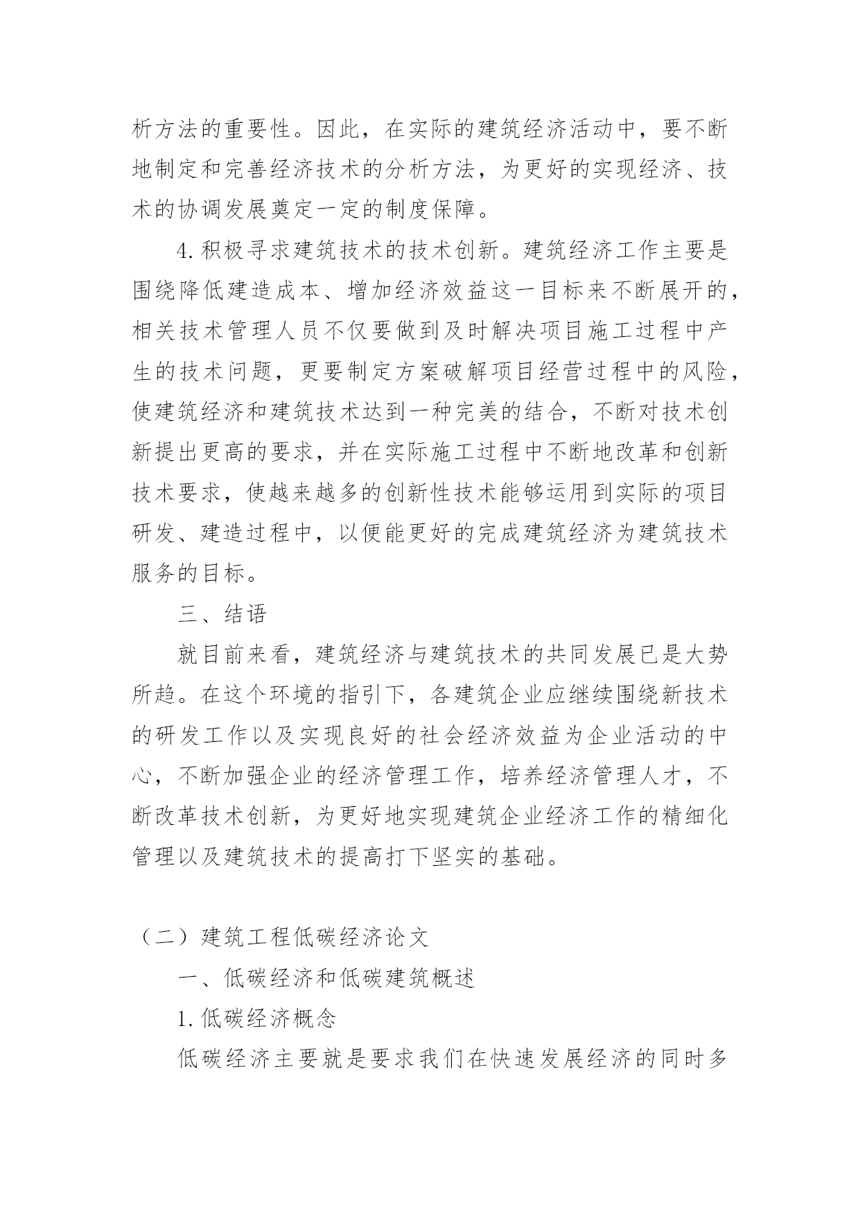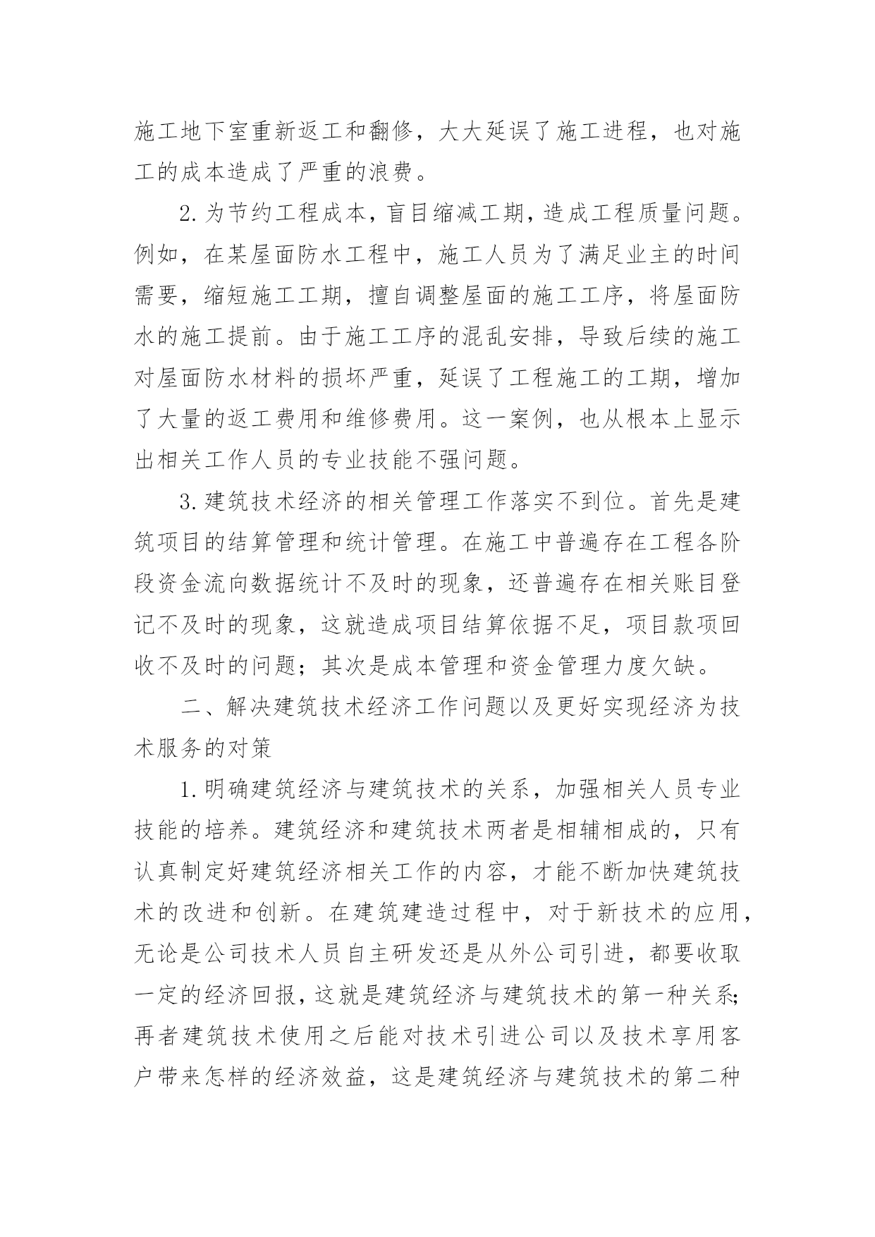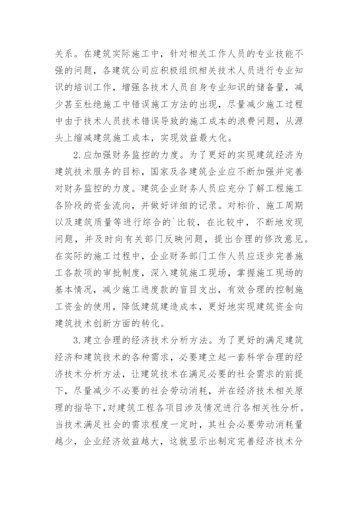 建筑技术与技术经济论文导语:关于建筑技术与技术经济论文,就目前来看,建筑经济与建筑技术的共同发展已是大势所趋。在这个环境的指引下,各建筑企业应继续围绕新技术的研发工作以及实现良好的社会经济效益为企业活动的中心,不断加强企业的经济管理工作,培养经济管理人才,不断改革技术创新,为更好地实现建筑企业经济工作的精细化管理以及建筑技术的提高打下坚实的基础。下面由小编为您整理出的建筑技术与技术经济论文以及相关的内容,一起来看看吧。(一)建筑技术与技术经济论文一、建筑技术经济工作中存在的问题随着国家及建筑企业对建筑技术经济工作的不断重视,建筑技术经济工作越来越成为各建筑企业管理工作的核心。然而,在实际的建筑项目施工过程中,仍然存在一些不容小觑的问题,具体表现在以下几点:1.工程施工人员及管理人员自身专业素质问题导致成本投入加大。例如,在某工程中,工程要求建筑地下室的地板用聚氨酯防水材料进行防水施工,然而聚氨酯防水材料对于环境湿度要求极高,倘若地面不干燥会直接影响聚氨酯防水材料的使用。当时施工时正是雨天,空气很潮湿,地板有水渍,常规来说不宜于施工操作,但由于工程施工人员及管理人员自身专业素质的问题,没有及时发现这个问题,使得施工地下室重新返工和翻修,大大延误了施工进程,也对施工的成本造成了严重的浪费。2.为节约工程成本,盲目缩减工期,造成工程质量问题。例如,在某屋面防水工程中,施工人员为了满足业主的时间需要,缩短施工工期,擅自调整屋面的施工工序,将屋面防水的施工提前。由于施工工序的混乱安排,导致后续的施工对屋面防水材料的损坏严重,延误了工程施工的工期,增加了大量的返工费用和维修费用。这一案例,也从根本上显示出相关工作人员的专业技能不强问题。3.建筑技术经济的相关管理工作落实不到位。首先是建筑项目的结算管理和统计管理。在施工中普遍存在工程各阶段资金流向数据统计不及时的现象,还普遍存在相关账目登记不及时的现象,这就造成项目结算依据不足,项目款项回收不及时的问题;其次是成本管理和资金管理力度欠缺。二、解决建筑技术经济工作问题以及更好实现经济为技术服务的对策1.明确建筑经济与建筑技术的关系,加强相关人员专业技能的培养。建筑经济和建筑技术两者是相辅相成的,只有认真制定好建筑经济相关工作的内容,才能不断加快建筑技术的改进和创新。在建筑建造过程中,对于新技术的应用,无论是公司技术人员自主研发还是从外公司引进,都要收取一定的经济回报,这就是建筑经济与建筑技术的第一种关系;再者建筑技术使用之后能对技术引进公司以及技术享用客户带来怎样的经济效益,这是建筑经济与建筑技术的第二种关系。在建筑实际施工中,针对相关工作人员的专业技能不强的问题,各建筑公司应积极组织相关技术人员进行专业知识的培训工作,增强各技术人员自身专业知识的储备量,减少甚至杜绝施工中错误施工方法的出现,尽量减少施工过程中由于技术人员技术错误导致的施工成本的浪费问题,从源头上缩减建筑施工成本,实现效益最大化。2.应加强财务监控的力度。为了更好的实现建筑经济为建筑技术服务的目标,国家及各建筑企业应不断加强并完善对财务监控的力度。建筑企业财务人员应充分了解工程施工各阶段的资金流向,并做好详细的记录。对标价、施工周期以及建筑质量等进行综合的`比较,在比较中,不断地发现问题,并及时向有关部门反映问题,提出合理的修改意见。在实际的施工过程中,企业财务部门工作人员应逐步完善施工各款项的审批制度,深入建筑施工现场,掌握施工现场的基本情况,减少施工进度款的盲目支出,有效合理的控制施工资金的使用,降低建筑建造成本,更好地实现建筑资金向建筑技术创新方面的转化。3.建立合理的经济技术分析方法。为了更好的满足建筑经济和建筑技术的各种需求,必要建立起一套科学合理的经济技术分析方法,让建筑技术在满足必要的社会需求的前提下,尽量减少不必要的社会劳动消耗,并在经济技术相关原理的指导下,对建筑工程各项目涉及情况进行各相关性分析。当技术满足社会的需求程度一定时,其社会必要劳动消耗量越少,企业经济效益越大,这就显示出制定完善经济技术分析方法的重要性。因此,在实际的建筑经济活动中,要不断地制定和完善经济技术的分析方法,为更好的实现经济、技术的协调发展奠定一定的制度保障。4.积极寻求建筑技术的技术创新。建筑经济工作主要是围绕降低建造成本、增加经济效益这一目标来不断展开的,相关技术管理人员不仅要做到及时解决项目施工过程中产生的技术问题,更要制定方案破解项目经营过程中的风险,使建筑经济和建筑技术达到一种完美的结合,不断对技术创新提出更高的要求,并在实际施工过程中不断地改革和创新技术要求,使越来越多的创新性技术能够运用到实际的项目研发、建造过程中,以便能更好的完成建筑经济为建筑技术服务的目标。三、结语就目前来看,建筑经济与建筑技术的共同发展已是大