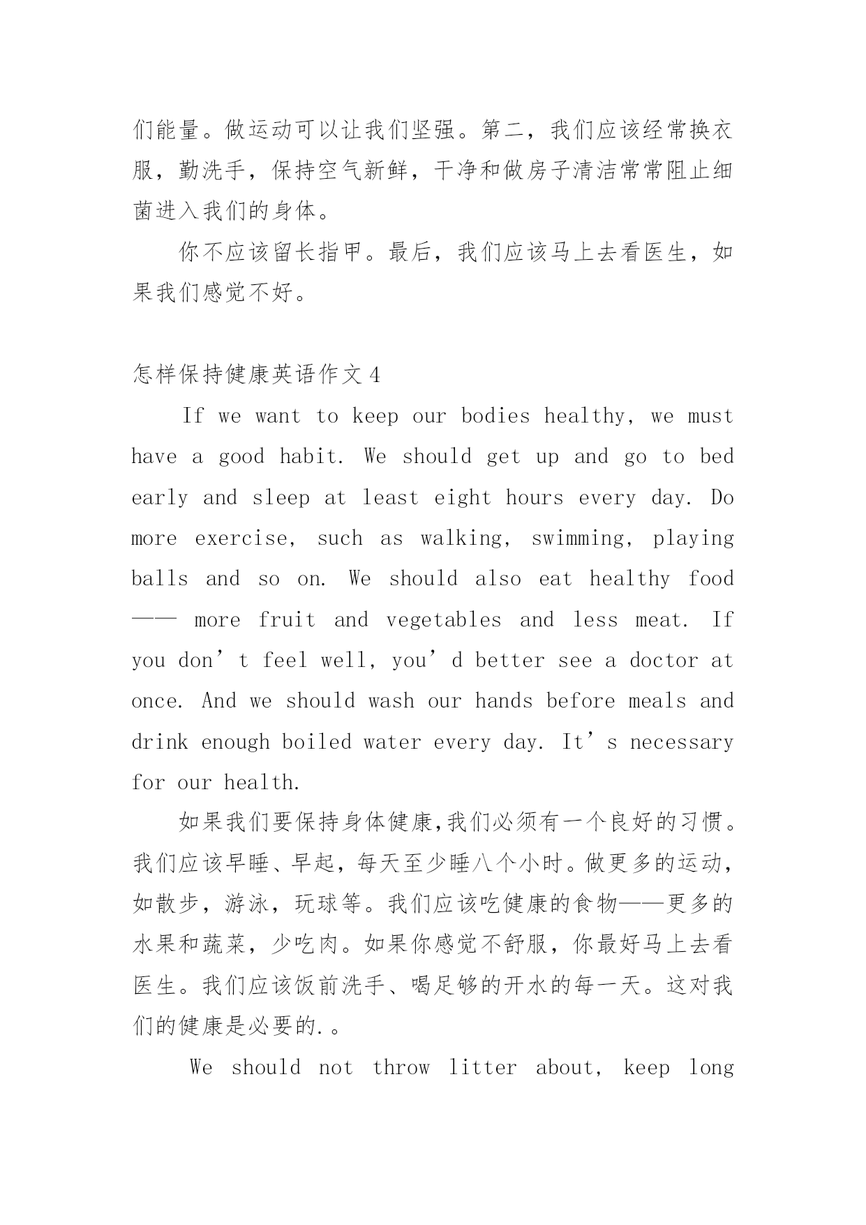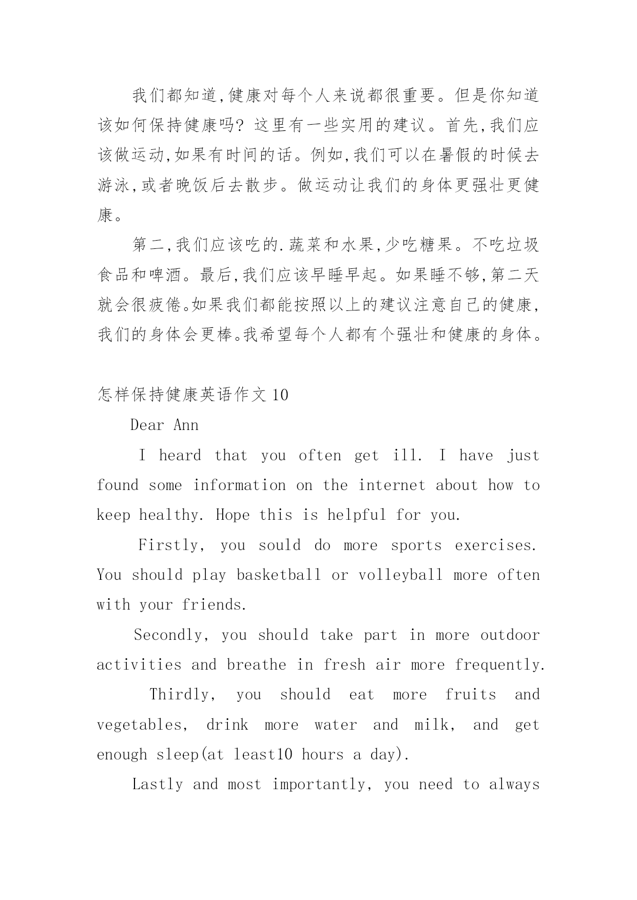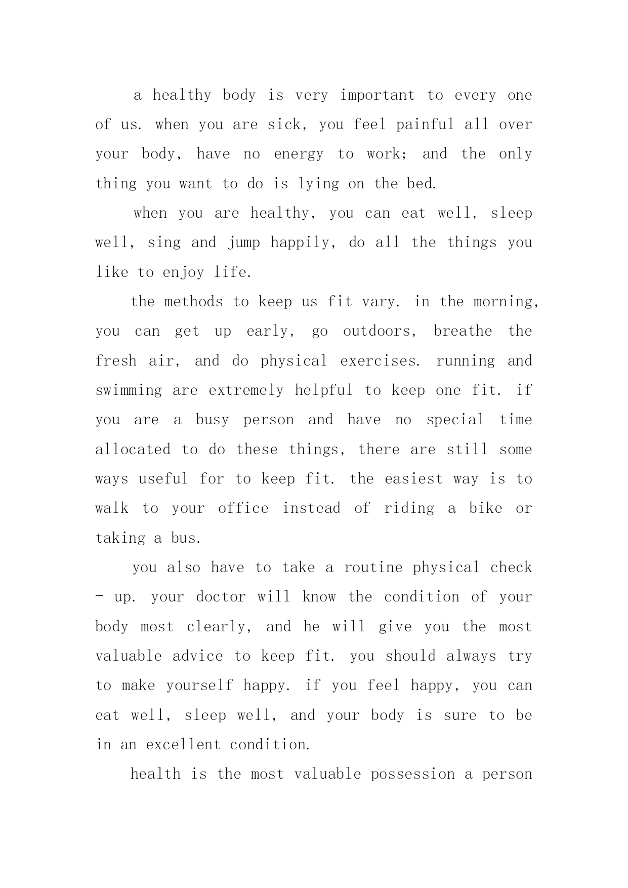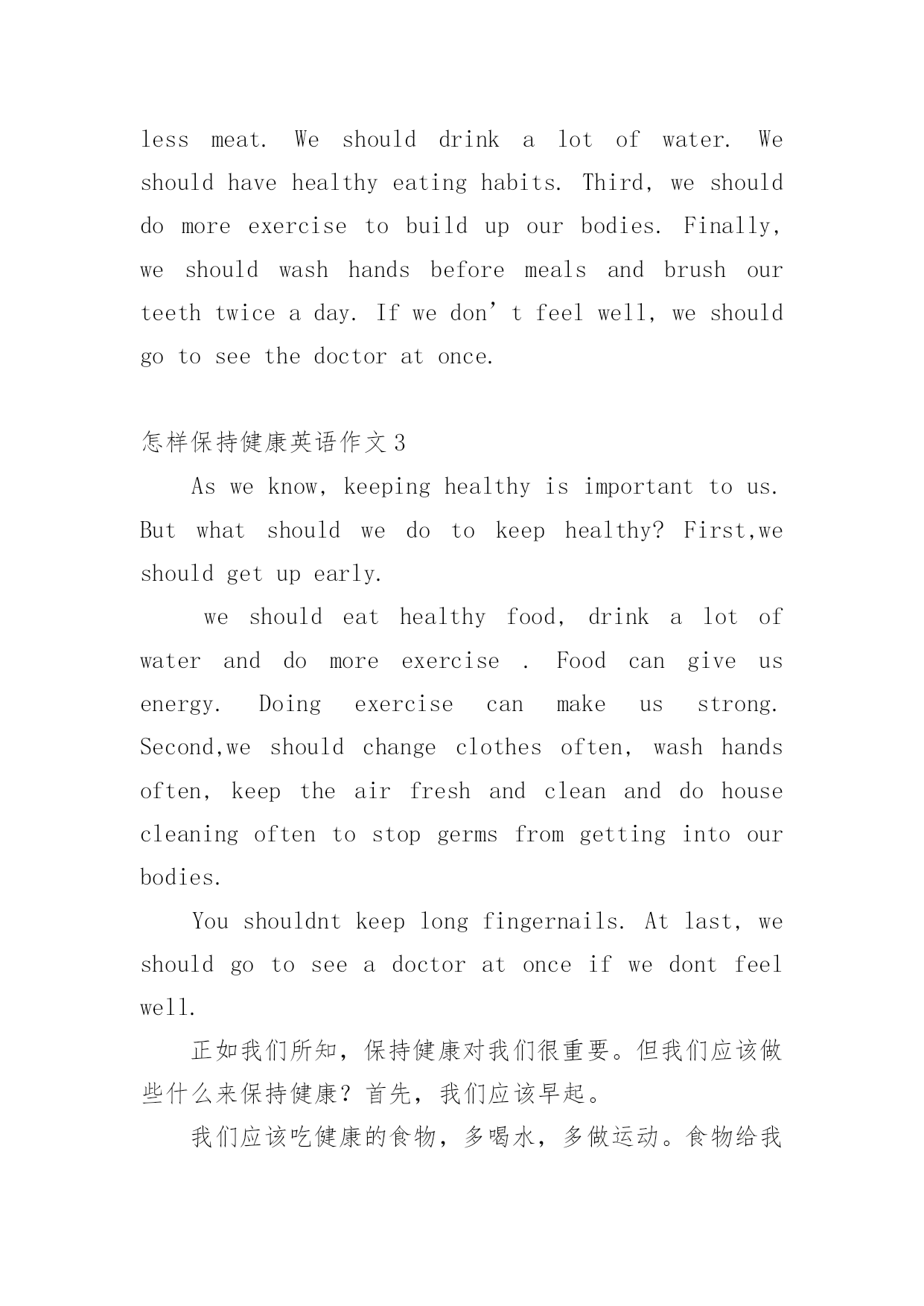 怎样保持健康英语作文在平日的学习、工作和生活里,大家一定都接触过作文吧,作文根据写作时限的不同可以分为限时作文和非限时作文。还是对作文一筹莫展吗?下面是小编精心整理的怎样保持健康英语作文,希望对大家有所帮助。怎样保持健康英语作文1Myfatherisadoctor.In20xx,hetookanactivepartinthebattleagainstSARS.Hesaid,Wedonthavetobeafraidofcatchingtheillness.Ifwehavegoodhabits,wecankeeptheillnessaway.MyfatherandIlikerunninginthemorning.Wekeepthewindowsopensothattheairintheroomiscleanandfresh.Wewashourhandsbeforemeals.Wehavehealthyfoodanddrink.Wedontspithereandthere.Hetoldusnottooverworkbecausetoomuchworkwillmakeustiredandmakeiteasytogetsick.翻译:我的父亲是一位医生。20xx年,他积极投身于抗击非典的战斗。他说,我们不必害怕患上疾病。如果我们有良好的生活习惯,我们就可以远离疾病了。我父亲和我喜欢晨跑。我们打开窗户,使房间里的空气干净,清爽。我们饭前洗手。我们有健康的'食品和饮料。我们不会随地吐痰。他告诉我们不要过度劳累,因为太多的工作会让我们过于劳累这样就会很容易得病。怎样保持健康英语作文2中考英语作文题目怎样保持健康的生活习惯健康的'生活习惯对于成长中的我们是非常重要的。你认为健康的生活习惯应当是怎样的呢?请根据下面的信息提示,写一篇短文,首句已给出。信息提示:健康饮食;早睡早起,不熬夜;参加运动,强身健体。要求:根据信息提示,把握要点,适当发挥,不逐字翻译。字数在80词左右。中考英语作文范文Ithinkhealthyhabitsareveryimportantforus.Allofuswanttobehealthy.First,weshouldgetenoughsleepduringthenight.Wecangotobedearlyandgetupearly.Stayinguplateisbadforourhealth.Second,wemusthavetherightkindsoffood.Weshouldeatmorefruitandvegetablesandlessmeat.Weshoulddrinkalotofwater.Weshouldhavehealthyeatinghabits.Third,weshoulddomoreexercisetobuildupourbodies.Finally,weshouldwashhandsbeforemealsandbrushourteethtwiceaday.Ifwedon’tfeelwell,weshouldgotoseethedoctoratonce.怎样保持健康英语作文3Asweknow,keepinghealthyisimportanttous.Butwhatshouldwedotokeephealthy?First,weshouldgetupearly.weshouldeathealthyfood,drinkalotofwateranddomoreexercise.Foodcangiveusenergy.Doingexercisecanmakeusstrong.Second,weshouldchangeclothesoften,washhandsoften,keeptheairfreshandcleananddohousecleaningoftentostopgermsfromgettingintoourbodies.Youshouldntkeeplongfingernails.Atlast,weshouldgotoseeadoctoratonceifwedontfeelwell.正如我们所知,保持健康对我们很重要。但我们应该做些什么来保持健康?首先,我们应该早起。我们应该吃健康的食物,多喝水,多做运动。食物给我们能量。做运动可以让我们坚强。第二,我们应该经常换衣服,勤洗手,保持空气新鲜,干净和做房子清洁常常阻止细菌进入我们的身体。你不应该留长指甲。最后,我们应该马上去看医生,如果我们感觉不好。怎样保持健康英语作文4Ifwewanttokeepourbodieshealthy,wemusthaveagoodhabit.Weshouldgetupandgotobedearlyandsl