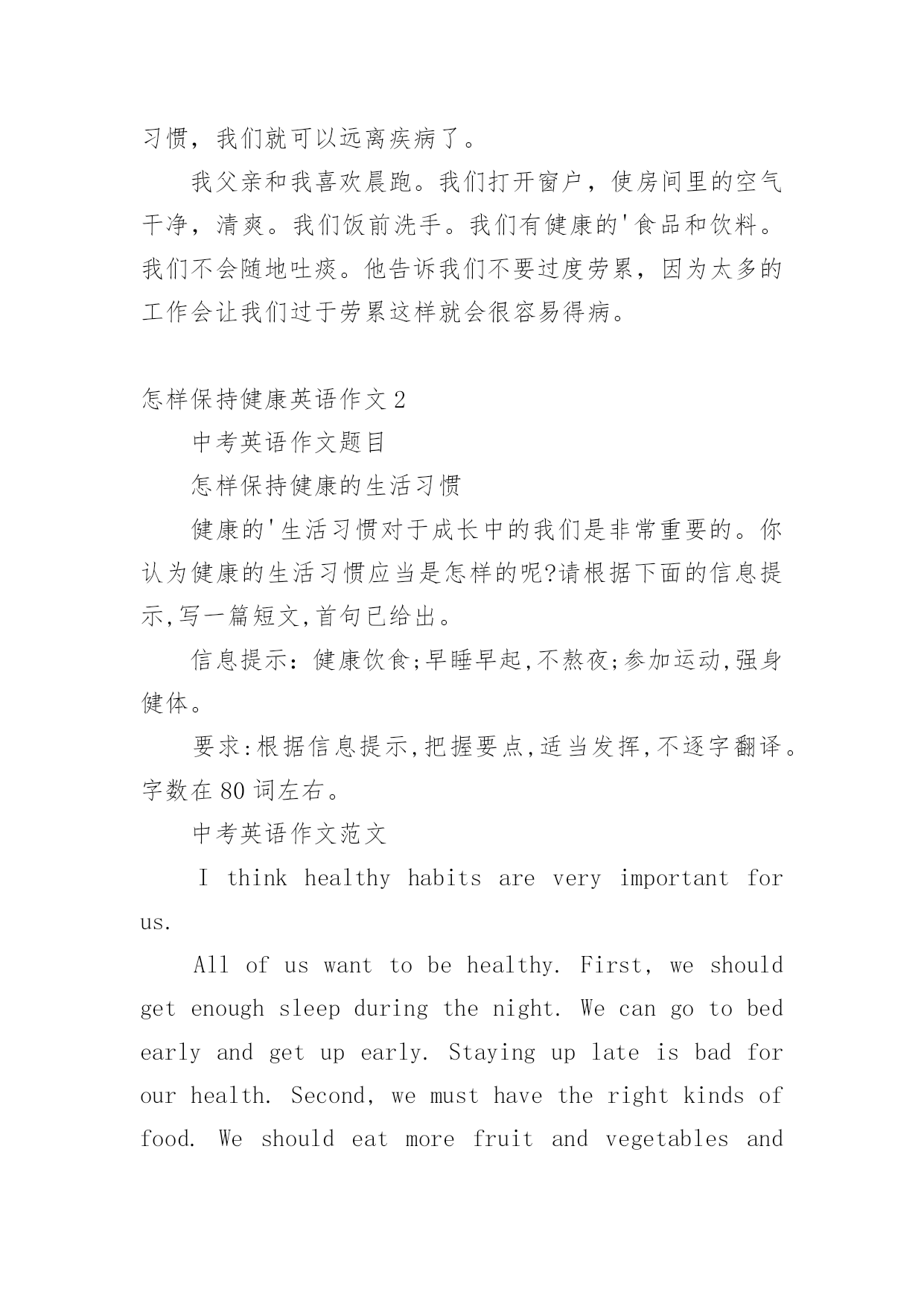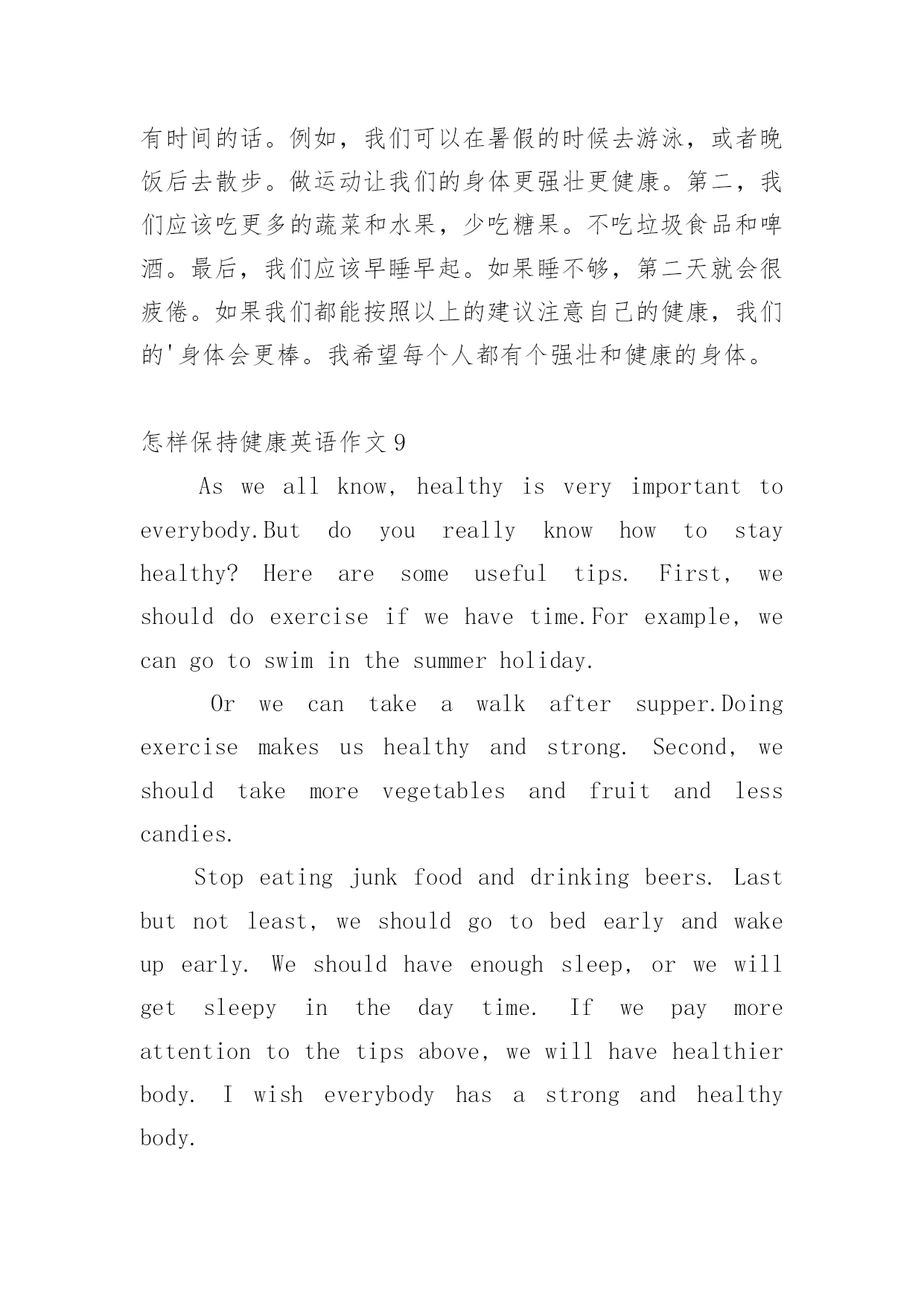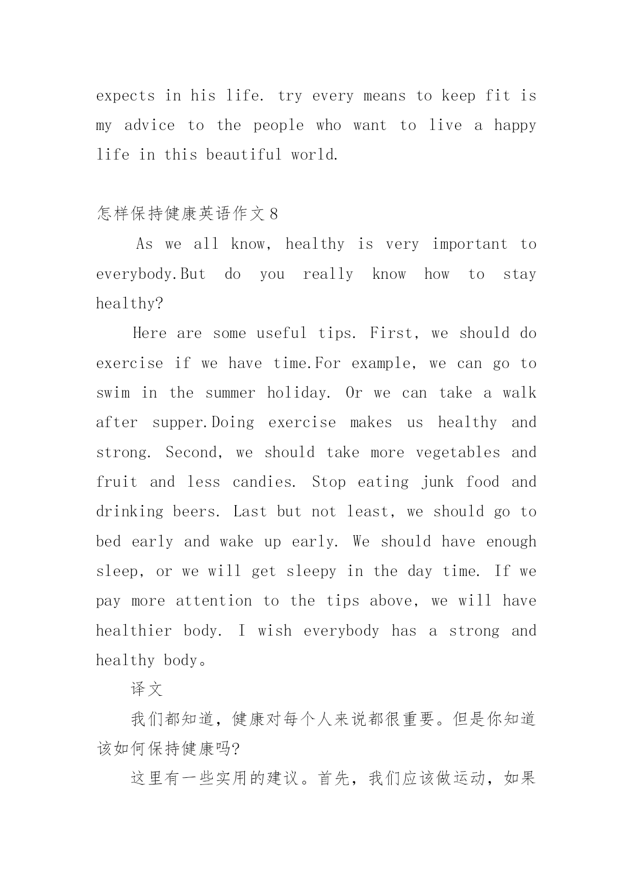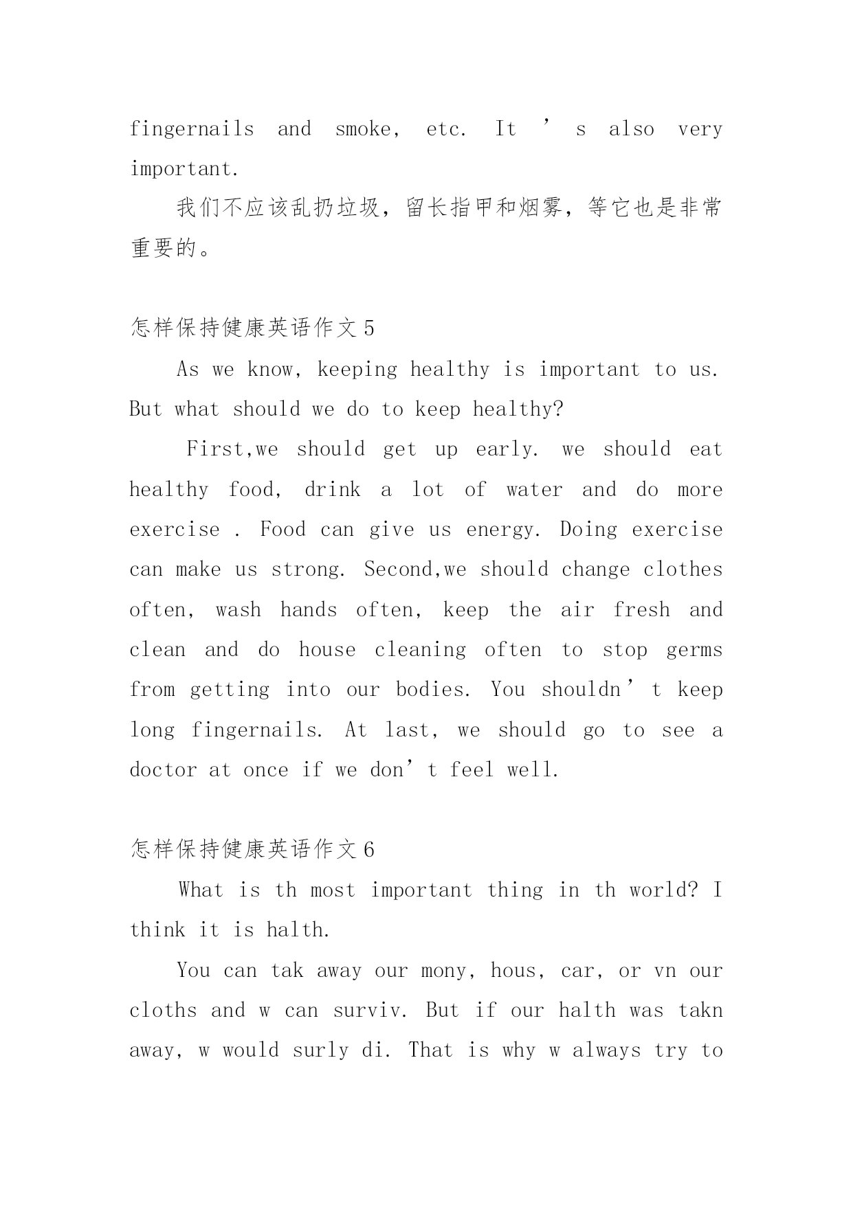 怎样保持健康英语作文在平日的学习、工作和生活里,大家一定都接触过作文吧,作文根据写作时限的不同可以分为限时作文和非限时作文。还是对作文一筹莫展吗?下面是小编精心整理的怎样保持健康英语作文,希望对大家有所帮助。怎样保持健康英语作文1Myfatherisadoctor.In20xx,hetookanactivepartinthebattleagainstSARS.Hesaid,Wedonthavetobeafraidofcatchingtheillness.Ifwehavegoodhabits,wecankeeptheillnessaway.MyfatherandIlikerunninginthemorning.Wekeepthewindowsopensothattheairintheroomiscleanandfresh.Wewashourhandsbeforemeals.Wehavehealthyfoodanddrink.Wedontspithereandthere.Hetoldusnottooverworkbecausetoomuchworkwillmakeustiredandmakeiteasytogetsick.翻译:我的父亲是一位医生。20xx年,他积极投身于抗击非典的战斗。他说,我们不必害怕患上疾病。如果我们有良好的生活习惯,我们就可以远离疾病了。我父亲和我喜欢晨跑。我们打开窗户,使房间里的空气干净,清爽。我们饭前洗手。我们有健康的'食品和饮料。我们不会随地吐痰。他告诉我们不要过度劳累,因为太多的工作会让我们过于劳累这样就会很容易得病。怎样保持健康英语作文2中考英语作文题目怎样保持健康的生活习惯健康的'生活习惯对于成长中的我们是非常重要的。你认为健康的生活习惯应当是怎样的呢?请根据下面的信息提示,写一篇短文,首句已给出。信息提示:健康饮食;早睡早起,不熬夜;参加运动,强身健体。要求:根据信息提示,把握要点,适当发挥,不逐字翻译。字数在80词左右。中考英语作文范文Ithinkhealthyhabitsareveryimportantforus.Allofuswanttobehealthy.First,weshouldgetenoughsleepduringthenight.Wecangotobedearlyandgetupearly.Stayinguplateisbadforourhealth.Second,wemusthavetherightkindsoffood.Weshouldeatmorefruitandvegetablesandlessmeat.Weshoulddrinkalotofwater.Weshouldhavehealthyeatinghabits.Third,weshoulddomoreexercisetobuildupourbodies.Finally,weshouldwashhandsbeforemealsandbrushourteethtwiceaday.Ifwedon’tfeelwell,weshouldgotoseethedoctoratonce.怎样保持健康英语作文3Asweknow,keepinghealthyisimportanttous.Butwhatshouldwedotokeephealthy?First,weshouldgetupearly.weshouldeathealthyfood,drinkalotofwateranddomoreexercise.Foodcangiveusenergy.Doingexercisecanmakeusstrong.Second,weshouldchangeclothesoften,washhandsoften,keeptheairfreshandcleananddohousecleaningoftentostopgermsfromgettingintoourbodies.Youshouldntkeeplongfingernails.Atlast,weshouldgotoseeadoctoratonceifwedontfeelwell.正如我们所知,保持健康对我们很重要。但我们应该做些什么来保持健康?首先,我们应该早起。我们应该吃健康的食物,多喝水,多做运动。食物给我们能量。做运动可以让我们坚强。第二,我们应该经常换衣服,勤洗手,保持空气新鲜,干净和做房子清洁常常阻止细菌进入我们的身体。你不应该留长指甲。最后,我们应该马上去看医生,如果我们感觉不好。怎样保持健康英语作文4Ifwewanttokeepourbodieshealthy,wemusthaveagoodhabit.Weshouldgetupandgotobedearlyandsl