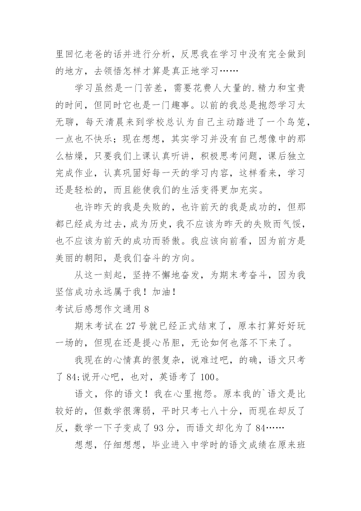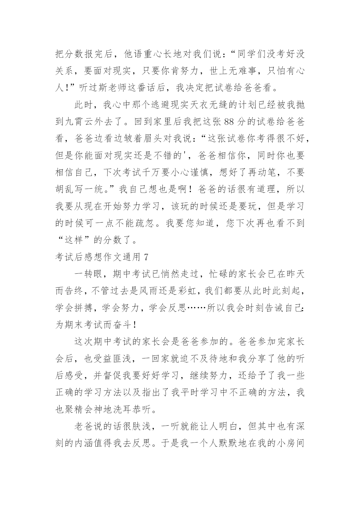 考试后感想作文考试后感想作文通用在学习、工作或生活中,大家或多或少都会接触过作文吧,作文是由文字组成,经过人的思想考虑,通过语言组织来表达一个主题意义的文体。为了让您在写作文时更加简单方便,以下是小编帮大家整理的考试后感想作文通用,欢迎阅读与收藏。考试后感想作文通用1这个学期的第十周,我们进行了期中考试,考完试后,我怀着充满信心又忐忑不安的心态等待着考试成绩的到来。我在心里猜测:应该是理想的分数吧!我得意洋洋的。但,我其中有几道题没做呢!我又担心起来……终于熬到了发试卷的时候了,我屏住呼吸,等待着,开始发试卷了。我的心怦怦地跳着,就像装了十几只兔子。我左顾右盼,还是没有我的试卷。终于传到了我的试卷,我迫不及待地瞧了瞧分数,110分,我一下子蹦了起来,这是数学试卷,我又看了看英语试卷,真是双喜临门啊!竟是107分,我脸上露出了满意的笑容。我又看了语文试卷,我一下子呆住了,脸上的笑容一下子僵硬了,怎么才67.5分啊!对了!政治还没看呢!也许政治会好点。我一看,这一看不要紧,却让我大跌眼镜,真是祸不单行啊!我的心情就像股市一样,刚升上去了,又狠狠地跌下来。这可是其中考啊!不是一般的小考。但毕竟,数学和英语有进步啊!但语文和政治呢?怎么办……我的`大脑在做着激烈的斗争,我不知道该高兴还是该悲伤。回到家后,我卧在床头,翻来覆去,思考语文和政治为什么会这么差。是上课没认真听讲吗?是课堂笔记做的不够吗?是老师布置的作业没认真完成吗?还是……经过一夜的反省和思考,我找到了考不好的原因。语文是课外知识不丰富,而政治则是老师叫背诵的一些重要内容没有认真去背诵。经过这次教训,我决定每天坚持看课外书,丰富自己的课外知识,而政治的一些重要内容多去背诵。经过这次期中考,我认识了自己的不足,但我知道,失败并不可怕,我们吸取了失败的教训后,就能打败失败,获得成功。考试后感想作文通用2泪花,晶莹的泪花,你尽情的流吧!一个分数,一份悲伤油然而生。“72.5”,令我意想不到的数字。成绩,好差,好差……为什么?为什么我的成绩会如此差?是平时的基本工不够扎实么?是做作业马马乎乎,上课开小差么?我想,这几者都有吧!“作业做完了吗?”“今天在学校表现怎么样?”……每次听到妈妈的唠叨,我不禁会变得懒洋洋的,什么心思都没有。只想玩儿、睡、看电视……“懒”,一个字,就能明显衬托出我平时的态度,这次的暴风雨就能亲自体现出了这一点。“单元测验”,只是一次单元测验啊!如此差的成绩,如此简单的试题……“72.5”,我真的没想到。上课马马乎乎,老师讲到这儿,我想到那儿,根本没有跟着老师的思维走,人变笨了,变懒了,眼神变淡了,成绩下降了……不正是我“马虎”的充分见证么?这一切是为什么?是我对自己有所放松。玩儿的时间多了,学习的.时间少了……“上课开小差”,老师在讲台上讲,我在座位上“议”,多不尊敬老师的行为啊!光罚扫一星期地不说,还把知识同话一块说了出去。正如:说出去的话,泼出去的水。知识也一样,要靠自己学习,不能再象话一样泼出去了。到头来,我什么也没有学到。考试时,傻了,这道题怎么做?那道题是怎么会事?我的缺点正如:滔滔江水,连绵不决绝,三天三夜也说不完。这次可是我升到毕业班的第一场考试测验啊!虽然老师夸我作文水平提高了,同时也批评了我的基础水平下降了。总的说来,就是因为我马虎,上课开小差,才酿成了今天的苦果。在以后的日子里,我不光要专心学习,更要把基础知识打牢了,好为以后的摩天大楼打好基础。“72.5”,看到这个数字,我真想哭!考试后感想作文通用3考试后,成绩下来了,想必大家都有感想吧,我也有。考试前,大家都紧张,考试时大家写题,有些同学都认为题会做,做完题不认真检查,在哪玩。等收卷后大家就都轻松了。到发卷时,就都愣住了。考得成绩比理想的成绩要糟的很多。比如我今年上四年级,该上五年级了,这次考试,由于我粗心大意,把大于号写成了小于号,一道题把答案写错了,还有两道选择题因为矛盾,所以也写错了。在一道应用题上,把减号写成了加号,所以扣了四分,还有画图题,因为粗心所以不把七毫米画成了一厘米,被扣了两分,这是数学,才考了79.5分,我心里很难过,因为我的数学成绩一直没有下过95分,我考到了96分妈妈就要生气,何况79.5呢?语文更别提了,我虽然下过90分,但是,错的是该错的题,但是,这次错的是不该错的题。我的作文扣了两分,省略的“略”加了两点,我没加,扣了0·5分。四字词语写错了,两分没了。判断题错了一个扣了一分。一个句子错了,扣了两分,选序号错了一个,一分没有了。唉,真是,看来还是俗话说的好,水滴石穿非一日之功,这分明是说学习好,非一天的功劳。语文才考了91分。我害怕的心快速的跳,非常害怕家人打我,心中浮现出了可怕的.景象,我和姐姐去学英语了,虽然时间要两个小时,但是我还是担心,时间过得