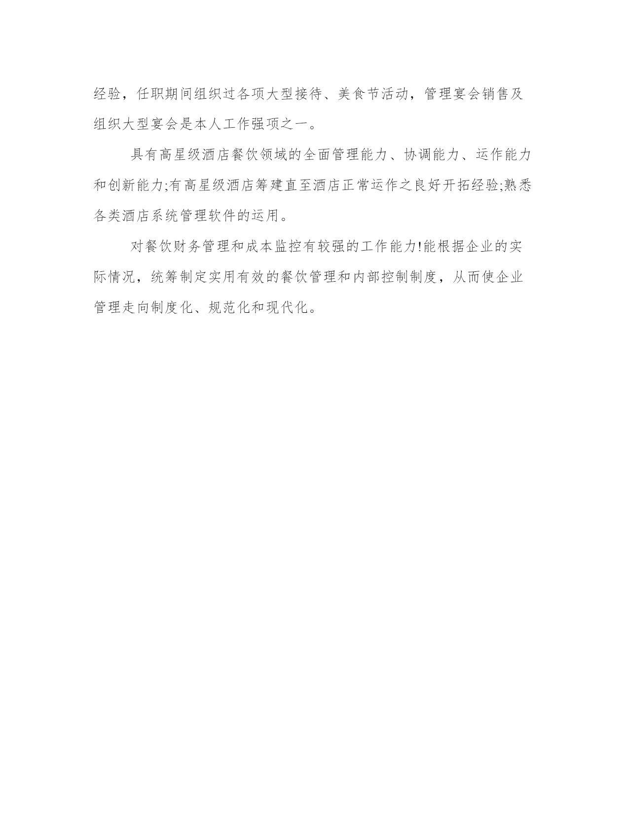 餐饮管理自我介绍餐饮管理自我介绍1早上/下午好,各位考官。我很荣幸在这应聘这个职位,并且很感谢该酒店给我提供一个面试的机会。现在,我首先来介绍我自己:我叫……,来自湖北襄樊。我是一个诚实、富有责任感、待人热情的人。我能够在短期内适应各种不同的环境。第二,我非常喜欢饮食这个行业,并且我把它当成我的终身职业。到目前为止,我在饮食行业有一年的经验。作为一个已过21岁的成年人,我想要体验的更深来丰富我的生活,并且在那个时候,饮食工作能帮我未来的职业规划奠定一个好的基础。做我们喜欢做的事情往往没有用,我们必须热爱上我们要做的事情,就好像饮食这个领域一样。同时,我以应聘这份工作而感到自豪,希望贵店能给我一个展示的平台,我将全力以赴将它做到更好。最后,我希望贵店的事业如日中天,做饮食行业的领头人。谢谢您抽出时间来面试。餐饮管理自我介绍2我叫xxx,毕业于xxx大学酒店管理专业。我是一个工作认真负责、积极主动、善于团队工作的人;思维严谨;拥有丰富的酒店管理工作经验,任职期间组织过各项大型接待、美食节活动,管理宴会销售及组织大型宴会是本人工作强项之一。具有高星级酒店餐饮领域的全面管理能力、协调能力、运作能力和创新能力;有高星级酒店筹建直至酒店正常运作之良好开拓经验;熟悉各类酒店系统管理软件的运用。对餐饮财务管理和成本监控有较强的工作能力!能根据企业的实际情况,统筹制定实用有效的餐饮管理和内部控制制度,从而使企业管理走向制度化、规范化和现代化。