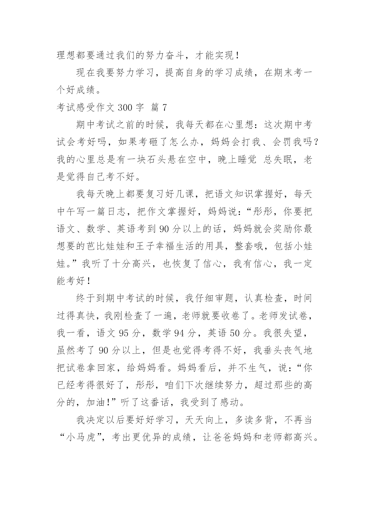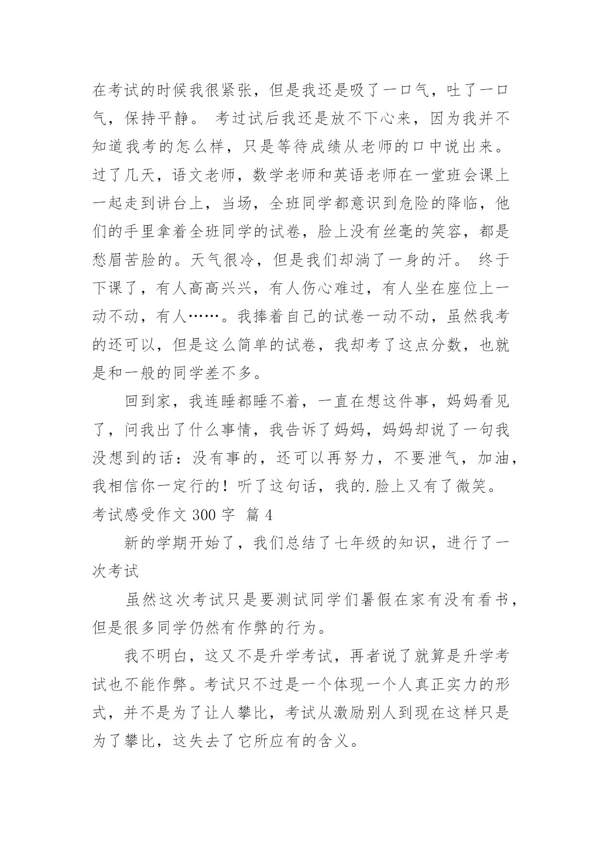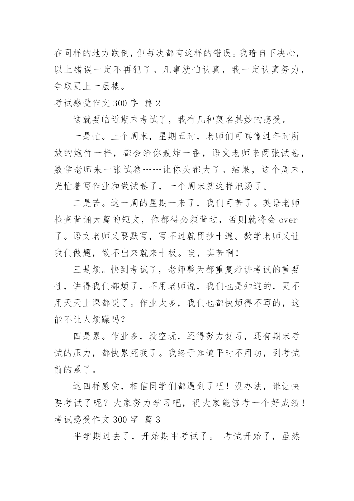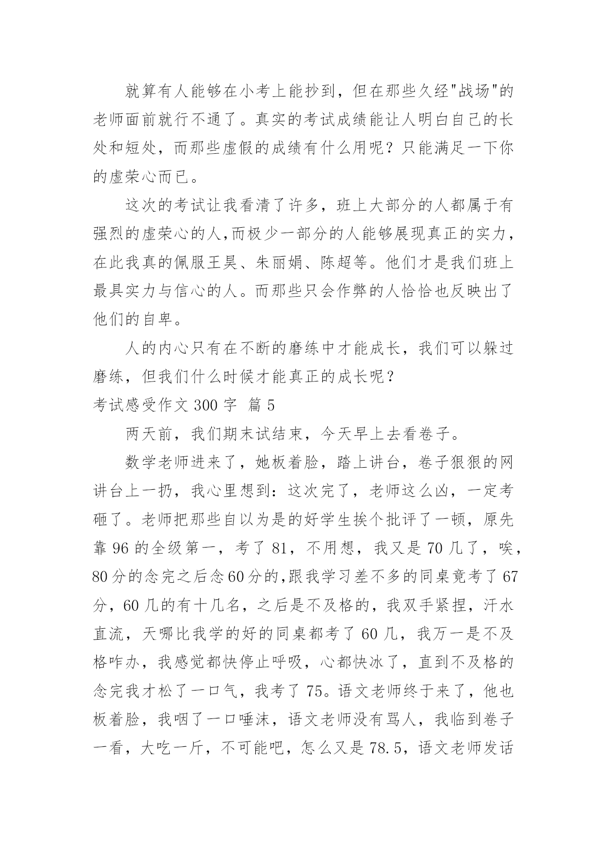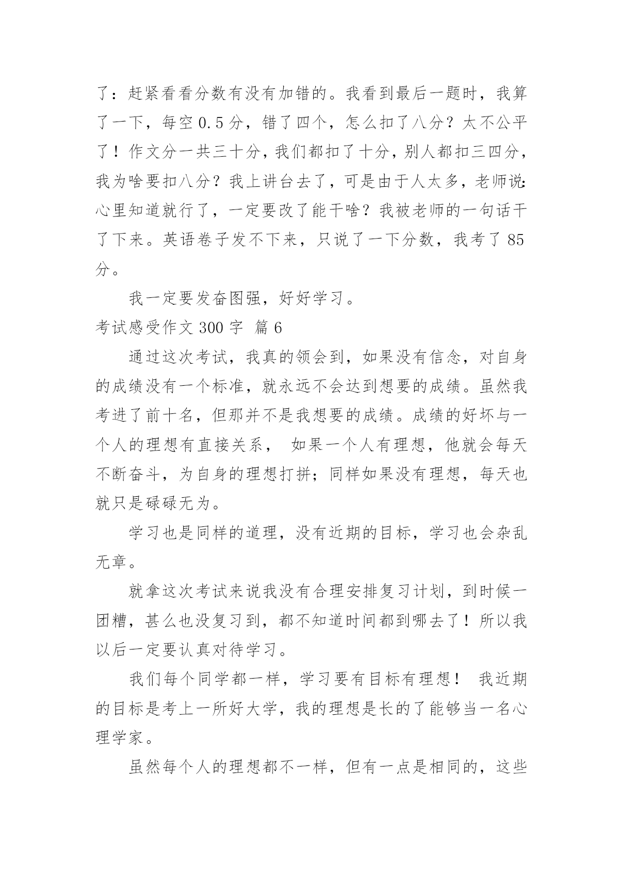 考试感受作文300字【精华】考试感受作文300字合集七篇在日常学习、工作或生活中,大家总少不了接触作文吧,作文是一种言语活动,具有高度的综合性和创造性。你知道作文怎样写才规范吗?下面是小编为大家整理的考试感受作文300字8篇,仅供参考,希望能够帮助到大家。考试感受作文300字篇1考完试,成绩出来了虽然我的目标达到了,但错题都不该错,都是粗心大意了。语文试卷虽然没发下来,但我已知道那题错了。按课文内容填空,那题关于高尔基的,我考试时思前想后,想了许多答案都觉得不对,万般无奈,我想当然地填了一个,就知道没把握,肯定要错了。我每次到这时都深深感觉到书到用时方恨少,平时不苦练,考试就吃苦。还有就是我的阅读和作文没把握,作文没有内容,空洞。绞尽脑汁凑数字。数学考试错的两题都会做,因为犯同样的错误,题目没看清,就下笔太快,因为认为自己肯定会做,简单。结果错了,捶胸顿足,为时已晚。英语呢,听力错了一题。广播上报的兔子耳朵长,我却觉得兔子耳朵短,写了错。简直无可救药,低级错误。想当然,下次一定要听清,做对。每次考试都总结,告诫自己,下次一定不能重蹈覆辙,在同样的地方跌倒,但每次都有这样的错误。我暗自下决心,以上错误一定不再犯了。凡事就怕认真,我一定认真努力,争取更上一层楼。考试感受作文300字篇2这就要临近期末考试了,我有几种莫名其妙的感受。一是忙。上个周末,星期五时,老师们可真像过年时所放的炮竹一样,都会给你轰炸一番,语文老师来两张试卷,数学老师来一张试卷……让你头都大了。结果,这个周末,光忙着写作业和做试卷了,一个周末就这样泡汤了。二是苦。这一周的星期一来了,我们可苦了。英语老师检查背诵大篇的短文,你都得必须背过,否则就将会over了。语文老师又要默写,写不过就罚抄十遍。数学老师又让我们做题,做不出来就来十板。唉,真苦啊!三是烦。快到考试了,老师整天都重复着讲考试的重要性,讲得我们都烦了,不用老师说,我们也是知道的,更不用天天上课都说了。作业太多,我们也都快烦得不写的,这能不让人烦躁吗?四是累。作业多,没空玩,还得努力复习,还有期末考试的压力,都快累死我了。我终于知道平时不用功,到考试前的累了。这四样感受,相信同学们都遇到了吧!没办法,谁让快要考试了呢?大家努力学习吧,祝大家能够考一个好成绩!考试感受作文300字篇3半学期过去了,开始期中考试了。考试开始了,虽然在考试的时候我很紧张,但是我还是吸了一口气,吐了一口气,保持平静。考过试后我还是放不下心来,因为我并不知道我考的怎么样,只是等待成绩从老师的口中说出来。过了几天,语文老师,数学老师和英语老师在一堂班会课上一起走到讲台上,当场,全班同学都意识到危险的降临,他们的手里拿着全班同学的试卷,脸上没有丝毫的笑容,都是愁眉苦脸的。天气很冷,但是我们却淌了一身的汗。终于下课了,有人高高兴兴,有人伤心难过,有人坐在座位上一动不动,有人……。我捧着自己的试卷一动不动,虽然我考的还可以,但是这么简单的试卷,我却考了这点分数,也就是和一般的同学差不多。回到家,我连睡都睡不着,一直在想这件事,妈妈看见了,问我出了什么事情,我告诉了妈妈,妈妈却说了一句我没想到的话:没有事的,还可以再努力,不要泄气,加油,我相信你一定行的!听了这句话,我的.脸上又有了微笑。考试感受作文300字篇4新的学期开始了,我们总结了七年级的知识,进行了一次考试虽然这次考试只是要测试同学们暑假在家有没有看书,但是很多同学仍然有作弊的行为。我不明白,这又不是升学考试,再者说了就算是升学考试也不能作弊。考试只不过是一个体现一个人真正实力的形式,并不是为了让人攀比,考试从激励别人到现在这样只是为了攀比,这失去了它所应有的含义。就算有人能够在小考上能抄到,但在那些久经"战场"的老师面前就行不通了。真实的考试成绩能让人明白自己的长处和短处,而那些虚假的成绩有什么用呢?只能满足一下你的虚荣心而已。这次的考试让我看清了许多,班上大部分的人都属于有强烈的虚荣心的人,而极少一部分的人能够展现真正的实力,在此我真的佩服王昊、朱丽娟、陈超等。他们才是我们班上最具实力与信心的人。而那些只会作弊的人恰恰也反映出了他们的自卑。人的内心只有在不断的磨练中才能成长,我们可以躲过磨练,但我们什么时候才能真正的成长呢?考试感受作文300字篇5两天前,我们期末试结束,今天早上去看卷子。数学老师进来了,她板着脸,踏上讲台,卷子狠狠的网讲台上一扔,我心里想到:这次完了,老师这么凶,一定考砸了。老师把那些自以为是的好学生挨个批评了一顿,原先靠96的全级第一,考了81,不用想,我又是70几了,唉,80分的念完之后念60分的,跟我学习差不多的同桌竟考了67分,60几的有十几名,之后是不及格的,我双手紧捏,汗水直流,天哪比我学的好的同桌都考了60几,我万一是不及格咋办,我感觉都快停