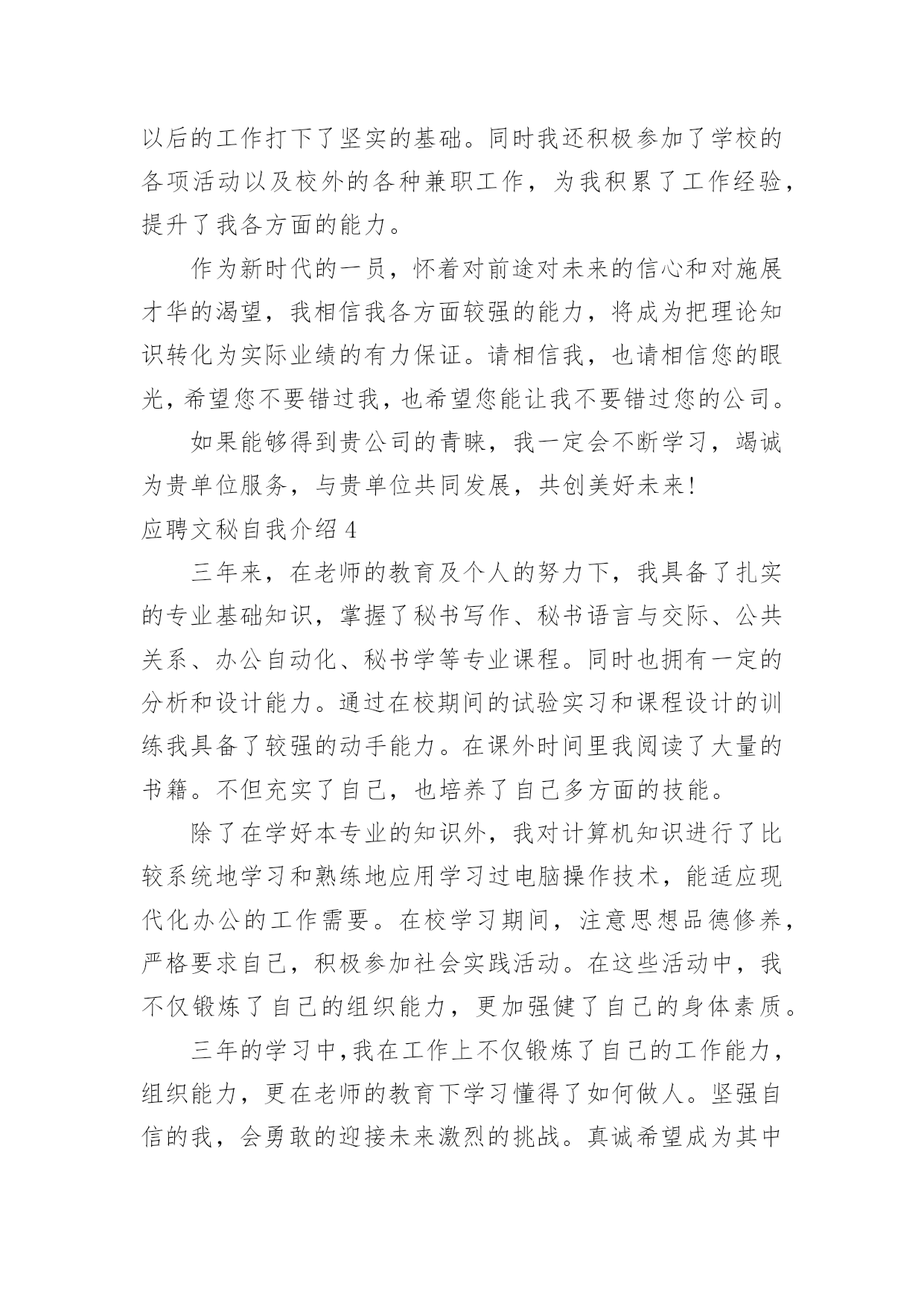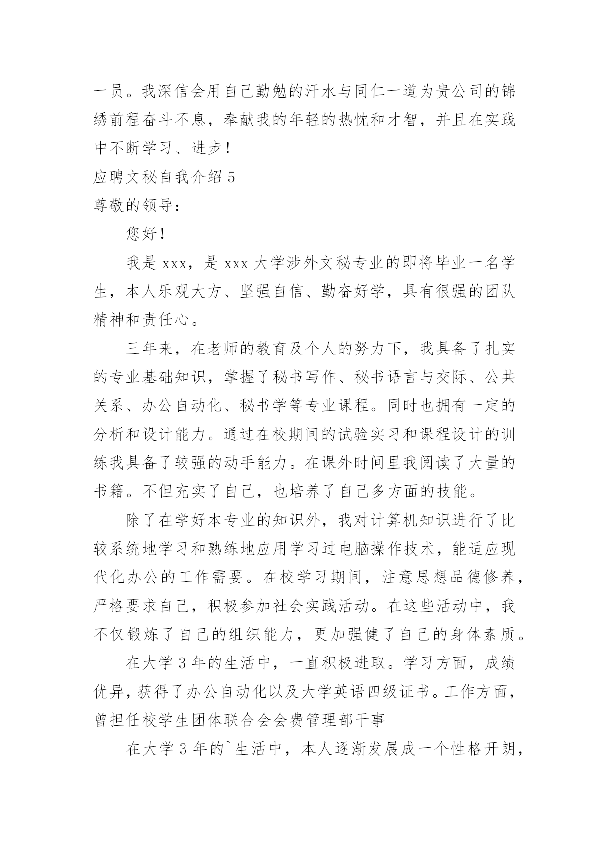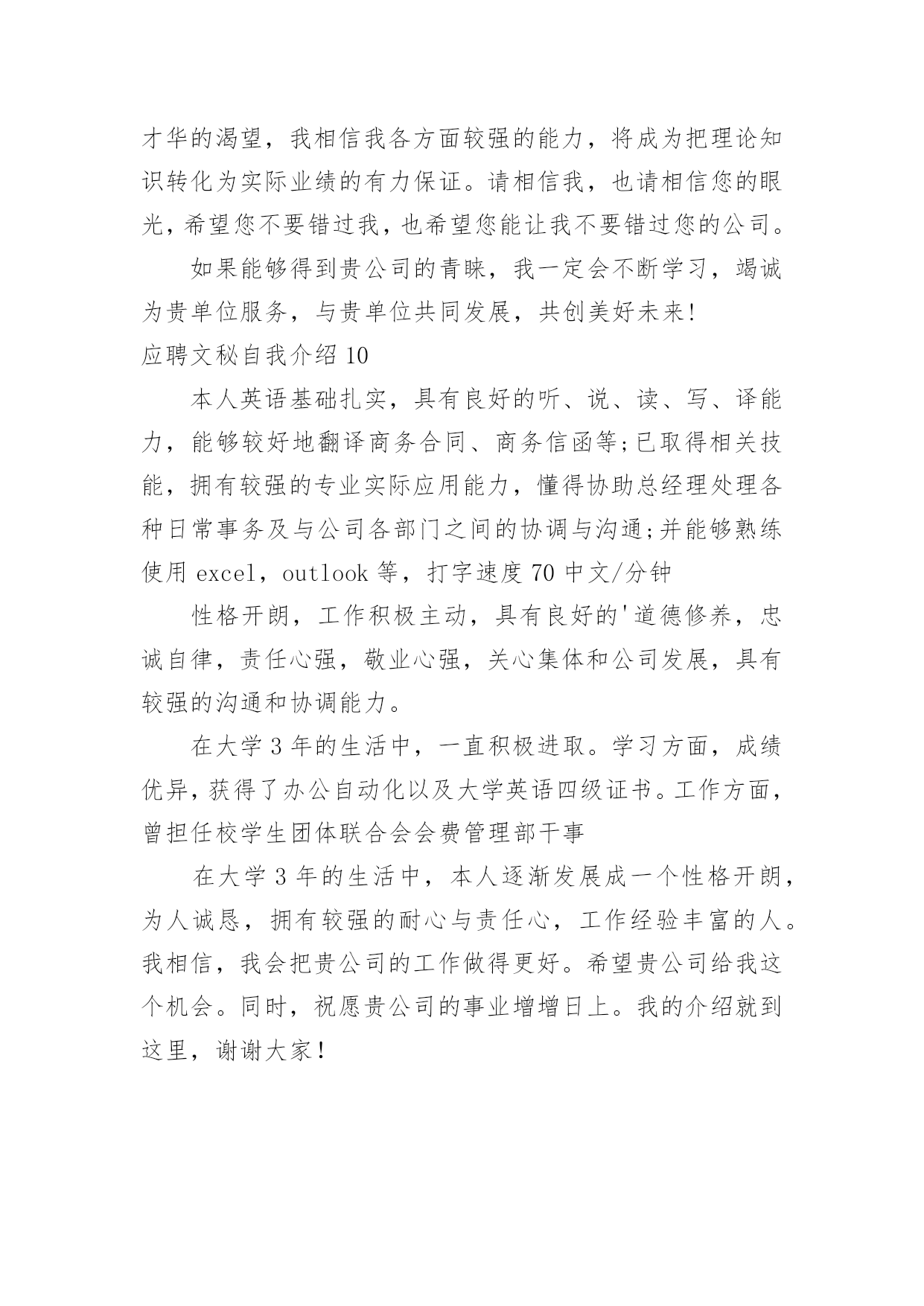 应聘文秘自我介绍应聘文秘自我介绍当到达一个陌生的环境后,我们就有可能用到自我介绍,通过自我介绍可以让他人了解我们。怎么写自我介绍才能避免踩雷呢?以下是小编为大家收集的应聘文秘自我介绍,欢迎大家分享。应聘文秘自我介绍1尊敬的领导:本人英语基础扎实,具有良好的听、说、读、写、译能力,能够较好地翻译商务合同、商务信函等;已取得相关技能,拥有较强的专业实际应用能力,懂得协助总经理处理各种日常事务及与公司各部门之间的协调与沟通工作;并能够熟练使用excel,outlook等,打字速度70中文/分钟`。性格开朗,工作积极主动,具有良好的道德修养,忠诚自律,责任心强,敬业心强,关心集体和公司发展,具有较强的沟通和协调能力。自荐人:XXXXX年XX月XX日应聘文秘自我介绍2尊敬的各位老师、同学们:你们好!感谢老师及同学们给我这次机会,继续和大家共同学习、研究文秘部的工作。我是xx系xx班,我们都知道,校学生会文秘处协助主席团统筹和协调学生会整体工作,最大程度发挥桥梁和纽带的作用;负责处理学生会日常工作,并及时了解和掌握各部门的工作进度及工作效果;制定学生会考核章程,负责对学生会全体人员执行考核、培训、监督;负责起草、制定并执行、监督学生会各项规章制度;负责全校性学生干部培训基地工作开展;负责拟定学生会工作计划、工作总结等有关材料;负责安排有关会议会务事宜,包括签到﹑记录等工作;做好学生会干部的人事管理工作,完善制订并妥当管理学生会成员人事档案;深入了解干部的思想和工作开展情况,及时给予指导和调整;对学生会内部财务进行公开化管理;组织并协调相关活动,负责校学生会等沟通性工作的开展。因此,在清楚的明白了文秘部的职责后,我会做到:坚决完成任务,认真履行职责!充分的发挥文秘部文秘的职责,做好学生会干部的人事工作,妥善的管理学生会成员的档案资料,做到有据可查!我会紧密的团结在校领导周围,为学校学生会的全面建设付出自己应有的职责!希望大家支持我!应聘文秘自我介绍3尊敬的领导:你好!很在此请容许我介绍一下自己的专业及求职意向。我毕业于广东职业技术学院,就读高级文秘专业。在大学的三年学习生活中,我努力学习,成绩优良,为以后的工作打下了坚实的基础。同时我还积极参加了学校的各项活动以及校外的各种兼职工作,为我积累了工作经验,提升了我各方面的能力。作为新时代的一员,怀着对前途对未来的信心和对施展才华的渴望,我相信我各方面较强的能力,将成为把理论知识转化为实际业绩的有力保证。请相信我,也请相信您的眼光,希望您不要错过我,也希望您能让我不要错过您的公司。如果能够得到贵公司的青睐,我一定会不断学习,竭诚为贵单位服务,与贵单位共同发展,共创美好未来!应聘文秘自我介绍4三年来,在老师的教育及个人的努力下,我具备了扎实的专业基础知识,掌握了秘书写作、秘书语言与交际、公共关系、办公自动化、秘书学等专业课程。同时也拥有一定的分析和设计能力。通过在校期间的试验实习和课程设计的训练我具备了较强的动手能力。在课外时间里我阅读了大量的书籍。不但充实了自己,也培养了自己多方面的技能。除了在学好本专业的知识外,我对计算机知识进行了比较系统地学习和熟练地应用学习过电脑操作技术,能适应现代化办公的工作需要。在校学习期间,注意思想品德修养,严格要求自己,积极参加社会实践活动。在这些活动中,我不仅锻炼了自己的组织能力,更加强健了自己的身体素质。三年的学习中,我在工作上不仅锻炼了自己的工作能力,组织能力,更在老师的教育下学习懂得了如何做人。坚强自信的我,会勇敢的迎接未来激烈的挑战。真诚希望成为其中一员。我深信会用自己勤勉的汗水与同仁一道为贵公司的锦绣前程奋斗不息,奉献我的年轻的热忱和才智,并且在实践中不断学习、进步!应聘文秘自我介绍5尊敬的领导:您好!我是xxx,是xxx大学涉外文秘专业的即将毕业一名学生,本人乐观大方、坚强自信、勤奋好学,具有很强的团队精神和责任心。三年来,在老师的教育及个人的努力下,我具备了扎实的专业基础知识,掌握了秘书写作、秘书语言与交际、公共关系、办公自动化、秘书学等专业课程。同时也拥有一定的分析和设计能力。通过在校期间的试验实习和课程设计的训练我具备了较强的动手能力。在课外时间里我阅读了大量的书籍。不但充实了自己,也培养了自己多方面的技能。除了在学好本专业的知识外,我对计算机知识进行了比较系统地学习和熟练地应用学习过电脑操作技术,能适应现代化办公的工作需要。在校学习期间,注意思想品德修养,严格要求自己,积极参加社会实践活动。在这些活动中,我不仅锻炼了自己的组织能力,更加强健了自己的身体素质。在大学3年的生活中,一直积极进取。学习方面,成绩优异,获得了办公自动化以及大学英语四级证书。工作方面,曾担任校学生团体联合会会费管理部干事在大学3年的`生活中,本人逐渐发展成一个性格开