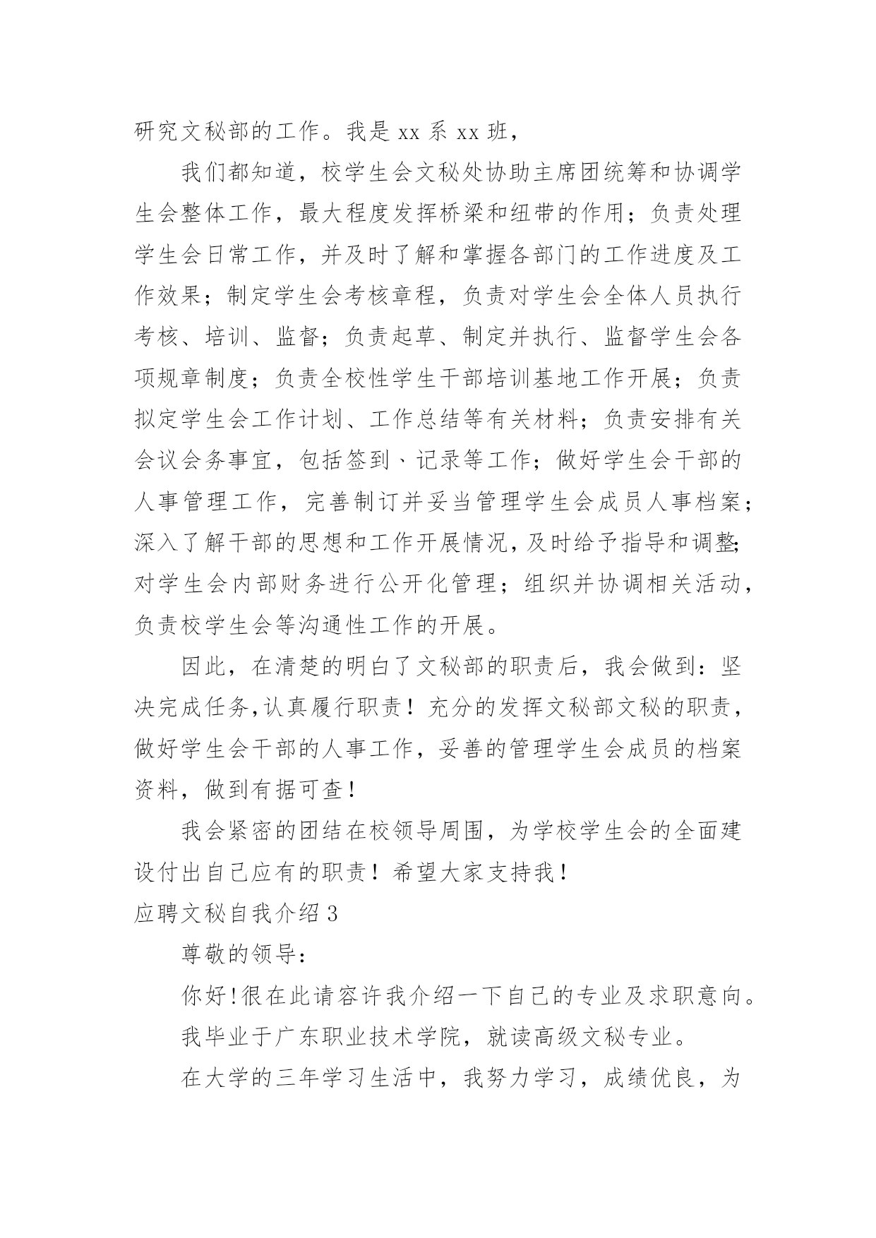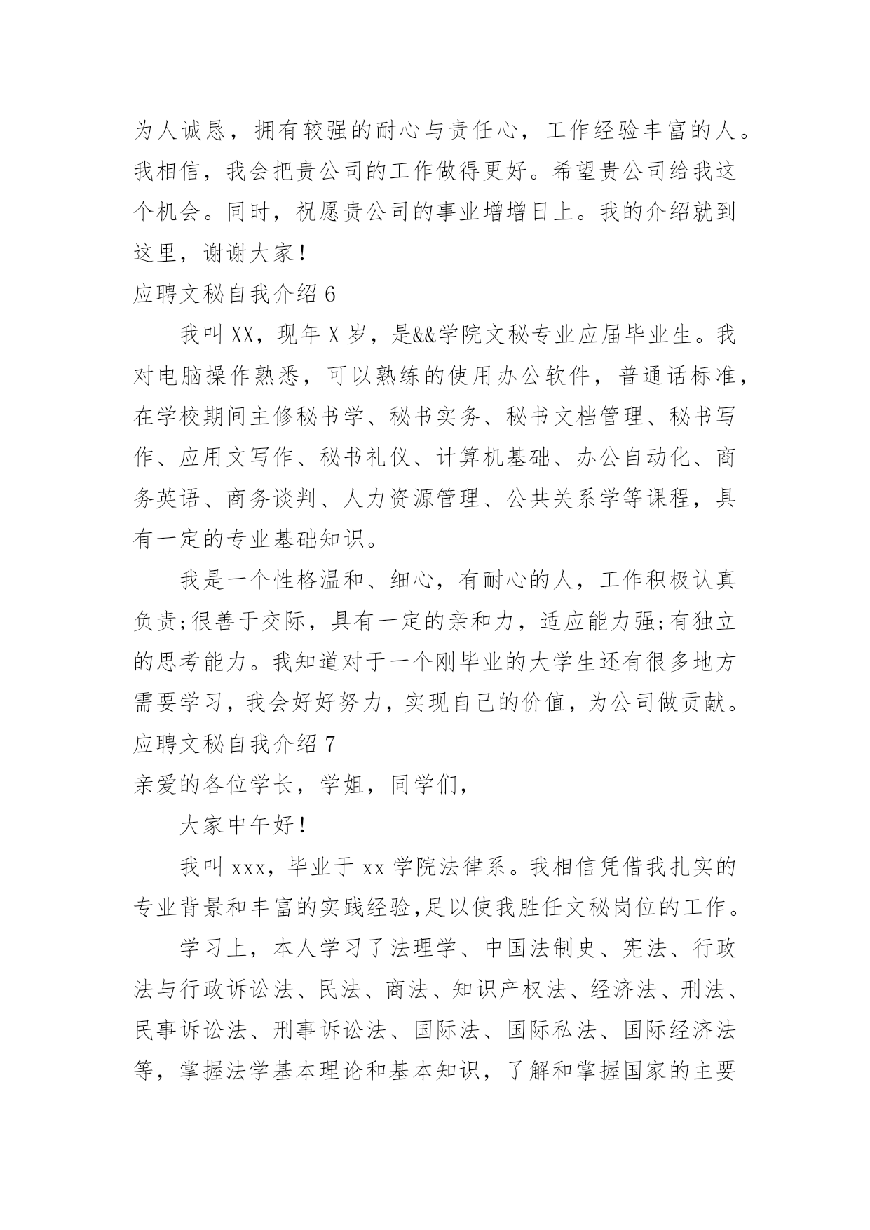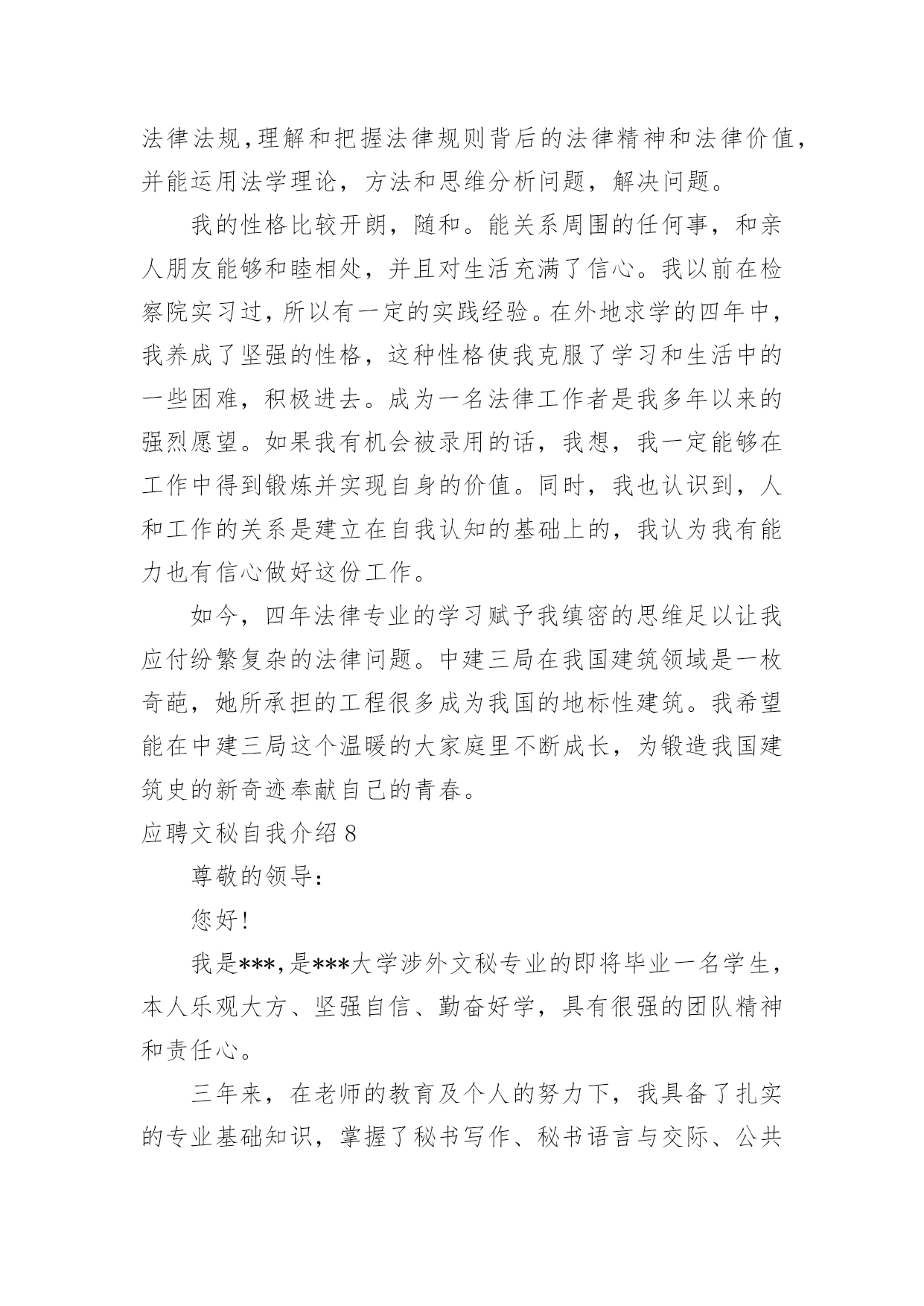 应聘文秘自我介绍应聘文秘自我介绍当到达一个陌生的环境后,我们就有可能用到自我介绍,通过自我介绍可以让他人了解我们。怎么写自我介绍才能避免踩雷呢?以下是小编为大家收集的应聘文秘自我介绍,欢迎大家分享。应聘文秘自我介绍1尊敬的领导:本人英语基础扎实,具有良好的听、说、读、写、译能力,能够较好地翻译商务合同、商务信函等;已取得相关技能,拥有较强的专业实际应用能力,懂得协助总经理处理各种日常事务及与公司各部门之间的协调与沟通工作;并能够熟练使用excel,outlook等,打字速度70中文/分钟`。性格开朗,工作积极主动,具有良好的道德修养,忠诚自律,责任心强,敬业心强,关心集体和公司发展,具有较强的沟通和协调能力。自荐人:XXXXX年XX月XX日应聘文秘自我介绍2尊敬的各位老师、同学们:你们好!感谢老师及同学们给我这次机会,继续和大家共同学习、研究文秘部的工作。我是xx系xx班,我们都知道,校学生会文秘处协助主席团统筹和协调学生会整体工作,最大程度发挥桥梁和纽带的作用;负责处理学生会日常工作,并及时了解和掌握各部门的工作进度及工作效果;制定学生会考核章程,负责对学生会全体人员执行考核、培训、监督;负责起草、制定并执行、监督学生会各项规章制度;负责全校性学生干部培训基地工作开展;负责拟定学生会工作计划、工作总结等有关材料;负责安排有关会议会务事宜,包括签到﹑记录等工作;做好学生会干部的人事管理工作,完善制订并妥当管理学生会成员人事档案;深入了解干部的思想和工作开展情况,及时给予指导和调整;对学生会内部财务进行公开化管理;组织并协调相关活动,负责校学生会等沟通性工作的开展。因此,在清楚的明白了文秘部的职责后,我会做到:坚决完成任务,认真履行职责!充分的发挥文秘部文秘的职责,做好学生会干部的人事工作,妥善的管理学生会成员的档案资料,做到有据可查!我会紧密的团结在校领导周围,为学校学生会的全面建设付出自己应有的职责!希望大家支持我!应聘文秘自我介绍3尊敬的领导:你好!很在此请容许我介绍一下自己的专业及求职意向。我毕业于广东职业技术学院,就读高级文秘专业。在大学的三年学习生活中,我努力学习,成绩优良,为以后的工作打下了坚实的基础。同时我还积极参加了学校的各项活动以及校外的各种兼职工作,为我积累了工作经验,提升了我各方面的能力。作为新时代的一员,怀着对前途对未来的信心和对施展才华的渴望,我相信我各方面较强的能力,将成为把理论知识转化为实际业绩的有力保证。请相信我,也请相信您的眼光,希望您不要错过我,也希望您能让我不要错过您的公司。如果能够得到贵公司的青睐,我一定会不断学习,竭诚为贵单位服务,与贵单位共同发展,共创美好未来!应聘文秘自我介绍4三年来,在老师的教育及个人的努力下,我具备了扎实的专业基础知识,掌握了秘书写作、秘书语言与交际、公共关系、办公自动化、秘书学等专业课程。同时也拥有一定的分析和设计能力。通过在校期间的试验实习和课程设计的训练我具备了较强的动手能力。在课外时间里我阅读了大量的书籍。不但充实了自己,也培养了自己多方面的技能。除了在学好本专业的知识外,我对计算机知识进行了比较系统地学习和熟练地应用学习过电脑操作技术,能适应现代化办公的工作需要。在校学习期间,注意思想品德修养,严格要求自己,积极参加社会实践活动。在这些活动中,我不仅锻炼了自己的组织能力,更加强健了自己的身体素质。三年的学习中,我在工作上不仅锻炼了自己的工作能力,组织能力,更在老师的教育下学习懂得了如何做人。坚强自信的我,会勇敢的迎接未来激烈的挑战。真诚希望成为其中一员。我深信会用自己勤勉的汗水与同仁一道为贵公司的锦绣前程奋斗不息,奉献我的年轻的热忱和才智,并且在实践中不断学习、进步!应聘文秘自我介绍5尊敬的领导:您好!我是xxx,是xxx大学涉外文秘专业的即将毕业一名学生,本人乐观大方、坚强自信、勤奋好学,具有很强的团队精神和责任心。三年来,在老师的教育及个人的努力下,我具备了扎实的专业基础知识,掌握了秘书写作、秘书语言与交际、公共关系、办公自动化、秘书学等专业课程。同时也拥有一定的分析和设计能力。通过在校期间的试验实习和课程设计的训练我具备了较强的动手能力。在课外时间里我阅读了大量的书籍。不但充实了自己,也培养了自己多方面的技能。除了在学好本专业的知识外,我对计算机知识进行了比较系统地学习和熟练地应用学习过电脑操作技术,能适应现代化办公的工作需要。在校学习期间,注意思想品德修养,严格要求自己,积极参加社会实践活动。在这些活动中,我不仅锻炼了自己的组织能力,更加强健了自己的身体素质。在大学3年的生活中,一直积极进取。学习方面,成绩优异,获得了办公自动化以及大学英语四级证书。工作方面,曾担任校学生团体联合会会费管理部干事在大学3年的`生活中,本人逐渐发展成一个性格开