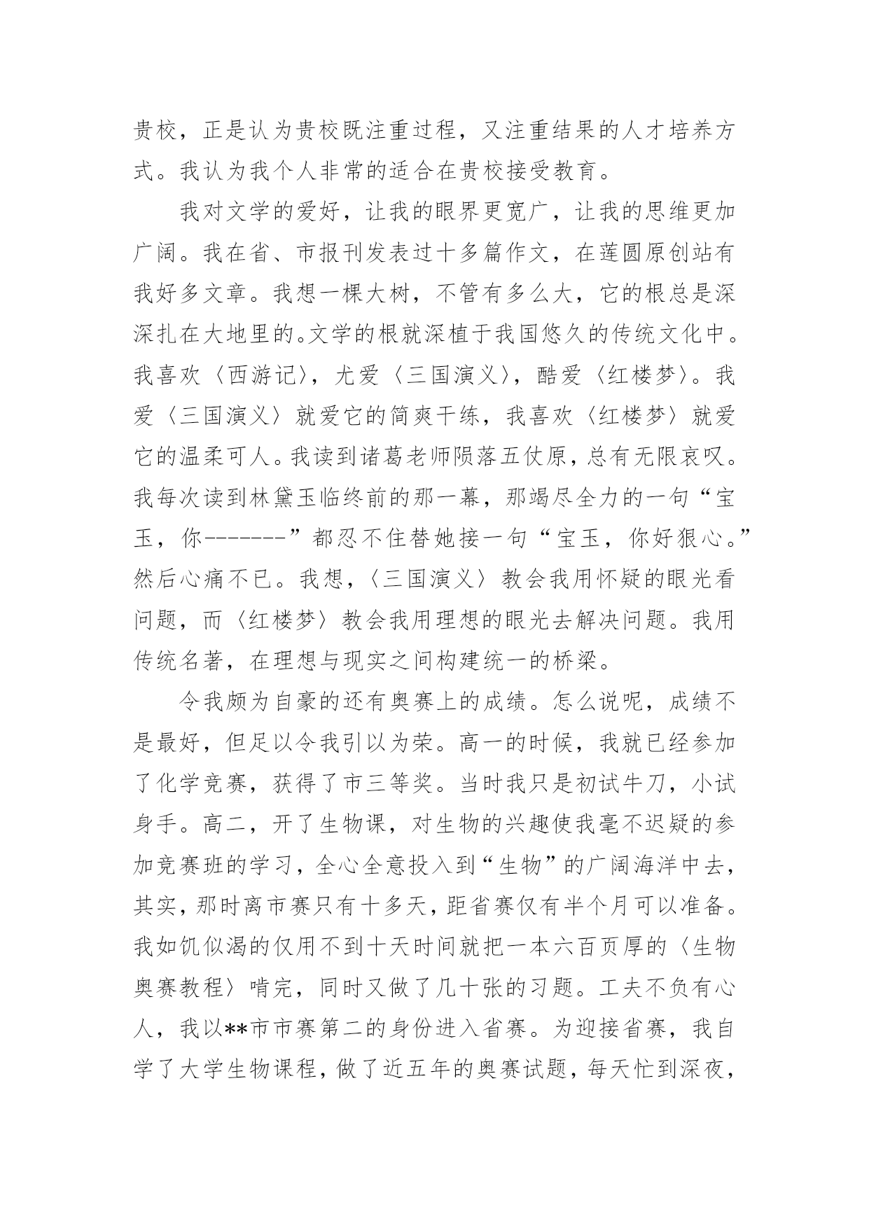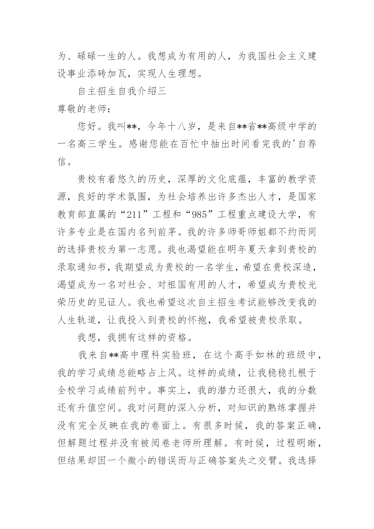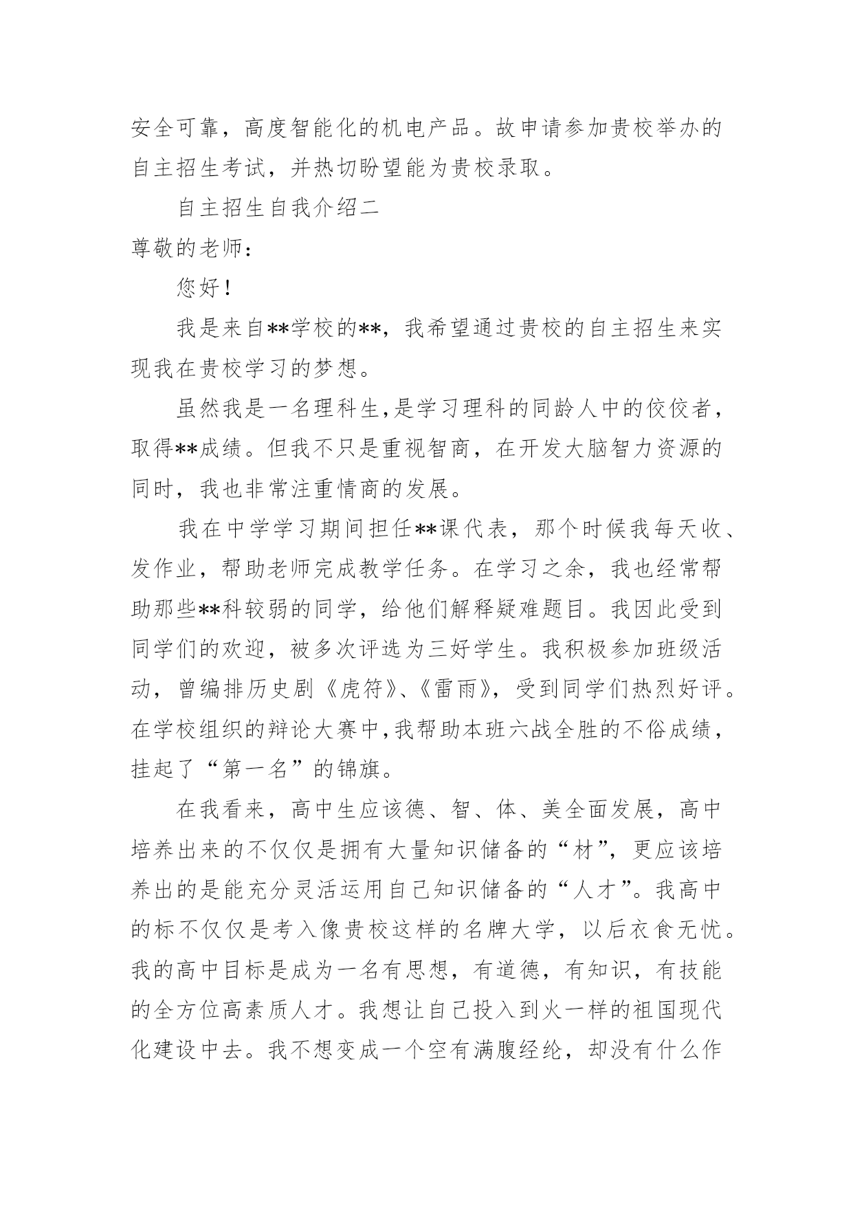 自主招生自我介绍自主招生自我介绍三篇自主招生自我介绍一尊敬的老师:您好!我的名字是**,来自**中学。我希望通过贵校的自主招生来实现我在贵校学习的梦想。我的初中是在**中学就读的。学习期间,我注重德智体均衡发展,培养自学能力,主动参加学校举办的各种活动,曾获得**奖项或荣誉。我认为,体育锻炼不仅能让人有一个强健的体魄还能令人具有坚强的意志,这些都是未来学习和工作不可缺少的。通过老师辛勤培养和个人的不懈努力,我顺利的进入**中学继续学习,并于**年取得**省高中数学竞赛三等奖和**市高中数学竞赛二等奖。我性格开朗,学习刻苦,对自然科学也有着兴趣浓厚,尤其酷爱数理。我兴趣广泛,天文地理、国内国际形势都会引起我极大的兴趣与关注。我也喜欢参加学校组织的各种活动,喜欢写作、唱歌,做过校园联欢晚会主持人等,这些爱好,让我不但在学习上,而且在多方面取得进步。希望能够进入自己心仪的高校继续深造,尤其是贵校。我设想进入大学后致力于前沿自然科学理论研究及实际运用,专攻机械电子工程学科,立志研制开发出更加节能环保,安全可靠,高度智能化的机电产品。故申请参加贵校举办的自主招生考试,并热切盼望能为贵校录取。自主招生自我介绍二尊敬的老师:您好!我是来自**学校的**,我希望通过贵校的自主招生来实现我在贵校学习的梦想。虽然我是一名理科生,是学习理科的同龄人中的佼佼者,取得**成绩。但我不只是重视智商,在开发大脑智力资源的同时,我也非常注重情商的发展。我在中学学习期间担任**课代表,那个时候我每天收、发作业,帮助老师完成教学任务。在学习之余,我也经常帮助那些**科较弱的同学,给他们解释疑难题目。我因此受到同学们的欢迎,被多次评选为三好学生。我积极参加班级活动,曾编排历史剧《虎符》、《雷雨》,受到同学们热烈好评。在学校组织的辩论大赛中,我帮助本班六战全胜的不俗成绩,挂起了“第一名”的锦旗。在我看来,高中生应该德、智、体、美全面发展,高中培养出来的不仅仅是拥有大量知识储备的“材”,更应该培养出的是能充分灵活运用自己知识储备的“人才”。我高中的标不仅仅是考入像贵校这样的名牌大学,以后衣食无忧。我的高中目标是成为一名有思想,有道德,有知识,有技能的全方位高素质人才。我想让自己投入到火一样的祖国现代化建设中去。我不想变成一个空有满腹经纶,却没有什么作为、碌碌一生的人。我想成为有用的人,为我国社会主义建设事业添砖加瓦,实现人生理想。自主招生自我介绍三尊敬的老师:您好。我叫**,今年十八岁,是来自**省**高级中学的一名高三学生。感谢您能在百忙中抽出时间看完我的'自荐信。贵校有着悠久的历史,深厚的文化底蕴,丰富的教学资源,良好的学术氛围,为社会培养出许多杰出人才,是国家教育部直属的“211”工程和“985”工程重点建设大学,有许多专业是在国内名列前茅。我的许多师哥师姐都不约而同的选择贵校为第一志愿。我也渴望能在明年夏天拿到贵校的录取通知书,我期望成为贵校的一名学生,希望在贵校深造,渴望成为一名对社会、对祖国有用的人才,希望成为贵校光荣历史的见证人。我也希望这次自主招生考试能够改变我的人生轨道,让我投入到贵校的怀抱,我希望被贵校录取。我想,我拥有这样的资格。我来自**高中理科实验班,在这个高手如林的班级中,我的学习成绩总能略占上风。这样的成绩,让我稳稳扎根于全校学习成绩前列中。事实上,我的潜力还很大,我的分数还有升值空间。我对问题的深入分析,对知识的熟练掌握并没有完全反映在我的卷面上。有很多时候,我的答案正确,但解题过程并没有被阅卷老师所理解。有时候,过程明晰,但结果却因一个微小的错误而与正确答案失之交臂。我选择贵校,正是认为贵校既注重过程,又注重结果的人才培养方式。我认为我个人非常的适合在贵校接受教育。我对文学的爱好,让我的眼界更宽广,让我的思维更加广阔。我在省、市报刊发表过十多篇作文,在莲圆原创站有我好多文章。我想一棵大树,不管有多么大,它的根总是深深扎在大地里的。文学的根就深植于我国悠久的传统文化中。我喜欢〈西游记〉,尤爱〈三国演义〉,酷爱〈红楼梦〉。我爱〈三国演义〉就爱它的简爽干练,我喜欢〈红楼梦〉就爱它的温柔可人。我读到诸葛老师陨落五仗原,总有无限哀叹。我每次读到林黛玉临终前的那一幕,那竭尽全力的一句“宝玉,你-------”都忍不住替她接一句“宝玉,你好狠心。”然后心痛不已。我想,〈三国演义〉教会我用怀疑的眼光看问题,而〈红楼梦〉教会我用理想的眼光去解决问题。我用传统名著,在理想与现实之间构建统一的桥梁。令我颇为自豪的还有奥赛上的成绩。怎么说呢,成绩不是最好,但足以令我引以为荣。高一的时候,我就已经参加了化学竞赛,获得了市三等奖。当时我只是初试牛刀,小试身手。高二,开了生物课,对生物的兴趣使我毫不迟疑的参加竞赛班的学习,全心全意投入到“生物”的广阔海洋中去,