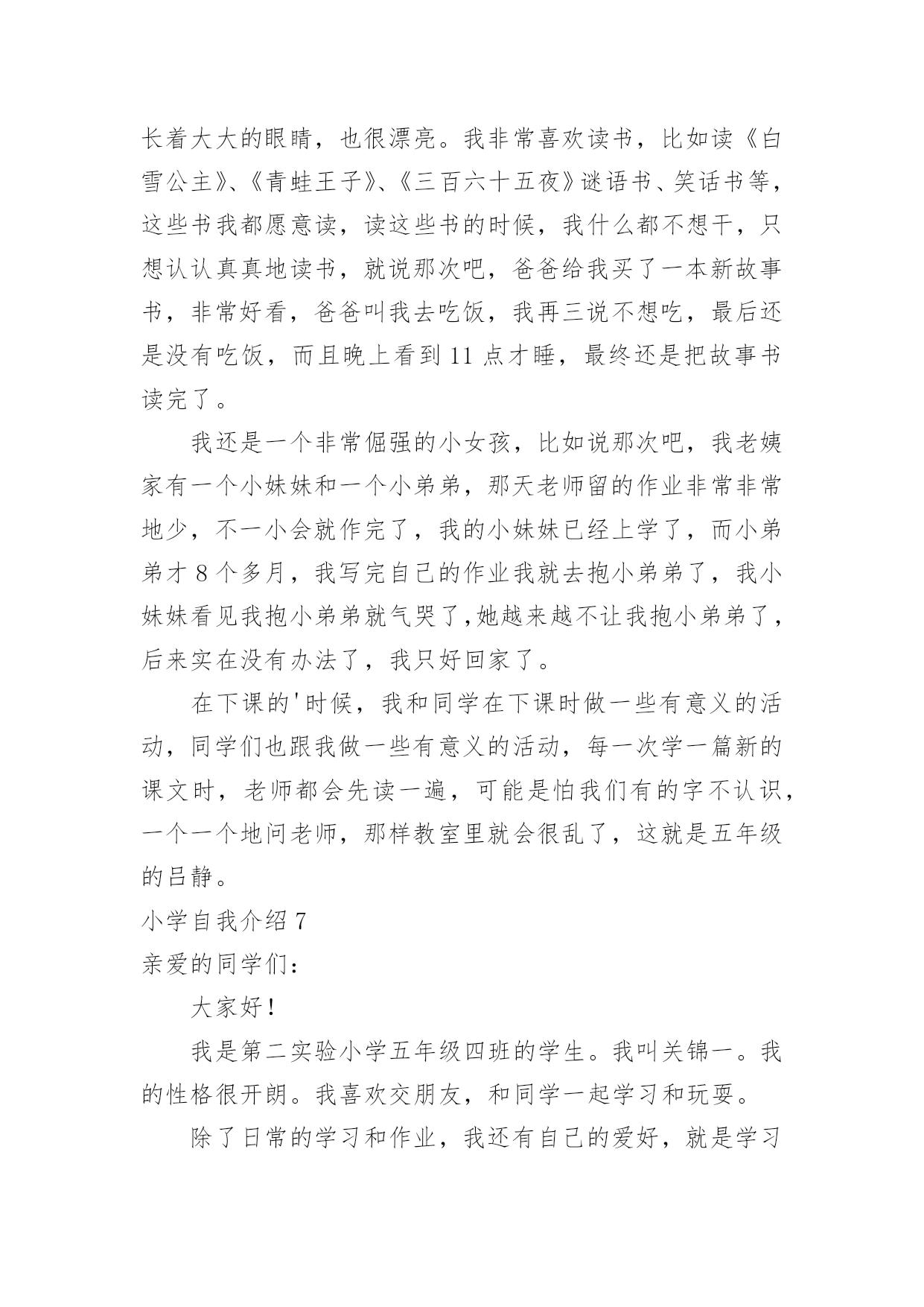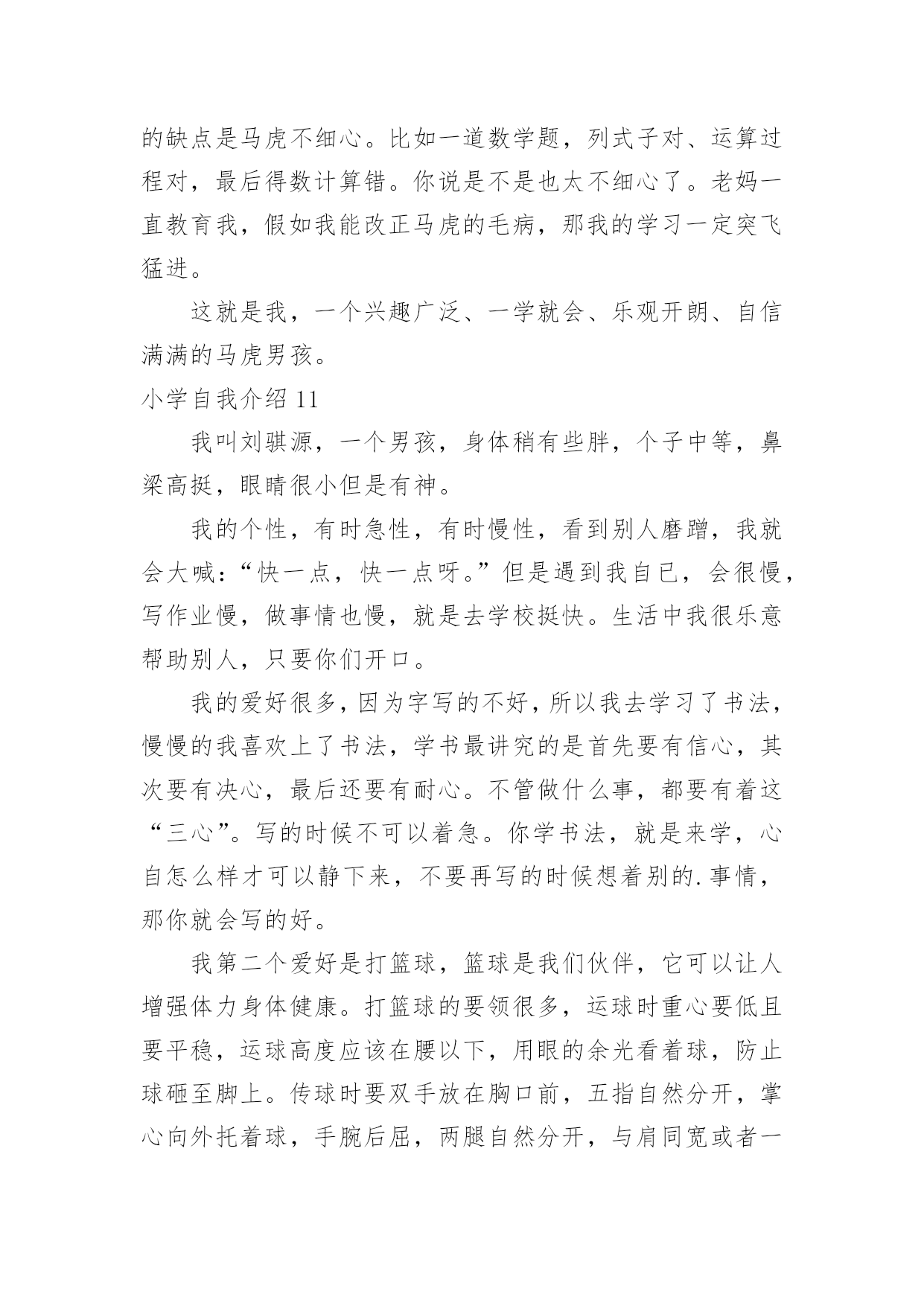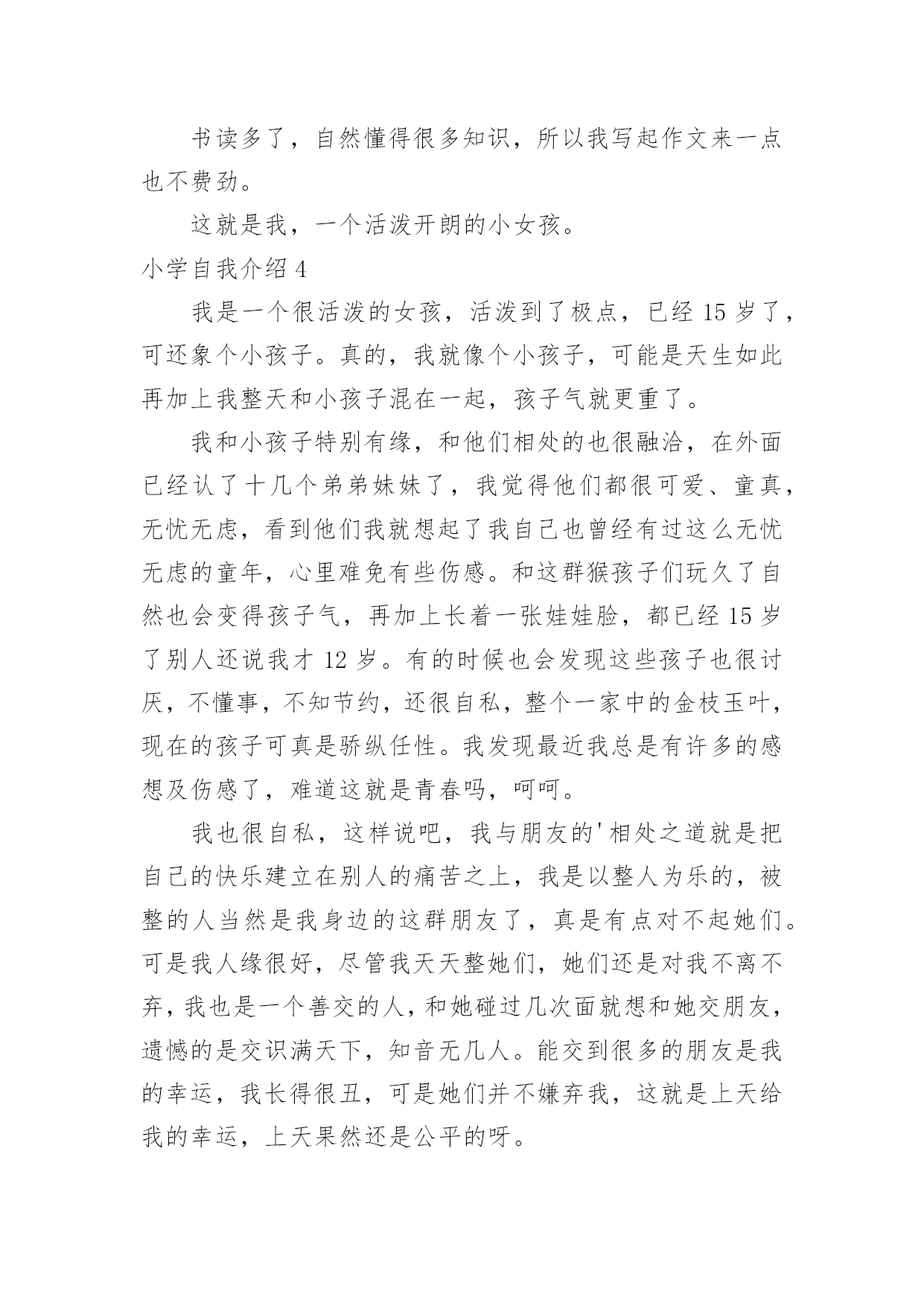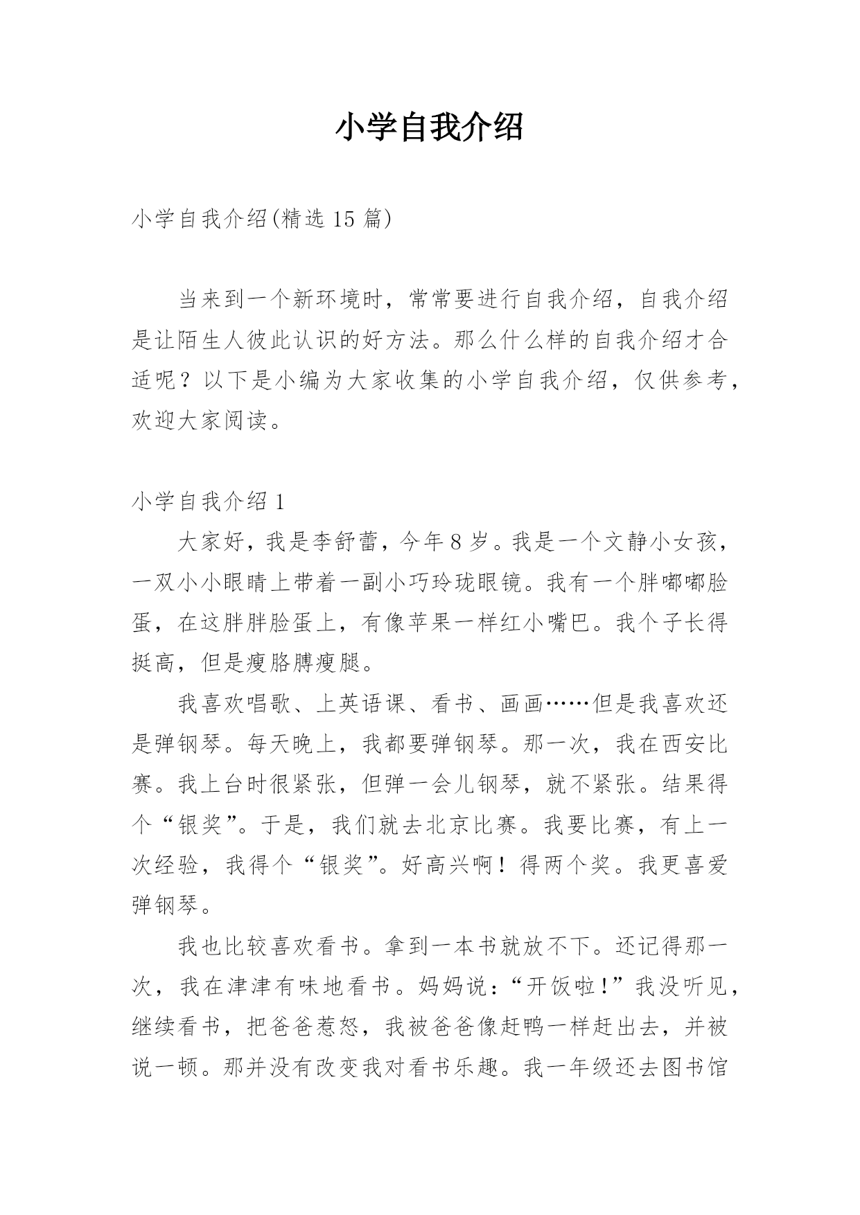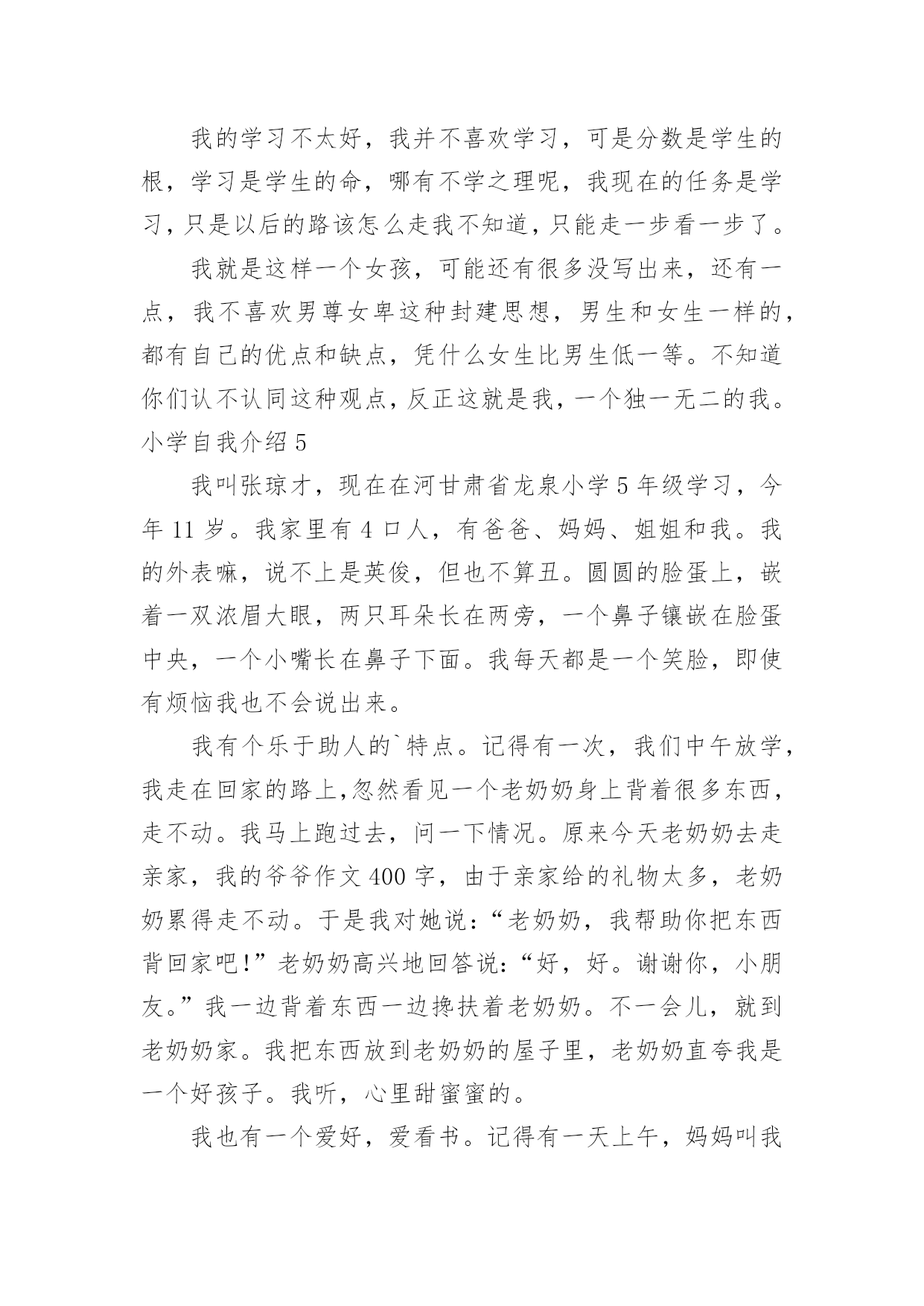 小学自我介绍小学自我介绍15篇(推荐)处在一个陌生场合时,需要我们进行自我介绍,通过自我介绍可以让别人认识自己。那么自我介绍要注意有什么内容呢?下面是小编精心整理的小学自我介绍,希望能够帮助到大家。小学自我介绍1我叫,小名叫豆豆,我最喜欢的人是爸爸妈妈;我最喜欢看的动画片是《天线宝宝》;我最喜欢的`故事是《三只小猪》;我会自己吃饭,会给自己穿鞋子??希望能和大家做好朋友。小学自我介绍2老师好、同学们好:我叫xx,今年6岁啦。我是一个十分活泼的小女孩,有时候爸爸妈妈说我活泼的过分,算是一个小淘气鬼。我的爷爷奶奶、外公外婆总是夸我长的漂亮,说我头发乌黑发亮、眼睛明亮有神。我喜欢唱歌、弹钢琴,我每天都要弹两个小时的钢琴,现在还会一边弹琴一边唱歌,我喜欢弹的曲子有《xx》《xx》,我还参与过xx演出,获得过奖励。我还会画画呢,一开始我给我爸爸妈妈画像,我爸爸说我把他画成了丑八怪,不过他总是鼓励我。我还有不少优点呢,比如说我写字又快又好看,计算能力也挺强的`,另外我还会帮着做家务。当然我也有缺点,比如有时候弹琴、画画后不收拾起来就去看电视,有时候也不愿意写作业,吃饭时候有点儿挑食。我很喜欢春天,每年春天爸爸妈妈都会带我出去看花、看青草,前几天他们还带我去了植物园呢,里面真是漂亮极了。不过他们从来不给我折花,他们说花长在树上是最幸福的。小学自我介绍3我是一个举止文雅、心地善良;爱唱歌、爱跳舞;爱看书的一个小女孩。因为我的这几个特点,给同学们留下了很深的印象。我举止文雅,心地善良,不说脏话,粗话,每当有的同学愁眉苦脸的时候,我总是帮助她解除心中的烦恼,还被我的同桌称为知心姐姐。我也很善于交朋友,和同学们的关系都很融洽。我爱唱歌,爱跳舞,这是我的一技之长。班里一有活动,都少不了我的歌声。我的'歌声给同学们带去了欢乐,同学们都称我是班里的小歌手。我爱看书。从小到大买了不少的书,有《马小跳系列》丛书。有些书我反复阅读了好几遍。有时为了看书,我都忘记了饿,只要有一点时间,我都要见缝插针,读上几页。书读多了,自然懂得很多知识,所以我写起作文来一点也不费劲。这就是我,一个活泼开朗的小女孩。小学自我介绍4我是一个很活泼的女孩,活泼到了极点,已经15岁了,可还象个小孩子。真的,我就像个小孩子,可能是天生如此再加上我整天和小孩子混在一起,孩子气就更重了。我和小孩子特别有缘,和他们相处的也很融洽,在外面已经认了十几个弟弟妹妹了,我觉得他们都很可爱、童真,无忧无虑,看到他们我就想起了我自己也曾经有过这么无忧无虑的童年,心里难免有些伤感。和这群猴孩子们玩久了自然也会变得孩子气,再加上长着一张娃娃脸,都已经15岁了别人还说我才12岁。有的时候也会发现这些孩子也很讨厌,不懂事,不知节约,还很自私,整个一家中的金枝玉叶,现在的孩子可真是骄纵任性。我发现最近我总是有许多的感想及伤感了,难道这就是青春吗,呵呵。我也很自私,这样说吧,我与朋友的'相处之道就是把自己的快乐建立在别人的痛苦之上,我是以整人为乐的,被整的人当然是我身边的这群朋友了,真是有点对不起她们。可是我人缘很好,尽管我天天整她们,她们还是对我不离不弃,我也是一个善交的人,和她碰过几次面就想和她交朋友,遗憾的是交识满天下,知音无几人。能交到很多的朋友是我的幸运,我长得很丑,可是她们并不嫌弃我,这就是上天给我的幸运,上天果然还是公平的呀。我的学习不太好,我并不喜欢学习,可是分数是学生的根,学习是学生的命,哪有不学之理呢,我现在的任务是学习,只是以后的路该怎么走我不知道,只能走一步看一步了。我就是这样一个女孩,可能还有很多没写出来,还有一点,我不喜欢男尊女卑这种封建思想,男生和女生一样的,都有自己的优点和缺点,凭什么女生比男生低一等。不知道你们认不认同这种观点,反正这就是我,一个独一无二的我。小学自我介绍5我叫张琼才,现在在河甘肃省龙泉小学5年级学习,今年11岁。我家里有4口人,有爸爸、妈妈、姐姐和我。我的外表嘛,说不上是英俊,但也不算丑。圆圆的脸蛋上,嵌着一双浓眉大眼,两只耳朵长在两旁,一个鼻子镶嵌在脸蛋中央,一个小嘴长在鼻子下面。我每天都是一个笑脸,即使有烦恼我也不会说出来。我有个乐于助人的`特点。记得有一次,我们中午放学,我走在回家的路上,忽然看见一个老奶奶身上背着很多东西,走不动。我马上跑过去,问一下情况。原来今天老奶奶去走亲家,我的爷爷作文400字,由于亲家给的礼物太多,老奶奶累得走不动。于是我对她说:“老奶奶,我帮助你把东西背回家吧!”老奶奶高兴地回答说:“好,好。谢谢你,小朋友。”我一边背着东西一边搀扶着老奶奶。不一会儿,就到老奶奶家。我把东西放到老奶奶的屋子里,老奶奶直夸我是一个好孩子。我听,心里甜蜜蜜的。我也有一个爱好,爱看书。记得有一天上午,妈妈叫我剥蚕豆,我答应。我一边剥蚕豆一边看书,妈妈看