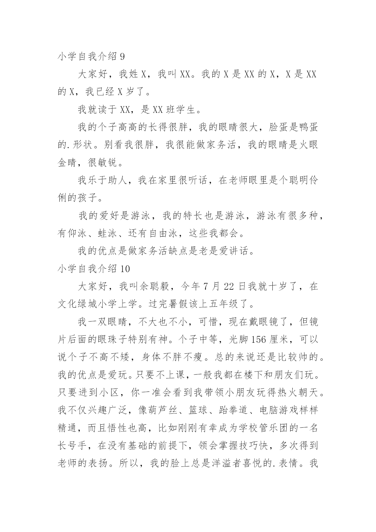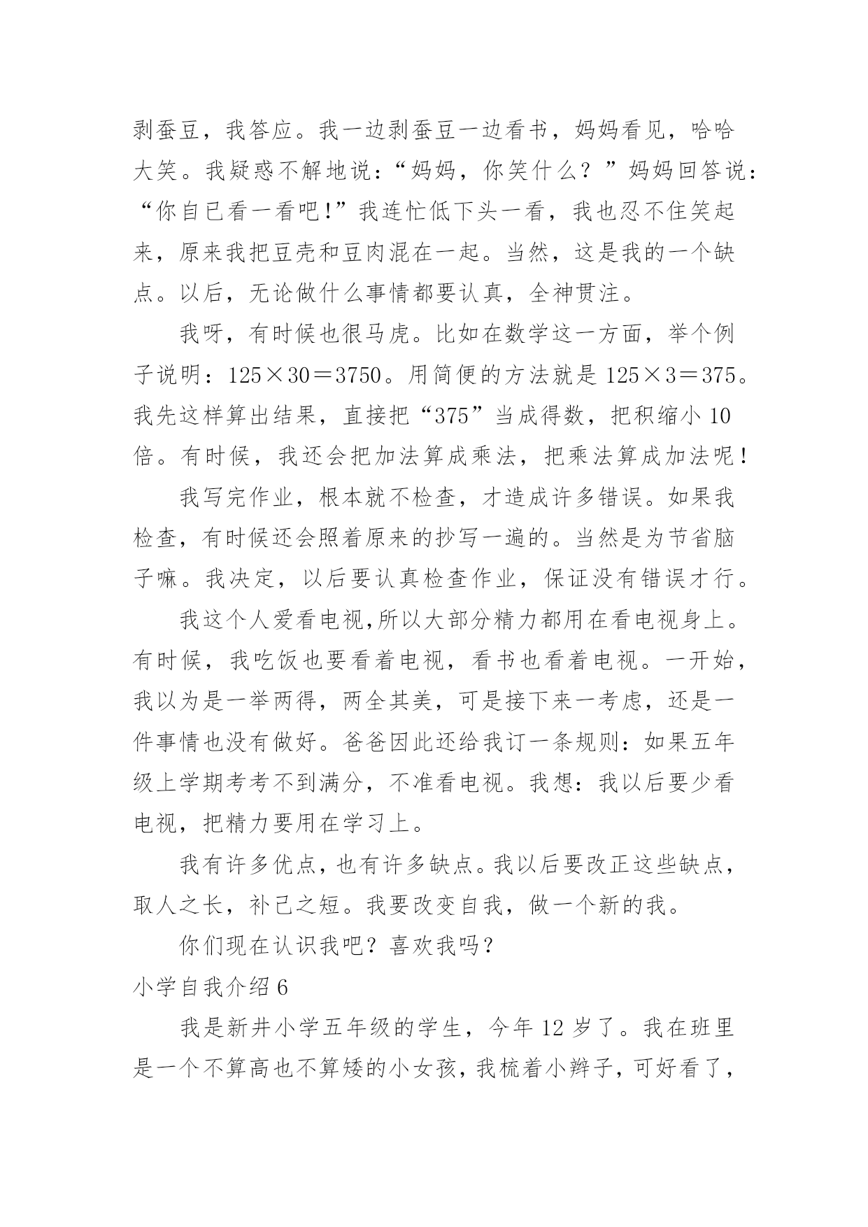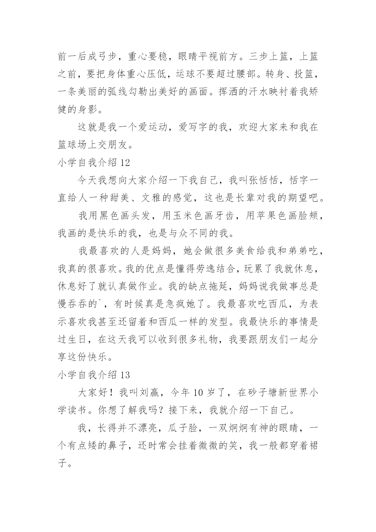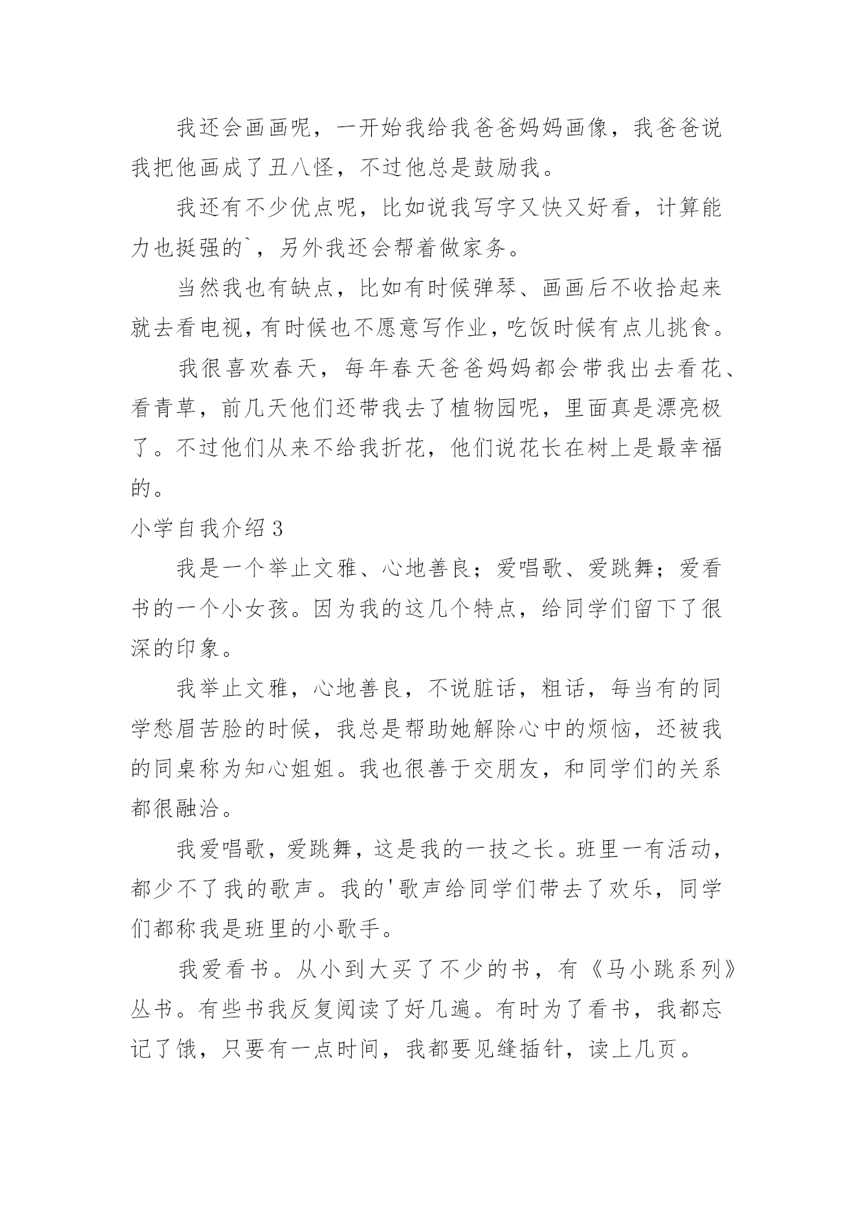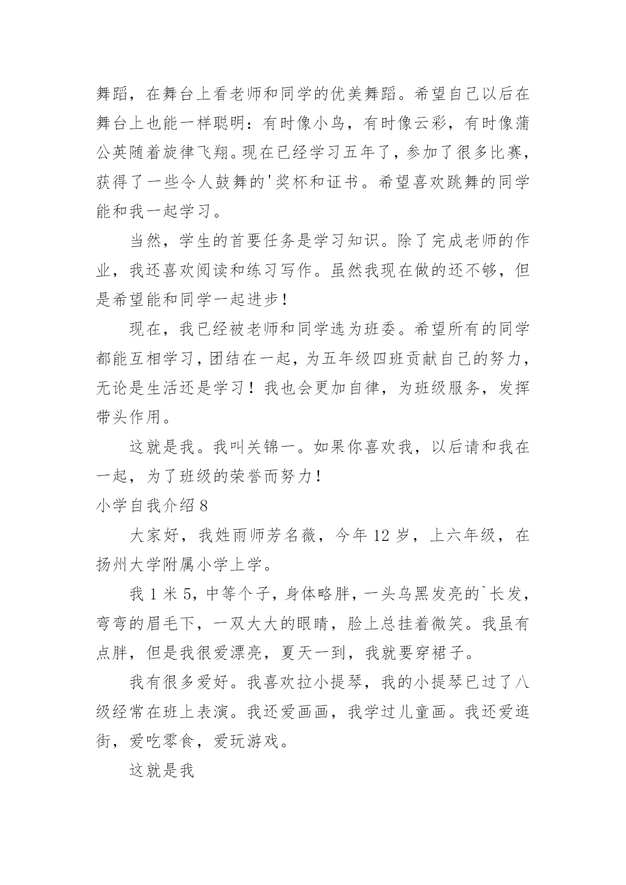 小学自我介绍小学自我介绍15篇(推荐)处在一个陌生场合时,需要我们进行自我介绍,通过自我介绍可以让别人认识自己。那么自我介绍要注意有什么内容呢?下面是小编精心整理的小学自我介绍,希望能够帮助到大家。小学自我介绍1我叫,小名叫豆豆,我最喜欢的人是爸爸妈妈;我最喜欢看的动画片是《天线宝宝》;我最喜欢的`故事是《三只小猪》;我会自己吃饭,会给自己穿鞋子??希望能和大家做好朋友。小学自我介绍2老师好、同学们好:我叫xx,今年6岁啦。我是一个十分活泼的小女孩,有时候爸爸妈妈说我活泼的过分,算是一个小淘气鬼。我的爷爷奶奶、外公外婆总是夸我长的漂亮,说我头发乌黑发亮、眼睛明亮有神。我喜欢唱歌、弹钢琴,我每天都要弹两个小时的钢琴,现在还会一边弹琴一边唱歌,我喜欢弹的曲子有《xx》《xx》,我还参与过xx演出,获得过奖励。我还会画画呢,一开始我给我爸爸妈妈画像,我爸爸说我把他画成了丑八怪,不过他总是鼓励我。我还有不少优点呢,比如说我写字又快又好看,计算能力也挺强的`,另外我还会帮着做家务。当然我也有缺点,比如有时候弹琴、画画后不收拾起来就去看电视,有时候也不愿意写作业,吃饭时候有点儿挑食。我很喜欢春天,每年春天爸爸妈妈都会带我出去看花、看青草,前几天他们还带我去了植物园呢,里面真是漂亮极了。不过他们从来不给我折花,他们说花长在树上是最幸福的。小学自我介绍3我是一个举止文雅、心地善良;爱唱歌、爱跳舞;爱看书的一个小女孩。因为我的这几个特点,给同学们留下了很深的印象。我举止文雅,心地善良,不说脏话,粗话,每当有的同学愁眉苦脸的时候,我总是帮助她解除心中的烦恼,还被我的同桌称为知心姐姐。我也很善于交朋友,和同学们的关系都很融洽。我爱唱歌,爱跳舞,这是我的一技之长。班里一有活动,都少不了我的歌声。我的'歌声给同学们带去了欢乐,同学们都称我是班里的小歌手。我爱看书。从小到大买了不少的书,有《马小跳系列》丛书。有些书我反复阅读了好几遍。有时为了看书,我都忘记了饿,只要有一点时间,我都要见缝插针,读上几页。书读多了,自然懂得很多知识,所以我写起作文来一点也不费劲。这就是我,一个活泼开朗的小女孩。小学自我介绍4我是一个很活泼的女孩,活泼到了极点,已经15岁了,可还象个小孩子。真的,我就像个小孩子,可能是天生如此再加上我整天和小孩子混在一起,孩子气就更重了。我和小孩子特别有缘,和他们相处的也很融洽,在外面已经认了十几个弟弟妹妹了,我觉得他们都很可爱、童真,无忧无虑,看到他们我就想起了我自己也曾经有过这么无忧无虑的童年,心里难免有些伤感。和这群猴孩子们玩久了自然也会变得孩子气,再加上长着一张娃娃脸,都已经15岁了别人还说我才12岁。有的时候也会发现这些孩子也很讨厌,不懂事,不知节约,还很自私,整个一家中的金枝玉叶,现在的孩子可真是骄纵任性。我发现最近我总是有许多的感想及伤感了,难道这就是青春吗,呵呵。我也很自私,这样说吧,我与朋友的'相处之道就是把自己的快乐建立在别人的痛苦之上,我是以整人为乐的,被整的人当然是我身边的这群朋友了,真是有点对不起她们。可是我人缘很好,尽管我天天整她们,她们还是对我不离不弃,我也是一个善交的人,和她碰过几次面就想和她交朋友,遗憾的是交识满天下,知音无几人。能交到很多的朋友是我的幸运,我长得很丑,可是她们并不嫌弃我,这就是上天给我的幸运,上天果然还是公平的呀。我的学习不太好,我并不喜欢学习,可是分数是学生的根,学习是学生的命,哪有不学之理呢,我现在的任务是学习,只是以后的路该怎么走我不知道,只能走一步看一步了。我就是这样一个女孩,可能还有很多没写出来,还有一点,我不喜欢男尊女卑这种封建思想,男生和女生一样的,都有自己的优点和缺点,凭什么女生比男生低一等。不知道你们认不认同这种观点,反正这就是我,一个独一无二的我。小学自我介绍5我叫张琼才,现在在河甘肃省龙泉小学5年级学习,今年11岁。我家里有4口人,有爸爸、妈妈、姐姐和我。我的外表嘛,说不上是英俊,但也不算丑。圆圆的脸蛋上,嵌着一双浓眉大眼,两只耳朵长在两旁,一个鼻子镶嵌在脸蛋中央,一个小嘴长在鼻子下面。我每天都是一个笑脸,即使有烦恼我也不会说出来。我有个乐于助人的`特点。记得有一次,我们中午放学,我走在回家的路上,忽然看见一个老奶奶身上背着很多东西,走不动。我马上跑过去,问一下情况。原来今天老奶奶去走亲家,我的爷爷作文400字,由于亲家给的礼物太多,老奶奶累得走不动。于是我对她说:“老奶奶,我帮助你把东西背回家吧!”老奶奶高兴地回答说:“好,好。谢谢你,小朋友。”我一边背着东西一边搀扶着老奶奶。不一会儿,就到老奶奶家。我把东西放到老奶奶的屋子里,老奶奶直夸我是一个好孩子。我听,心里甜蜜蜜的。我也有一个爱好,爱看书。记得有一天上午,妈妈叫我剥蚕豆,我答应。我一边剥蚕豆一边看书,妈妈看