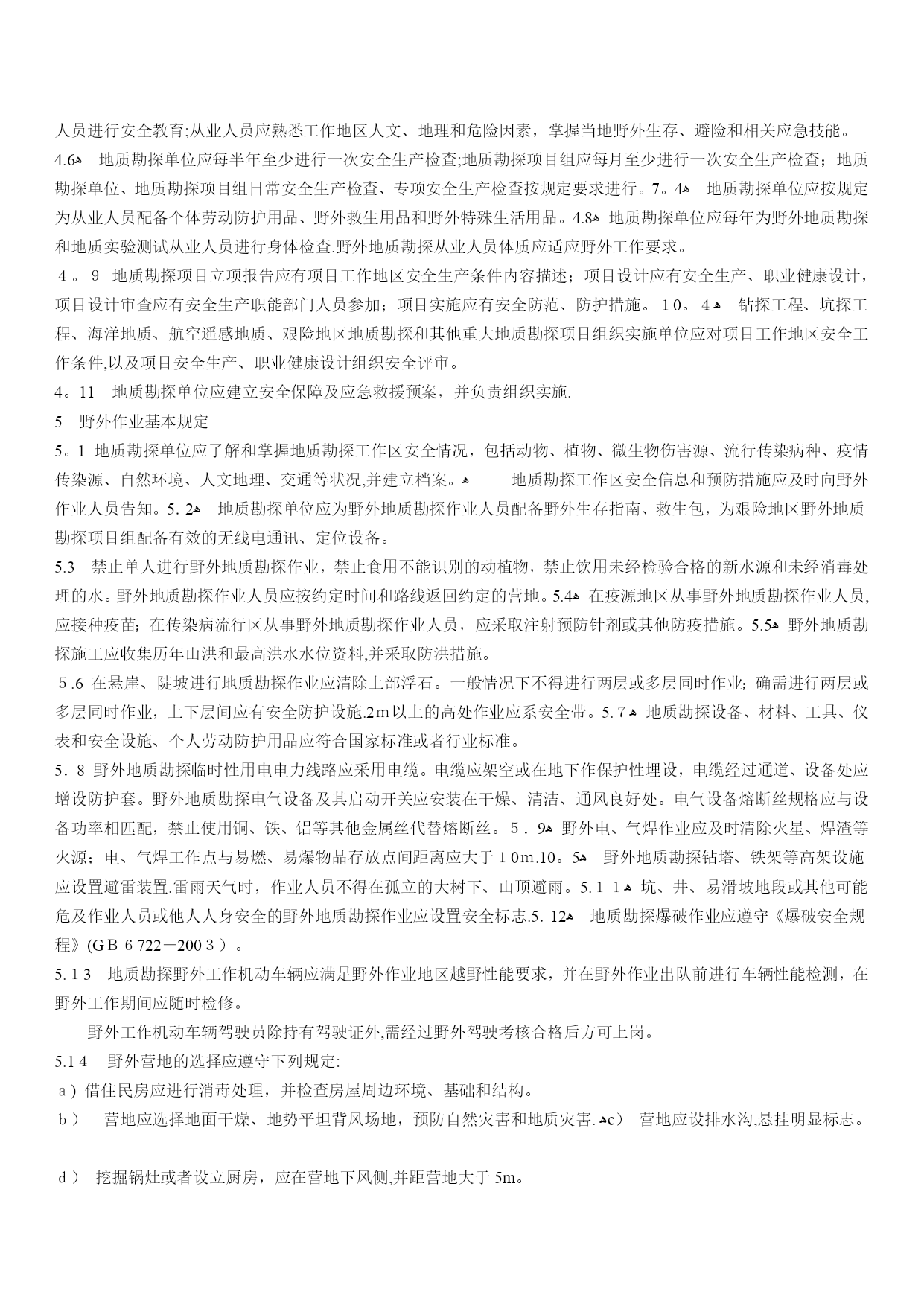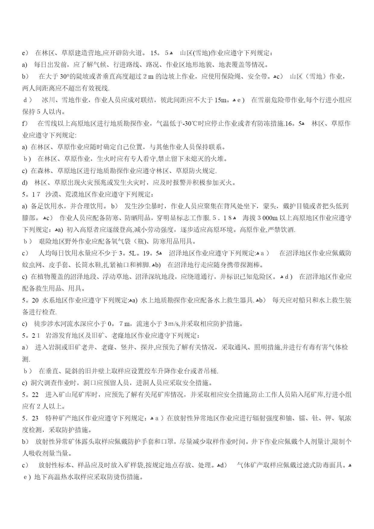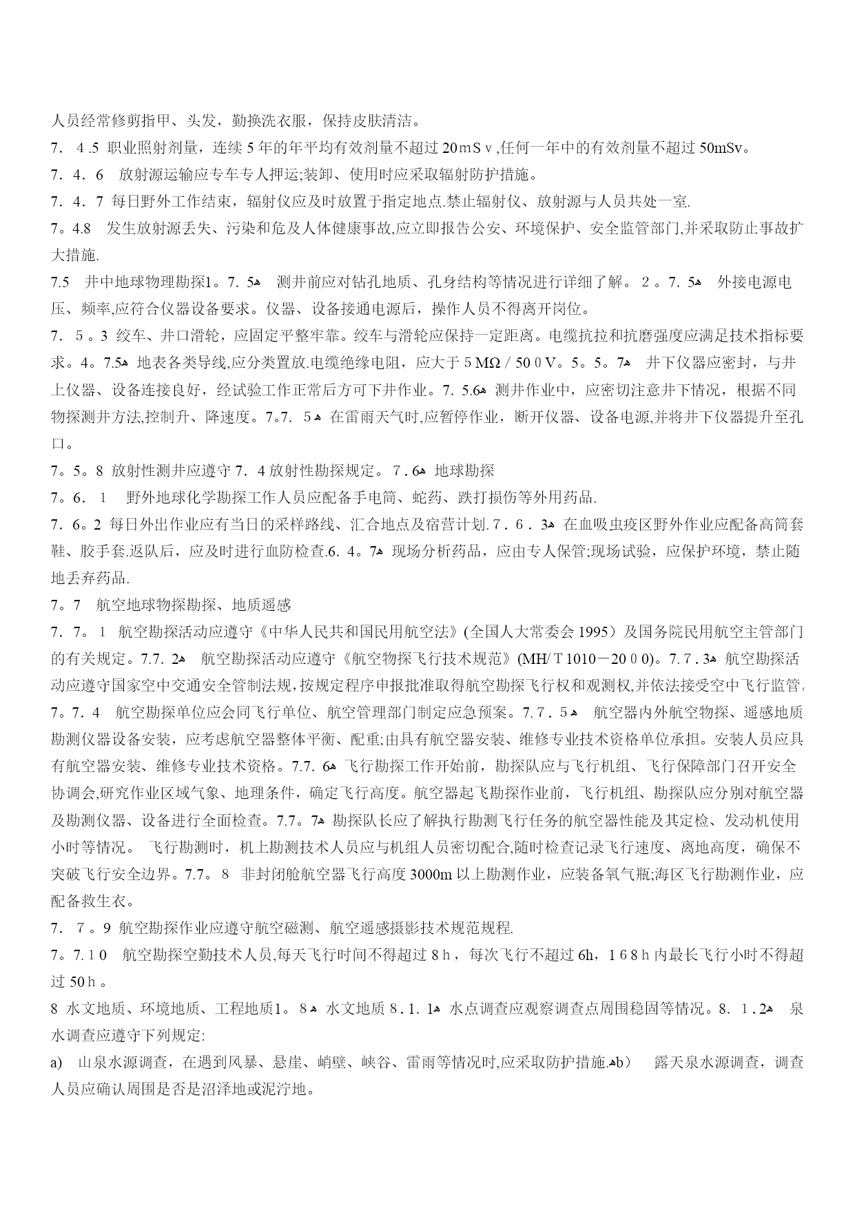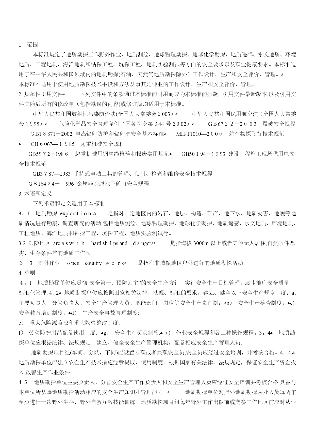 地质勘探安全规程(完整资料)(可以直接使用,可编辑优秀版资料,欢迎下载)地质勘探安全规程1范围本标准规定了地质勘探工作野外作业、地质测绘、地球物理勘探、地球化学勘探、地质遥感、水文地质、环境地质、工程地质、海洋地质和钻探工程、坑探工程、地质实验测试等方面的安全要求以及职业健康要求。本标准适用于在中华人民共和国领域内的地质勘探(石油、天然气地质勘探除外)工作设计、生产和安全评价、管理。ﻫ本标准不适用于使用地质勘探技术手段和方法从事其延伸业的工作设计、生产和安全评价、管理。2规范性引用文件ﻫ下列文件中的条款通过本标准的引用而成为本标准的条款。引用文件最新版本,以及引用文件其随后所有的修改单(包括勘误的内容)或修订版均适用于本标准。中华人民共和国放射性污染防治法(全国人大常委会2003)ﻫ中华人民共和国民用航空法(全国人大常委会1995)ﻫ危险化学品安全管理条例(国务院令第344号2002)ﻫGB6722-2003爆破安全规程GB18871-2002电离辐射防护和辐射源安全基本标准ﻫMH/T1010—2000航空物探飞行技术规范ﻫGB6067—1985起重机械安全规程GB5972-1986起重机械用钢丝绳检验和报废实用规范ﻫGB50194-1993建设工程施工现场供用电安全技术规范GB3787—1983手持式电动工具的管理、使用、检查和维修安全技术规程GB16424-1996金属非金属地下矿山安全规程3术语和定义下列术语和定义适用于本标准3。1地质勘探explorationﻫ是指对一定地区内的岩石、地层、构造、矿产、地下水、地质灾害、地貌等地质情况进行勘察、调查研究的活动.包括地质测绘、地球物理勘探、地球化学勘探、地质遥感、水文地质、环境地质、工程地质、海洋地质和钻探工程、坑探工程、地质实验测试等。3.2艰险地区areaswithhardshipsanddangersﻫ是指海拔3000m以上或者其他无人居住,自然条件恶劣、生存条件差的地质工作区。3。3野外作业opencountryworkﻫ是指在非城镇地区户外进行的地质勘探活动。4总则4。1地质勘探单位应贯彻“安全第一、预防为主”的安全生产方针,实行安全生产目标管理,逐步推广安全质量标准化管理.ﻫ4.2地质勘探单位应按照国家相关法律、法规、标准的要求,建立、健全以下安全生产规章制度:a)主要负责人、分管负责人、安全生产管理人员、职能部门、岗位等安全生产责任制;ﻫb)安全生产检查制度;ﻫc)安全教育培训制度;ﻫd)生产安全事故管理制度;e)重大危险源监控和重大隐患整改制度;f)劳动防护用品配备使用制度;ﻫg)安全生产奖惩制度;ﻫh)作业安全规程和各工种操作规程。ﻫ4。3地质勘探单位应根据法律、法规规定,建立、健全安全生产管理机构,配备相应安全生产管理人员.地质勘探项目组(车间、分队,下同)应设置专职或者兼职安全员,安全员应经过安全培训,并考核合格。ﻫ4.4地质勘探单位应建立安全生产技术措施经费提取、使用制度。根据国家有关法律、法规规定,保证安全生产资金投入,改善生产作业条件。4.5地质勘探单位主要负责人、分管安全生产工作负责人和安全生产管理人员应经过安全培训并考核合格,具备与本单位所从事地质勘探活动相应的安全生产知识和管理能力。ﻫ地质勘探单位对野外地质勘探从业人员每两年至少进行一次野外生存、野外自救互救技能训练。地质勘探项目组每年野外工作出队前或变换工作地区前应对从业人员进行安全教育;从业人员应熟悉工作地区人文、地理和危险因素,掌握当地野外生存、避险和相关应急技能。ﻫ4.6地质勘探单位应每半年至少进行一次安全生产检查;地质勘探项目组应每月至少进行一次安全生产检查;地质勘探单位、地质勘探项目组日常安全生产检查、专项安全生产检查按规定要求进行。ﻫ4。7地质勘探单位应按规定为从业人员配备个体劳动防护用品、野外救生用品和野外特殊生活用品。ﻫ4.8地质勘探单位应每年为野外地质勘探和地质实验测试从业人员进行身体检查.野外地质勘探从业人员体质应适应野外工作要求。4。9地质勘探项目立项报告应有项目工作地区安全生产条件内容描述;项目设计应有安全生产、职业健康设计,项目设计审查应有安全生产职能部门人员参加;项目实施应有安全防范、防护措施。ﻫ4。10钻探工程、坑探工程、海洋地质、航空遥感地质、艰险地区地质勘探和其他重大地质勘探项目组织实施单位应对项目工作地区安全工作条件,以及项目安全生产、职业健康设计组织安全评审。4。11地质勘探单位应建立安全保障及应急救援预案,并负责组织实施.5野外作业基本规定5。1地质勘探单位应了解和掌握地质勘探工作区安全情况,包括动物、植物、微生物伤害源、流行传染病种、疫情传染源、自然环境、人文地理、交通等状况,并建立档案。ﻫ地质勘探工作区安全信息和预防措施应及时向