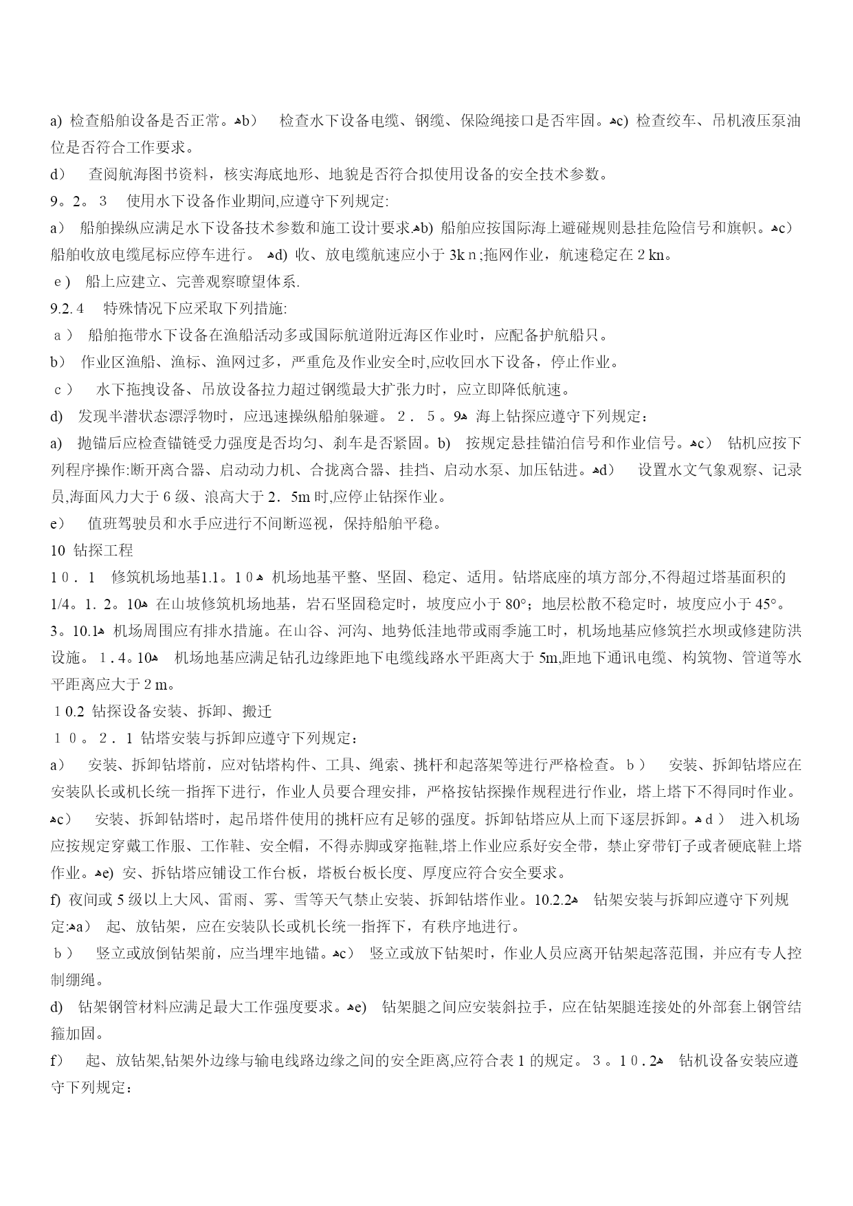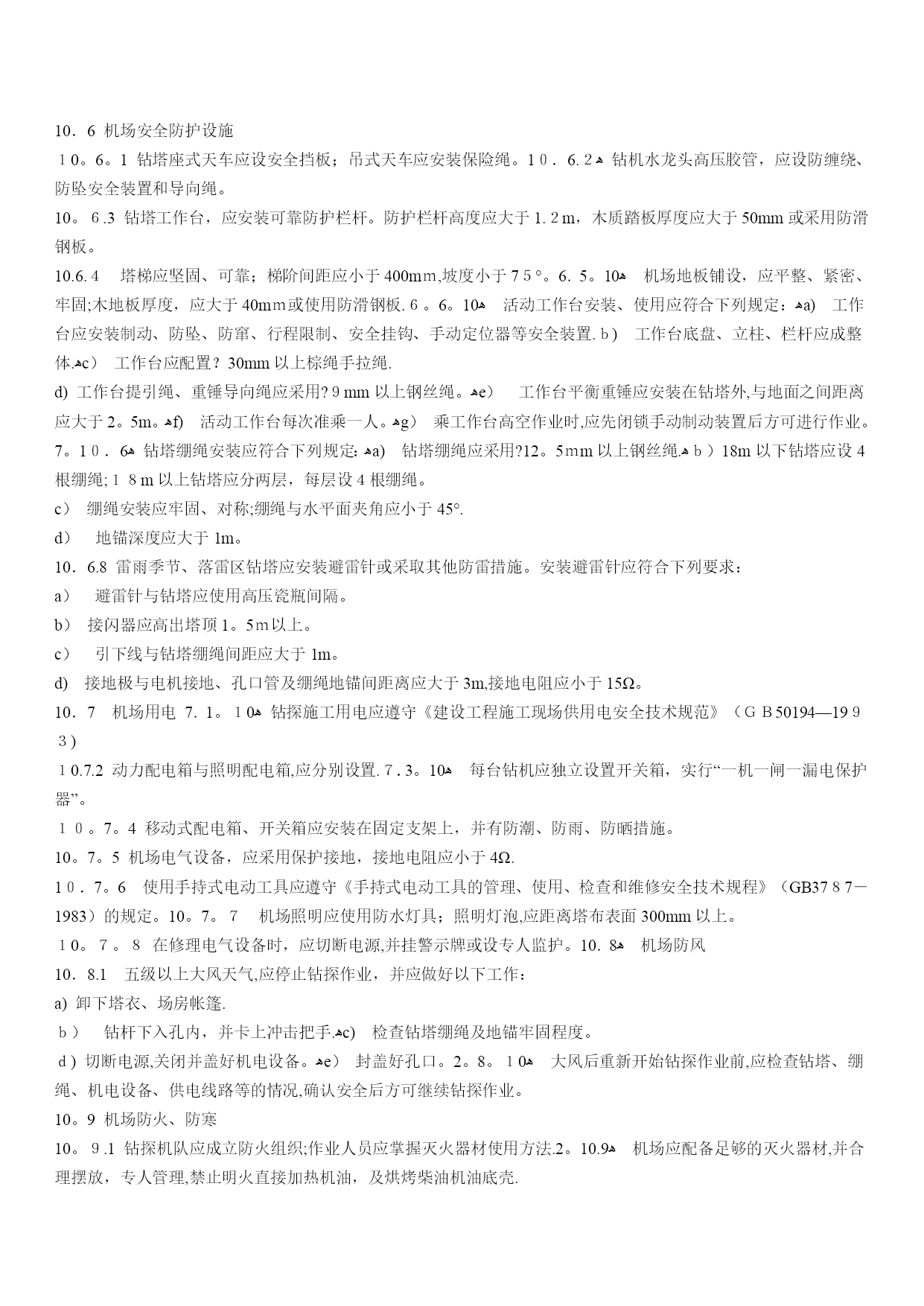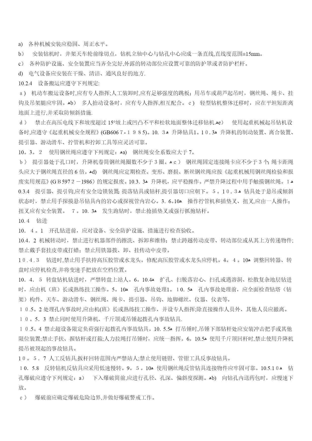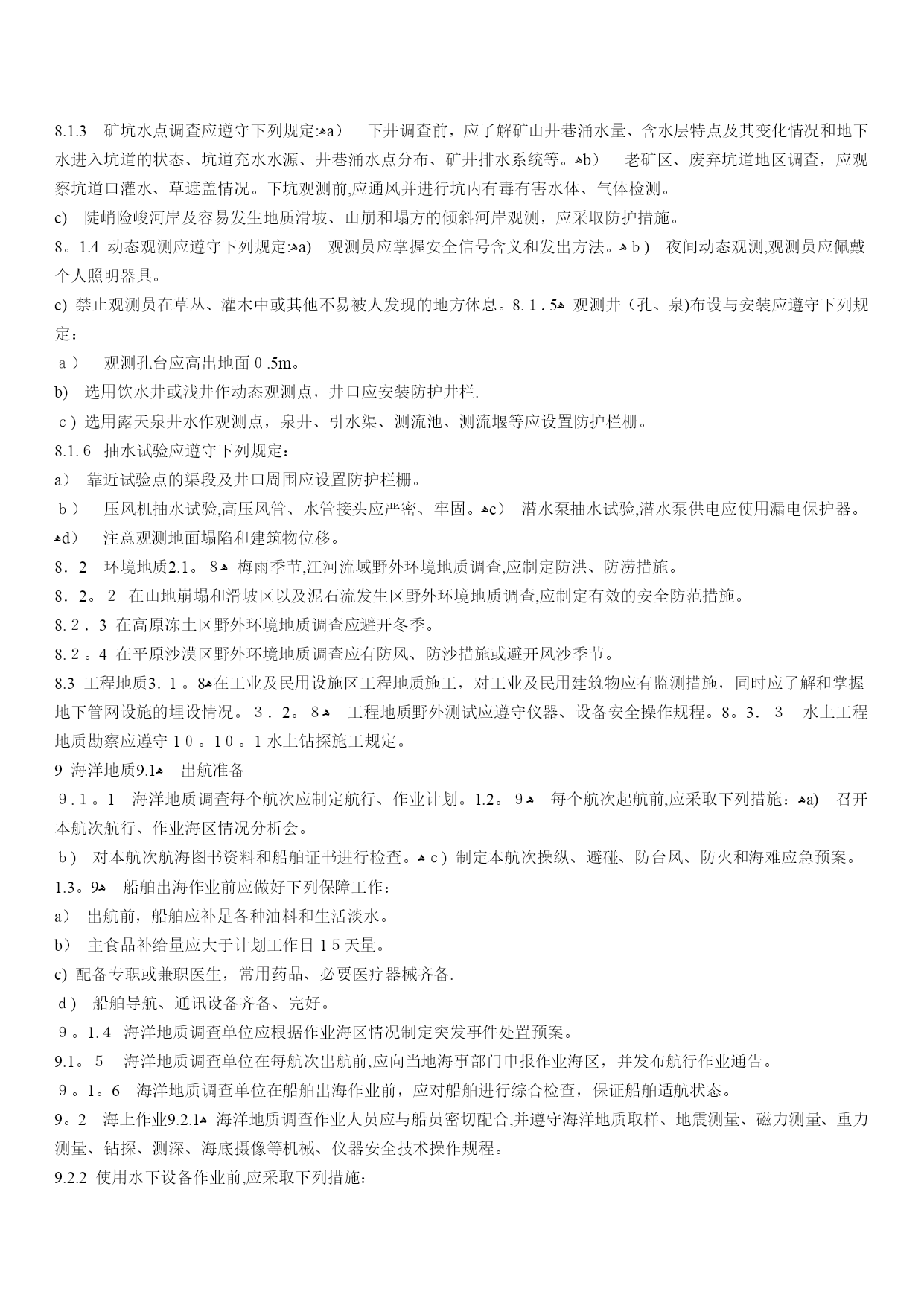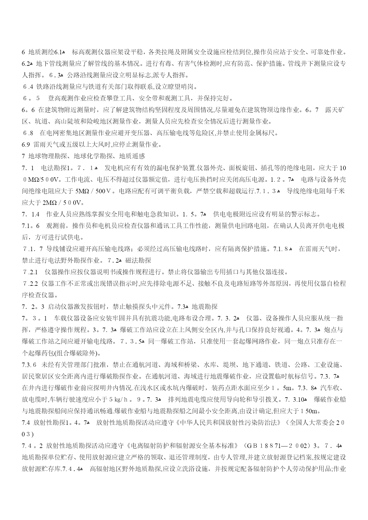 地质勘探安全规程(完整资料)(可以直接使用,可编辑优秀版资料,欢迎下载)地质勘探安全规程1范围本标准规定了地质勘探工作野外作业、地质测绘、地球物理勘探、地球化学勘探、地质遥感、水文地质、环境地质、工程地质、海洋地质和钻探工程、坑探工程、地质实验测试等方面的安全要求以及职业健康要求。本标准适用于在中华人民共和国领域内的地质勘探(石油、天然气地质勘探除外)工作设计、生产和安全评价、管理。ﻫ本标准不适用于使用地质勘探技术手段和方法从事其延伸业的工作设计、生产和安全评价、管理。2规范性引用文件ﻫ下列文件中的条款通过本标准的引用而成为本标准的条款。引用文件最新版本,以及引用文件其随后所有的修改单(包括勘误的内容)或修订版均适用于本标准。中华人民共和国放射性污染防治法(全国人大常委会2003)ﻫ中华人民共和国民用航空法(全国人大常委会1995)ﻫ危险化学品安全管理条例(国务院令第344号2002)ﻫGB6722-2003爆破安全规程GB18871-2002电离辐射防护和辐射源安全基本标准ﻫMH/T1010—2000航空物探飞行技术规范ﻫGB6067—1985起重机械安全规程GB5972-1986起重机械用钢丝绳检验和报废实用规范ﻫGB50194-1993建设工程施工现场供用电安全技术规范GB3787—1983手持式电动工具的管理、使用、检查和维修安全技术规程GB16424-1996金属非金属地下矿山安全规程3术语和定义下列术语和定义适用于本标准3。1地质勘探explorationﻫ是指对一定地区内的岩石、地层、构造、矿产、地下水、地质灾害、地貌等地质情况进行勘察、调查研究的活动.包括地质测绘、地球物理勘探、地球化学勘探、地质遥感、水文地质、环境地质、工程地质、海洋地质和钻探工程、坑探工程、地质实验测试等。3.2艰险地区areaswithhardshipsanddangersﻫ是指海拔3000m以上或者其他无人居住,自然条件恶劣、生存条件差的地质工作区。3。3野外作业opencountryworkﻫ是指在非城镇地区户外进行的地质勘探活动。4总则4。1地质勘探单位应贯彻“安全第一、预防为主”的安全生产方针,实行安全生产目标管理,逐步推广安全质量标准化管理.ﻫ4.2地质勘探单位应按照国家相关法律、法规、标准的要求,建立、健全以下安全生产规章制度:a)主要负责人、分管负责人、安全生产管理人员、职能部门、岗位等安全生产责任制;ﻫb)安全生产检查制度;ﻫc)安全教育培训制度;ﻫd)生产安全事故管理制度;e)重大危险源监控和重大隐患整改制度;f)劳动防护用品配备使用制度;ﻫg)安全生产奖惩制度;ﻫh)作业安全规程和各工种操作规程。ﻫ4。3地质勘探单位应根据法律、法规规定,建立、健全安全生产管理机构,配备相应安全生产管理人员.地质勘探项目组(车间、分队,下同)应设置专职或者兼职安全员,安全员应经过安全培训,并考核合格。ﻫ4.4地质勘探单位应建立安全生产技术措施经费提取、使用制度。根据国家有关法律、法规规定,保证安全生产资金投入,改善生产作业条件。4.5地质勘探单位主要负责人、分管安全生产工作负责人和安全生产管理人员应经过安全培训并考核合格,具备与本单位所从事地质勘探活动相应的安全生产知识和管理能力。ﻫ地质勘探单位对野外地质勘探从业人员每两年至少进行一次野外生存、野外自救互救技能训练。地质勘探项目组每年野外工作出队前或变换工作地区前应对从业人员进行安全教育;从业人员应熟悉工作地区人文、地理和危险因素,掌握当地野外生存、避险和相关应急技能。ﻫ4.6地质勘探单位应每半年至少进行一次安全生产检查;地质勘探项目组应每月至少进行一次安全生产检查;地质勘探单位、地质勘探项目组日常安全生产检查、专项安全生产检查按规定要求进行。ﻫ4。7地质勘探单位应按规定为从业人员配备个体劳动防护用品、野外救生用品和野外特殊生活用品。ﻫ4.8地质勘探单位应每年为野外地质勘探和地质实验测试从业人员进行身体检查.野外地质勘探从业人员体质应适应野外工作要求。4。9地质勘探项目立项报告应有项目工作地区安全生产条件内容描述;项目设计应有安全生产、职业健康设计,项目设计审查应有安全生产职能部门人员参加;项目实施应有安全防范、防护措施。ﻫ4。10钻探工程、坑探工程、海洋地质、航空遥感地质、艰险地区地质勘探和其他重大地质勘探项目组织实施单位应对项目工作地区安全工作条件,以及项目安全生产、职业健康设计组织安全评审。4。11地质勘探单位应建立安全保障及应急救援预案,并负责组织实施.5野外作业基本规定5。1地质勘探单位应了解和掌握地质勘探工作区安全情况,包括动物、植物、微生物伤害源、流行传染病种、疫情传染源、自然环境、人文地理、交通等状况,并建立档案。ﻫ地质勘探工作区安全信息和预防措施应及时向
