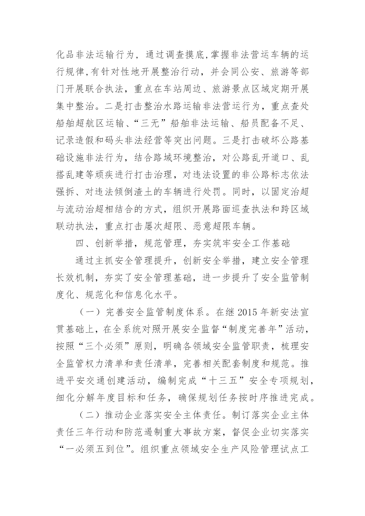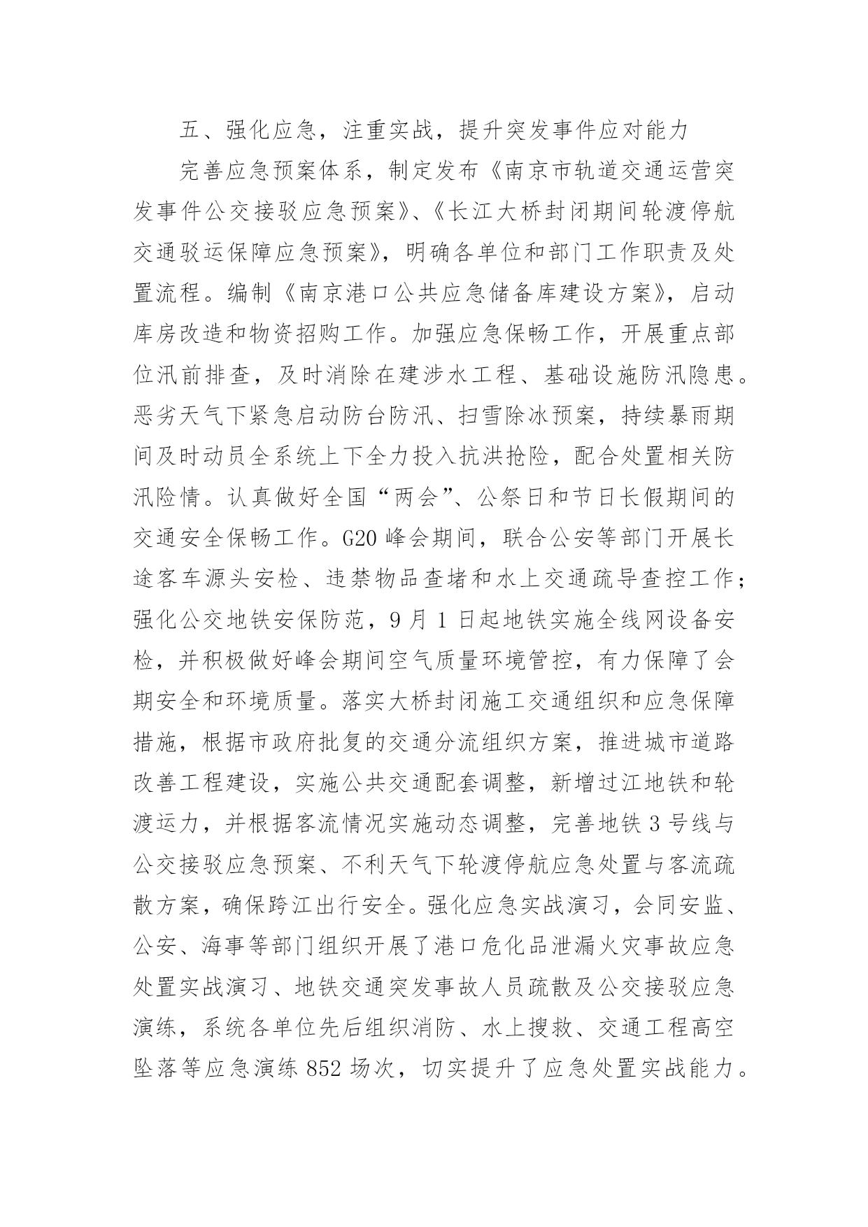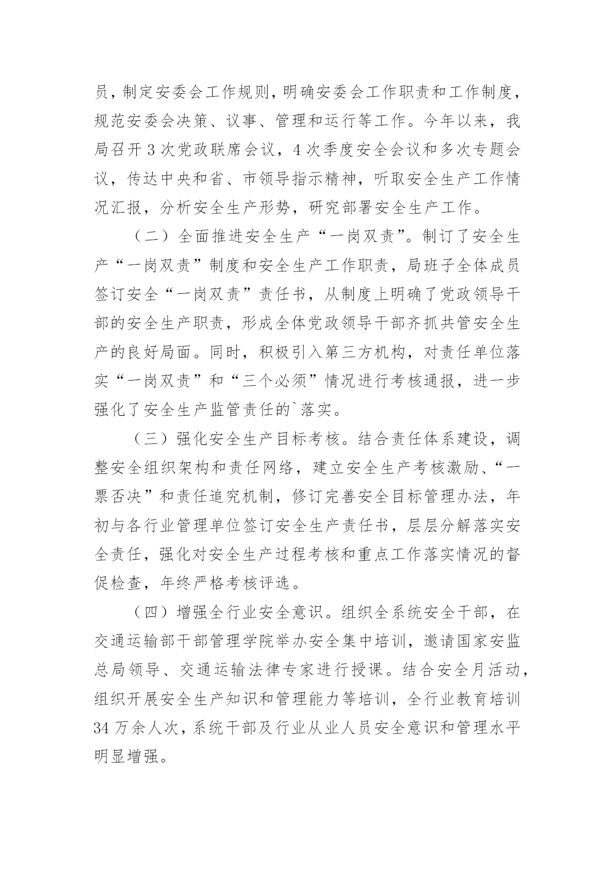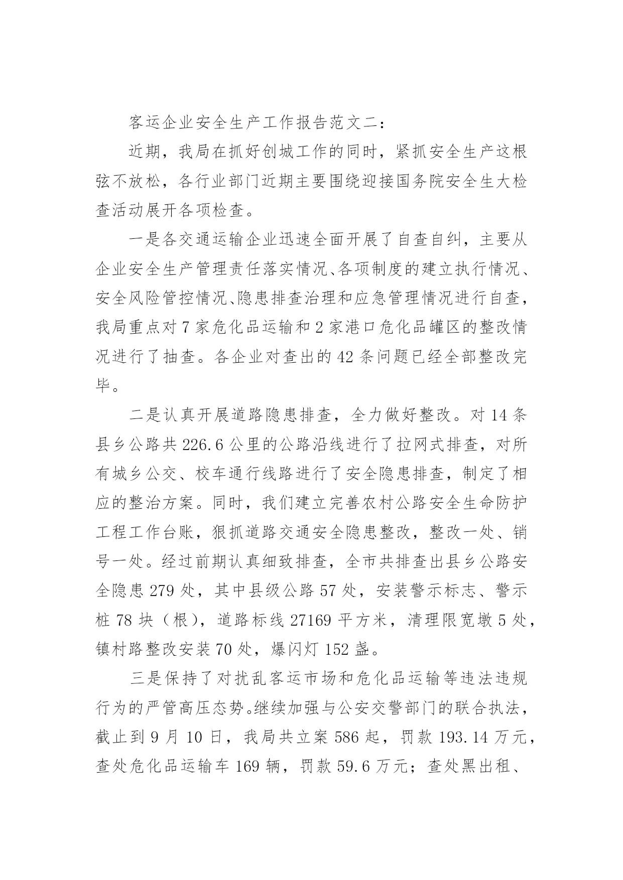 客运企业安全生产工作报告安全生产是国家的一-项长期基本国策,是保护劳动者的安全、健康和国家财产,促进社会生产力发展的基本保证,也是保证社会主义经济发展,进一步实行改依开放的基本条件。下面我们来看看客运企业的安全生产工作报告。客运企业安全生产工作报告范文一:20xx年,在市委、市政府的正确领导和市安委会的关心指导下,我局坚决贯彻落实上级的指示精神和要求,紧紧围绕《安全生产法》贯彻实施和“平安交通”建设目标,以深刻吸取事故教训,防止各类事故发生为重点,严格责任落实,强化隐患治理,开展安全大检查,深化交通运输系统重点领域安全专项治理工作,确保交通运输安全生产形势总体平稳。全年未发生较大及以上等级安全生产事故和安全有责事故,行业内用人单位没有新发职业病类。现将全年安全生产工作开展情况汇报如下:一、强化组织,落实责任,健全安全生产工作机制今年以来,我局牢固树立安全底线思维和红线意识,以建立健全安全监管机制为抓手,强化安全生产责任落实,全面提升安全生产保障能力。(一)加强安全工作组织领导。我局高度重视安全工作,将安全生产列入重要议事日程,与系统中心工作同部署、同研究、同落实。同时,及时调整充实安全生产委员会组成人员,制定安委会工作规则,明确安委会工作职责和工作制度,规范安委会决策、议事、管理和运行等工作。今年以来,我局召开3次党政联席会议,4次季度安全会议和多次专题会议,传达中央和省、市领导指示精神,听取安全生产工作情况汇报,分析安全生产形势,研究部署安全生产工作。(二)全面推进安全生产“一岗双责”。制订了安全生产“一岗双责”制度和安全生产工作职责,局班子全体成员签订安全“一岗双责”责任书,从制度上明确了党政领导干部的安全生产职责,形成全体党政领导干部齐抓共管安全生产的良好局面。同时,积极引入第三方机构,对责任单位落实“一岗双责”和“三个必须”情况进行考核通报,进一步强化了安全生产监管责任的`落实。(三)强化安全生产目标考核。结合责任体系建设,调整安全组织架构和责任网络,建立安全生产考核激励、“一票否决”和责任追究机制,修订完善安全目标管理办法,年初与各行业管理单位签订安全生产责任书,层层分解落实安全责任,强化对安全生产过程考核和重点工作落实情况的督促检查,年终严格考核评选。(四)增强全行业安全意识。组织全系统安全干部,在交通运输部干部管理学院举办安全集中培训,邀请国家安监总局领导、交通运输法律专家进行授课。结合安全月活动,组织开展安全生产知识和管理能力等培训,全行业教育培训34万余人次,系统干部及行业从业人员安全意识和管理水平明显增强。二、突出重点,深入检查,扎实推进安全专项治理全面贯彻落实各级关于加强安全工作和开展安全检查整治工作部署,将安全专项治理与安全大检查、隐患排查治理相结合,坚持以问题为导向,重点组织企业自查、专家检查、行业督查,认真排查整改事故隐患,整治各类安全问题。道路运输方面,严把行业“三关一督”源头监管和车辆动态监控,启动道路运输车辆第三方安全动态监测,实现重点营运车辆全程动态监控。积极组织《道路运输车辆技术管理规定》等宣贯工作,组织客车驾驶员开展“五不两确保”宣誓活动。健全平安志愿服务网络,成立道路运输平志愿者工作站,维护道路交通平安环境。对整改不落实的,一律约谈企业负责人,并计入企业档案,安排专人跟踪督办整改。城市公共交通方面,健全城市公共领域安全监管体系,调整和充实客管处内设机构,增设安全科,增强基层安全监管力量。完善城市公交运营考核体系,加大安全考核的权重,突出对安全生产质量考核管理。组织开展企业排查、行业抽查,定期通报公交安全行车、机务维护等检查情况。会同交管部门深入公交企业基层车队开展联合督查,重点检查安全管理制度执行情况和事故处理“四不放过”原则的落实情况,推动一线落实安全责任。水上交通方面,组织开展内河渡运、水上风景区、危化品运输、水上水下活动安全整治和检查,突出平安船舶创建,强化船舶安全检查、现场监督和检验质量监督,结合营运检验,对船舶重大改装情况开展“回头看”,督促整改不符合法规、规范项目。加强与周边海事部门在水上救助、巡航管控等方面的联防联控,联合处置了多起非载客船载客、船舶搁浅等事故险情。港口水运方面,结合港口安全管理年活动,强化安全管理制度体系和风险防控、应急救援体系建设,夯实安全生产工作基础。推进安全生产分级管理,按照《石油化工码头企业安全监督检查规范》,将港口危险货物企业划分ABC三级,对重点企业、重点部位实施分级监管。委托第三方安全专业机构,开展港口危险货物作业安全综合性督查活动。公路安保方面,结合“平安公路”创建和公路交通安全设施“回头看”工作,持续推进公路安保工程建设、路域环境整治和公路桥梁隐患排查,完成国道235、省道246等六条180公里国省道公路生命安全防护工程建设。交通工