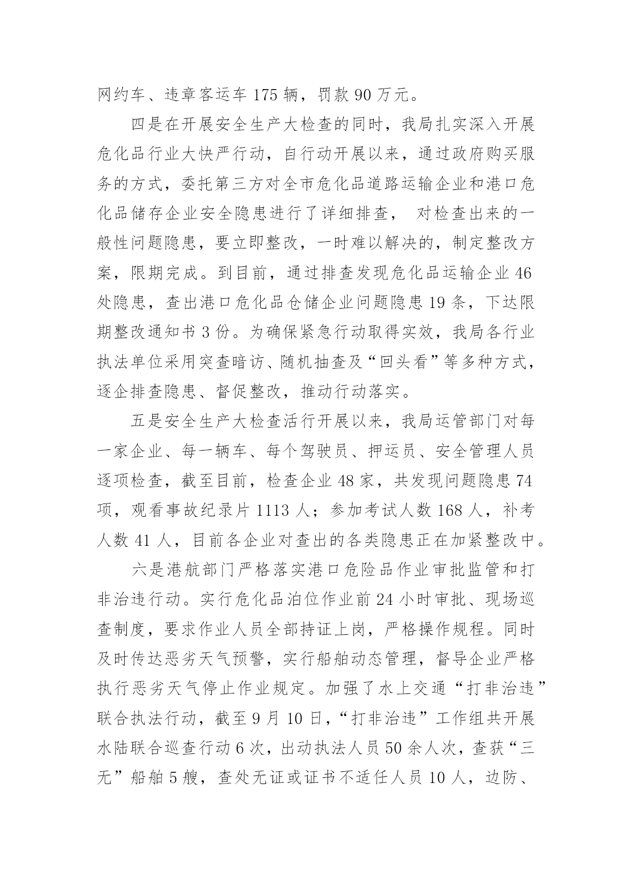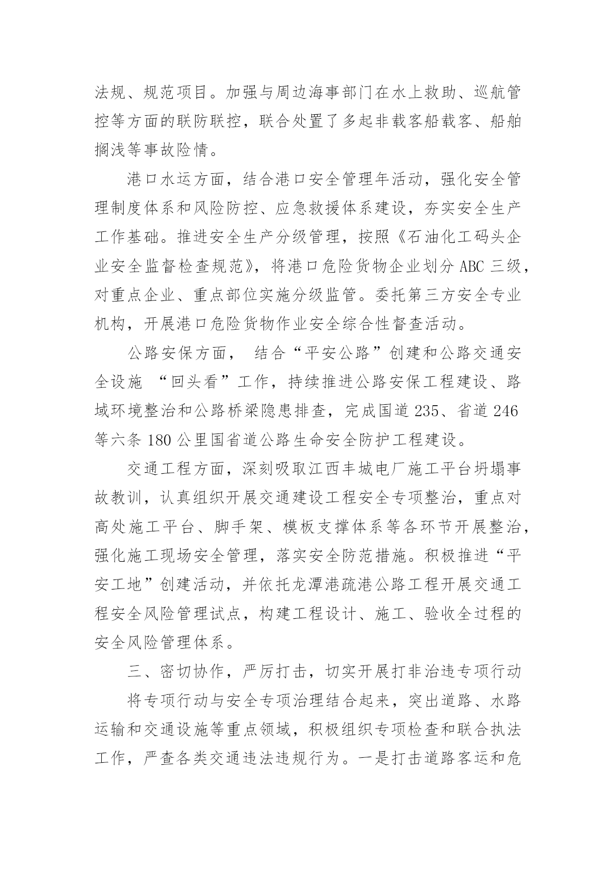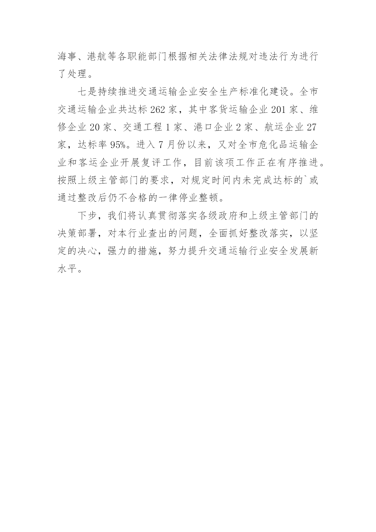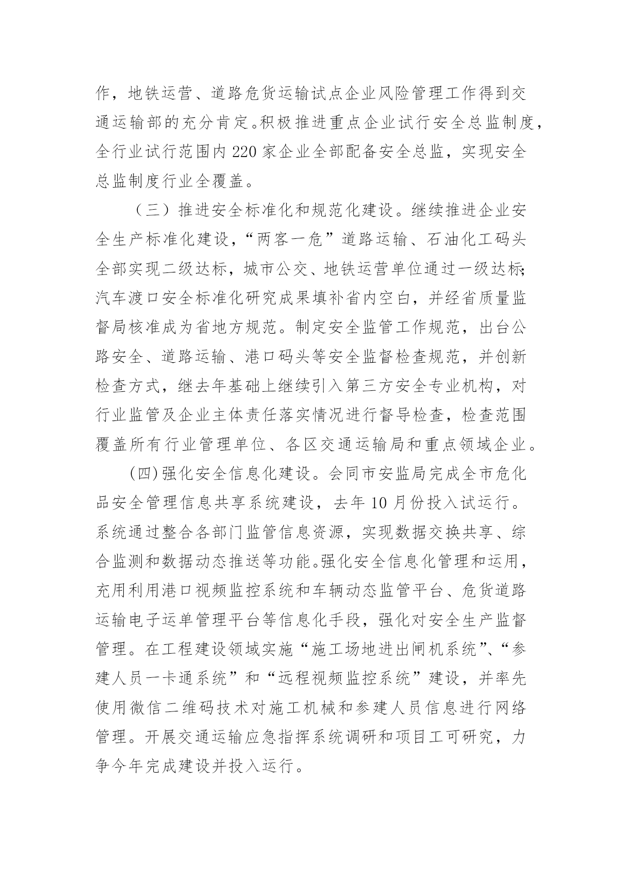 客运企业安全生产工作报告安全生产是国家的一-项长期基本国策,是保护劳动者的安全、健康和国家财产,促进社会生产力发展的基本保证,也是保证社会主义经济发展,进一步实行改依开放的基本条件。下面我们来看看客运企业的安全生产工作报告。客运企业安全生产工作报告范文一:20xx年,在市委、市政府的正确领导和市安委会的关心指导下,我局坚决贯彻落实上级的指示精神和要求,紧紧围绕《安全生产法》贯彻实施和“平安交通”建设目标,以深刻吸取事故教训,防止各类事故发生为重点,严格责任落实,强化隐患治理,开展安全大检查,深化交通运输系统重点领域安全专项治理工作,确保交通运输安全生产形势总体平稳。全年未发生较大及以上等级安全生产事故和安全有责事故,行业内用人单位没有新发职业病类。现将全年安全生产工作开展情况汇报如下:一、强化组织,落实责任,健全安全生产工作机制今年以来,我局牢固树立安全底线思维和红线意识,以建立健全安全监管机制为抓手,强化安全生产责任落实,全面提升安全生产保障能力。(一)加强安全工作组织领导。我局高度重视安全工作,将安全生产列入重要议事日程,与系统中心工作同部署、同研究、同落实。同时,及时调整充实安全生产委员会组成人员,制定安委会工作规则,明确安委会工作职责和工作制度,规范安委会决策、议事、管理和运行等工作。今年以来,我局召开3次党政联席会议,4次季度安全会议和多次专题会议,传达中央和省、市领导指示精神,听取安全生产工作情况汇报,分析安全生产形势,研究部署安全生产工作。(二)全面推进安全生产“一岗双责”。制订了安全生产“一岗双责”制度和安全生产工作职责,局班子全体成员签订安全“一岗双责”责任书,从制度上明确了党政领导干部的安全生产职责,形成全体党政领导干部齐抓共管安全生产的良好局面。同时,积极引入第三方机构,对责任单位落实“一岗双责”和“三个必须”情况进行考核通报,进一步强化了安全生产监管责任的`落实。(三)强化安全生产目标考核。结合责任体系建设,调整安全组织架构和责任网络,建立安全生产考核激励、“一票否决”和责任追究机制,修订完善安全目标管理办法,年初与各行业管理单位签订安全生产责任书,层层分解落实安全责任,强化对安全生产过程考核和重点工作落实情况的督促检查,年终严格考核评选。(四)增强全行业安全意识。组织全系统安全干部,在交通运输部干部管理学院举办安全集中培训,邀请国家安监总局领导、交通运输法律专家进行授课。结合安全月活动,组织开展安全生产知识和管理能力等培训,全行业教育培训34万余人次,系统干部及行业从业人员安全意识和管理水平明显增强。二、突出重点,深入检查,扎实推进安全专项治理全面贯彻落实各级关于加强安全工作和开展安全检查整治工作部署,将安全专项治理与安全大检查、隐患排查治理相结合,坚持以问题为导向,重点组织企业自查、专家检查、行业督查,认真排查整改事故隐患,整治各类安全问题。道路运输方面,严把行业“三关一督”源头监管和车辆动态监控,启动道路运输车辆第三方安全动态监测,实现重点营运车辆全程动态监控。积极组织《道路运输车辆技术管理规定》等宣贯工作,组织客车驾驶员开展“五不两确保”宣誓活动。健全平安志愿服务网络,成立道路运输平志愿者工作站,维护道路交通平安环境。对整改不落实的,一律约谈企业负责人,并计入企业档案,安排专人跟踪督办整改。城市公共交通方面,健全城市公共领域安全监管体系,调整和充实客管处内设机构,增设安全科,增强基层安全监管力量。完善城市公交运营考核体系,加大安全考核的权重,突出对安全生产质量考核管理。组织开展企业排查、行业抽查,定期通报公交安全行车、机务维护等检查情况。会同交管部门深入公交企业基层车队开展联合督查,重点检查安全管理制度执行情况和事故处理“四不放过”原则的落实情况,推动一线落实安全责任。水上交通方面,组织开展内河渡运、水上风景区、危化品运输、水上水下活动安全整治和检查,突出平安船舶创建,强化船舶安全检查、现场监督和检验质量监督,结合营运检验,对船舶重大改装情况开展“回头看”,督促整改不符合法规、规范项目。加强与周边海事部门在水上救助、巡航管控等方面的联防联控,联合处置了多起非载客船载客、船舶搁浅等事故险情。港口水运方面,结合港口安全管理年活动,强化安全管理制度体系和风险防控、应急救援体系建设,夯实安全生产工作基础。推进安全生产分级管理,按照《石油化工码头企业安全监督检查规范》,将港口危险货物企业划分ABC三级,对重点企业、重点部位实施分级监管。委托第三方安全专业机构,开展港口危险货物作业安全综合性督查活动。公路安保方面,结合“平安公路”创建和公路交通安全设施“回头看”工作,持续推进公路安保工程建设、路域环境整治和公路桥梁隐患排查,完成国道235、省道246等六条180公里国省道公路生命安全防护工程建设。交通工