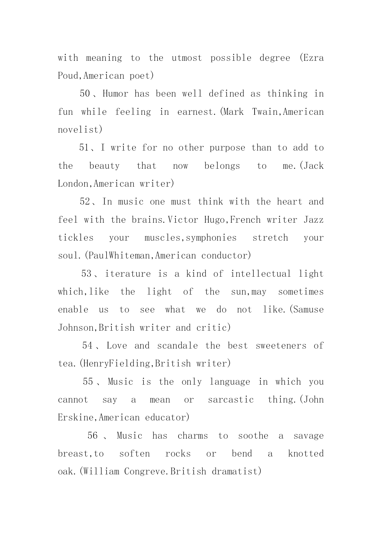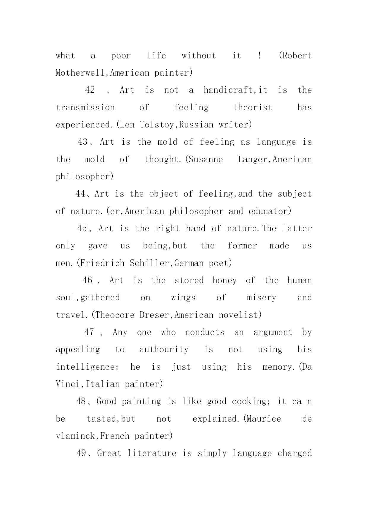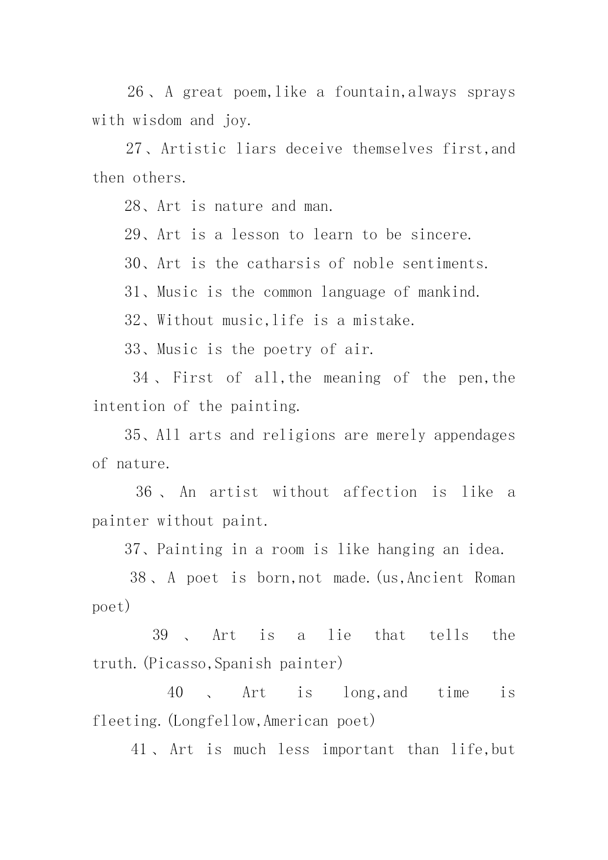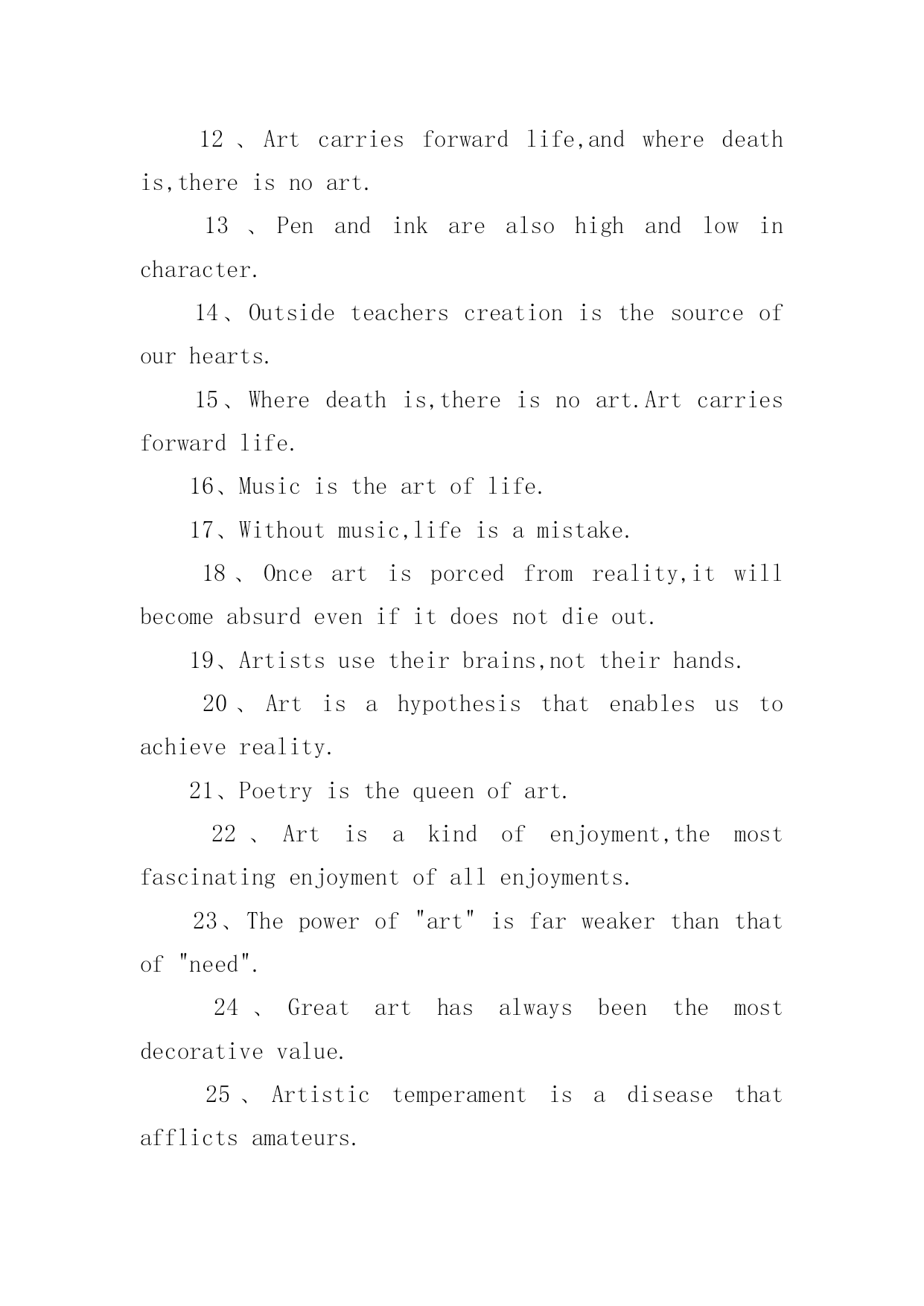 艺术英语名言艺术英语名言180句无论在学习、工作或是生活中,大家都听说过或者使用过一些比较经典的名言吧,熟记名言有助于加深对知识理解类题目的理解。为了帮助大家积累更多名言,以下是小编收集整理的艺术英语名言180句,希望对大家有所帮助。1、Artgivesuswingsandtakesusfaraway.2、Poetryisasoundpicture,andpaintingisasilentpoem.3、Weshouldseekhappinessfromourexercises.4、Theartiststaskistocreatesunshinewhenthereisnosunshine.5、ArtistheTreasuryofvirtue.6、Artishumannature.7、Thefoundationofartliesinmoralpersonality.8、Imnotlooking,Imexploring.9、Artdoesnottranscendnature,butitwillmakenaturemorebeautiful.10、Artmakesnaturemoreperfect.11、Hewhounderstandsmusiccanbefreefromallworldlytroubles.12、Artcarriesforwardlife,andwheredeathis,thereisnoart.13、Penandinkarealsohighandlowincharacter.14、Outsideteacherscreationisthesourceofourhearts.15、Wheredeathis,thereisnoart.Artcarriesforwardlife.16、Musicistheartoflife.17、Withoutmusic,lifeisamistake.18、Onceartisporcedfromreality,itwillbecomeabsurdevenifitdoesnotdieout.19、Artistsusetheirbrains,nottheirhands.20、Artisahypothesisthatenablesustoachievereality.21、Poetryisthequeenofart.22、Artisakindofenjoyment,themostfascinatingenjoymentofallenjoyments.23、Thepowerof"art"isfarweakerthanthatof"need".24、Greatarthasalwaysbeenthemostdecorativevalue.25、Artistictemperamentisadiseasethatafflictsamateurs.26、Agreatpoem,likeafountain,alwayssprayswithwisdomandjoy.27、Artisticliarsdeceivethemselvesfirst,andthenothers.28、Artisnatureandman.29、Artisalessontolearntobesincere.30、Artisthecatharsisofnoblesentiments.31、Musicisthecommonlanguageofmankind.32、Withoutmusic,lifeisamistake.33、Musicisthepoetryofair.34、Firstofall,themeaningofthepen,theintentionofthepainting.35、Allartsandreligionsaremerelyappendagesofnature.36、Anartistwithoutaffectionislikeapainterwithoutpaint.37、Paintinginaroomislikehanginganidea.38、Apoetisborn,notmade.(us,AncientRomanpoet)39、Artisaliethattellsthetruth.(Picasso,Spanishpainter)40、Artislong,andtimeisfleeting.(Longfellow,Americanpoet)41、Artismuchlessimportantthanlife,butwhatapoorlifewithoutit!(RobertMotherwell,Americanpainter)42、Artisnotahandicraft,itisthetransmissionoffeel