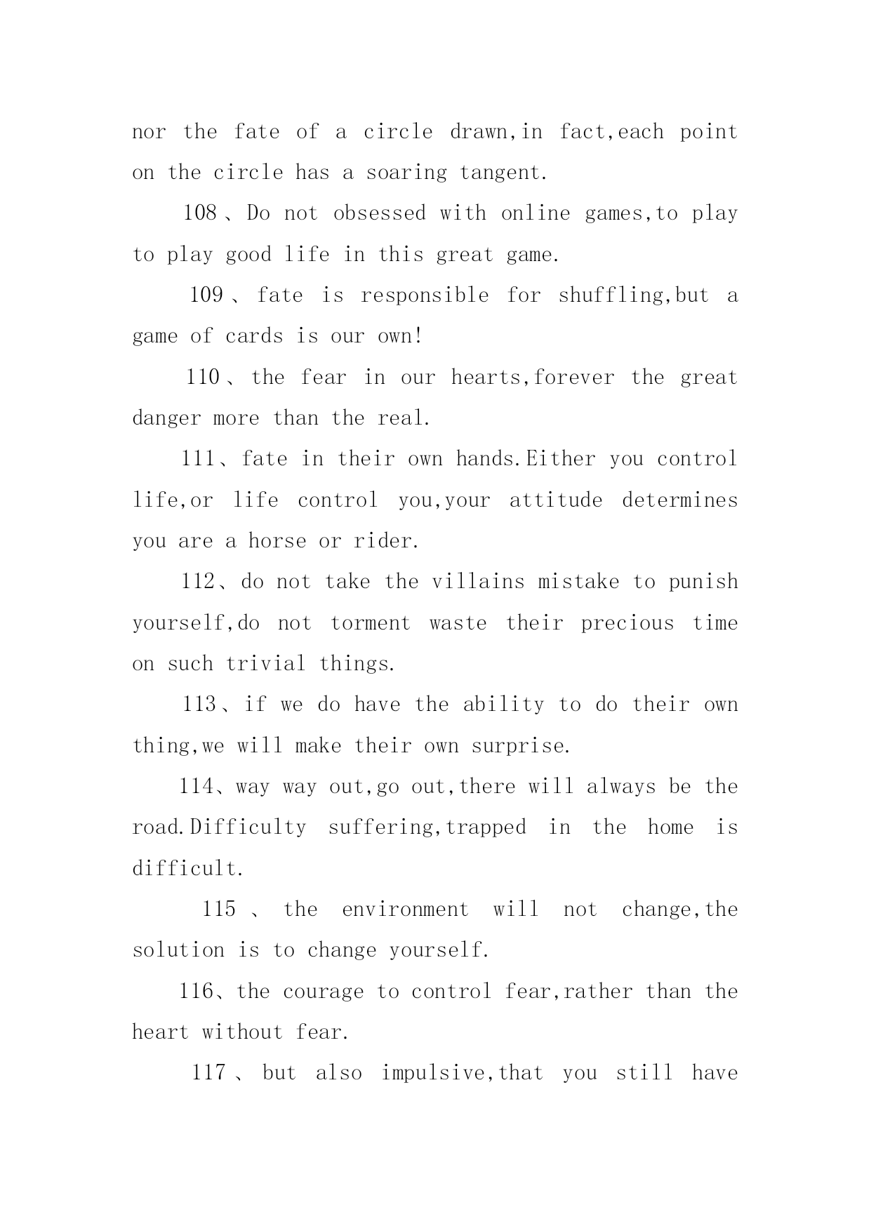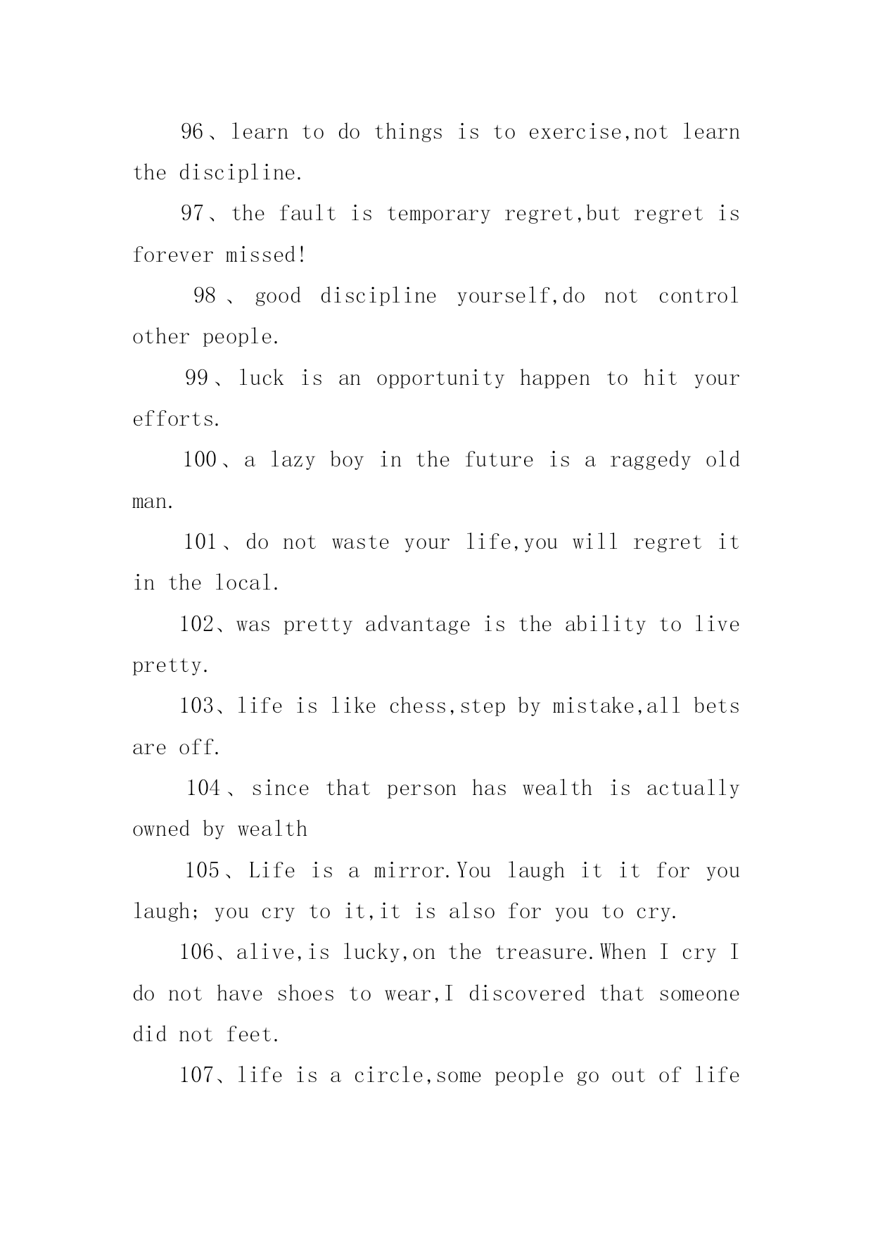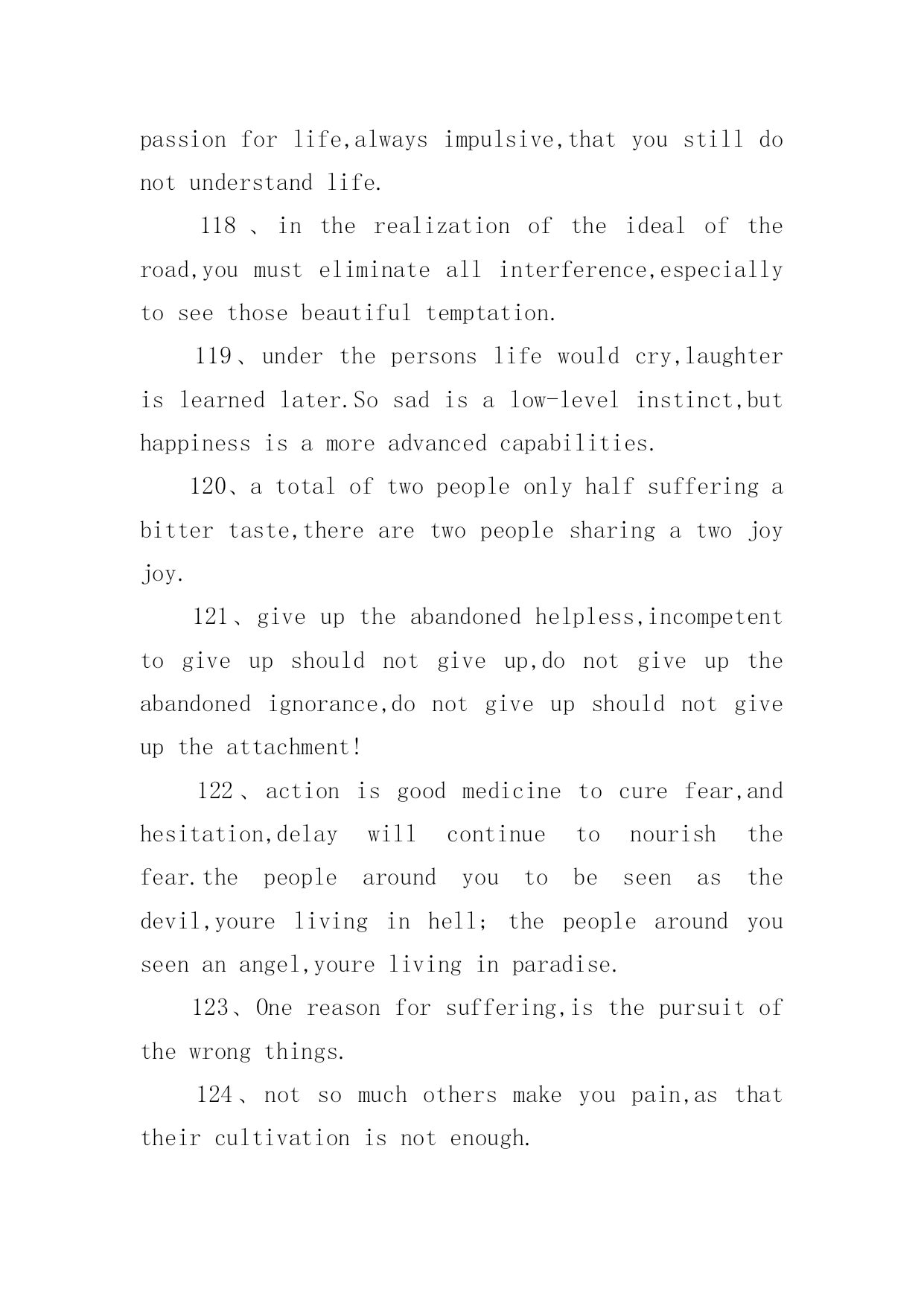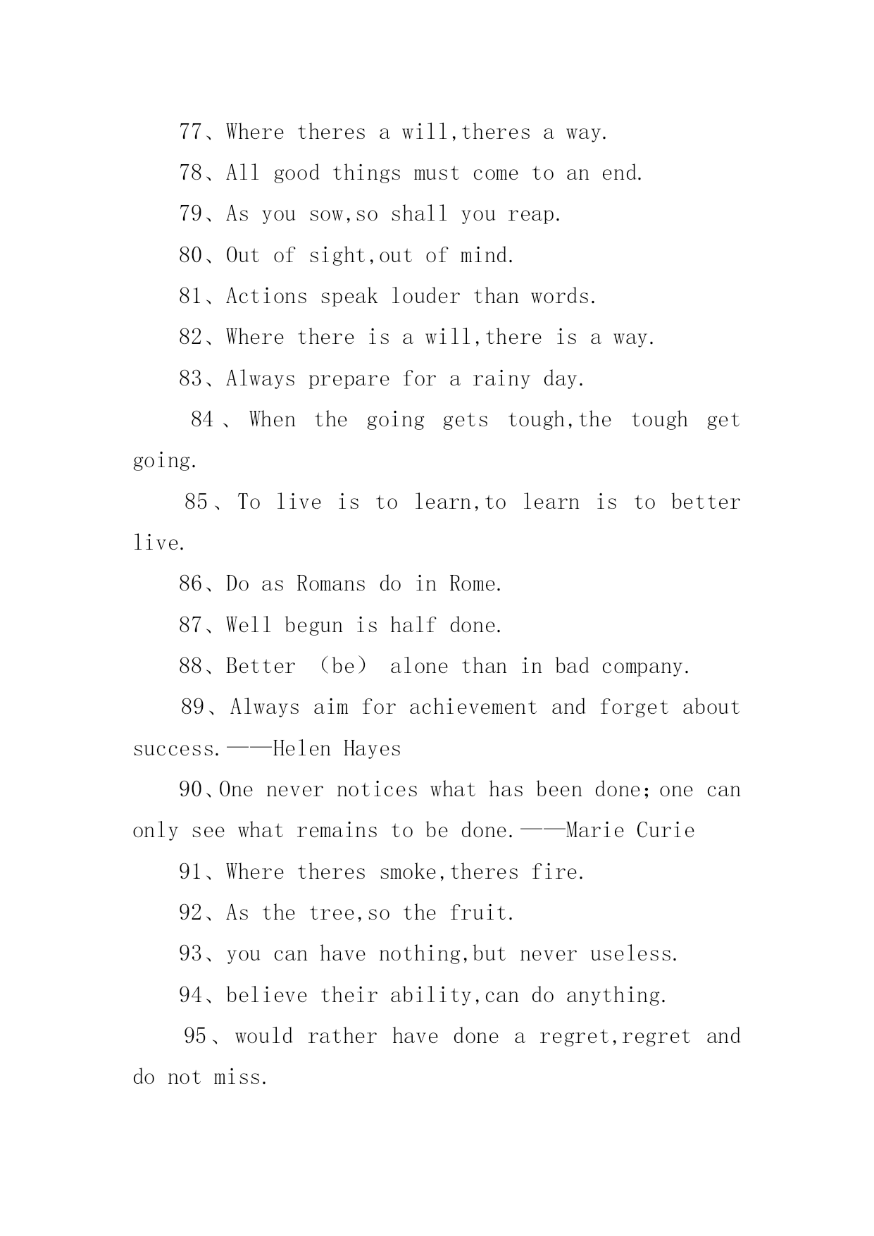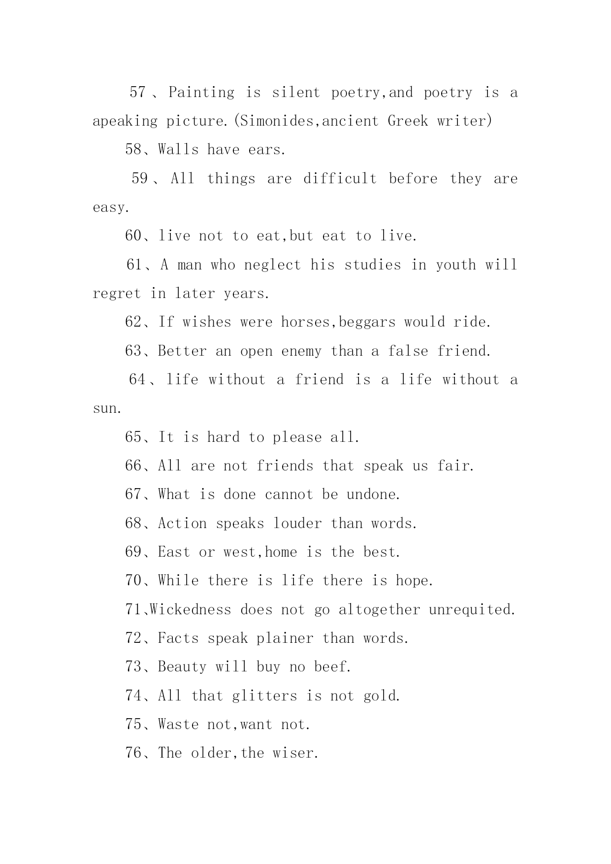 艺术英语名言艺术英语名言180句无论在学习、工作或是生活中,大家都听说过或者使用过一些比较经典的名言吧,熟记名言有助于加深对知识理解类题目的理解。为了帮助大家积累更多名言,以下是小编收集整理的艺术英语名言180句,希望对大家有所帮助。1、Artgivesuswingsandtakesusfaraway.2、Poetryisasoundpicture,andpaintingisasilentpoem.3、Weshouldseekhappinessfromourexercises.4、Theartiststaskistocreatesunshinewhenthereisnosunshine.5、ArtistheTreasuryofvirtue.6、Artishumannature.7、Thefoundationofartliesinmoralpersonality.8、Imnotlooking,Imexploring.9、Artdoesnottranscendnature,butitwillmakenaturemorebeautiful.10、Artmakesnaturemoreperfect.11、Hewhounderstandsmusiccanbefreefromallworldlytroubles.12、Artcarriesforwardlife,andwheredeathis,thereisnoart.13、Penandinkarealsohighandlowincharacter.14、Outsideteacherscreationisthesourceofourhearts.15、Wheredeathis,thereisnoart.Artcarriesforwardlife.16、Musicistheartoflife.17、Withoutmusic,lifeisamistake.18、Onceartisporcedfromreality,itwillbecomeabsurdevenifitdoesnotdieout.19、Artistsusetheirbrains,nottheirhands.20、Artisahypothesisthatenablesustoachievereality.21、Poetryisthequeenofart.22、Artisakindofenjoyment,themostfascinatingenjoymentofallenjoyments.23、Thepowerof"art"isfarweakerthanthatof"need".24、Greatarthasalwaysbeenthemostdecorativevalue.25、Artistictemperamentisadiseasethatafflictsamateurs.26、Agreatpoem,likeafountain,alwayssprayswithwisdomandjoy.27、Artisticliarsdeceivethemselvesfirst,andthenothers.28、Artisnatureandman.29、Artisalessontolearntobesincere.30、Artisthecatharsisofnoblesentiments.31、Musicisthecommonlanguageofmankind.32、Withoutmusic,lifeisamistake.33、Musicisthepoetryofair.34、Firstofall,themeaningofthepen,theintentionofthepainting.35、Allartsandreligionsaremerelyappendagesofnature.36、Anartistwithoutaffectionislikeapainterwithoutpaint.37、Paintinginaroomislikehanginganidea.38、Apoetisborn,notmade.(us,AncientRomanpoet)39、Artisaliethattellsthetruth.(Picasso,Spanishpainter)40、Artislong,andtimeisfleeting.(Longfellow,Americanpoet)41、Artismuchlessimportantthanlife,butwhatapoorlifewithoutit!(RobertMotherwell,Americanpainter)42、Artisnotahandicraft,itisthetransmissionoffeel