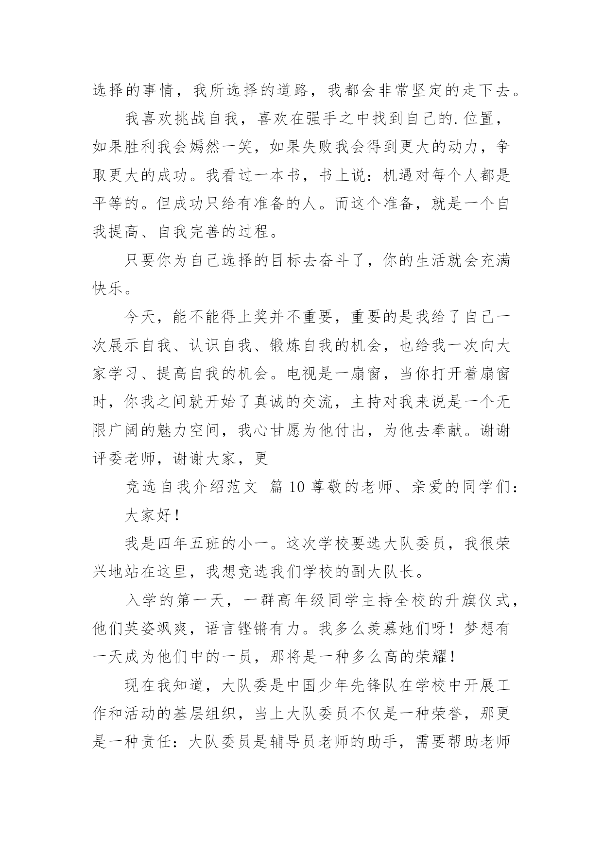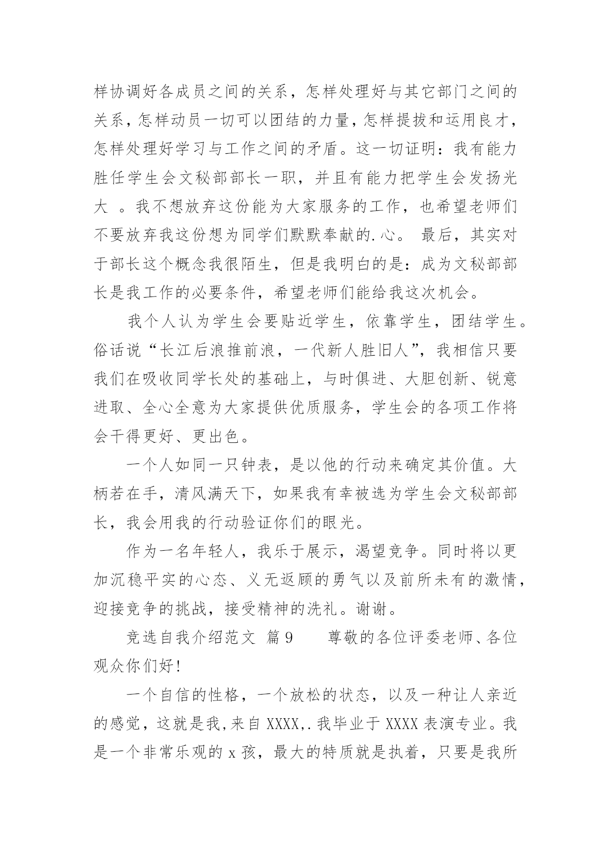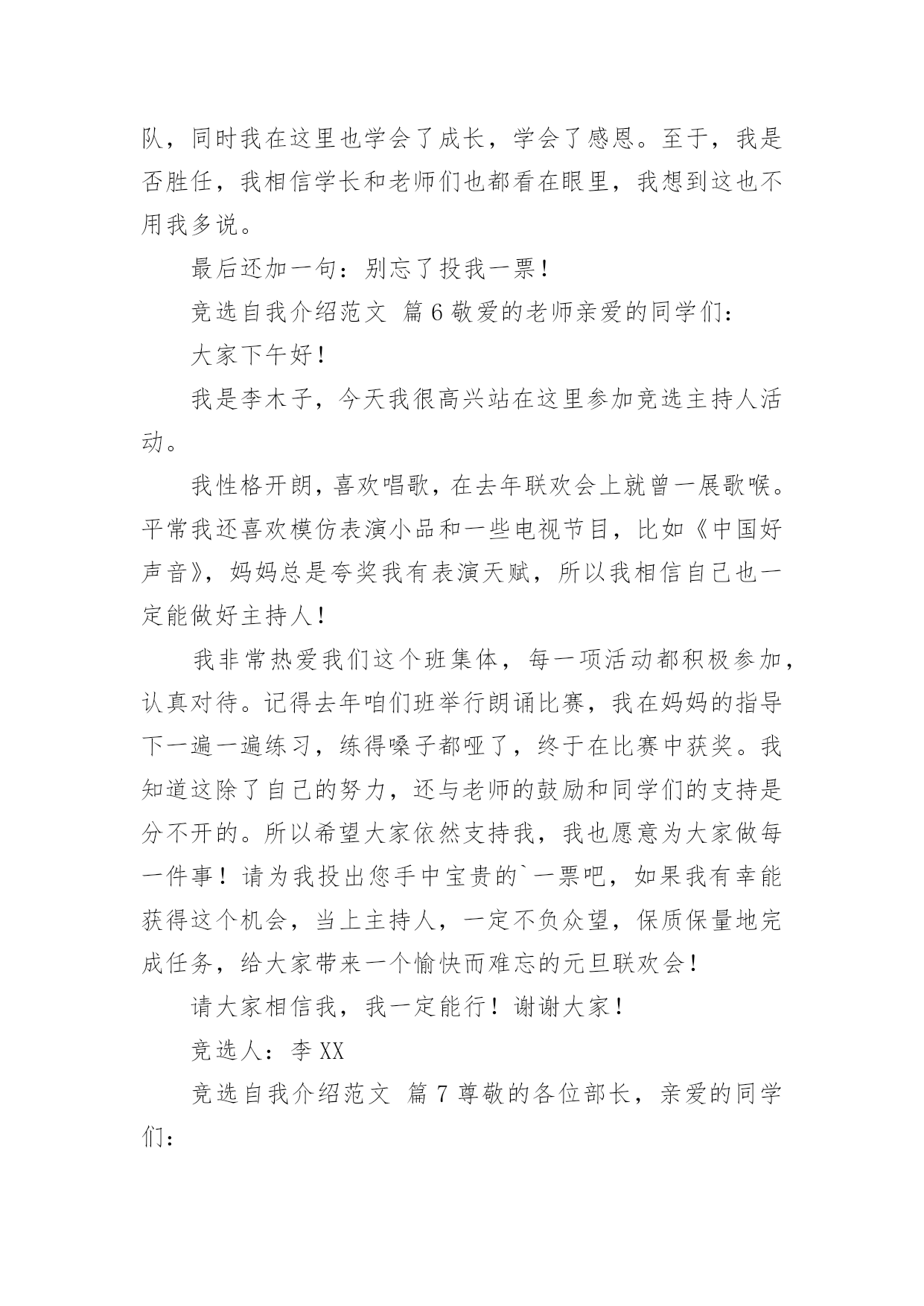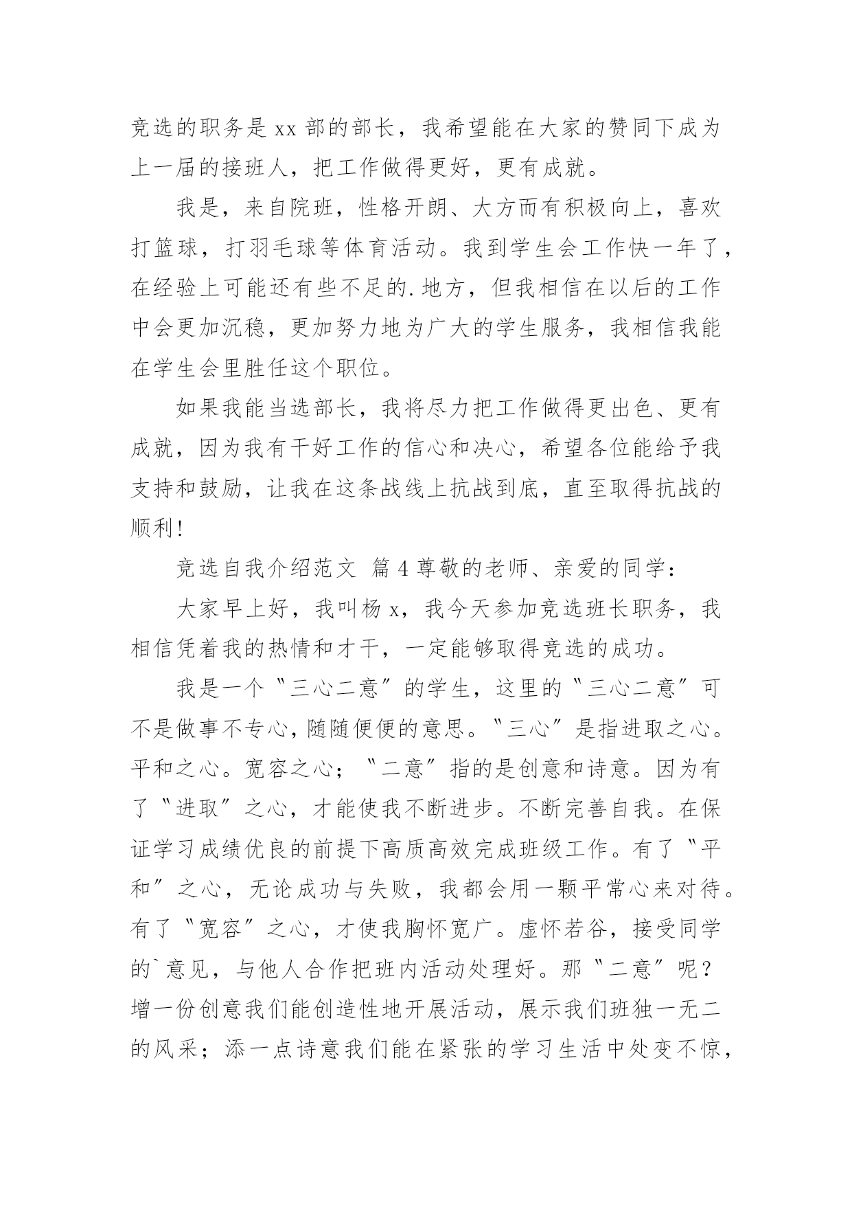 竞选自我介绍竞选自我介绍范文当我们在一个陌生场合中,我们总归要向他人介绍自己,通过自我介绍可以得到他人的认可。如何编写一段个性的自我介绍?下面是小编精心整理的竞选自我介绍范文,仅供参考,欢迎大家阅读。竞选自我介绍范文篇1敬爱的老敬师,亲爱的同学们:大家好!我叫郭泰山,今天来到这儿竞选学校的播音员.其实是源于我小时侯一个的梦想,所以我就想到要在学校当一名播音员,这也算是圆了我的一个梦想吧!我知道播音员并不是想象中那样的简单,不只是简单的播报,还要有自己的思想,更要与他人很好的协作.!后来在这一基础上,我又开始担任学生会委员也负责一些宣传工作.我想,这些经验都将会是我一生的财富.而且它们也能使我在今后的播音员的话筒前更加的得心应手!我是一个活泼开朗的男孩,我喜欢一切美好的东西,写作、唱歌、读书、、、、这些都是我的爱好。计算机更是我的特长,还有就是我有一个银玲般的嗓音,还有流利清晰的口语表达能力。同学们,如果你喜欢我,也喜欢我的声音,那就请投我一票吧!相信我会做的很出色的!高尔基说:只有满怀信心的人,才能在任何地方都满怀着信心,沉浸在学习中、生活中,并实现自己的.意志!我也希望能用我以前的经验和以后在学习过程中新的知识把播音员这一角色做好,充分发挥展示自己的特长,将学校的广播站办得有声有色,将最美的音乐、最棒的演讲、最有价值的新闻、最广博的知识送给亲爱的同学们!我对自己充满信心,请老师和同学们给我一个展示才华的舞台,我会让它变得更加绚丽多姿、精彩无比!谢谢!竞选自我介绍范文篇2我叫XX,来自高一X班,现任班长兼物理科代表。性格开朗,自信心强,有责任感。初中就读于_中学,并担任校_文学社社长,参与并操作出版过三期校刊。在计算机方面有特长,参加校机器人小组,并在该项目上获得省级奖励2次,市级奖励4次。另外,在__年度获得__X奖科技奖三等奖。多才多艺,多次参加校办朗诵、演讲比赛,均有所斩获。在今年的中考中,以_X分的'成绩被_中学录取。当然,上面说的,都已经成为过去,来到_,是我人生一个新的起点。在此,我申请加入_中学学生会,本着为学校服务,为同学服务的信念,同时在工作中锻炼自己,证明自己。请学生会领导予以批准,我的介绍完毕,谢谢大家。竞选自我介绍范文篇3尊敬的各位部长:你们好!我今天很荣幸能站在这里竞选学生会的职务,我今天所竞选的职务是xx部的部长,我希望能在大家的赞同下成为上一届的接班人,把工作做得更好,更有成就。我是,来自院班,性格开朗、大方而有积极向上,喜欢打篮球,打羽毛球等体育活动。我到学生会工作快一年了,在经验上可能还有些不足的.地方,但我相信在以后的工作中会更加沉稳,更加努力地为广大的学生服务,我相信我能在学生会里胜任这个职位。如果我能当选部长,我将尽力把工作做得更出色、更有成就,因为我有干好工作的信心和决心,希望各位能给予我支持和鼓励,让我在这条战线上抗战到底,直至取得抗战的顺利!竞选自我介绍范文篇4尊敬的老师、亲爱的同学:大家早上好,我叫杨x,我今天参加竞选班长职务,我相信凭着我的热情和才干,一定能够取得竞选的成功。我是一个〝三心二意〞的学生,这里的〝三心二意〞可不是做事不专心,随随便便的意思。〝三心〞是指进取之心。平和之心。宽容之心;〝二意〞指的是创意和诗意。因为有了〝进取〞之心,才能使我不断进步。不断完善自我。在保证学习成绩优良的前提下高质高效完成班级工作。有了〝平和〞之心,无论成功与失败,我都会用一颗平常心来对待。有了〝宽容〞之心,才使我胸怀宽广。虚怀若谷,接受同学的`意见,与他人合作把班内活动处理好。那〝二意〞呢?增一份创意我们能创造性地开展活动,展示我们班独一无二的风采;添一点诗意我们能在紧张的学习生活中处变不惊,临乱不慌,从容不迫。对待班内活动,我又将如何做呢?首先,我认为,一个好班级必须要做到合理分工,让最合适的人去做他最擅长的事,从而建立一个合理有序的班集体。其次,我会努力做到将大家团结在一起,互相帮助。征求同学们的意见,增强班队内部的凝聚力和向心力,增加班级工作的透明度。最后,我将力求提高工作效率,使班级各项工作都有效的进行,在最短的时间内做到最好。假如我能当选,我一定要在第一时间制订好工作计划和实施方案,保证班级工作在最短的时间内顺利步入正轨。x许有时候我太活跃了,但是我相信,有了同学们对我的信任,我一定会扬长避短,改掉自己的缺点不断完善自我。竞选自我介绍范文篇5敬爱的老师、亲爱的同学:大家,我叫xxx,来自xx班,竞选的职位是:纪检部部长,个子不高,人不帅,人称短小强悍。首先,我想说,在听了之前各位的演讲后,我真真切切的感受到了21世纪新青年的活力,及奉献的精神,以及可敬的勇气,在即将逝去的大一里,我是一名纪检部干事,在即将来临的大二里,我想做一名纪检部干部,现在与竞选干事时相距快一年的了,但