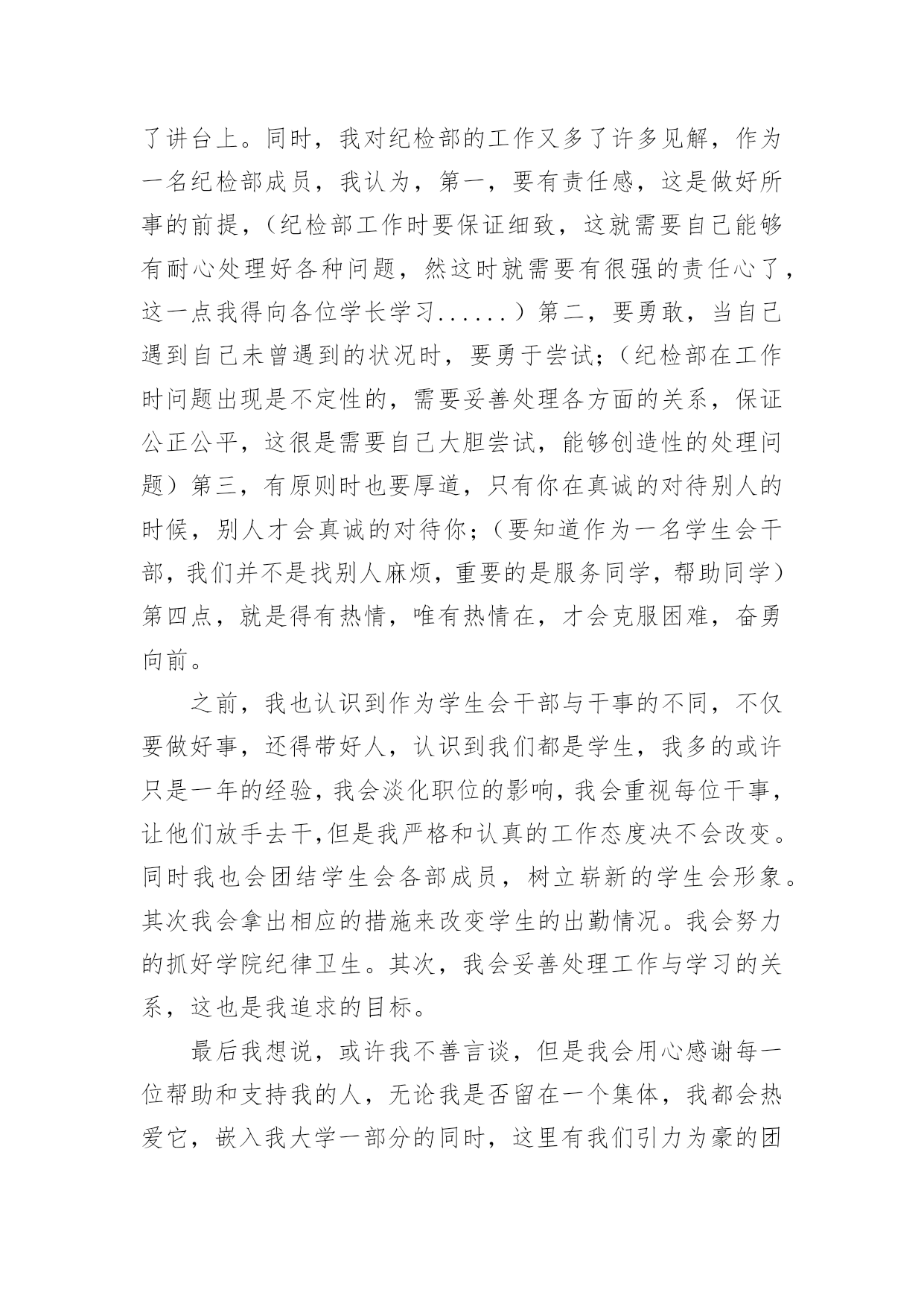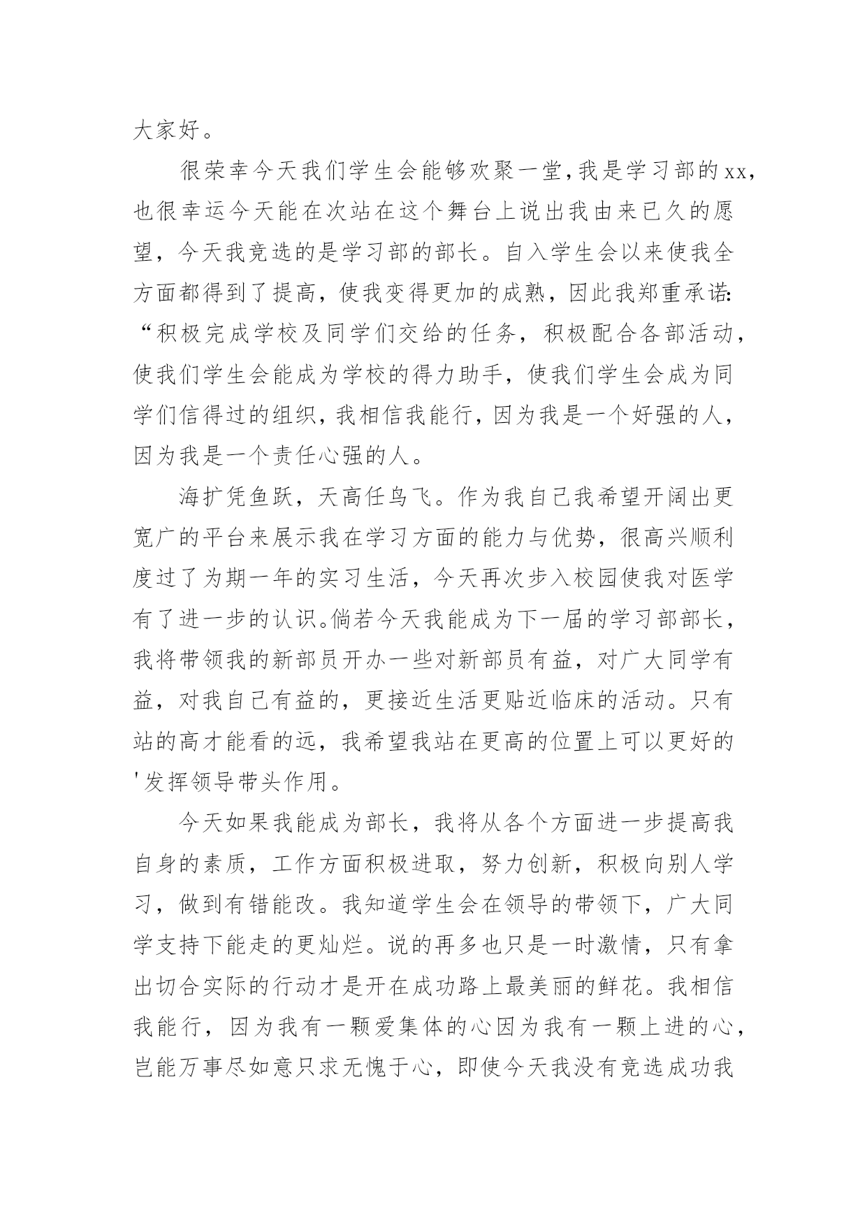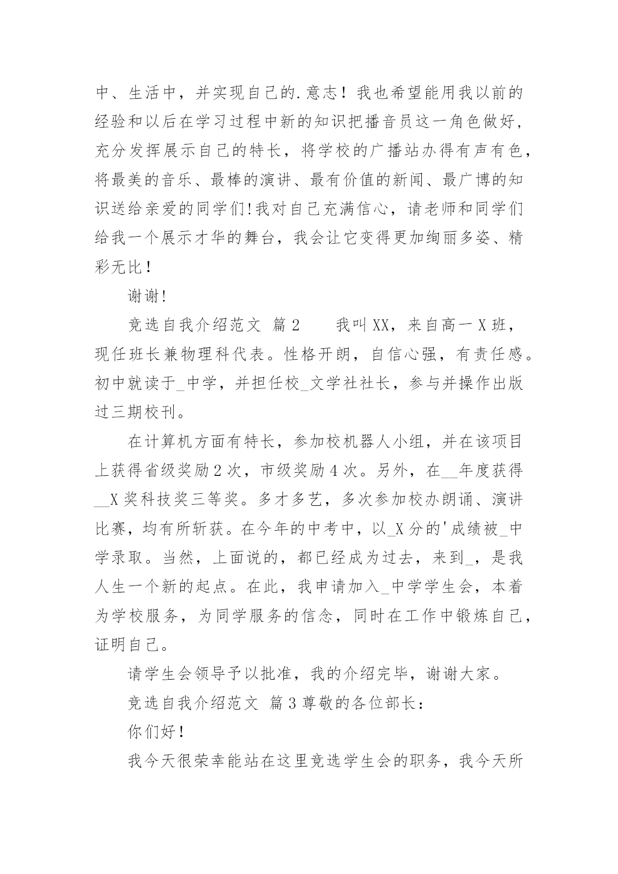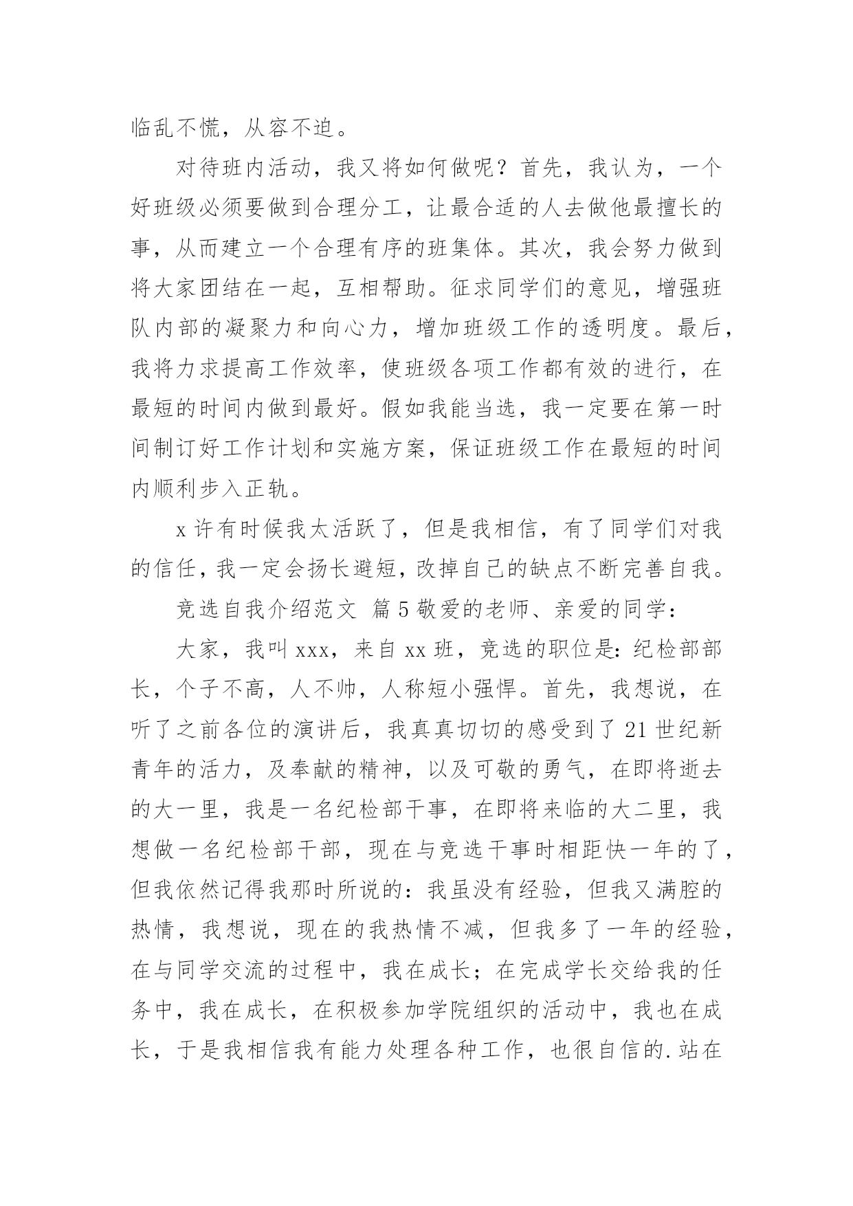 竞选自我介绍竞选自我介绍范文当我们在一个陌生场合中,我们总归要向他人介绍自己,通过自我介绍可以得到他人的认可。如何编写一段个性的自我介绍?下面是小编精心整理的竞选自我介绍范文,仅供参考,欢迎大家阅读。竞选自我介绍范文篇1敬爱的老敬师,亲爱的同学们:大家好!我叫郭泰山,今天来到这儿竞选学校的播音员.其实是源于我小时侯一个的梦想,所以我就想到要在学校当一名播音员,这也算是圆了我的一个梦想吧!我知道播音员并不是想象中那样的简单,不只是简单的播报,还要有自己的思想,更要与他人很好的协作.!后来在这一基础上,我又开始担任学生会委员也负责一些宣传工作.我想,这些经验都将会是我一生的财富.而且它们也能使我在今后的播音员的话筒前更加的得心应手!我是一个活泼开朗的男孩,我喜欢一切美好的东西,写作、唱歌、读书、、、、这些都是我的爱好。计算机更是我的特长,还有就是我有一个银玲般的嗓音,还有流利清晰的口语表达能力。同学们,如果你喜欢我,也喜欢我的声音,那就请投我一票吧!相信我会做的很出色的!高尔基说:只有满怀信心的人,才能在任何地方都满怀着信心,沉浸在学习中、生活中,并实现自己的.意志!我也希望能用我以前的经验和以后在学习过程中新的知识把播音员这一角色做好,充分发挥展示自己的特长,将学校的广播站办得有声有色,将最美的音乐、最棒的演讲、最有价值的新闻、最广博的知识送给亲爱的同学们!我对自己充满信心,请老师和同学们给我一个展示才华的舞台,我会让它变得更加绚丽多姿、精彩无比!谢谢!竞选自我介绍范文篇2我叫XX,来自高一X班,现任班长兼物理科代表。性格开朗,自信心强,有责任感。初中就读于_中学,并担任校_文学社社长,参与并操作出版过三期校刊。在计算机方面有特长,参加校机器人小组,并在该项目上获得省级奖励2次,市级奖励4次。另外,在__年度获得__X奖科技奖三等奖。多才多艺,多次参加校办朗诵、演讲比赛,均有所斩获。在今年的中考中,以_X分的'成绩被_中学录取。当然,上面说的,都已经成为过去,来到_,是我人生一个新的起点。在此,我申请加入_中学学生会,本着为学校服务,为同学服务的信念,同时在工作中锻炼自己,证明自己。请学生会领导予以批准,我的介绍完毕,谢谢大家。竞选自我介绍范文篇3尊敬的各位部长:你们好!我今天很荣幸能站在这里竞选学生会的职务,我今天所竞选的职务是xx部的部长,我希望能在大家的赞同下成为上一届的接班人,把工作做得更好,更有成就。我是,来自院班,性格开朗、大方而有积极向上,喜欢打篮球,打羽毛球等体育活动。我到学生会工作快一年了,在经验上可能还有些不足的.地方,但我相信在以后的工作中会更加沉稳,更加努力地为广大的学生服务,我相信我能在学生会里胜任这个职位。如果我能当选部长,我将尽力把工作做得更出色、更有成就,因为我有干好工作的信心和决心,希望各位能给予我支持和鼓励,让我在这条战线上抗战到底,直至取得抗战的顺利!竞选自我介绍范文篇4尊敬的老师、亲爱的同学:大家早上好,我叫杨x,我今天参加竞选班长职务,我相信凭着我的热情和才干,一定能够取得竞选的成功。我是一个〝三心二意〞的学生,这里的〝三心二意〞可不是做事不专心,随随便便的意思。〝三心〞是指进取之心。平和之心。宽容之心;〝二意〞指的是创意和诗意。因为有了〝进取〞之心,才能使我不断进步。不断完善自我。在保证学习成绩优良的前提下高质高效完成班级工作。有了〝平和〞之心,无论成功与失败,我都会用一颗平常心来对待。有了〝宽容〞之心,才使我胸怀宽广。虚怀若谷,接受同学的`意见,与他人合作把班内活动处理好。那〝二意〞呢?增一份创意我们能创造性地开展活动,展示我们班独一无二的风采;添一点诗意我们能在紧张的学习生活中处变不惊,临乱不慌,从容不迫。对待班内活动,我又将如何做呢?首先,我认为,一个好班级必须要做到合理分工,让最合适的人去做他最擅长的事,从而建立一个合理有序的班集体。其次,我会努力做到将大家团结在一起,互相帮助。征求同学们的意见,增强班队内部的凝聚力和向心力,增加班级工作的透明度。最后,我将力求提高工作效率,使班级各项工作都有效的进行,在最短的时间内做到最好。假如我能当选,我一定要在第一时间制订好工作计划和实施方案,保证班级工作在最短的时间内顺利步入正轨。x许有时候我太活跃了,但是我相信,有了同学们对我的信任,我一定会扬长避短,改掉自己的缺点不断完善自我。竞选自我介绍范文篇5敬爱的老师、亲爱的同学:大家,我叫xxx,来自xx班,竞选的职位是:纪检部部长,个子不高,人不帅,人称短小强悍。首先,我想说,在听了之前各位的演讲后,我真真切切的感受到了21世纪新青年的活力,及奉献的精神,以及可敬的勇气,在即将逝去的大一里,我是一名纪检部干事,在即将来临的大二里,我想做一名纪检部干部,现在与竞选干事时相距快一年的了,但