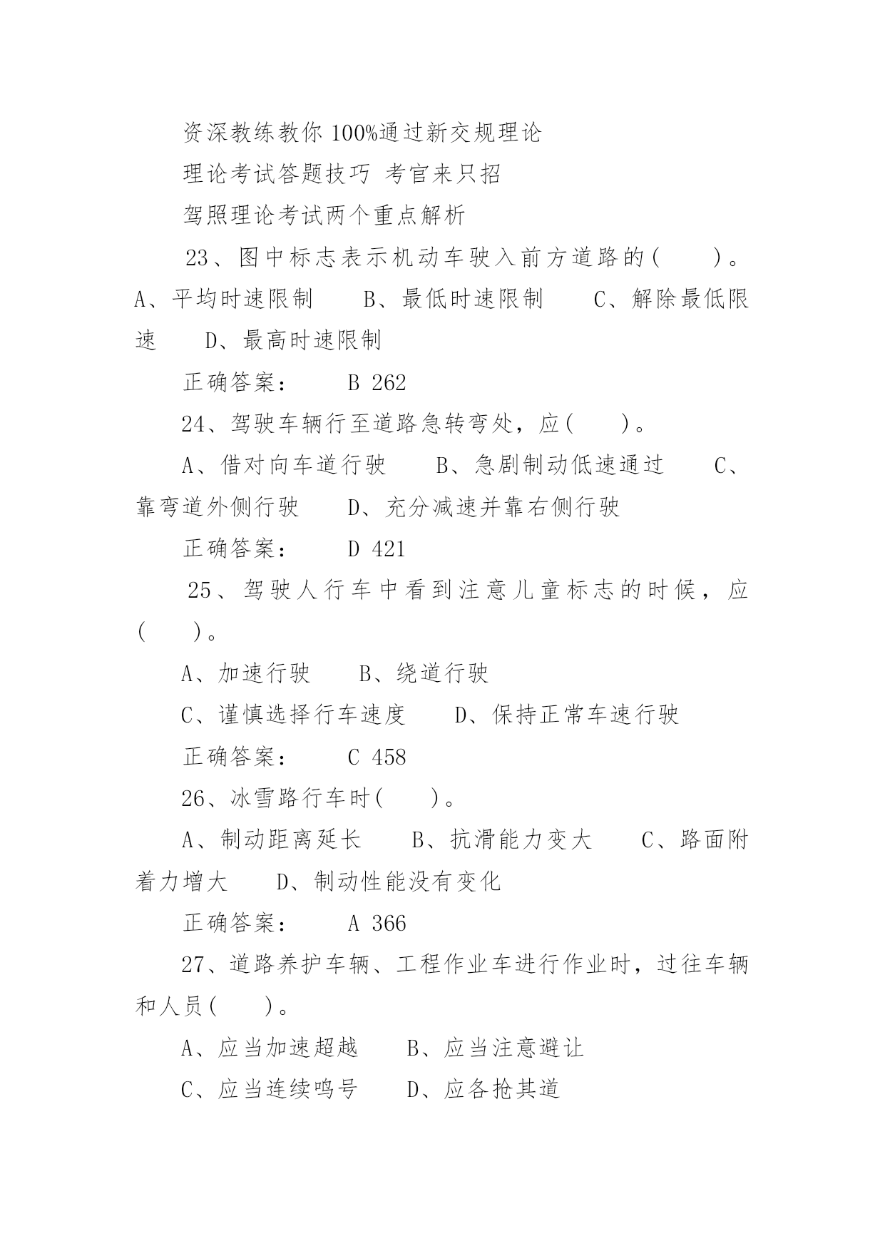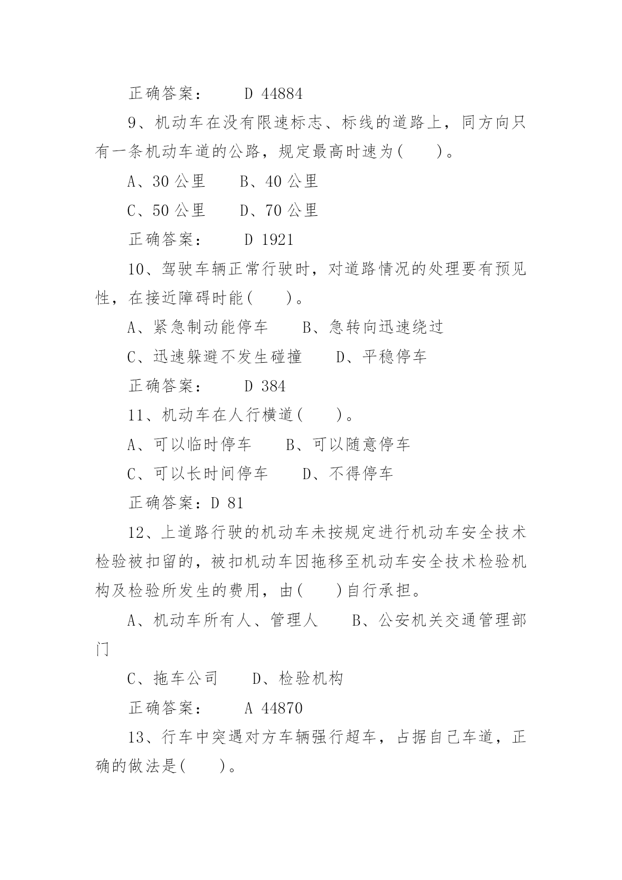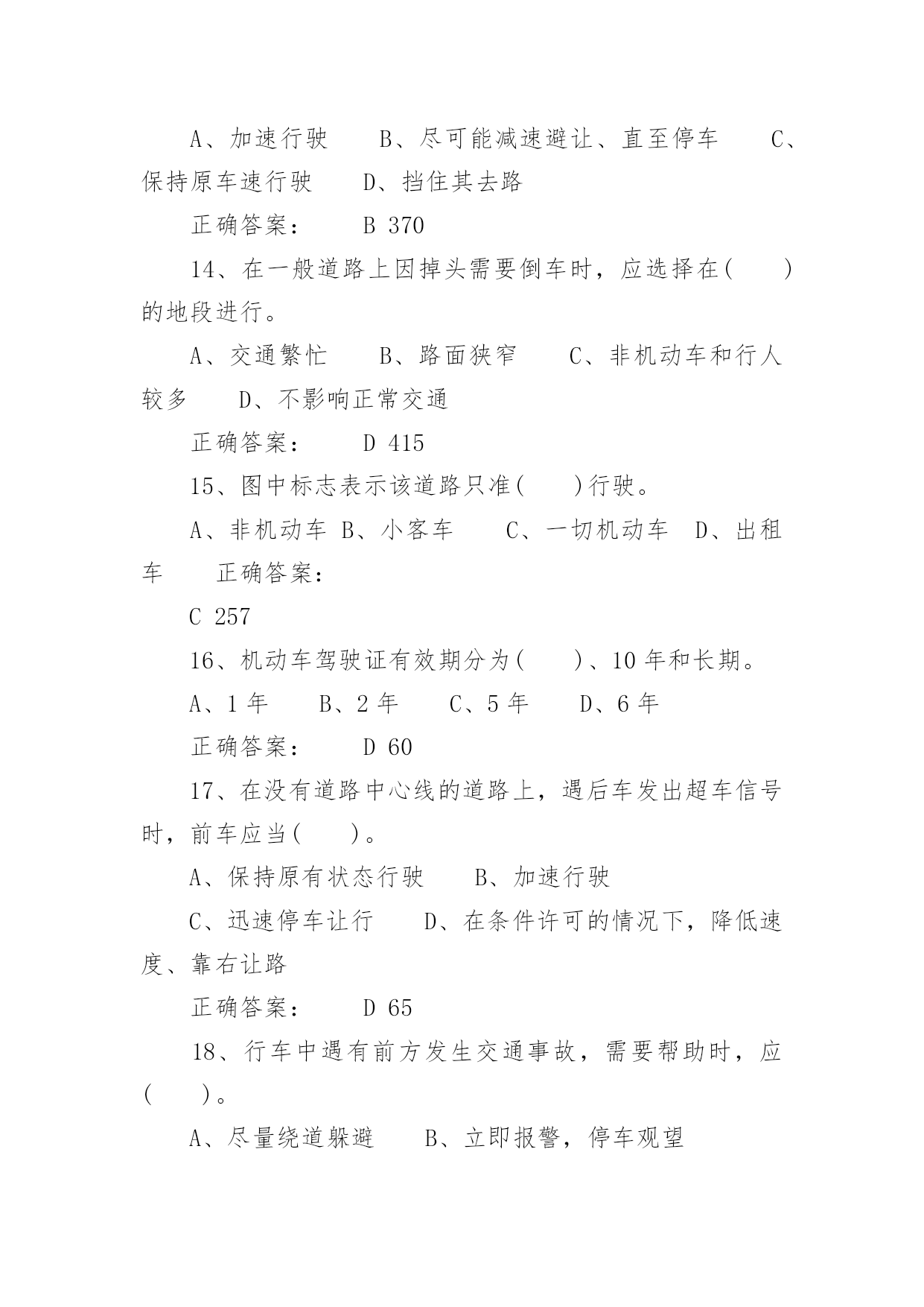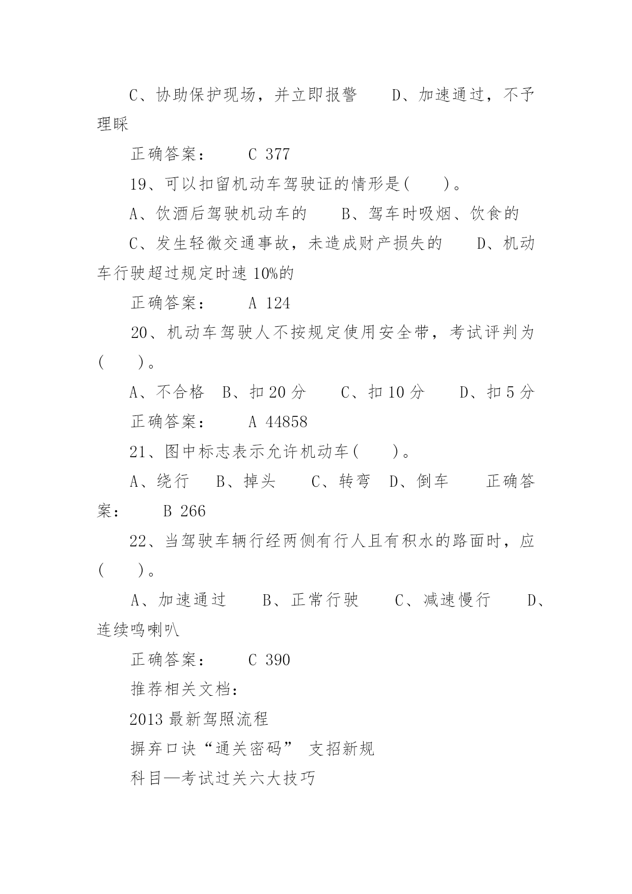驾照考试试题驾照考试试题驾照考试一般指驾驶员考试。驾驶员考试(机动车驾驶员考试)是由公安局车管所举办的资格考试,只有通过驾驶员考试才能取得驾照,才能合法的驾驶机动车辆。下面是小编带来的驾照考试试题,希望对你有帮助。1、图中标志的含义是()。A、左侧绕行B、左右绕行C、右侧绕行D、禁止绕行正确答案:B2322、救火时错误的做法是()。A、站在下风处灭火B、脱去所穿的化纤服装C、注意保护暴露在外面的皮肤D、不要张嘴呼吸或高声呐喊正确答案:A6293、使用已经有裂纹或损伤的轮胎行驶,容易引起()。A、车辆跑偏B、爆胎C、转向失控D、增大行驶阻力正确答案:B6944、已注册登记的机动车达到国家规定的强制报废标准的,机动车所有人应当将车辆在报废期满前()。A、卖给附近废品收购站B、交售给规定的机动车回收企业C、自行处理D、大修后转售正确答案:B575、检查发动机机油时,应把车停在平坦的地方,在发动机()进行。A、熄火后立即B、怠速时C、高转速时D、冷车起动之前或熄火30分钟后正确答案:D6906、会车中遇到对方来车行进有困难需借道时,应()。A、不侵占对方道路,正常行驶B、示意对方停车让行C、靠右侧加速行驶D、尽量礼让对方先行正确答案:D3817、驾驶人连续驾驶机动车超过()的,应当停车休息不得少于20分钟。A、4小时B、6小时C、7小时D、8小时正确答案:A788、机动车在高速公路上行驶时,()在装有安全带的座位就座时,应当使用安全带。A、驾驶人B、乘车人C、副驾驶人D、驾驶人和乘车人正确答案:D448849、机动车在没有限速标志、标线的道路上,同方向只有一条机动车道的公路,规定最高时速为()。A、30公里B、40公里C、50公里D、70公里正确答案:D192110、驾驶车辆正常行驶时,对道路情况的处理要有预见性,在接近障碍时能()。A、紧急制动能停车B、急转向迅速绕过C、迅速躲避不发生碰撞D、平稳停车正确答案:D38411、机动车在人行横道()。A、可以临时停车B、可以随意停车C、可以长时间停车D、不得停车正确答案:D8112、上道路行驶的机动车未按规定进行机动车安全技术检验被扣留的,被扣机动车因拖移至机动车安全技术检验机构及检验所发生的费用,由()自行承担。A、机动车所有人、管理人B、公安机关交通管理部门C、拖车公司D、检验机构正确答案:A4487013、行车中突遇对方车辆强行超车,占据自己车道,正确的做法是()。A、加速行驶B、尽可能减速避让、直至停车C、保持原车速行驶D、挡住其去路正确答案:B37014、在一般道路上因掉头需要倒车时,应选择在()的地段进行。A、交通繁忙B、路面狭窄C、非机动车和行人较多D、不影响正常交通正确答案:D41515、图中标志表示该道路只准()行驶。A、非机动车B、小客车C、一切机动车D、出租车正确答案:C25716、机动车驾驶证有效期分为()、10年和长期。A、1年B、2年C、5年D、6年正确答案:D6017、在没有道路中心线的道路上,遇后车发出超车信号时,前车应当()。A、保持原有状态行驶B、加速行驶C、迅速停车让行D、在条件许可的情况下,降低速度、靠右让路正确答案:D6518、行车中遇有前方发生交通事故,需要帮助时,应()。A、尽量绕道躲避B、立即报警,停车观望C、协助保护现场,并立即报警D、加速通过,不予理睬正确答案:C37719、可以扣留机动车驾驶证的情形是()。A、饮酒后驾驶机动车的B、驾车时吸烟、饮食的C、发生轻微交通事故,未造成财产损失的D、机动车行驶超过规定时速10%的正确答案:A12420、机动车驾驶人不按规定使用安全带,考试评判为()。A、不合格B、扣20分C、扣10分D、扣5分正确答案:A4485821、图中标志表示允许机动车()。A、绕行B、掉头C、转弯D、倒车正确答案:B26622、当驾驶车辆行经两侧有行人且有积水的路面时,应()。A、加速通过B、正常行驶C、减速慢行D、连续鸣喇叭正确答案:C390推荐相关文档:2013最新驾照流程摒弃口诀“通关密码”支招新规科目—考试过关六大技巧资深教练教你100%通过新交规理论理论考试答题技巧考官来只招驾照理论考试两个重点解析23、图中标志表示机动车驶入前方道路的()。A、平均时速限制B、最低时速限制C、解除最低限速D、最高时速限制正确答案:B26224、驾驶车辆行至道路急转弯处,应()。A、借对向车道行驶B、急剧制动低速通过C、靠弯道外侧行驶D、充分减速并靠右侧行驶正确答案:D42125、驾驶人行车中看到注意儿童标志的时候,应()。A、加速行驶B、绕道行驶C、谨慎选择行车速度D、保持正常车速行驶正确答案:C45826、冰雪路行车时()。A、制动距离延长B、抗滑能力变大C、路面附着力增大D、制动性能没有变化正确答案:A36627、道