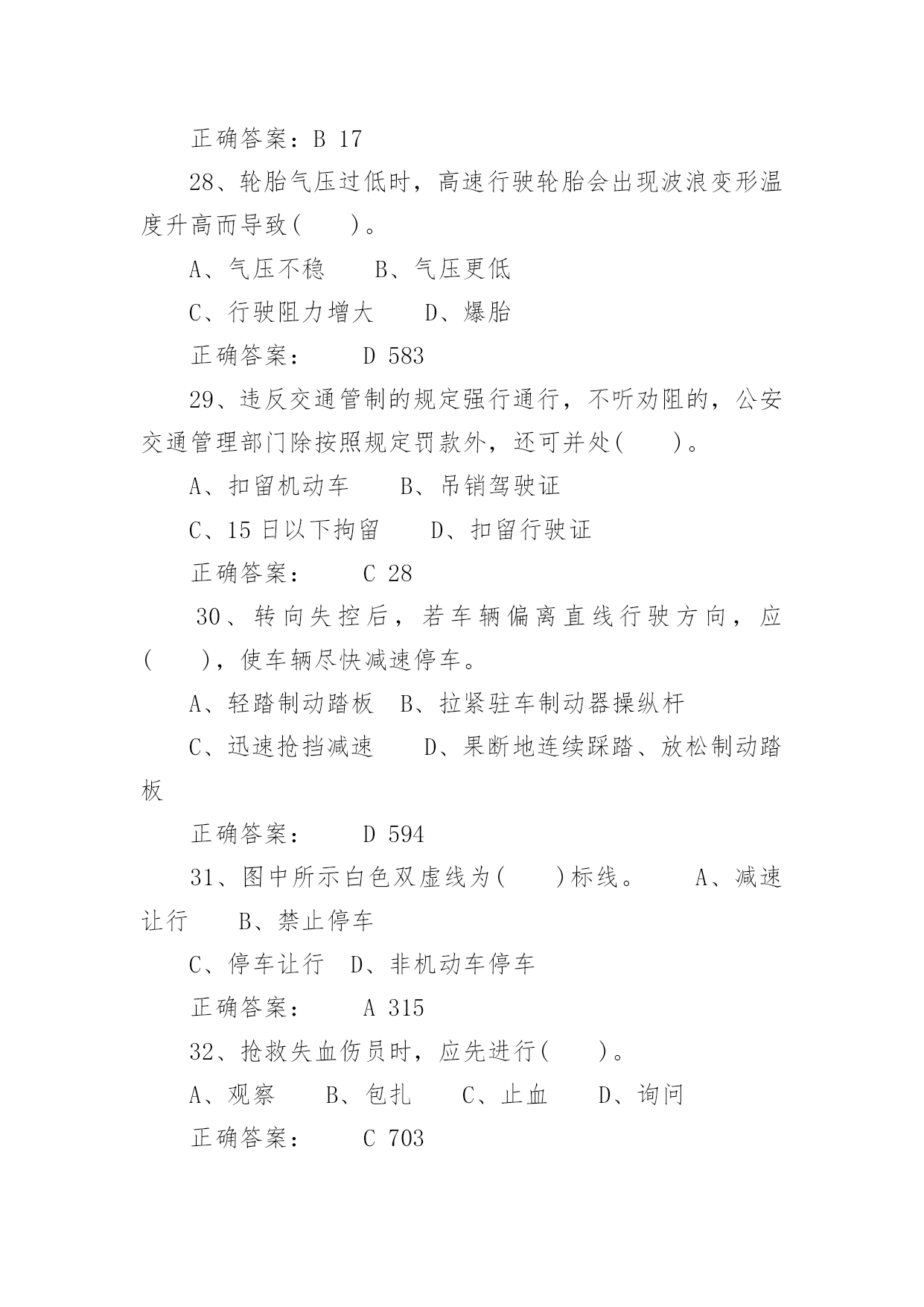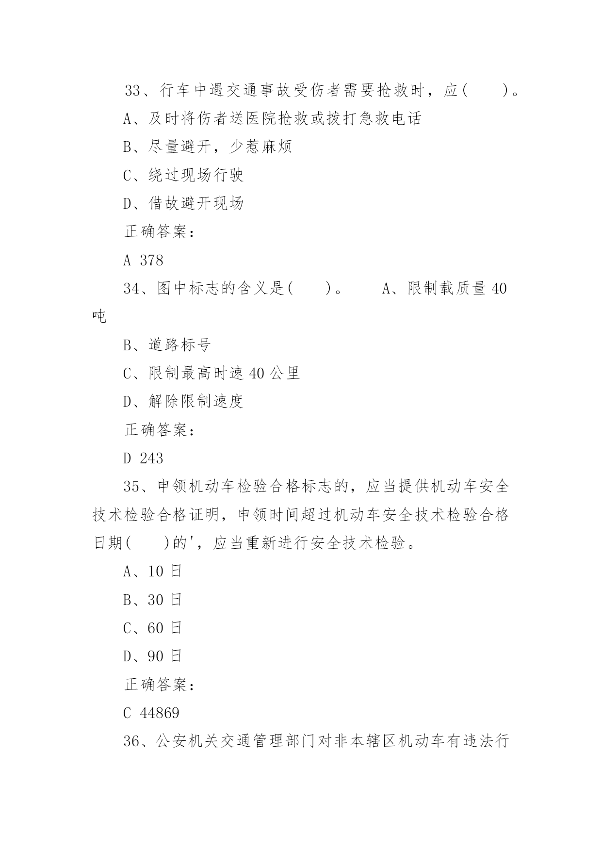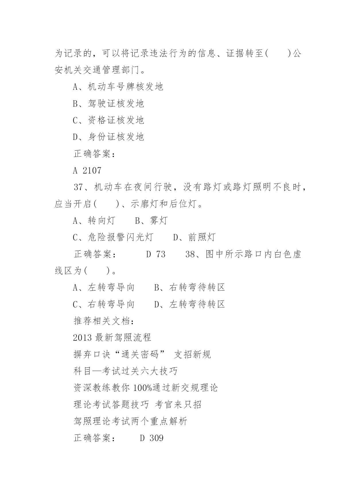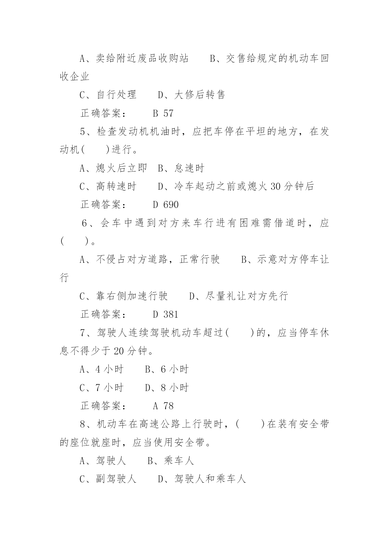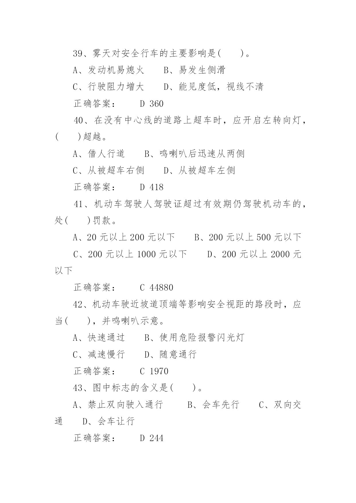 驾照考试试题驾照考试试题驾照考试一般指驾驶员考试。驾驶员考试(机动车驾驶员考试)是由公安局车管所举办的资格考试,只有通过驾驶员考试才能取得驾照,才能合法的驾驶机动车辆。下面是小编带来的驾照考试试题,希望对你有帮助。1、图中标志的含义是()。A、左侧绕行B、左右绕行C、右侧绕行D、禁止绕行正确答案:B2322、救火时错误的做法是()。A、站在下风处灭火B、脱去所穿的化纤服装C、注意保护暴露在外面的皮肤D、不要张嘴呼吸或高声呐喊正确答案:A6293、使用已经有裂纹或损伤的轮胎行驶,容易引起()。A、车辆跑偏B、爆胎C、转向失控D、增大行驶阻力正确答案:B6944、已注册登记的机动车达到国家规定的强制报废标准的,机动车所有人应当将车辆在报废期满前()。A、卖给附近废品收购站B、交售给规定的机动车回收企业C、自行处理D、大修后转售正确答案:B575、检查发动机机油时,应把车停在平坦的地方,在发动机()进行。A、熄火后立即B、怠速时C、高转速时D、冷车起动之前或熄火30分钟后正确答案:D6906、会车中遇到对方来车行进有困难需借道时,应()。A、不侵占对方道路,正常行驶B、示意对方停车让行C、靠右侧加速行驶D、尽量礼让对方先行正确答案:D3817、驾驶人连续驾驶机动车超过()的,应当停车休息不得少于20分钟。A、4小时B、6小时C、7小时D、8小时正确答案:A788、机动车在高速公路上行驶时,()在装有安全带的座位就座时,应当使用安全带。A、驾驶人B、乘车人C、副驾驶人D、驾驶人和乘车人正确答案:D448849、机动车在没有限速标志、标线的道路上,同方向只有一条机动车道的公路,规定最高时速为()。A、30公里B、40公里C、50公里D、70公里正确答案:D192110、驾驶车辆正常行驶时,对道路情况的处理要有预见性,在接近障碍时能()。A、紧急制动能停车B、急转向迅速绕过C、迅速躲避不发生碰撞D、平稳停车正确答案:D38411、机动车在人行横道()。A、可以临时停车B、可以随意停车C、可以长时间停车D、不得停车正确答案:D8112、上道路行驶的机动车未按规定进行机动车安全技术检验被扣留的,被扣机动车因拖移至机动车安全技术检验机构及检验所发生的费用,由()自行承担。A、机动车所有人、管理人B、公安机关交通管理部门C、拖车公司D、检验机构正确答案:A4487013、行车中突遇对方车辆强行超车,占据自己车道,正确的做法是()。A、加速行驶B、尽可能减速避让、直至停车C、保持原车速行驶D、挡住其去路正确答案:B37014、在一般道路上因掉头需要倒车时,应选择在()的地段进行。A、交通繁忙B、路面狭窄C、非机动车和行人较多D、不影响正常交通正确答案:D41515、图中标志表示该道路只准()行驶。A、非机动车B、小客车C、一切机动车D、出租车正确答案:C25716、机动车驾驶证有效期分为()、10年和长期。A、1年B、2年C、5年D、6年正确答案:D6017、在没有道路中心线的道路上,遇后车发出超车信号时,前车应当()。A、保持原有状态行驶B、加速行驶C、迅速停车让行D、在条件许可的情况下,降低速度、靠右让路正确答案:D6518、行车中遇有前方发生交通事故,需要帮助时,应()。A、尽量绕道躲避B、立即报警,停车观望C、协助保护现场,并立即报警D、加速通过,不予理睬正确答案:C37719、可以扣留机动车驾驶证的情形是()。A、饮酒后驾驶机动车的B、驾车时吸烟、饮食的C、发生轻微交通事故,未造成财产损失的D、机动车行驶超过规定时速10%的正确答案:A12420、机动车驾驶人不按规定使用安全带,考试评判为()。A、不合格B、扣20分C、扣10分D、扣5分正确答案:A4485821、图中标志表示允许机动车()。A、绕行B、掉头C、转弯D、倒车正确答案:B26622、当驾驶车辆行经两侧有行人且有积水的路面时,应()。A、加速通过B、正常行驶C、减速慢行D、连续鸣喇叭正确答案:C390推荐相关文档:2013最新驾照流程摒弃口诀“通关密码”支招新规科目—考试过关六大技巧资深教练教你100%通过新交规理论理论考试答题技巧考官来只招驾照理论考试两个重点解析23、图中标志表示机动车驶入前方道路的()。A、平均时速限制B、最低时速限制C、解除最低限速D、最高时速限制正确答案:B26224、驾驶车辆行至道路急转弯处,应()。A、借对向车道行驶B、急剧制动低速通过C、靠弯道外侧行驶D、充分减速并靠右侧行驶正确答案:D42125、驾驶人行车中看到注意儿童标志的时候,应()。A、加速行驶B、绕道行驶C、谨慎选择行车速度D、保持正常车速行驶正确答案:C45826、冰雪路行车时()。A、制动距离延长B、抗滑能力变大C、路面附着力增大D、制动性能没有变化正确答案:A36627、道