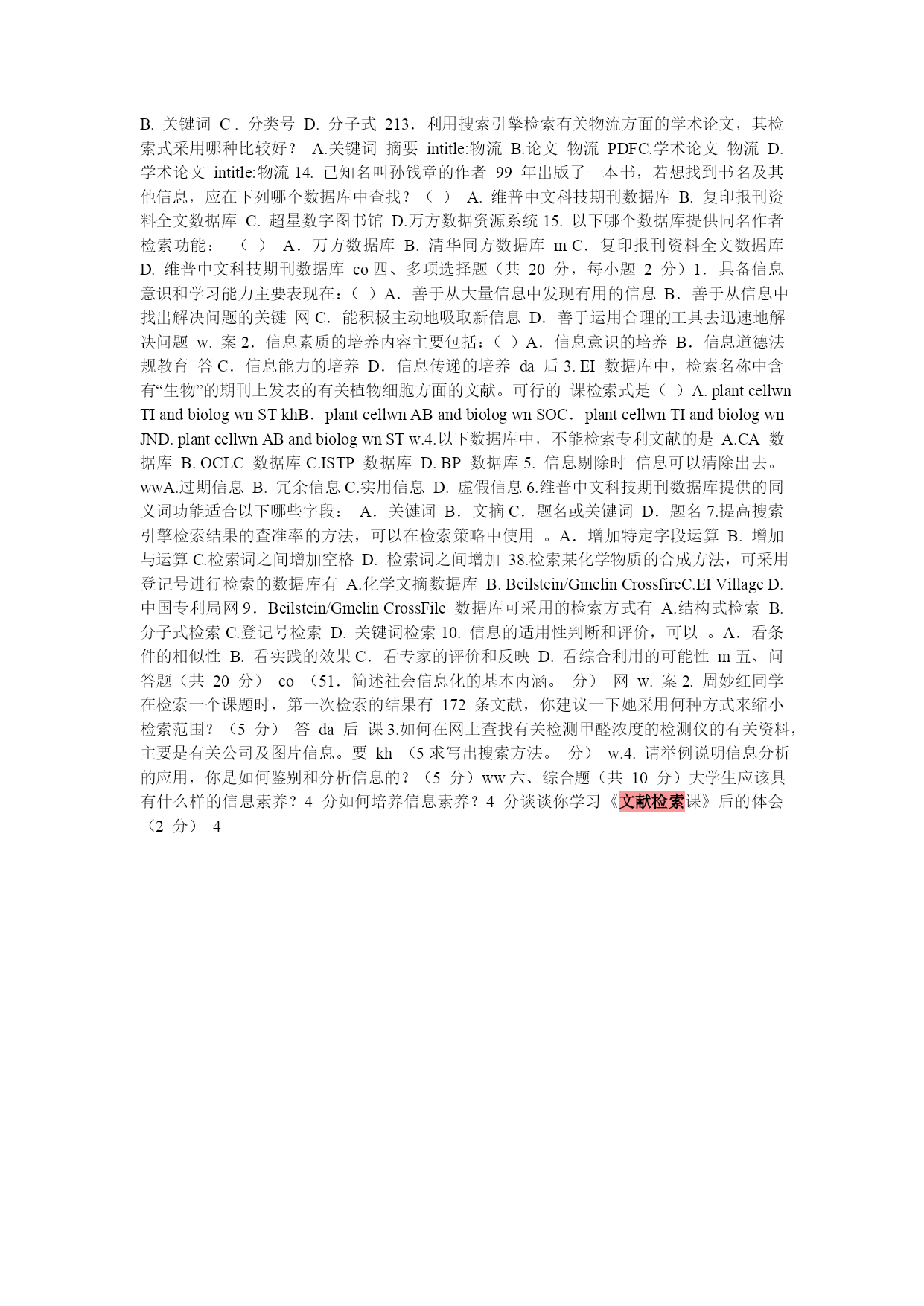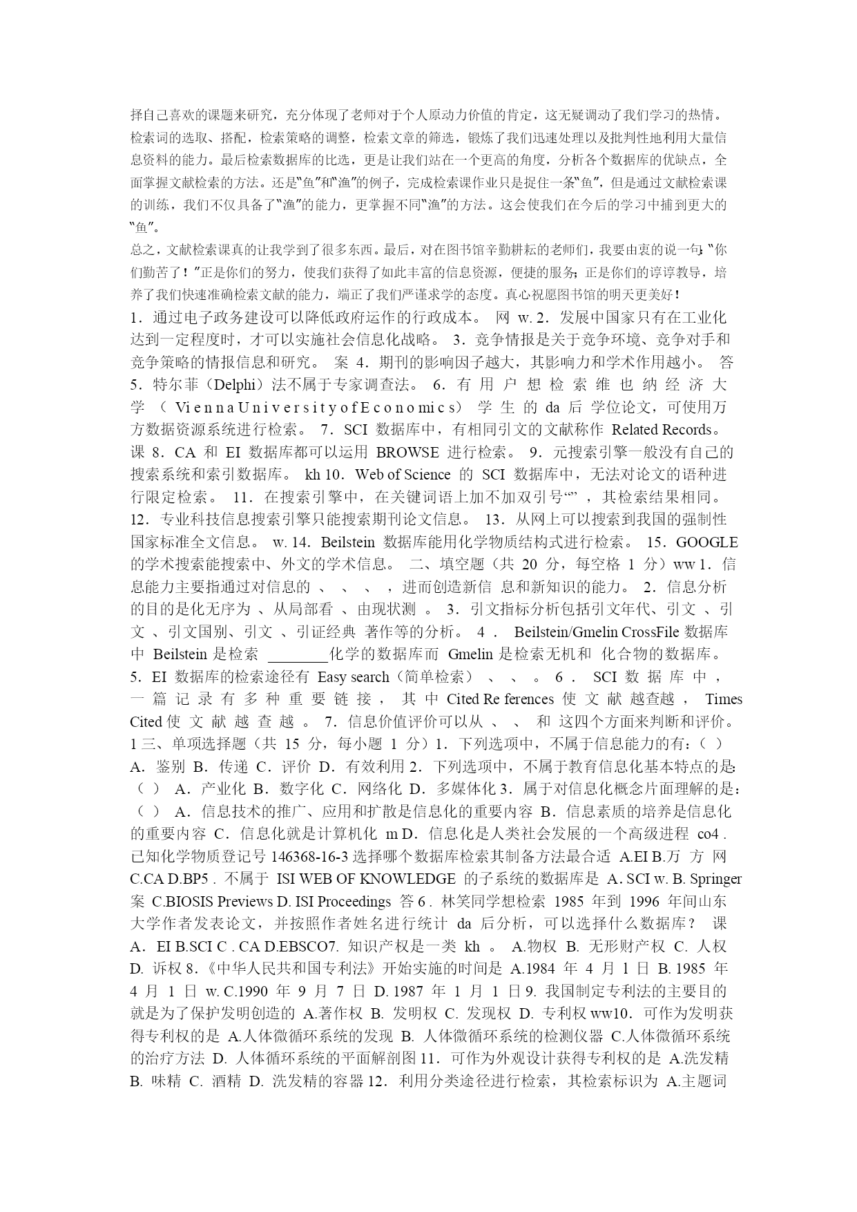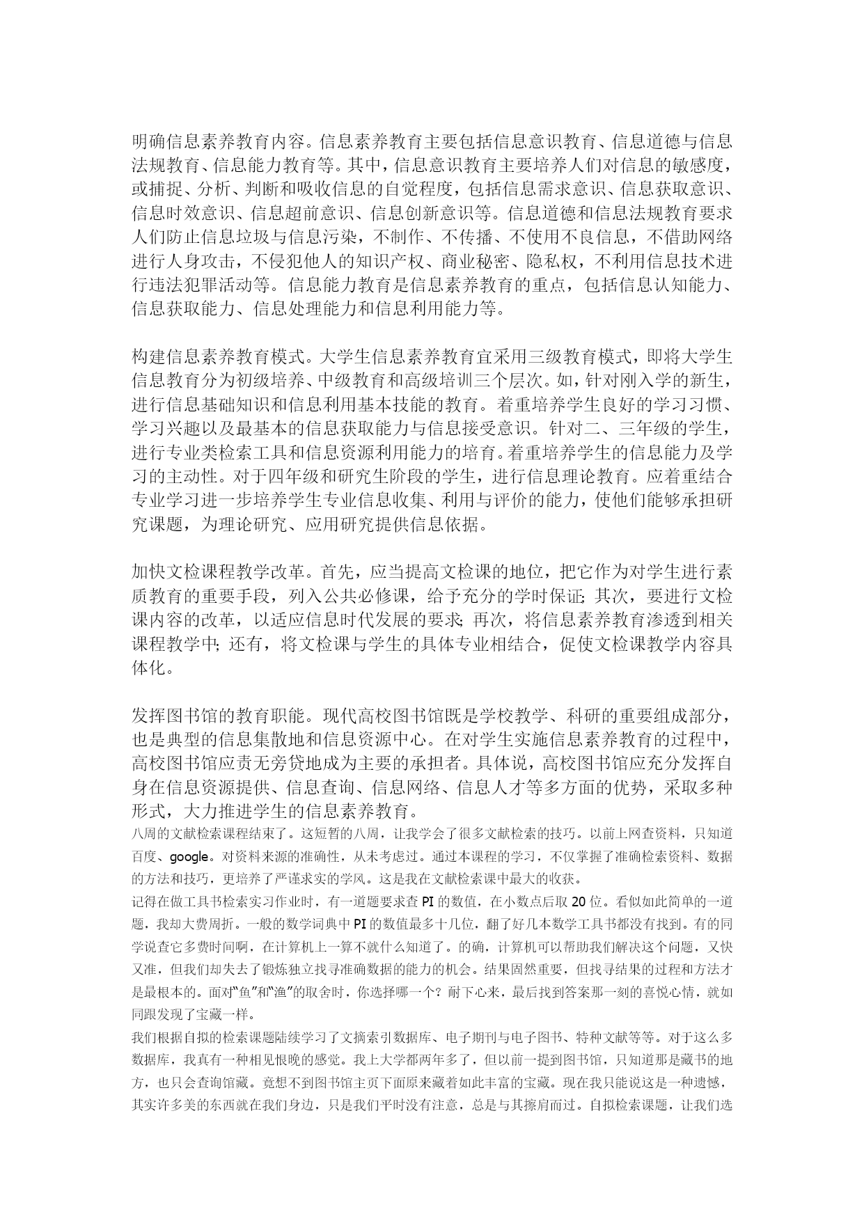 2、信息知识信息知识,是信息素养的基础,是有关信息的特点与类型、信息交流和传播的基本规律与方式、信息的功用及效应、信息检索等方面的知识。信息知识不但可以使人的知识结构改变,而且能够激活原有的学科专业知识,使文化知识和专业知识发挥更大的作用。3、信息能力信息能力,是信息素养的保证,是信息素养最重要的一个方面。它包括人获取、处理、交流、应用、创造信息的能力等。信息能力教育,是要培养和训练人们熟练应用信息技术,在大量无序的信息中辨别出自己所需的信息,并能根据所掌握的信息知识、信息技能和信息检索工具,迅速有效地获取、利用信息,并创造出新信息的能力。4、信息道德信息道德,是信息素养的准则,良好的信息道德是信息素养中不可缺少的一部分。信息道德,是指在组织和利用信息时,要树立正确的法制观念,增强信息安全意识,提高对信息的判断和评价能力,准确合理地使用信息资源。高等教育的新内容当前,信息社会需要的不是信息的简单传递者或使用者,而是具有较强信息意识和能够熟练运用现代信息技术手段,将大量支离破碎的信息与数据进行归纳与综合,使之条理化的有较高信息素养的人才。可见,信息素养不仅是现代人文化素养、整体素质的一部分,更应把它看作素质教育的灵魂来培养,是信息社会高等教育的新内容,培育大学生的信息素养已成为当代高等教育面临的一个重要课题。同时,信息素养是创新活动的助推器和催化剂。信息素养的培育过程同时也是创新思维的培养过程,两者共存互动、相得益彰,对培养学生的科研能力、创新能力具有重要作用。从信息素养的定义看,具有信息素养的人是那些知道如何进行学习的人。信息素养作为终身学习的基础和促进因素,它是所有学科的学习都需要的。拥有信息素养不仅能使学习者更好地掌握学习内容,拓展研究范围,而且还能使学习者对自己的学习进行自我指导和自我控制,也就是终身学习所强调的“自我导向学习”。信息素养教育的内容非常丰富,涉及面也十分广泛。对此,我们应按照信息素养教育的内在逻辑,制定信息素养培育目标、明确信息素养教育内容、构建信息素养教育模式。具体言之,就是:制定信息素养教育目标。信息素养教育应达到以下目的:提高学生的信息关注程度,形成“信息就是资源”、“信息就是效益”、“信息就是生存权”的价值观念;培养学生用一定的信息伦理与道德准则规范自身行为的能力;培养学生能够主动确定所需信息的种类、范围和价值的能力;培养学生建构和完善科学的信息策略,从而能够有效获取所需信息的能力;培养学生能够批判性地分析、评价信息资源的能力;培养学生能够独立、有效、准确地利用信息资源创造性地完成某一任务的能力;培养学生能够进行自我教育和终身教育的能力等。明确信息素养教育内容。信息素养教育主要包括信息意识教育、信息道德与信息法规教育、信息能力教育等。其中,信息意识教育主要培养人们对信息的敏感度,或捕捉、分析、判断和吸收信息的自觉程度,包括信息需求意识、信息获取意识、信息时效意识、信息超前意识、信息创新意识等。信息道德和信息法规教育要求人们防止信息垃圾与信息污染,不制作、不传播、不使用不良信息,不借助网络进行人身攻击,不侵犯他人的知识产权、商业秘密、隐私权,不利用信息技术进行违法犯罪活动等。信息能力教育是信息素养教育的重点,包括信息认知能力、信息获取能力、信息处理能力和信息利用能力等。构建信息素养教育模式。大学生信息素养教育宜采用三级教育模式,即将大学生信息教育分为初级培养、中级教育和高级培训三个层次。如,针对刚入学的新生,进行信息基础知识和信息利用基本技能的教育。着重培养学生良好的学习习惯、学习兴趣以及最基本的信息获取能力与信息接受意识。针对二、三年级的学生,进行专业类检索工具和信息资源利用能力的培育。着重培养学生的信息能力及学习的主动性。对于四年级和研究生阶段的学生,进行信息理论教育。应着重结合专业学习进一步培养学生专业信息收集、利用与评价的能力,使他们能够承担研究课题,为理论研究、应用研究提供信息依据。加快文检课程教学改革。首先,应当提高文检课的地位,把它作为对学生进行素质教育的重要手段,列入公共必修课,给予充分的学时保证;其次,要进行文检课内容的改革,以适应信息时代发展的要求;再次,将信息素养教育渗透到相关课程教学中;还有,将文检课与学生的具体专业相结合,促使文检课教学内容具体化。发挥图书馆的教育职能。现代高校图书馆既是学校教学、科研的重要组成部分,也是典型的信息集散地和信息资源中心。在对学生实施信息素养教育的过程中,高校图书馆应责无旁贷地成为主要的承担者。具体说,高校图书馆应充分发挥自身在信息资源提供、信息查询、信息网络、信息人才等多方面的优势,采取多种形式,大力推进学生的信息素养教育。八周的文献检索课程结束了。这短暂的八周,让我学会了很多文献检索的技巧。以前