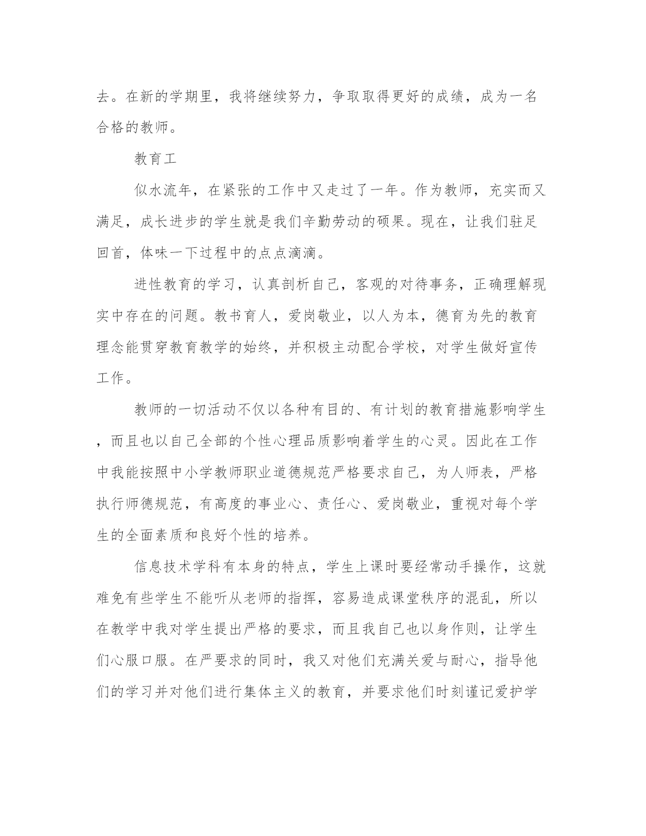 教育工作者的信息技术教师年度总结(优质14篇)总结是一个总结过往经验和汲取教训的过程,通过总结我们可以不断成长和进步。在写总结时,可以采用简洁明了的语言,重点突出,言简意赅。通过阅读这些总结范文,可以了解到总结写作的技巧和方法。教育工本学期的工作主要担任七年级共3个班的信息技术课教学工作。在教学工作方面,本人刚刚踏入工作岗位不久,虽然是师范出身,但是毕竟在校期间的理论知识与现实教学是有一定差距的。转眼之间,自己突然由一名学生变成了一名老师,站在讲台上要面对40双渴望求知的眼睛,在刚开始的阶段心理曾产生巨大