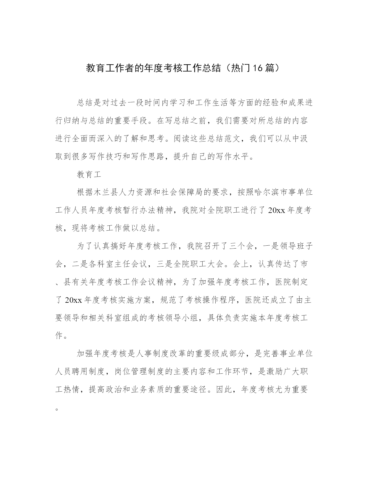 教育工作者的年度考核工作总结(热门16篇)总结是对过去一段时间内学习和工作生活等方面的经验和成果进行归纳与总结的重要手段。在写总结之前,我们需要对所总结的内容进行全面而深入的了解和思考。阅读这些总结范文,我们可以从中汲取到很多写作技巧和写作思路,提升自己的写作水平。教育工根据木兰县人力资源和社会保障局的要求,按照哈尔滨市事单位工作人员年度考核暂行办法精神,我院对全院职工进行了20xx年度考核,现将考核工作做以总结。为了认真搞好年度考核工作,我院召开了三个会,一是领导班子会,二是各科室主任会议,三是全院职工