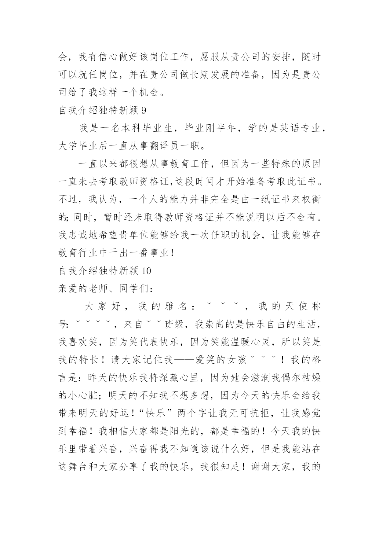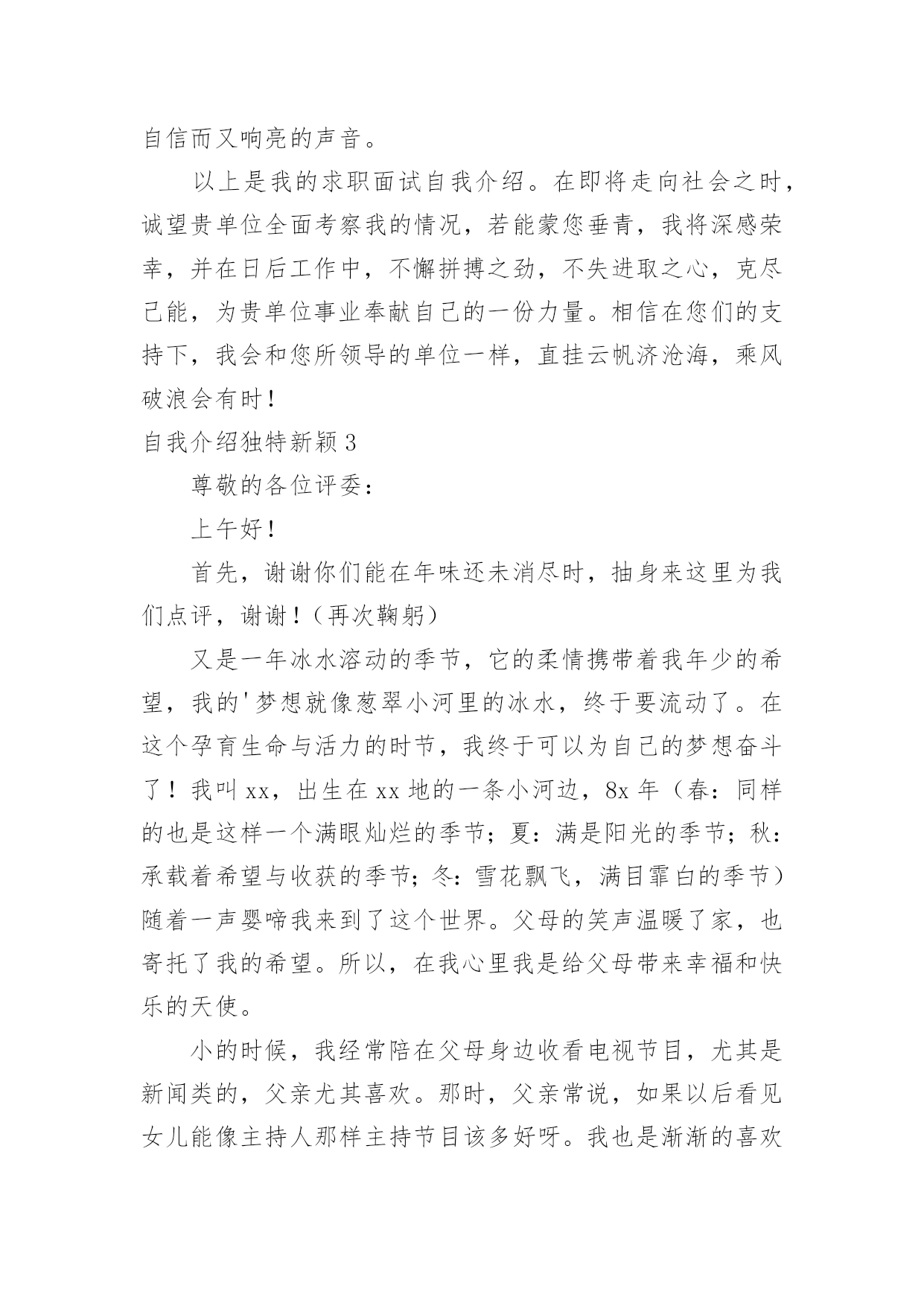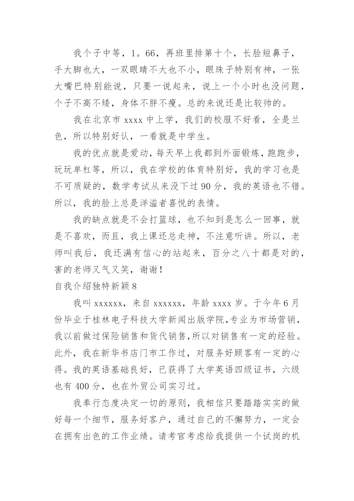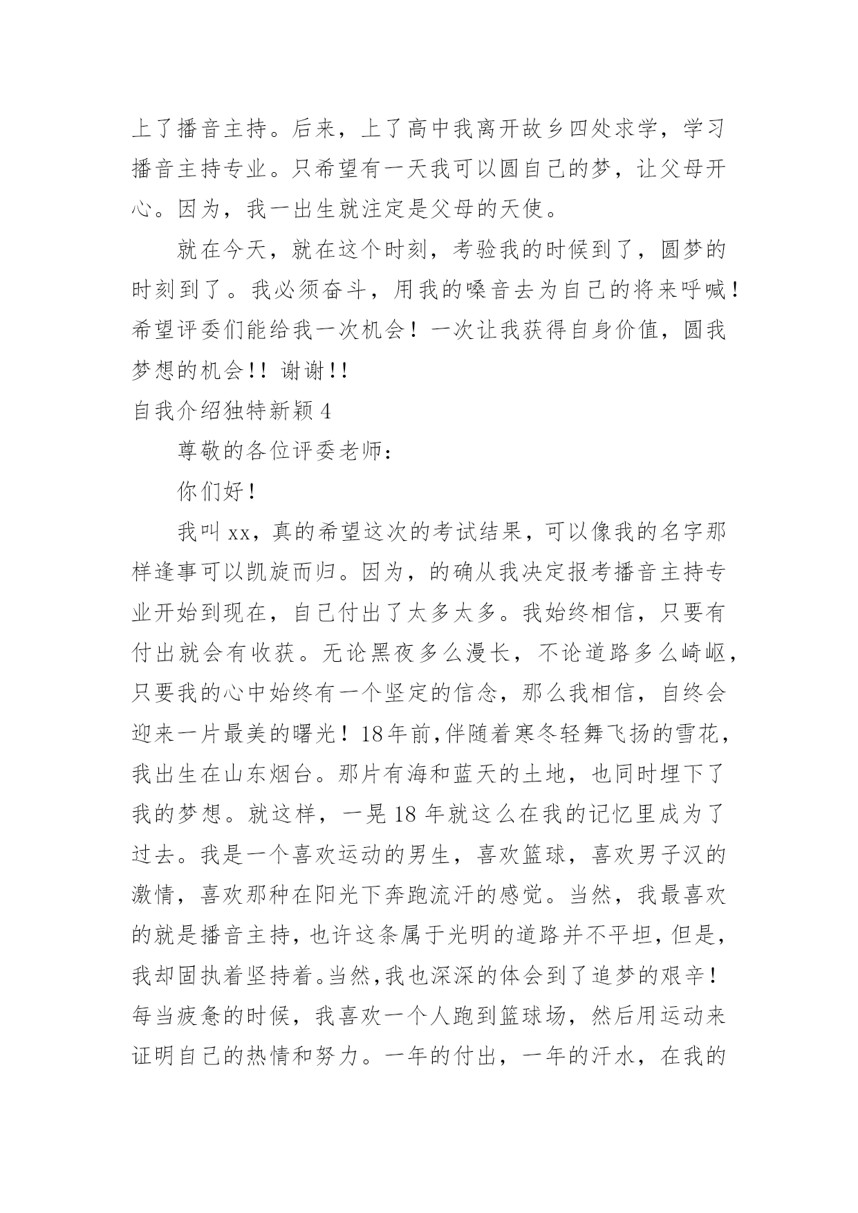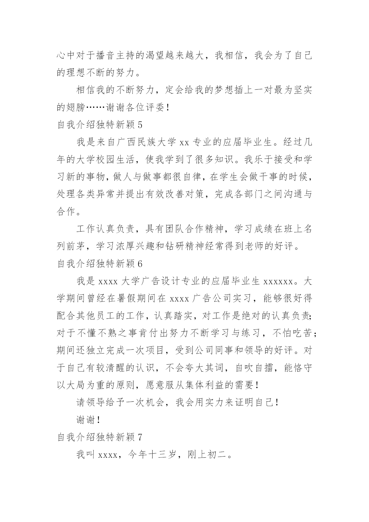 自我介绍独特新颖自我介绍独特新颖当换了一个新环境后,进行自我介绍是必不可少的,自我介绍可以满足我们渴望得到尊重的心理。到底应如何写自我介绍呢?下面是小编收集整理的自我介绍独特新颖,供大家参考借鉴,希望可以帮助到有需要的朋友。自我介绍独特新颖1大家好,很高兴有机会在这里介绍我自己。我是xx,正心小学三年级2班的学生。我学习成绩优秀,是班上的班长并且我和同学们相处很融洽。我是一个开朗又多才多艺的年男孩,画画是我最擅长的,曾多次或奖。同时我还很会讲故事。我很喜欢学习英语,我相信我会表现的出色,我不会让大家失望的。谢谢你们的聆听。自我介绍独特新颖2我是嘉兴学院临床医学院临床专业xx级本科学生,将于20xx年7月毕业。在即将叩响社会这扇大门时,我怀着无比的真诚和高度责任感把我的人生向您靠拢。5年的大学生活使我树立了正确的人生观,价值观,形成了热情、上进、不屈不挠的性格和诚实、守信、有责任心、有爱心的人生信条。5年,厚积薄发的5年,给我的“轻叩柴扉”留下一个自信而又响亮的声音。以上是我的求职面试自我介绍。在即将走向社会之时,诚望贵单位全面考察我的情况,若能蒙您垂青,我将深感荣幸,并在日后工作中,不懈拼搏之劲,不失进取之心,克尽己能,为贵单位事业奉献自己的一份力量。相信在您们的支持下,我会和您所领导的单位一样,直挂云帆济沧海,乘风破浪会有时!自我介绍独特新颖3尊敬的各位评委:上午好!首先,谢谢你们能在年味还未消尽时,抽身来这里为我们点评,谢谢!(再次鞠躬)又是一年冰水溶动的季节,它的柔情携带着我年少的希望,我的'梦想就像葱翠小河里的冰水,终于要流动了。在这个孕育生命与活力的时节,我终于可以为自己的梦想奋斗了!我叫xx,出生在xx地的一条小河边,8x年(春:同样的也是这样一个满眼灿烂的季节;夏:满是阳光的季节;秋:承载着希望与收获的季节;冬:雪花飘飞,满目霏白的季节)随着一声婴啼我来到了这个世界。父母的笑声温暖了家,也寄托了我的希望。所以,在我心里我是给父母带来幸福和快乐的天使。小的时候,我经常陪在父母身边收看电视节目,尤其是新闻类的,父亲尤其喜欢。那时,父亲常说,如果以后看见女儿能像主持人那样主持节目该多好呀。我也是渐渐的喜欢上了播音主持。后来,上了高中我离开故乡四处求学,学习播音主持专业。只希望有一天我可以圆自己的梦,让父母开心。因为,我一出生就注定是父母的天使。就在今天,就在这个时刻,考验我的时候到了,圆梦的时刻到了。我必须奋斗,用我的嗓音去为自己的将来呼喊!希望评委们能给我一次机会!一次让我获得自身价值,圆我梦想的机会!!谢谢!!自我介绍独特新颖4尊敬的各位评委老师:你们好!我叫xx,真的希望这次的考试结果,可以像我的名字那样逢事可以凯旋而归。因为,的确从我决定报考播音主持专业开始到现在,自己付出了太多太多。我始终相信,只要有付出就会有收获。无论黑夜多么漫长,不论道路多么崎岖,只要我的心中始终有一个坚定的信念,那么我相信,自终会迎来一片最美的曙光!18年前,伴随着寒冬轻舞飞扬的雪花,我出生在山东烟台。那片有海和蓝天的土地,也同时埋下了我的梦想。就这样,一晃18年就这么在我的记忆里成为了过去。我是一个喜欢运动的男生,喜欢篮球,喜欢男子汉的激情,喜欢那种在阳光下奔跑流汗的感觉。当然,我最喜欢的就是播音主持,也许这条属于光明的道路并不平坦,但是,我却固执着坚持着。当然,我也深深的体会到了追梦的艰辛!每当疲惫的时候,我喜欢一个人跑到篮球场,然后用运动来证明自己的热情和努力。一年的付出,一年的汗水,在我的心中对于播音主持的渴望越来越大,我相信,我会为了自己的理想不断的努力。相信我的不断努力,定会给我的梦想插上一对最为坚实的翅膀……谢谢各位评委!自我介绍独特新颖5我是来自广西民族大学xx专业的应届毕业生。经过几年的大学校园生活,使我学到了很多知识。我乐于接受和学习新的事物,做人与做事都很自律,在学生会做干事的时候,处理各类异常并提出有效改善对策,完成各部门之间沟通与合作。工作认真负责,具有团队合作精神,学习成绩在班上名列前茅,学习浓厚兴趣和钻研精神经常得到老师的好评。自我介绍独特新颖6我是xxxx大学广告设计专业的应届毕业生xxxxxx。大学期间曾经在暑假期间在xxxx广告公司实习,能够很好得配合其他员工的工作,认真踏实,对工作是绝对的认真负责;对于不懂不熟之事肯付出努力不断学习与练习,不怕吃苦;期间还独立完成一次项目,受到公司同事和领导的好评。对于自己有较清醒的认识,不会夸大其词,自吹自擂,能恪守以大局为重的原则,愿意服从集体利益的需要!请领导给予一次机会,我会用实力来证明自己!谢谢!自我介绍独特新颖7我叫xxxx,今年十三岁,刚上初二。我个子中等,1。66,再班里排第十个,长脸短鼻子,手大脚也大,一双眼睛不大也不小,眼珠子特别有神,一张大