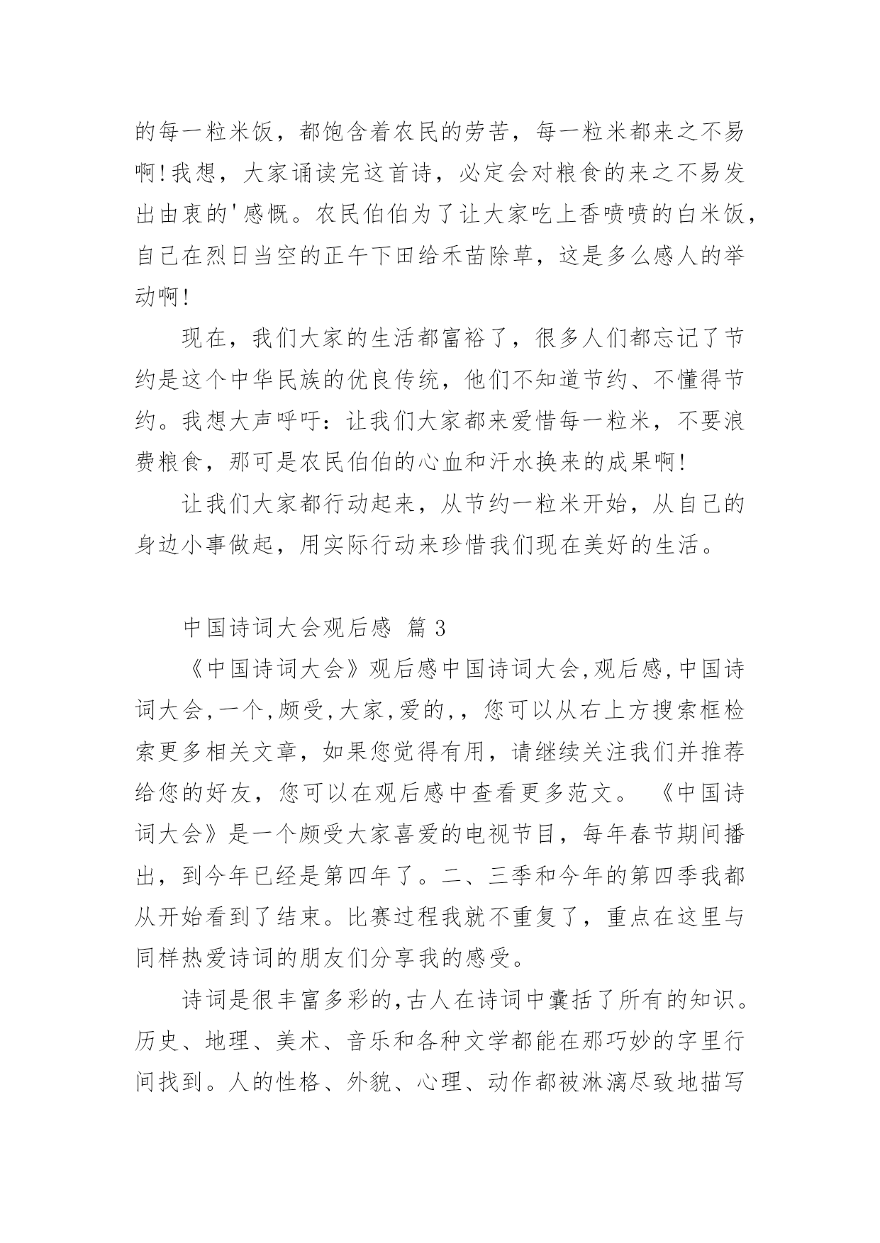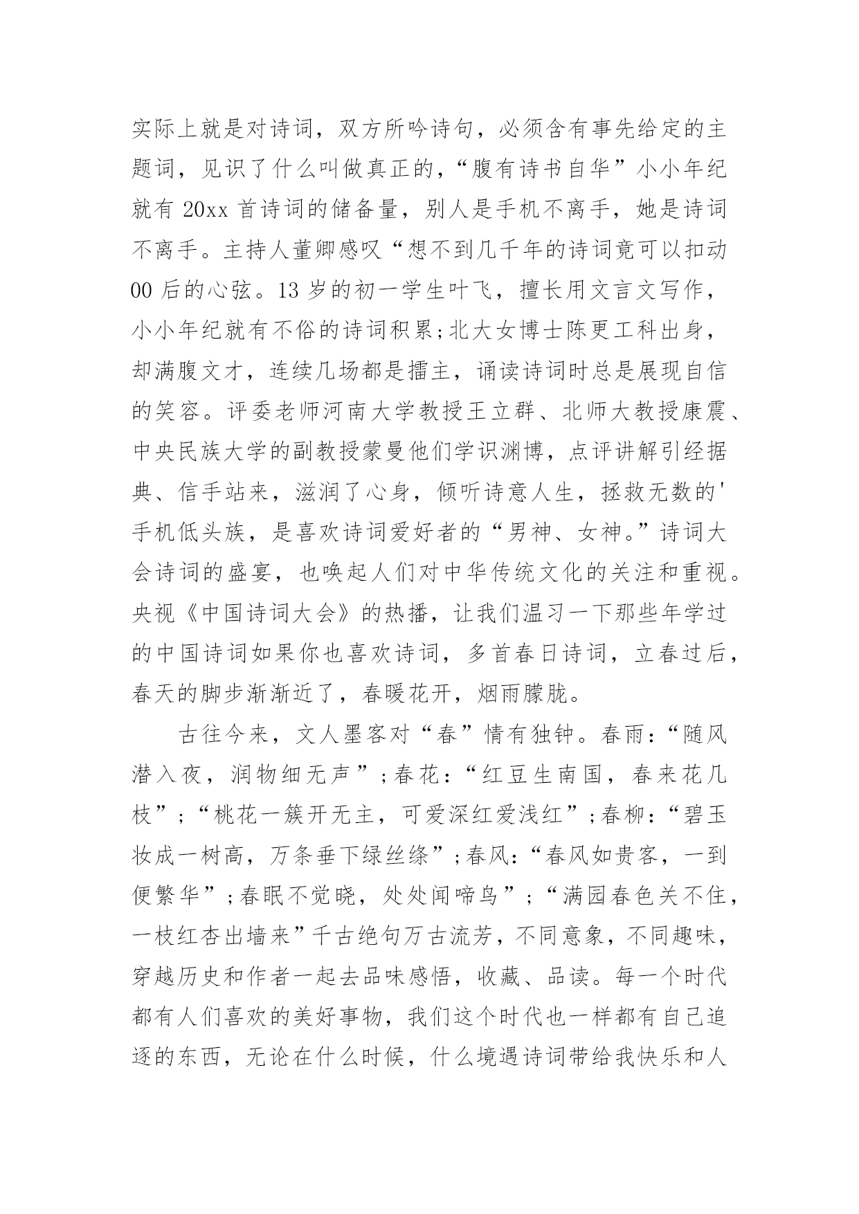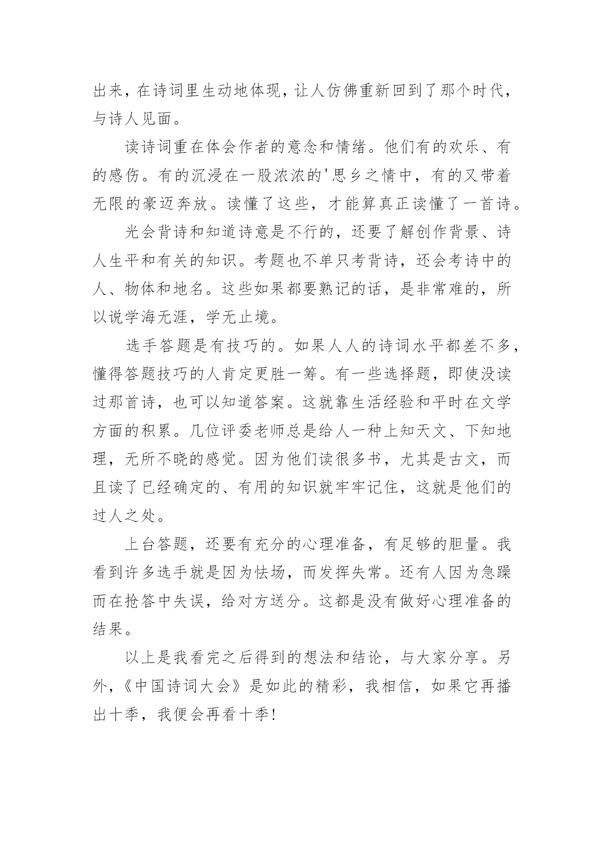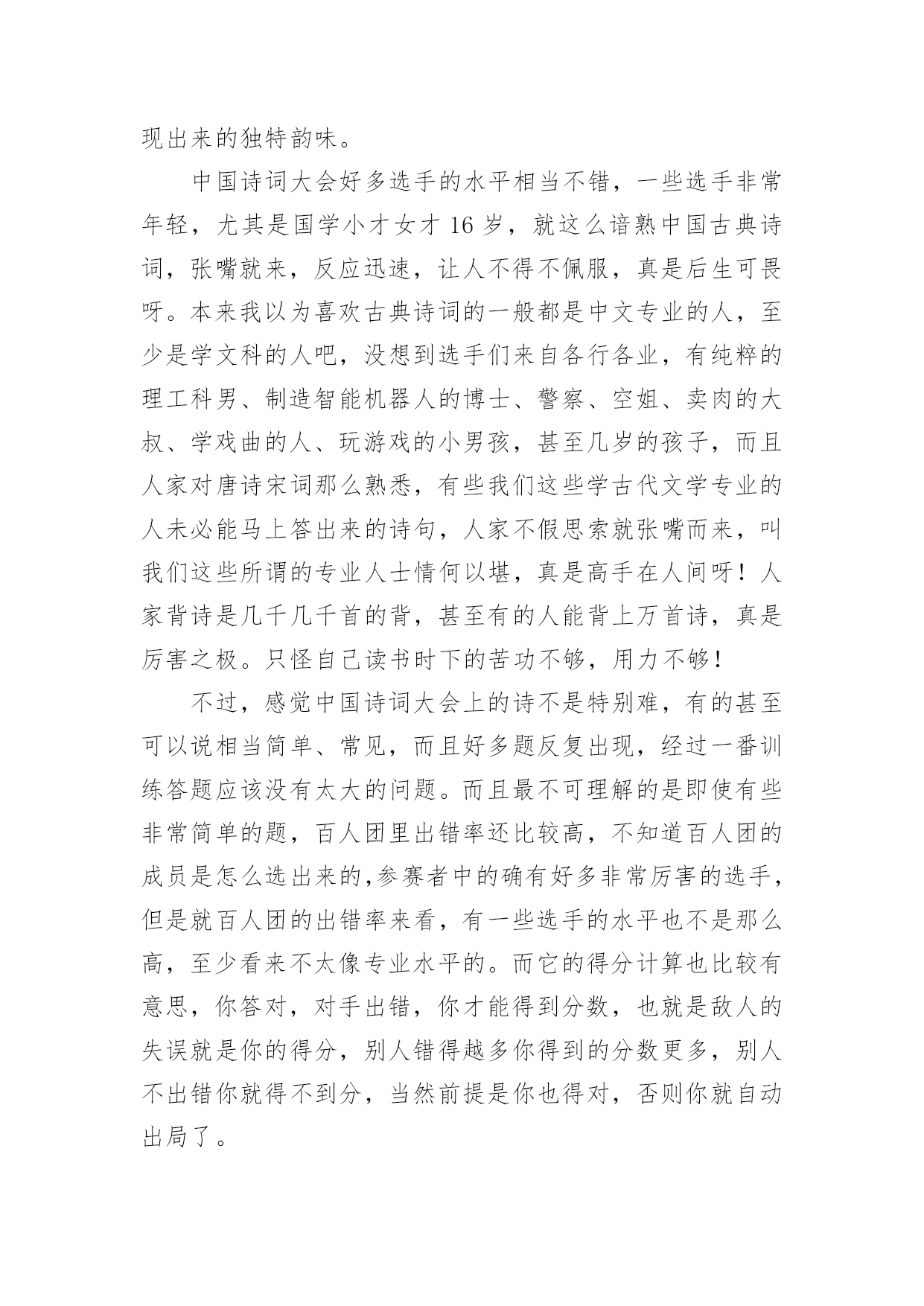 中国诗词大会观后感在观赏了后,心中感慨万千,不禁为作品所深深折服,相信你会有不少感想吧,为此就要认真思考观后感如何写了。是不是无从下笔、没有头绪?以下是小编为大家整理的中国诗词大会观后感,欢迎阅读,希望大家能够喜欢。中国诗词大会观后感篇1最近看了几期的中国诗词大会,颇有感触。这个节目不错,至少在弘扬和推广中国诗词文化方面有一定的作用。中国是一个诗的国度,唐诗宋词和元曲、明清小说等文体一样,都曾经在中国历史上灿烂和辉煌,影响了一代又一代的炎黄子孙。很多人从很小的时候起,就开始背唐诗宋词,在诗歌的熏陶和陪伴下长大,也吸引很多人加入到诗词创作的队伍中。尽管八九十年代的时候很多人写诗,甚至现在写诗的人都比读诗的人都多,但是,如同大唐盛世早已成为历史一样,一个朝代有一个朝代的文学样式,每一种文学体裁经历了辉煌之后,渐渐走向衰落,然后被另外一种体裁取代。诗歌的繁盛已经过去,不太可能出现像唐诗那样的诗歌盛世了,尽管现在有很多人写诗,但是已经写不出唐诗宋词的`韵味和感觉了,读之只会让人觉得生涩干巴无味,无法吸引人读下去。好在古人给我们留下了很多脍炙人口的精品佳作,让千百年之后的我们读起来,仍然能感受到诗人营造的意境和表现出来的独特韵味。中国诗词大会好多选手的水平相当不错,一些选手非常年轻,尤其是国学小才女才16岁,就这么谙熟中国古典诗词,张嘴就来,反应迅速,让人不得不佩服,真是后生可畏呀。本来我以为喜欢古典诗词的一般都是中文专业的人,至少是学文科的人吧,没想到选手们来自各行各业,有纯粹的理工科男、制造智能机器人的博士、警察、空姐、卖肉的大叔、学戏曲的人、玩游戏的小男孩,甚至几岁的孩子,而且人家对唐诗宋词那么熟悉,有些我们这些学古代文学专业的人未必能马上答出来的诗句,人家不假思索就张嘴而来,叫我们这些所谓的专业人士情何以堪,真是高手在人间呀!人家背诗是几千几千首的背,甚至有的人能背上万首诗,真是厉害之极。只怪自己读书时下的苦功不够,用力不够!不过,感觉中国诗词大会上的诗不是特别难,有的甚至可以说相当简单、常见,而且好多题反复出现,经过一番训练答题应该没有太大的问题。而且最不可理解的是即使有些非常简单的题,百人团里出错率还比较高,不知道百人团的成员是怎么选出来的,参赛者中的确有好多非常厉害的选手,但是就百人团的出错率来看,有一些选手的水平也不是那么高,至少看来不太像专业水平的。而它的得分计算也比较有意思,你答对,对手出错,你才能得到分数,也就是敌人的失误就是你的得分,别人错得越多你得到的分数更多,别人不出错你就得不到分,当然前提是你也得对,否则你就自动出局了。选手答题阶段题目难易度还可以,有的相对简单,个别稍稍难一点点,比较精彩的是攻擂部分,紧张刺激,颇能见选手功力,能走到这一步的选手都相当不错,对唐诗宋词还是非常熟悉的,功力比较深厚,不得不佩服。这个节目,非常适合中小学生看,可以激发孩子对中国古典诗词的热爱。看了中国诗词大会,更激发读诗词的兴趣。大学研究生的时候背了不少诗歌,但有的现在已经忘了,决定以后还是把专业捡起来,否则人家理工科的人会的诗词比咱们学中文的人都要多,这有点说不过去。中国诗词大会观后感篇2“读经典古诗文,做美少年君子”。多读古诗文能陶冶我们的情操,能丰富我们的知识,我爱读古诗文。寒假期间,我看了央视的《中国诗词大会》,对节目中那些脍炙人口的诗词深深感到震撼。从开学到现在,我又读了不少经典诗文,比如《早发白帝城》、《赠汪伦》等,这些古诗不但让我领略了经典古诗文的美妙,更教会了我很多做人的道理。而我最喜欢的还是那首富有哲理的《悯农》。“锄禾日当午,汗滴禾下土,谁知盘中餐,粒粒皆辛苦。”这首诗,反映了封建社会贫富不均的矛盾和制度的不合理。读了这首诗,我眼前仿佛出现了在烈日暴晒下的农民们,不怕劳累、不怕炎热,流着满头大汗辛勤锄草、耕地,汗珠儿一串串滴进了禾下的泥土里的情景。有谁知道这盘中的每一粒米饭,都饱含着农民的劳苦,每一粒米都来之不易啊!我想,大家诵读完这首诗,必定会对粮食的来之不易发出由衷的'感慨。农民伯伯为了让大家吃上香喷喷的白米饭,自己在烈日当空的正午下田给禾苗除草,这是多么感人的举动啊!现在,我们大家的生活都富裕了,很多人们都忘记了节约是这个中华民族的优良传统,他们不知道节约、不懂得节约。我想大声呼吁:让我们大家都来爱惜每一粒米,不要浪费粮食,那可是农民伯伯的心血和汗水换来的成果啊!让我们大家都行动起来,从节约一粒米开始,从自己的身边小事做起,用实际行动来珍惜我们现在美好的生活。中国诗词大会观后感篇3《中国诗词大会》观后感中国诗词大会,观后感,中国诗词大会,一个,颇受,大家,爱的,,您可以从右上方搜索框检索更多相关文章,如果您觉得有用,请继续关注我们并推荐给您的好友,您可以在观后感中查看更多范文。《中国诗词大会》是一个