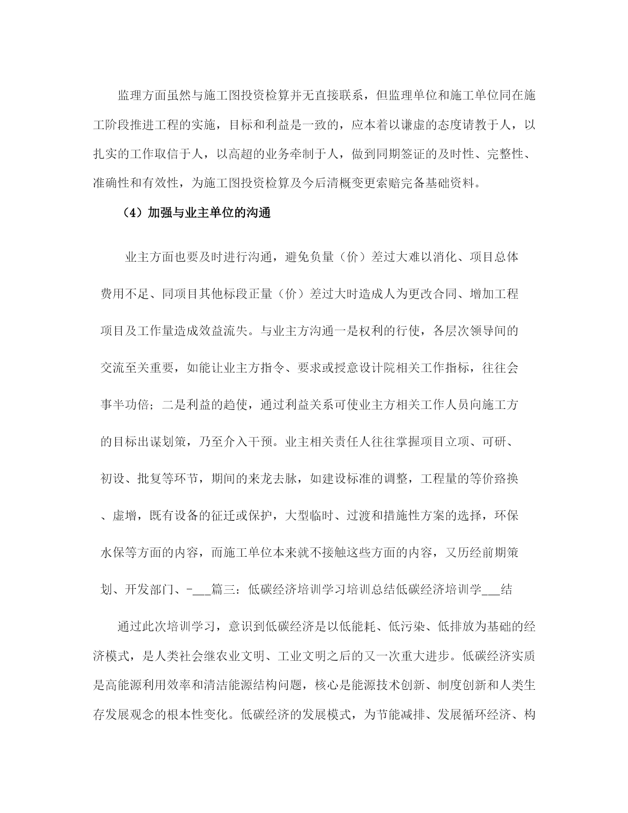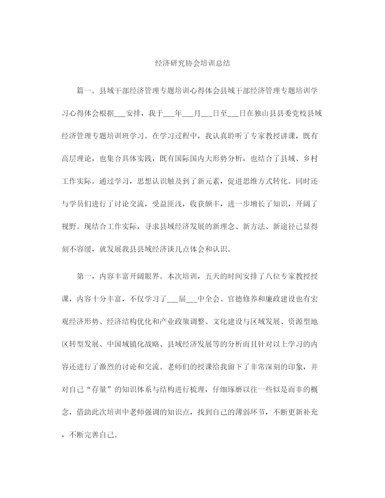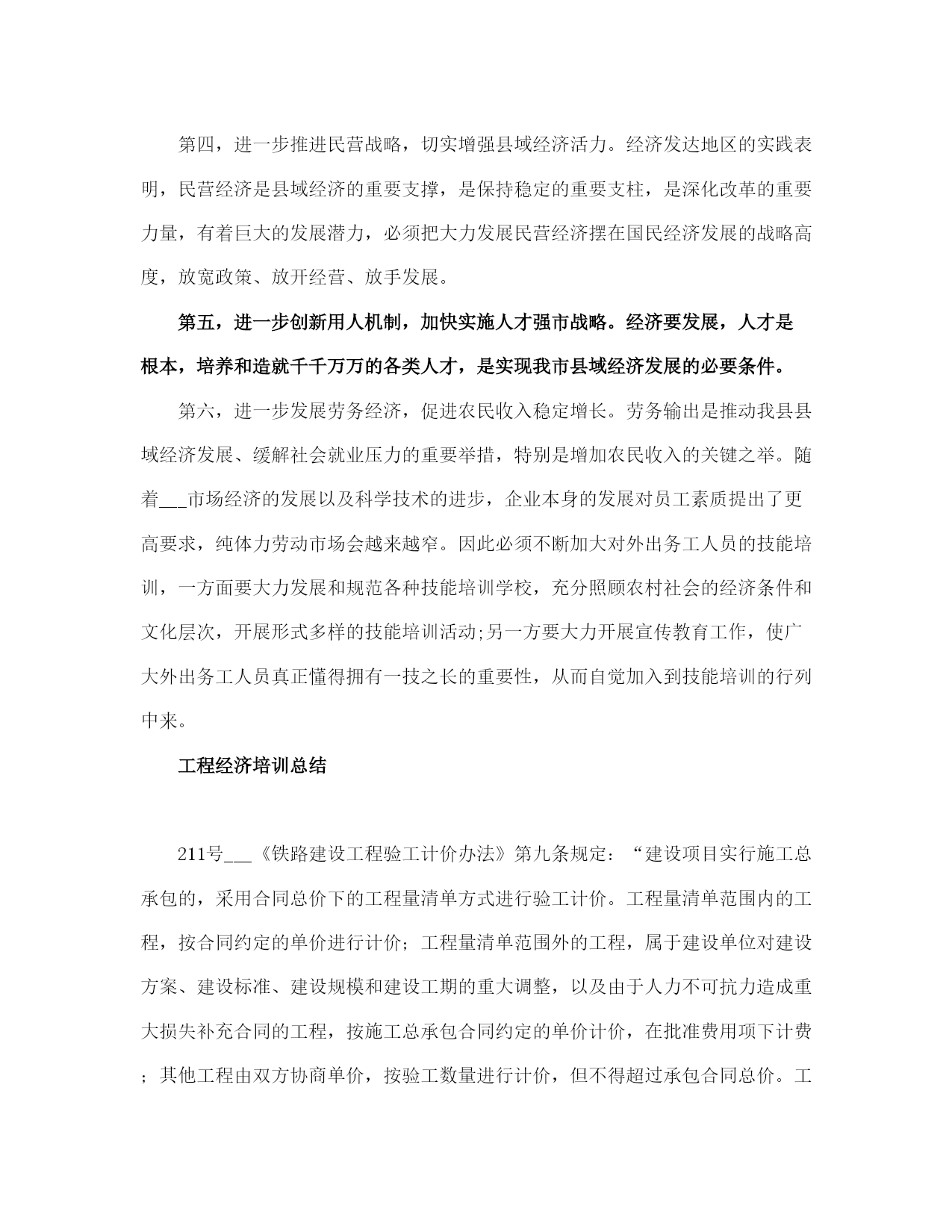 经济研究协会培训总结范本(完整版)文档资料可直接使用,可编辑,欢迎下载经济研究协会培训总结篇一。县域干部经济管理专题培训心得体会县域干部经济管理专题培训学习心得体会根据___安排,我于___年___月___日至___日在独山县县委党校县域经济管理专题培训班学习。在学习过程中,我认真聆听了专家教授讲课,既有高层理论,也集合具体实践,既有国际国内大形势分析,也结合了县域、乡村工作实际。通过学习,思想认识触及到了新元素,促进思维方式转化。同时还与学员们进行了讨论交流,受益匪浅,收获颇丰,进一步增长了知识,开阔了视野。现结合工作实际,寻求县域经济发展的新理念、新方法、新途径已显得刻不容缓,就发展我县县域经济谈几点体会和认识。第一,内容丰富开阔眼界。本次培训,五天的时间安排了八位专家教授授课,内容十分丰富,不仅学习了___届___中全会、官德修养和廉政建设也有宏观经济形势、经济结构优化和产业政策调整、文化建设与区域发展、资源型地区转型发展、中国域镇化战略、县域经济发展等的分析而且针对以上学习的内容还进行了激烈的讨论和交流。老师们的授课给我留下了非常深刻的印象,并对自己“存量”的知识体系与结构进行梳理,仔细琢磨以往一些似是而非的概念,借助此次培训中老师强调的知识点,找到自己的薄弱环节,不断更新补充,不断完善自己。第二,进一步推进体制创新,大力营造优良发展环境。国家提倡大力调整经济结构,切实转变增长方式。我县县域经济的发展就到了关键时期,亟需体制创新。体制创新思想解放,社会实践。思想解放就是要不断更新观念、创新思维、振奋精神。要辩证和积极地面对贫困和落后,面对缺资金、缺技术、缺人才,面对日益激烈的市场竞争。要树立信心和勇气,克服等、靠、要的依赖思想,立足自身,扎扎实实地树立强烈的创业意识,牢记发展是硬道理,不进则退,慢进也是退;社会实践就是要积极应对经济社会发展中的重点和难点。当前,县域经济体制创新正处在活跃期,包括土地流转、农业产业化、订单农业、企业改制、招商引资等等,这些领域的体制创新,必将带来生产力的新的解放。因此,我们一方面必须尊重群众的首创精神,不断并从理论上加以总结和推广,在政策上为县域经济的体制创新创造宽松的环境;另一方面我们应大力借鉴经济发达地区的先进经验,尽快制订促进县域经济发展的政策措施。第三,进一步推进三化进程,全力打造特色优势产业。工业化、农业产业化、城镇化这三化当中,工业化是核心和关键,农业产业化是基础,城镇化是载体。必须正确认识和处理好这三者之间的关系,使之相互促进、良性发展。强力推进工业化。县域经济的发展滞后,关键是在工业发展上滞后。必须加快强化工业的地位和作用,使之真正成为我县县域经济的主要支撑、财政收入的主要来源、社会就业的主要领域;加快推进农业产业化。要按照种植规模化、经营合作化、贸工农一体化、服务市场化的四化方向,强化优势、突出特色、创造条件,着力提升农业产业化的层次,提高农业竞争力;着力推进城镇化。发展县域经济,要把推进城镇化作为促进城乡经济和区域经济协调发展的重大战略举措来抓,以此统筹城乡经济社会发展。第四,进一步推进民营战略,切实增强县域经济活力。经济发达地区的实践表明,民营经济是县域经济的重要支撑,是保持稳定的重要支柱,是深化改革的重要力量,有着巨大的发展潜力,必须把大力发展民营经济摆在国民经济发展的战略高度,放宽政策、放开经营、放手发展。第五,进一步创新用人机制,加快实施人才强市战略。经济要发展,人才是根本,培养和造就千千万万的各类人才,是实现我市县域经济发展的必要条件。第六,进一步发展劳务经济,促进农民收入稳定增长。劳务输出是推动我县县域经济发展、缓解社会就业压力的重要举措,特别是增加农民收入的关键之举。随着___市场经济的发展以及科学技术的进步,企业本身的发展对员工素质提出了更高要求,纯体力劳动市场会越来越窄。因此必须不断加大对外出务工人员的技能培训,一方面要大力发展和规范各种技能培训学校,充分照顾农村社会的经济条件和文化层次,开展形式多样的技能培训活动;另一方要大力开展宣传教育工作,使广大外出务工人员真正懂得拥有一技之长的重要性,从而自觉加入到技能培训的行列中来。工程经济培训总结211号___《铁路建设工程验工计价办法》第九条规定:“建设项目实行施工总承包的,采用合同总价下的工程量清单方式进行验工计价。工程量清单范围内的工程,按合同约定的单价进行计价;工程量清单范围外的工程,属于建设单位对建设方案、建设标准、建设规模和建设工期的重大调整,以及由于人力不可抗力造成重大损失补充合同的工程,按施工总承包合同约定的单价计价,在批准费用项下计费;其他工程由双方协商单价,按验工数量进行计价,但不得超过承包合同总价。工程全部验收合格后,承包合同计价剩余费用(不包括质量保证金