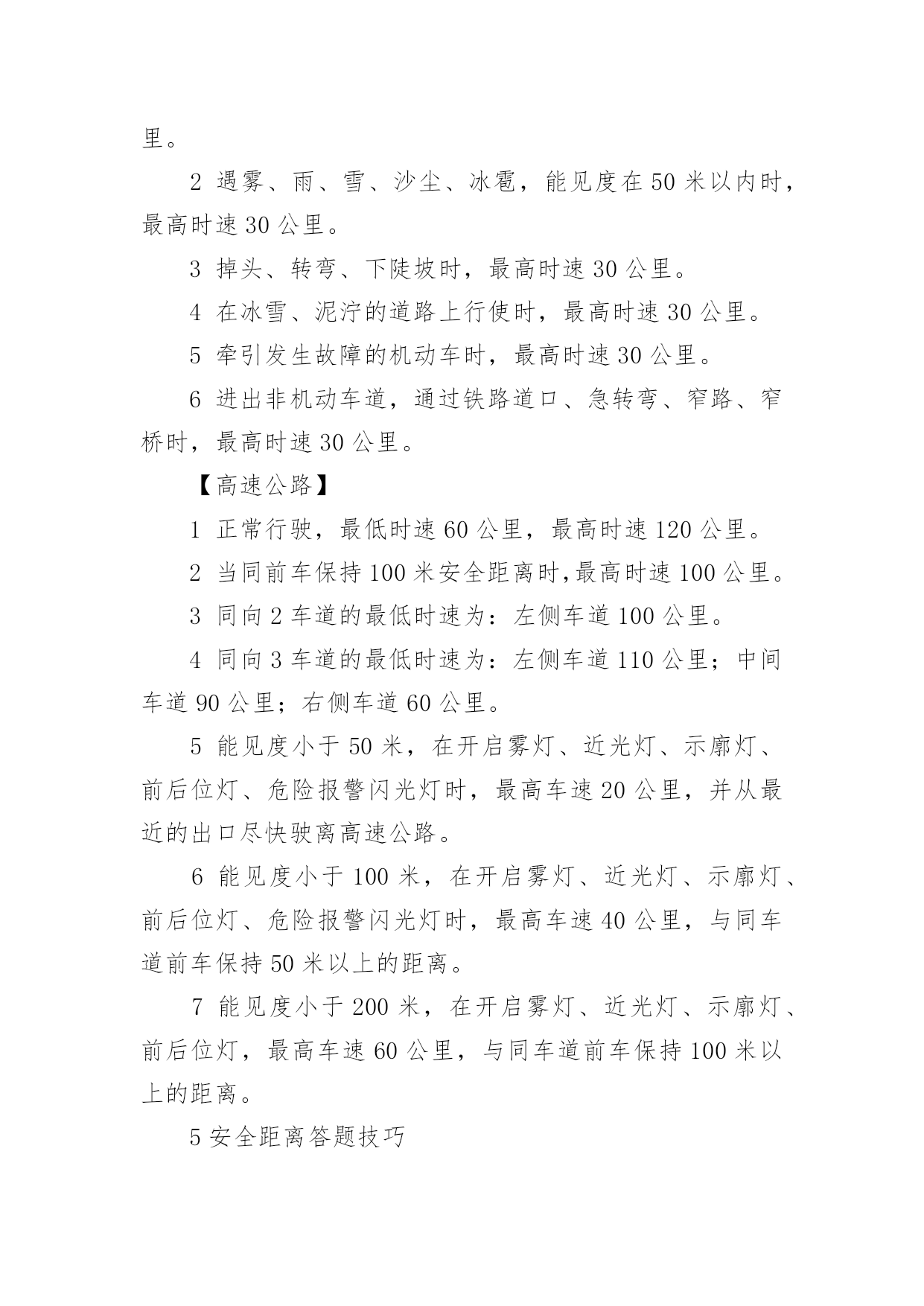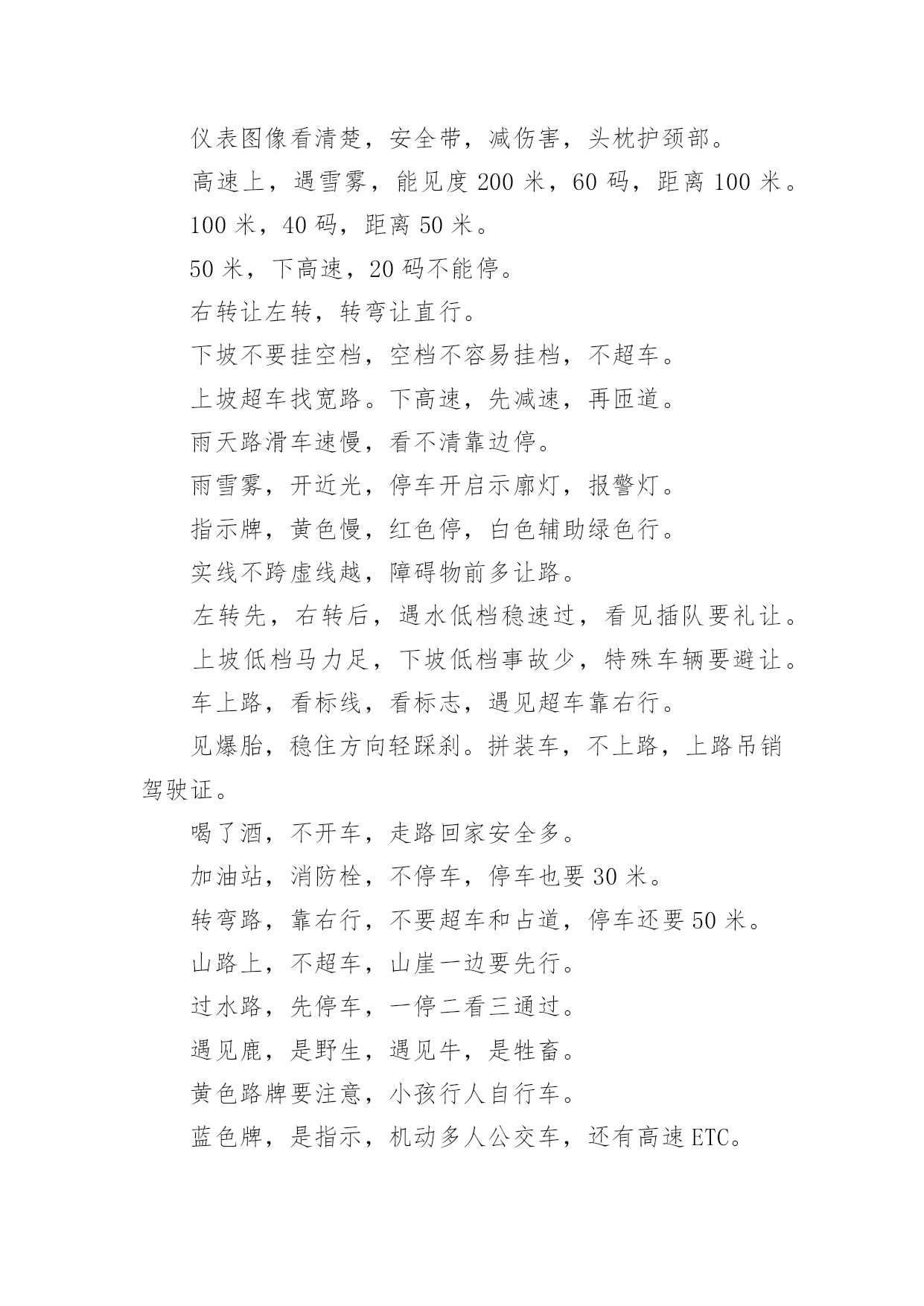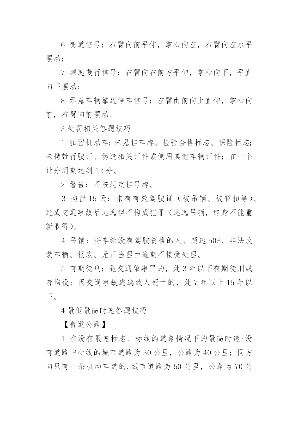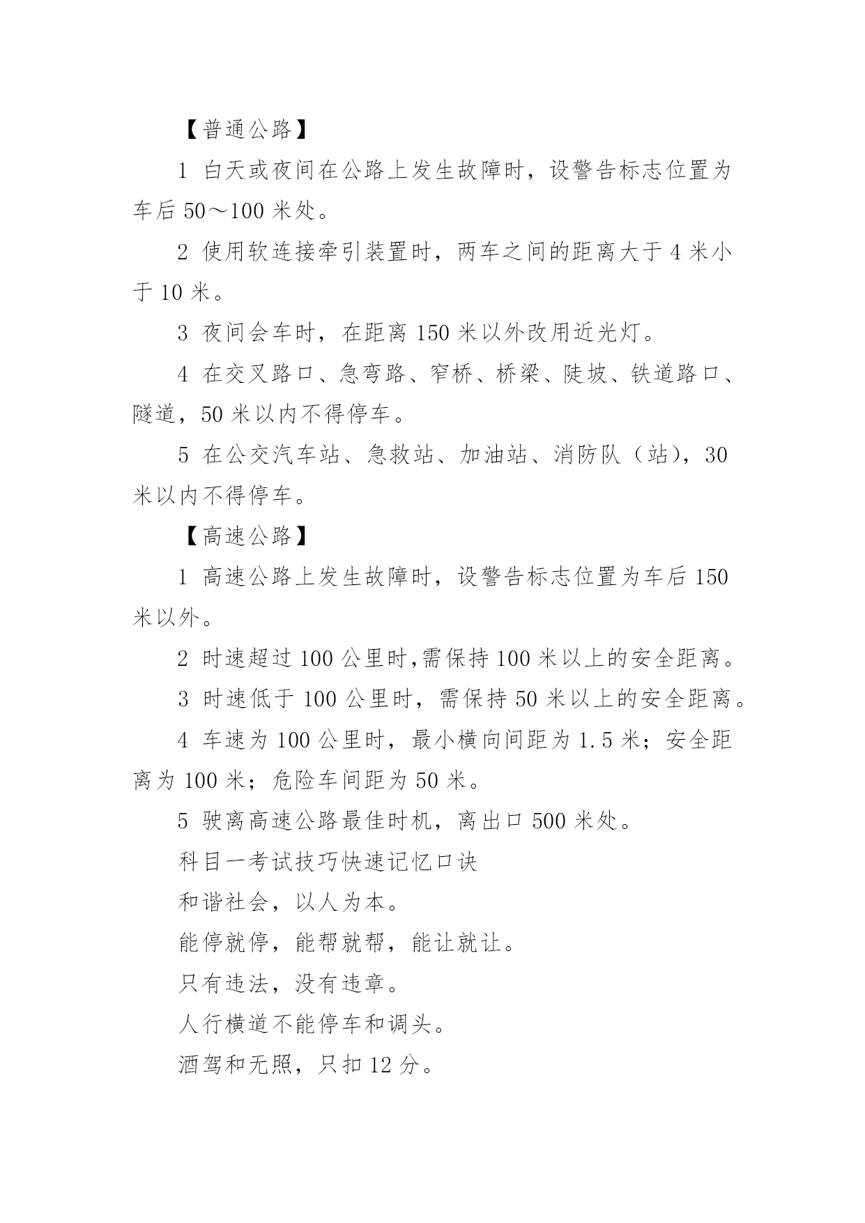 科目一考试的相关技巧科目一考试的相关技巧科目一,又称科目一理论考试、驾驶员理论考试,是机动车驾驶证考核的一部分。以下是小编收集的科目一考试的相关技巧容,欢迎查看!1交规相关答题技巧1答题只有一个原则——安全,怎么做安全就怎么做。2判断题中遇到紧急情况所有过激行为都错,比如急踩(用力踏)油门(制动),急转方向,选择题中类似的答案都错。3能让行的都让行,能帮助的都帮助,能避让就避让,只要不抢、不急都对。4抢救伤员一个原则先救人,救人一个原则先止血。5无标志无灯无警路口,按照让右路——让左转——让直行的顺序判断。6车辆变换位置都要开转向灯,唯一一个不开的就是进环岛(转盘)。2八种交警手势信号答题技巧1停止信号:左臂由前向上直伸,掌心向前;2直行信号:两手平伸右手摆;3左转弯信号:右臂向前平伸,左手向右摆动;4右转弯信号:左臂向前平伸,右手向左摆动;5左转弯待转信号:左臂向左平伸成45度,上下摆动;6变道信号:右臂向前平伸,掌心向左,右臂向左水平摆动;7减速慢行信号:右臂向右前方平伸,掌心向下,平直向下摆动;8示意车辆靠边停车信号:左臂由前向上直伸,掌心向前,右臂向前摆动。3处罚相关答题技巧1扣留机动车:未悬挂车牌、检验合格标志、保险标志;未携带行驶证、伪造相关证件或使用其他车辆证件;在一个计分周期达到12分。2警告:不按规定挂号牌。3拘留15天:未有有效驾驶证(被吊销、被暂扣等)、造成交通事故后逃逸但不构成犯罪(逃逸吊销,终身不能重新取得)。4吊销:将车给没有驾驶资格的人、超速50%、非法改装车辆、报废、无正当理由逾期不接受处理。5有期徒刑:犯交通肇事罪的,处3年以下有期徒刑或者拘役;因交通事故逃逸致人死亡的,处7年以上15年以下。4最低最高时速答题技巧【普通公路】1在没有限速标志、标线的道路情况下的最高时速:没有道路中心线的城市道路为30公里,公路为40公里;同方向只有一条机动车道的.城市道路为50公里,公路为70公里。2遇雾、雨、雪、沙尘、冰雹,能见度在50米以内时,最高时速30公里。3掉头、转弯、下陡坡时,最高时速30公里。4在冰雪、泥泞的道路上行使时,最高时速30公里。5牵引发生故障的机动车时,最高时速30公里。6进出非机动车道,通过铁路道口、急转弯、窄路、窄桥时,最高时速30公里。【高速公路】1正常行驶,最低时速60公里,最高时速120公里。2当同前车保持100米安全距离时,最高时速100公里。3同向2车道的最低时速为:左侧车道100公里。4同向3车道的最低时速为:左侧车道110公里;中间车道90公里;右侧车道60公里。5能见度小于50米,在开启雾灯、近光灯、示廓灯、前后位灯、危险报警闪光灯时,最高车速20公里,并从最近的出口尽快驶离高速公路。6能见度小于100米,在开启雾灯、近光灯、示廓灯、前后位灯、危险报警闪光灯时,最高车速40公里,与同车道前车保持50米以上的距离。7能见度小于200米,在开启雾灯、近光灯、示廓灯、前后位灯,最高车速60公里,与同车道前车保持100米以上的距离。5安全距离答题技巧【普通公路】1白天或夜间在公路上发生故障时,设警告标志位置为车后50~100米处。2使用软连接牵引装置时,两车之间的距离大于4米小于10米。3夜间会车时,在距离150米以外改用近光灯。4在交叉路口、急弯路、窄桥、桥梁、陡坡、铁道路口、隧道,50米以内不得停车。5在公交汽车站、急救站、加油站、消防队(站),30米以内不得停车。【高速公路】1高速公路上发生故障时,设警告标志位置为车后150米以外。2时速超过100公里时,需保持100米以上的安全距离。3时速低于100公里时,需保持50米以上的安全距离。4车速为100公里时,最小横向间距为1.5米;安全距离为100米;危险车间距为50米。5驶离高速公路最佳时机,离出口500米处。科目一考试技巧快速记忆口诀和谐社会,以人为本。能停就停,能帮就帮,能让就让。只有违法,没有违章。人行横道不能停车和调头。酒驾和无照,只扣12分。仪表图像看清楚,安全带,减伤害,头枕护颈部。高速上,遇雪雾,能见度200米,60码,距离100米。100米,40码,距离50米。50米,下高速,20码不能停。右转让左转,转弯让直行。下坡不要挂空档,空档不容易挂档,不超车。上坡超车找宽路。下高速,先减速,再匝道。雨天路滑车速慢,看不清靠边停。雨雪雾,开近光,停车开启示廓灯,报警灯。指示牌,黄色慢,红色停,白色辅助绿色行。实线不跨虚线越,障碍物前多让路。左转先,右转后,遇水低档稳速过,看见插队要礼让。上坡低档马力足,下坡低档事故少,特殊车辆要避让。车上路,看标线,看标志,遇见超车靠右行。见爆胎,稳住方向轻踩刹。拼装车,不上路,上路吊销驾驶证。喝了酒,不开车,走路回家安全多。加油站,消防栓,不停车,停车也要30米。转弯
