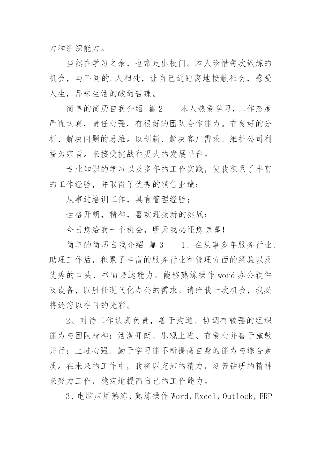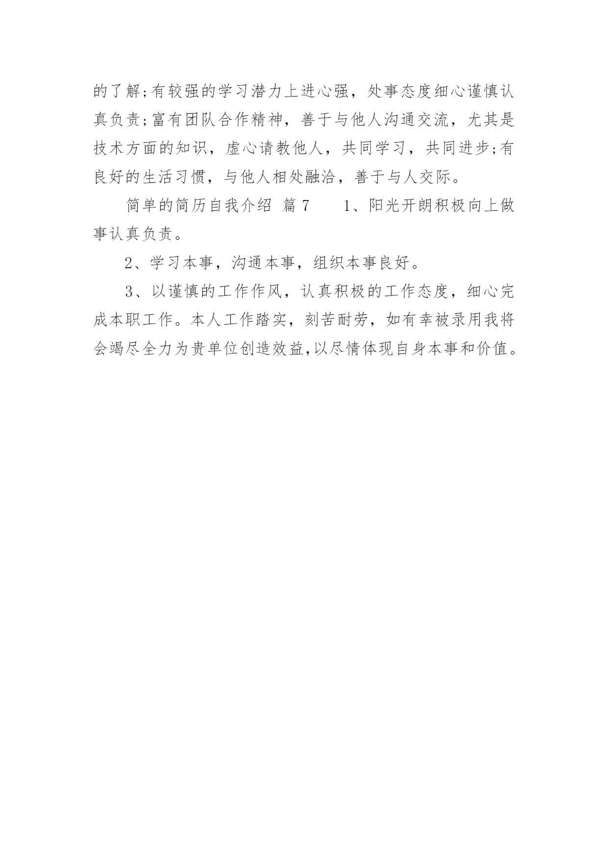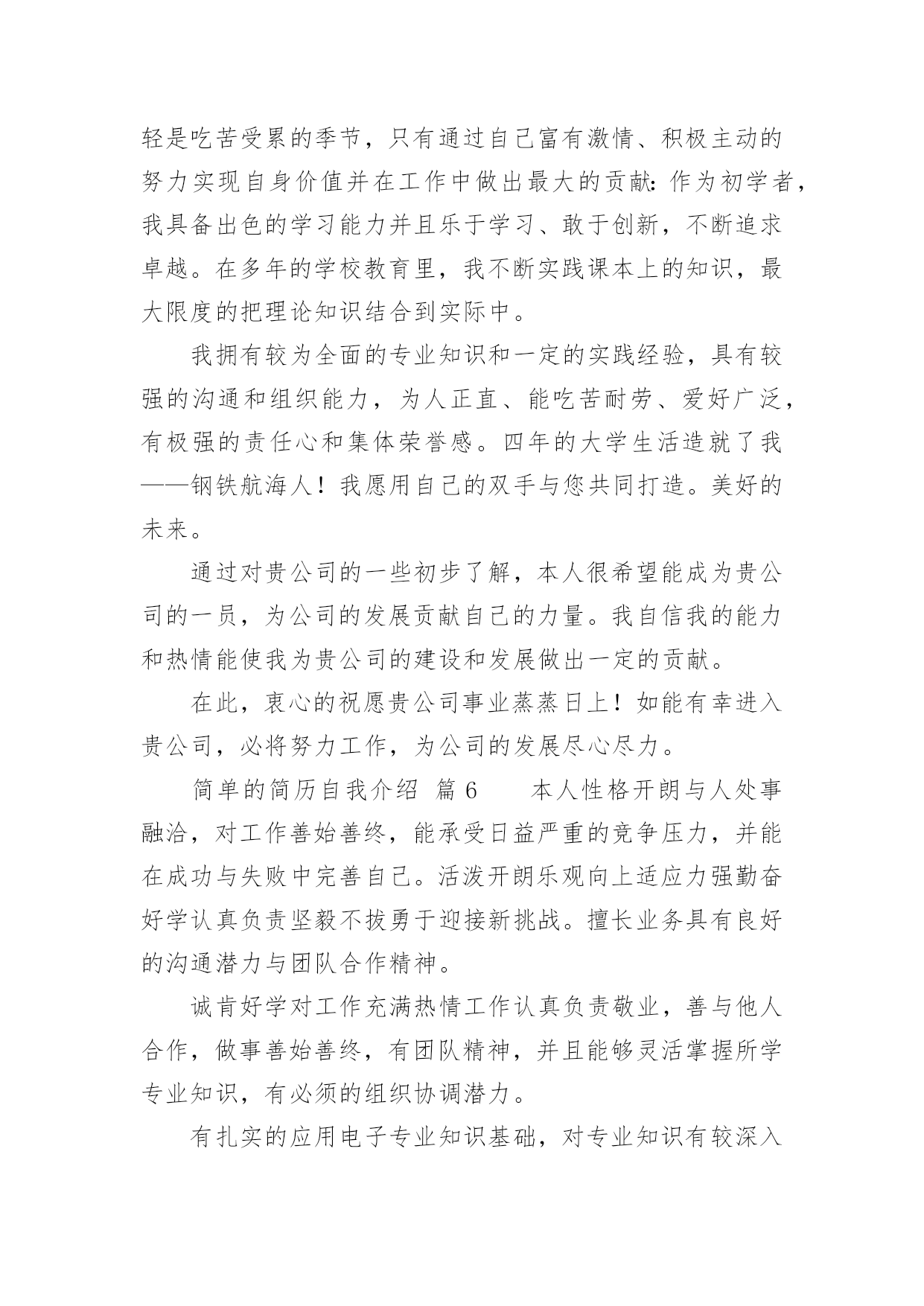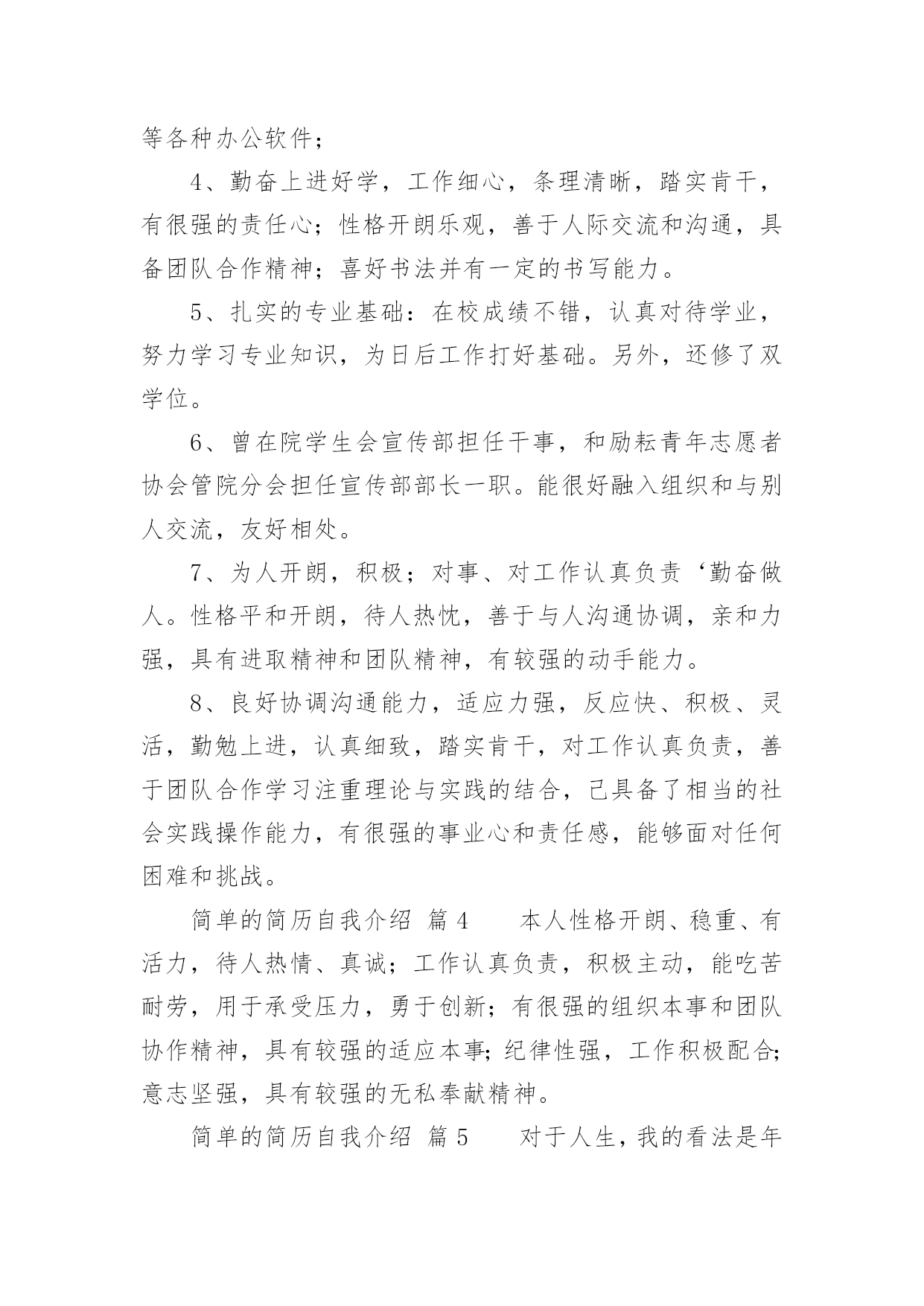 简单的简历自我介绍简单的简历自我介绍范文(通用7篇)当来到一个陌生环境中,我们往往需要进行适当的自我介绍,自我介绍有助于自我宣传、自我展示。相信许多人会觉得自我介绍很难写吧,下面是小编为大家整理的简单的简历自我介绍,欢迎大家借鉴与参考,希望对大家有所帮助。简单的简历自我介绍篇1首先,作为一个中国人,我有很强的民族自尊心和自豪感。能够自觉遵守公共秩序和交通法规,能很好的服从学校及各项规定的管理。真诚待人,乐于助人,乐于参加集体活动,珍惜集体荣誉,能维护集体利益。常能够很好表达个人观点,并尊重他人和理解他人的观点及处境,善于与他人交流与合作,能做到与别人分享自己的快乐,能够建立融合的人际关系。能够细心观察生活和积累生活经验,去感悟知识与生活的联系,会尝试解决生活中的问题,能够参与探究讨论活动,能初步掌握研究问题的方法。乐于参与社会实践活动,发展实践能力,有创造性解决问题的愿望,能运用多种方法从不同角度探究问题在实验活动中能大胆动手操作。总而言之,本人在校热爱祖国,尊敬师长,团结同学,乐于助人,是老师的好帮手,同学的好朋友。我学习勤奋,积极向上,喜欢和同学讨论并解决问题,经常参加班级学校组织的各种课内外活动。本人品德兼优、性格开朗、热爱生活,有较强的实践能力和组织能力。当然在学习之余,也常走出校门。本人珍惜每次锻炼的机会,与不同的.人相处,让自己近距离地接触社会,感受人生,品味生活的酸甜苦辣。简单的简历自我介绍篇2本人热爱学习,工作态度严谨认真,责任心强,有很好的团队合作能力。有良好的分析、解决问题的思维。以创新、解决客户需求、维护公司利益为宗旨。来接受挑战和更大的发展平台。专业知识的学习以及多年的工作实践,使我积累了丰富的工作经验,并取得了优秀的销售业绩;从事过培训工作,具有管理经验;性格开朗,精神,喜欢迎接新的挑战;今日您给我一个机会,明天我必还您惊喜!简单的简历自我介绍篇31、在从事多年服务行业、助理工作后,积累了丰富的服务行业和管理方面的经验以及优秀的口头、书面表达能力。能够熟练操作word办公软件及设备,以胜任现代化办公的需求。请给我一次机会,我必将还您以夺目的光彩。2、对待工作认真负责,善于沟通、协调有较强的组织能力与团队精神;活泼开朗、乐观上进、有爱心并善于施教并行;上进心强、勤于学习能不断提高自身的能力与综合素质。在未来的工作中,我将以充沛的精力,刻苦钻研的精神来努力工作,稳定地提高自己的工作能力。3、电脑应用熟练,熟练操作Word,Excel,Outlook,ERP等各种办公软件;4、勤奋上进好学,工作细心,条理清晰,踏实肯干,有很强的责任心;性格开朗乐观,善于人际交流和沟通,具备团队合作精神;喜好书法并有一定的书写能力。5、扎实的专业基础:在校成绩不错,认真对待学业,努力学习专业知识,为日后工作打好基础。另外,还修了双学位。6、曾在院学生会宣传部担任干事,和励耘青年志愿者协会管院分会担任宣传部部长一职。能很好融入组织和与别人交流,友好相处。7、为人开朗,积极;对事、对工作认真负责‘勤奋做人。性格平和开朗,待人热忱,善于与人沟通协调,亲和力强,具有进取精神和团队精神,有较强的动手能力。8、良好协调沟通能力,适应力强,反应快、积极、灵活,勤勉上进,认真细致,踏实肯干,对工作认真负责,善于团队合作学习注重理论与实践的结合,己具备了相当的社会实践操作能力,有很强的事业心和责任感,能够面对任何困难和挑战。简单的简历自我介绍篇4本人性格开朗、稳重、有活力,待人热情、真诚;工作认真负责,积极主动,能吃苦耐劳,用于承受压力,勇于创新;有很强的组织本事和团队协作精神,具有较强的适应本事;纪律性强,工作积极配合;意志坚强,具有较强的无私奉献精神。简单的简历自我介绍篇5对于人生,我的看法是年轻是吃苦受累的季节,只有通过自己富有激情、积极主动的努力实现自身价值并在工作中做出最大的贡献:作为初学者,我具备出色的学习能力并且乐于学习、敢于创新,不断追求卓越。在多年的学校教育里,我不断实践课本上的知识,最大限度的把理论知识结合到实际中。我拥有较为全面的专业知识和一定的实践经验,具有较强的沟通和组织能力,为人正直、能吃苦耐劳、爱好广泛,有极强的责任心和集体荣誉感。四年的大学生活造就了我——钢铁航海人!我愿用自己的双手与您共同打造。美好的未来。通过对贵公司的一些初步了解,本人很希望能成为贵公司的一员,为公司的发展贡献自己的力量。我自信我的能力和热情能使我为贵公司的建设和发展做出一定的贡献。在此,衷心的祝愿贵公司事业蒸蒸日上!如能有幸进入贵公司,必将努力工作,为公司的发展尽心尽力。简单的简历自我介绍篇6本人性格开朗与人处事融洽,对工作善始善终,能承受日益严重的竞争压力,并能在成功与失败中完善自己。活泼开朗乐观向上适应力强勤奋好学认真负责坚毅不拔