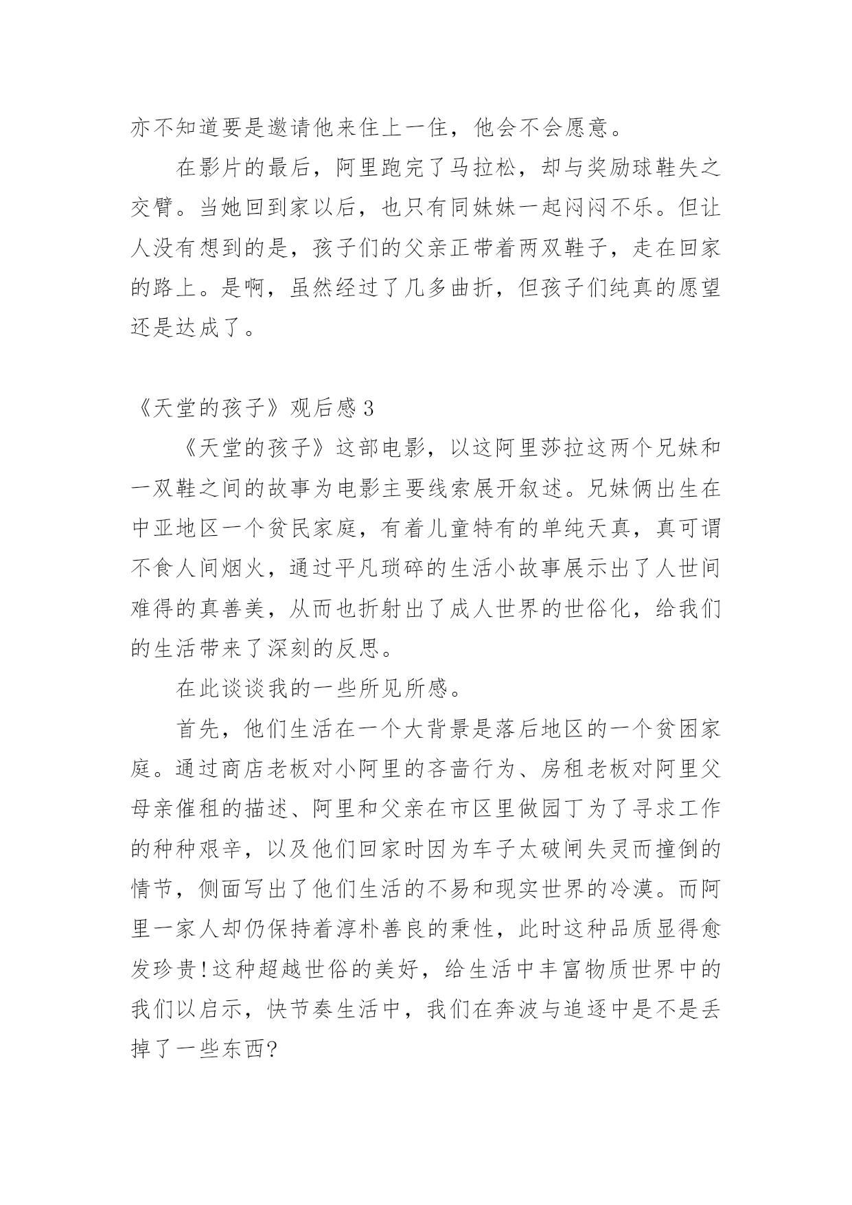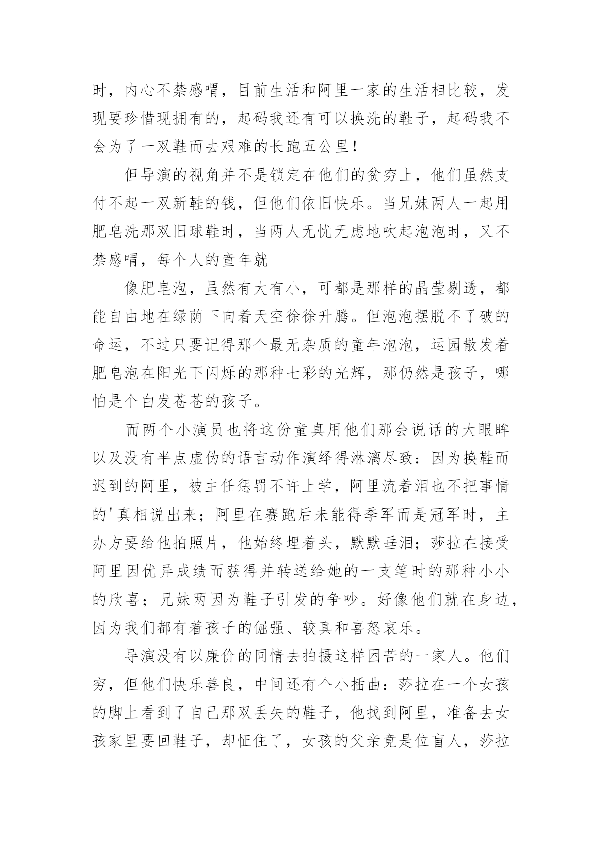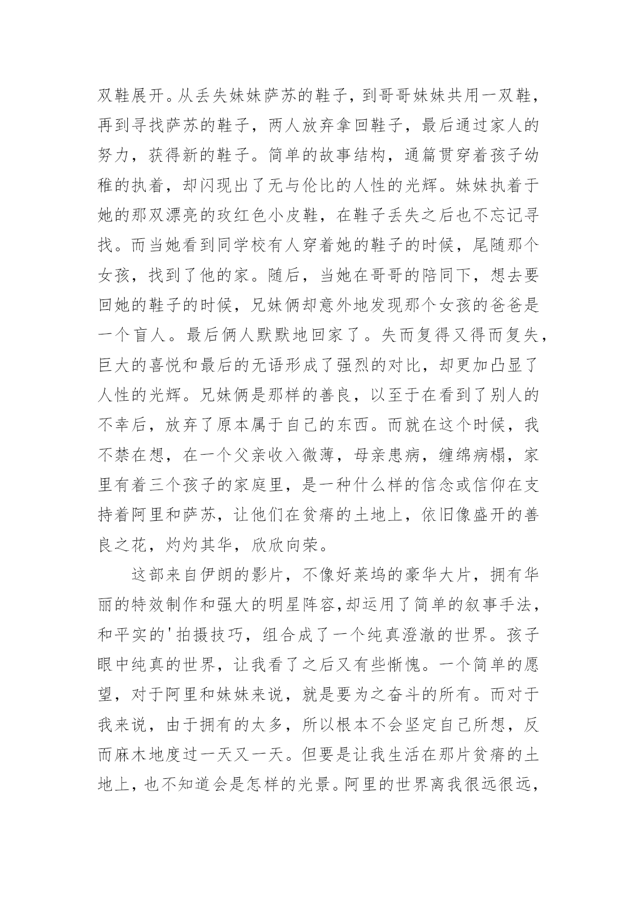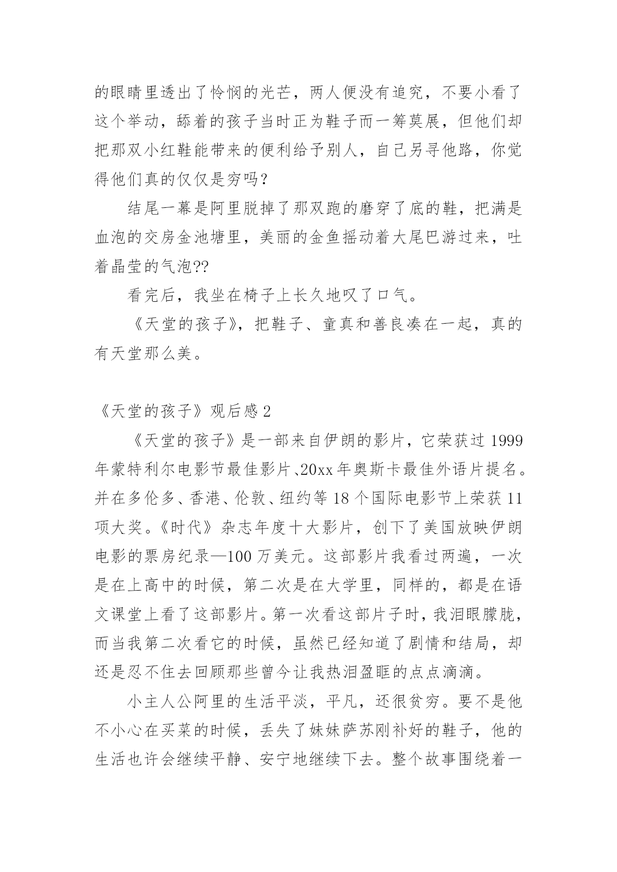 《天堂的孩子》观后感《天堂的孩子》观后感10篇认真观看完一部影视作品以后,对人生或者事物一定产生了许多感想吧,是时候抽出时间写写观后感了。那么我们该怎么去写观后感呢?以下是小编为大家整理的《天堂的孩子》观后感,仅供参考,欢迎大家阅读。《天堂的孩子》观后感1偶然得知这部电影,纳罕,怎么是“天堂的孩子”,便看了一遍,带着感动接受了一次关于鞋子、童真和善良的洗礼。故事是这样的:小男孩阿里是伊朗的一个贫困家庭的孩子。他有一个患病的妈妈、读一年级的妹妹莎拉和一个收入微薄的父亲。阿里不小心弄丢了妹妹的鞋子,而他父亲并没有多余的钱给妹妹莎拉买新鞋。阿里便悄悄地和莎拉商量,伦理讹传他的酒球鞋去上学。后来而他得知,有一场长跑比赛,季军奖品是一双新球鞋,阿里便参加了比赛,不料却意外获得了冠军??为什么要打一个省略号?因为故事并不是这样平淡地结局。影片最后一幕,阿里的父亲赶集回家,篮子里静静的躺着两双给孩子们的新鞋。而阿里、莎拉并不知情。没得到季军却捧回冠军奖杯的阿里难过的靠在墙边。莎拉看见阿里手中并没有许诺过的球鞋,只有阿里那双伤心的大眼睛,。莎拉上扬的嘴角慢慢的由微笑转为伤心而委屈。当看到这里时,内心不禁感喟,目前生活和阿里一家的生活相比较,发现要珍惜现拥有的,起码我还有可以换洗的鞋子,起码我不会为了一双鞋而去艰难的长跑五公里!但导演的视角并不是锁定在他们的贫穷上,他们虽然支付不起一双新鞋的钱,但他们依旧快乐。当兄妹两人一起用肥皂洗那双旧球鞋时,当两人无忧无虑地吹起泡泡时,又不禁感喟,每个人的童年就像肥皂泡,虽然有大有小,可都是那样的晶莹剔透,都能自由地在绿荫下向着天空徐徐升腾。但泡泡摆脱不了破的命运,不过只要记得那个最无杂质的童年泡泡,运园散发着肥皂泡在阳光下闪烁的那种七彩的光辉,那仍然是孩子,哪怕是个白发苍苍的孩子。而两个小演员也将这份童真用他们那会说话的大眼眸以及没有半点虚伪的语言动作演绎得淋漓尽致:因为换鞋而迟到的阿里,被主任惩罚不许上学,阿里流着泪也不把事情的'真相说出来;阿里在赛跑后未能得季军而是冠军时,主办方要给他拍照片,他始终埋着头,默默垂泪;莎拉在接受阿里因优异成绩而获得并转送给她的一支笔时的那种小小的欣喜;兄妹两因为鞋子引发的争吵。好像他们就在身边,因为我们都有着孩子的倔强、较真和喜怒哀乐。导演没有以廉价的同情去拍摄这样困苦的一家人。他们穷,但他们快乐善良,中间还有个小插曲:莎拉在一个女孩的脚上看到了自己那双丢失的鞋子,他找到阿里,准备去女孩家里要回鞋子,却怔住了,女孩的父亲竟是位盲人,莎拉的眼睛里透出了怜悯的光芒,两人便没有追究,不要小看了这个举动,舔着的孩子当时正为鞋子而一筹莫展,但他们却把那双小红鞋能带来的便利给予别人,自己另寻他路,你觉得他们真的仅仅是穷吗?结尾一幕是阿里脱掉了那双跑的磨穿了底的鞋,把满是血泡的交房金池塘里,美丽的金鱼摇动着大尾巴游过来,吐着晶莹的气泡??看完后,我坐在椅子上长久地叹了口气。《天堂的孩子》,把鞋子、童真和善良凑在一起,真的有天堂那么美。《天堂的孩子》观后感2《天堂的孩子》是一部来自伊朗的影片,它荣获过1999年蒙特利尔电影节最佳影片、20xx年奥斯卡最佳外语片提名。并在多伦多、香港、伦敦、纽约等18个国际电影节上荣获11项大奖。《时代》杂志年度十大影片,创下了美国放映伊朗电影的票房纪录—100万美元。这部影片我看过两遍,一次是在上高中的时候,第二次是在大学里,同样的,都是在语文课堂上看了这部影片。第一次看这部片子时,我泪眼朦胧,而当我第二次看它的时候,虽然已经知道了剧情和结局,却还是忍不住去回顾那些曾今让我热泪盈眶的点点滴滴。小主人公阿里的生活平淡,平凡,还很贫穷。要不是他不小心在买菜的时候,丢失了妹妹萨苏刚补好的鞋子,他的生活也许会继续平静、安宁地继续下去。整个故事围绕着一双鞋展开。从丢失妹妹萨苏的鞋子,到哥哥妹妹共用一双鞋,再到寻找萨苏的鞋子,两人放弃拿回鞋子,最后通过家人的努力,获得新的鞋子。简单的故事结构,通篇贯穿着孩子幼稚的执着,却闪现出了无与伦比的人性的光辉。妹妹执着于她的那双漂亮的玫红色小皮鞋,在鞋子丢失之后也不忘记寻找。而当她看到同学校有人穿着她的鞋子的时候,尾随那个女孩,找到了他的家。随后,当她在哥哥的陪同下,想去要回她的鞋子的时候,兄妹俩却意外地发现那个女孩的爸爸是一个盲人。最后俩人默默地回家了。失而复得又得而复失,巨大的喜悦和最后的无语形成了强烈的对比,却更加凸显了人性的光辉。兄妹俩是那样的善良,以至于在看到了别人的不幸后,放弃了原本属于自己的东西。而就在这个时候,我不禁在想,在一个父亲收入微薄,母亲患病,缠绵病榻,家里有着三个孩子的家庭里,是一种什么样的信念或信仰在支持着阿里和萨苏,让他们在贫瘠的土地上,依旧像盛开的善良之花,灼灼其华,欣欣向荣。这部来自伊朗