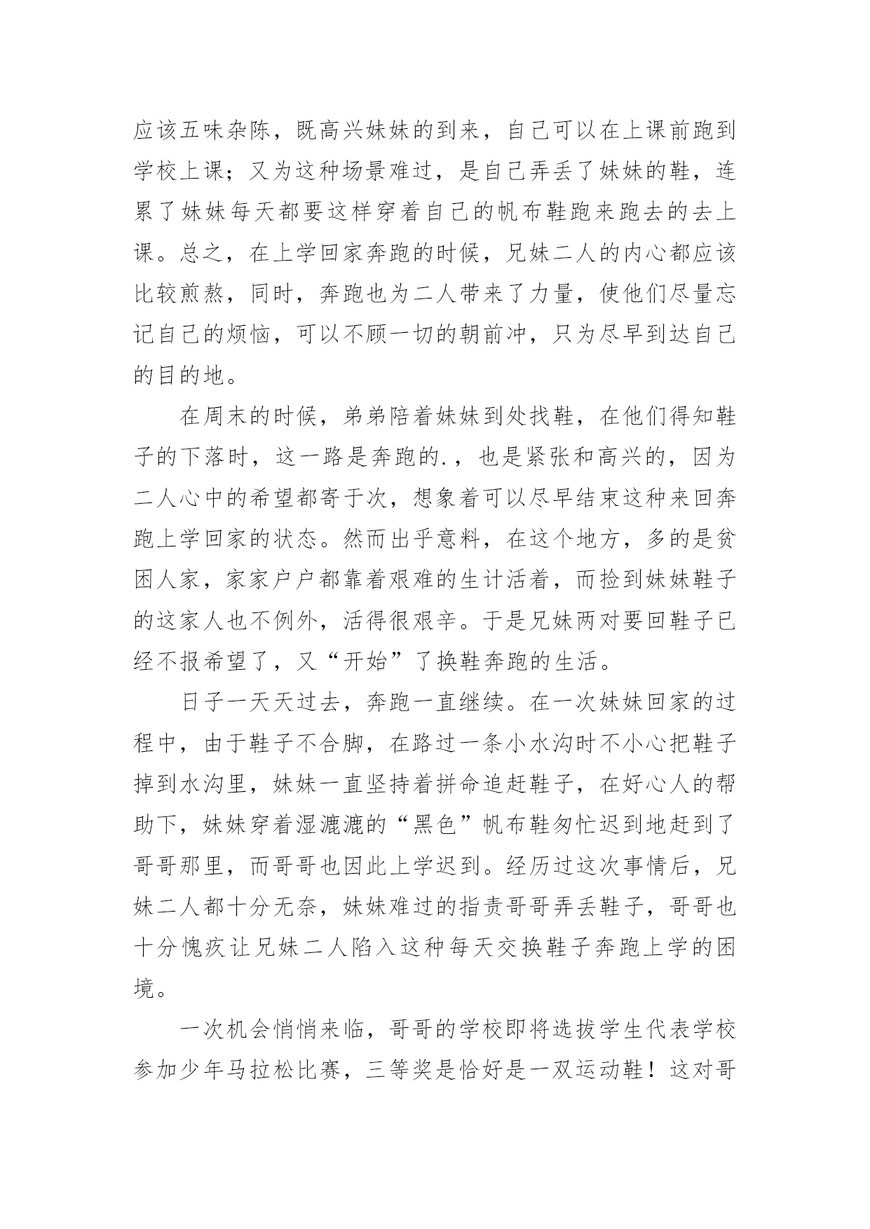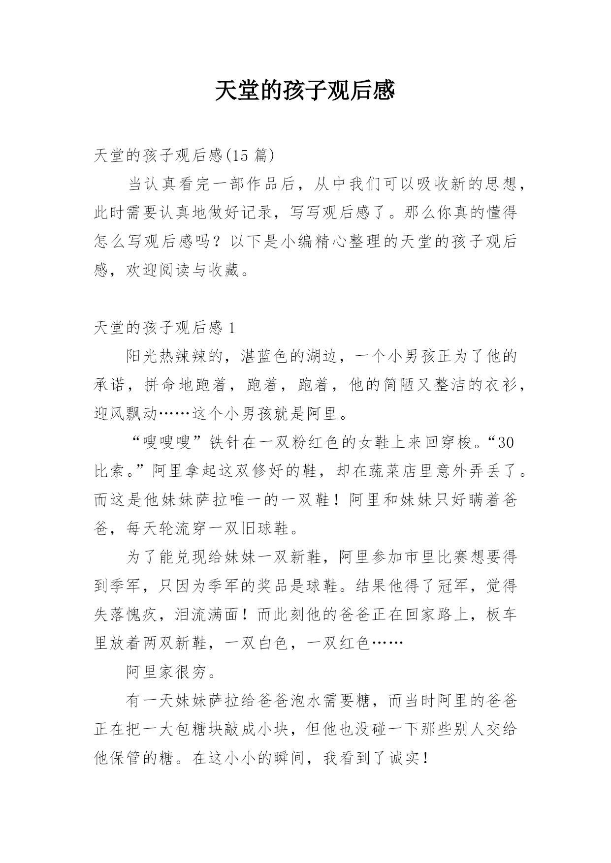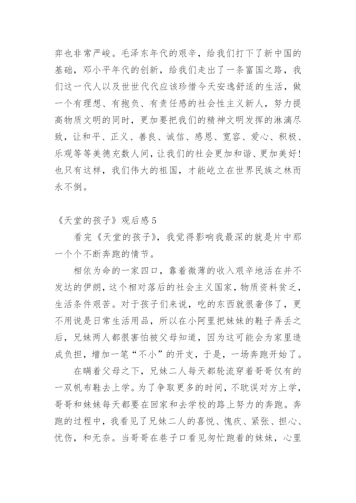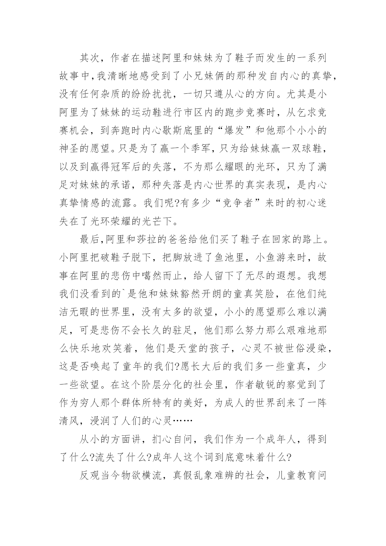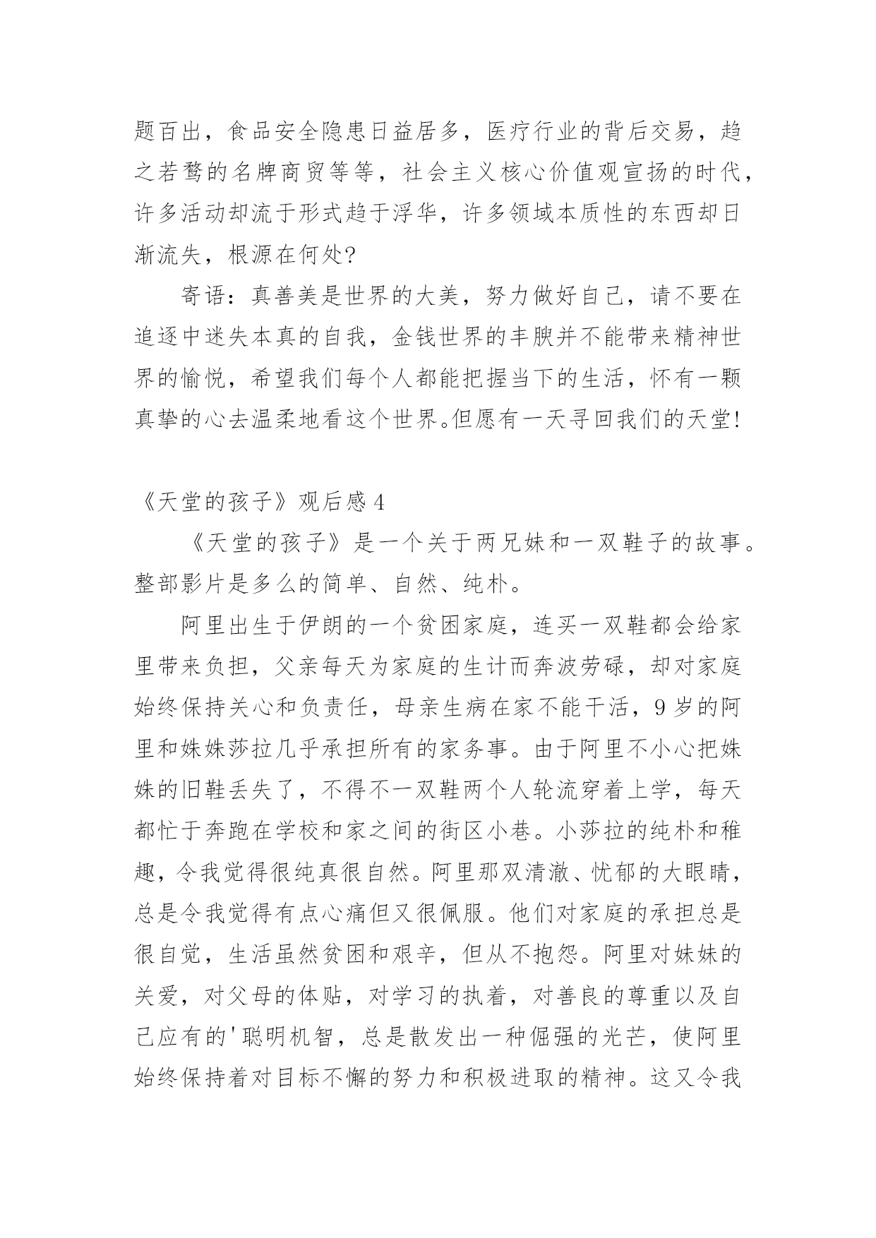 《天堂的孩子》观后感《天堂的孩子》观后感10篇认真观看完一部影视作品以后,对人生或者事物一定产生了许多感想吧,是时候抽出时间写写观后感了。那么我们该怎么去写观后感呢?以下是小编为大家整理的《天堂的孩子》观后感,仅供参考,欢迎大家阅读。《天堂的孩子》观后感1偶然得知这部电影,纳罕,怎么是“天堂的孩子”,便看了一遍,带着感动接受了一次关于鞋子、童真和善良的洗礼。故事是这样的:小男孩阿里是伊朗的一个贫困家庭的孩子。他有一个患病的妈妈、读一年级的妹妹莎拉和一个收入微薄的父亲。阿里不小心弄丢了妹妹的鞋子,而他父亲并没有多余的钱给妹妹莎拉买新鞋。阿里便悄悄地和莎拉商量,伦理讹传他的酒球鞋去上学。后来而他得知,有一场长跑比赛,季军奖品是一双新球鞋,阿里便参加了比赛,不料却意外获得了冠军??为什么要打一个省略号?因为故事并不是这样平淡地结局。影片最后一幕,阿里的父亲赶集回家,篮子里静静的躺着两双给孩子们的新鞋。而阿里、莎拉并不知情。没得到季军却捧回冠军奖杯的阿里难过的靠在墙边。莎拉看见阿里手中并没有许诺过的球鞋,只有阿里那双伤心的大眼睛,。莎拉上扬的嘴角慢慢的由微笑转为伤心而委屈。当看到这里时,内心不禁感喟,目前生活和阿里一家的生活相比较,发现要珍惜现拥有的,起码我还有可以换洗的鞋子,起码我不会为了一双鞋而去艰难的长跑五公里!但导演的视角并不是锁定在他们的贫穷上,他们虽然支付不起一双新鞋的钱,但他们依旧快乐。当兄妹两人一起用肥皂洗那双旧球鞋时,当两人无忧无虑地吹起泡泡时,又不禁感喟,每个人的童年就像肥皂泡,虽然有大有小,可都是那样的晶莹剔透,都能自由地在绿荫下向着天空徐徐升腾。但泡泡摆脱不了破的命运,不过只要记得那个最无杂质的童年泡泡,运园散发着肥皂泡在阳光下闪烁的那种七彩的光辉,那仍然是孩子,哪怕是个白发苍苍的孩子。而两个小演员也将这份童真用他们那会说话的大眼眸以及没有半点虚伪的语言动作演绎得淋漓尽致:因为换鞋而迟到的阿里,被主任惩罚不许上学,阿里流着泪也不把事情的'真相说出来;阿里在赛跑后未能得季军而是冠军时,主办方要给他拍照片,他始终埋着头,默默垂泪;莎拉在接受阿里因优异成绩而获得并转送给她的一支笔时的那种小小的欣喜;兄妹两因为鞋子引发的争吵。好像他们就在身边,因为我们都有着孩子的倔强、较真和喜怒哀乐。导演没有以廉价的同情去拍摄这样困苦的一家人。他们穷,但他们快乐善良,中间还有个小插曲:莎拉在一个女孩的脚上看到了自己那双丢失的鞋子,他找到阿里,准备去女孩家里要回鞋子,却怔住了,女孩的父亲竟是位盲人,莎拉的眼睛里透出了怜悯的光芒,两人便没有追究,不要小看了这个举动,舔着的孩子当时正为鞋子而一筹莫展,但他们却把那双小红鞋能带来的便利给予别人,自己另寻他路,你觉得他们真的仅仅是穷吗?结尾一幕是阿里脱掉了那双跑的磨穿了底的鞋,把满是血泡的交房金池塘里,美丽的金鱼摇动着大尾巴游过来,吐着晶莹的气泡??看完后,我坐在椅子上长久地叹了口气。《天堂的孩子》,把鞋子、童真和善良凑在一起,真的有天堂那么美。《天堂的孩子》观后感2《天堂的孩子》是一部来自伊朗的影片,它荣获过1999年蒙特利尔电影节最佳影片、20xx年奥斯卡最佳外语片提名。并在多伦多、香港、伦敦、纽约等18个国际电影节上荣获11项大奖。《时代》杂志年度十大影片,创下了美国放映伊朗电影的票房纪录—100万美元。这部影片我看过两遍,一次是在上高中的时候,第二次是在大学里,同样的,都是在语文课堂上看了这部影片。第一次看这部片子时,我泪眼朦胧,而当我第二次看它的时候,虽然已经知道了剧情和结局,却还是忍不住去回顾那些曾今让我热泪盈眶的点点滴滴。小主人公阿里的生活平淡,平凡,还很贫穷。要不是他不小心在买菜的时候,丢失了妹妹萨苏刚补好的鞋子,他的生活也许会继续平静、安宁地继续下去。整个故事围绕着一双鞋展开。从丢失妹妹萨苏的鞋子,到哥哥妹妹共用一双鞋,再到寻找萨苏的鞋子,两人放弃拿回鞋子,最后通过家人的努力,获得新的鞋子。简单的故事结构,通篇贯穿着孩子幼稚的执着,却闪现出了无与伦比的人性的光辉。妹妹执着于她的那双漂亮的玫红色小皮鞋,在鞋子丢失之后也不忘记寻找。而当她看到同学校有人穿着她的鞋子的时候,尾随那个女孩,找到了他的家。随后,当她在哥哥的陪同下,想去要回她的鞋子的时候,兄妹俩却意外地发现那个女孩的爸爸是一个盲人。最后俩人默默地回家了。失而复得又得而复失,巨大的喜悦和最后的无语形成了强烈的对比,却更加凸显了人性的光辉。兄妹俩是那样的善良,以至于在看到了别人的不幸后,放弃了原本属于自己的东西。而就在这个时候,我不禁在想,在一个父亲收入微薄,母亲患病,缠绵病榻,家里有着三个孩子的家庭里,是一种什么样的信念或信仰在支持着阿里和萨苏,让他们在贫瘠的土地上,依旧像盛开的善良之花,灼灼其华,欣欣向荣。这部来自伊朗