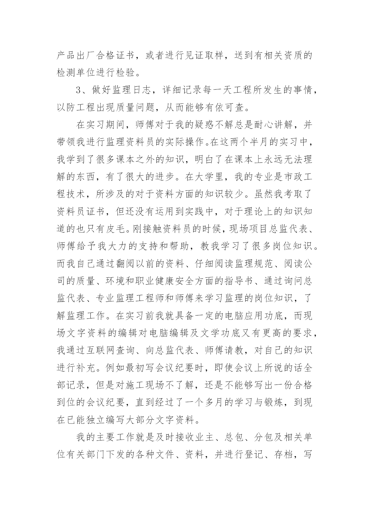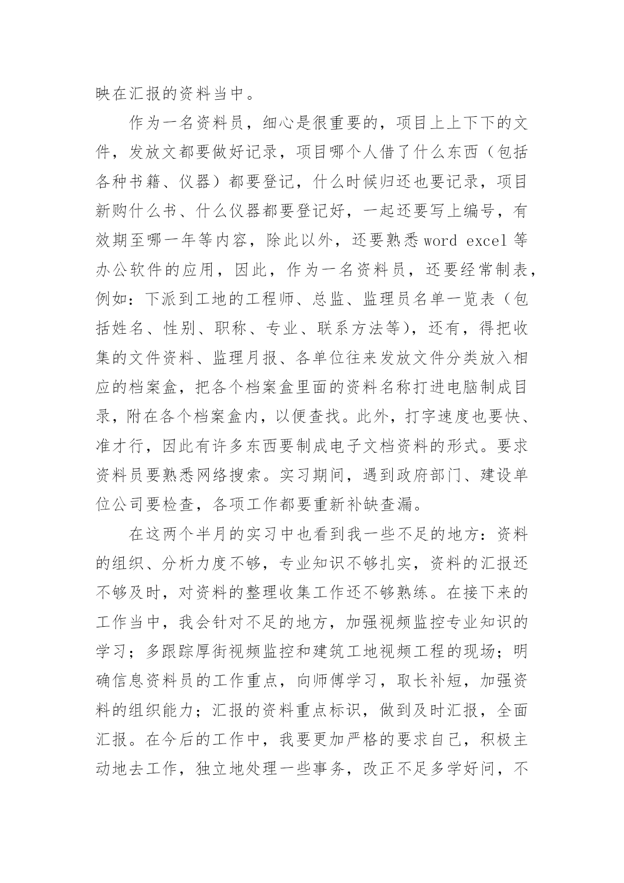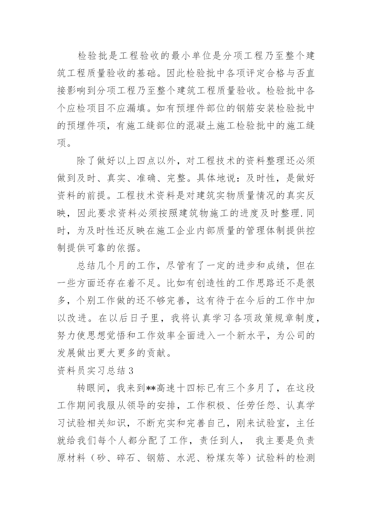 资料员实习总结资料员实习总结15篇(优秀)总结是指对某一阶段的工作、学习或思想中的经验或情况加以总结和概括的书面材料,它可以提升我们发现问题的能力,因此我们需要回头归纳,写一份总结了。那么你真的懂得怎么写总结吗?下面是小编帮大家整理的资料员实习总结,希望对大家有所帮助。资料员实习总结1人非生而知之,要求得知识,一靠学习,二靠实践,离开了实践,学习也就成了无源之水,无本之本。实践离不开正确理论的指导,否则在实践中就会彷徨、犹豫、无所适从;懂得了书本知识,有了理论,不付诸于实践,知识、理论就又成了装横门面的东西。这是我在两个半月实习中的一点体会感悟。现在将我在上海市建科建设监理咨询有限公司下的上海西站综合交通枢纽南广场及地下空间(一期)工程项目部实习做如下总结:在20xx年xx月xx日,我以实习生的身份来到该工程项目部。本工程主体建筑为一个局部含夹层的地下2层的结构,主要由交通换乘、公共配套服务和地下车库组成,基地面积约为13500,平面为一不规则四边形。本工程北侧与已经建成的上海市轨道交通11号线北段工程中的上海西站站相邻,东侧部分与上海市轨道交通网络中的15号线上海西站站相接,南临桃浦路,西侧为规划商办用地。主体结构采用现浇钢筋混凝土框架结构,围护结构采用地下连续墙支护,其中北侧围护结构利用已有11号线上海西站站的地下连续墙,东侧部分结合15号线上海西站的围护结构。基坑开挖深度约为13。25m,北区采用顺作法施工,南区采用逆作法施工。首先师傅让我看了很多监理资料员的管理手册、监理规范、监理实施细则、监理计划,使我对监理工作有了初步的认识和了解。其次我又学习了监理工作的依据:⑴工程施工图纸、技术说明及设计交底、会审纪要。⑵监理合同及经建设方同意的《监理规划》。⑶监理合同、总承包合同及分包合同(包括业主与各方签订的各种协议)。⑷政府有关政策、法令、监理法规等。⑸其它有关文件国家法律、法规、建设单位与施工单位签定的施工合同或协议。后来师傅又帮我讲解了监理的主要工作内容:“三控、两管、一协调”,在现场控制工程的质量、进度、投资;进行合同、信息管理;积极协调参建各方的关系。为了保证工程又快又好的完成,监理人员还会采取必要的措施:1、对于关键部位、重要工序进行现场旁站监理,检查符合有关规定后,才允许进行下一道工序的施工。2、对于施工中重要建筑材料,在进入现场时必须检查产品出厂合格证书,或者进行见证取样,送到有相关资质的检测单位进行检验。3、做好监理日志,详细记录每一天工程所发生的事情,以防工程出现质量问题,从而能够有依可查。在实习期间,师傅对于我的疑惑不解总是耐心讲解,并带领我进行监理资料员的实际操作。在这两个半月的实习中,我学到了很多课本之外的知识,明白了在课本上永远无法理解的东西,有了很大的进步。在大学里,我的专业是市政工程技术,所涉及的对于资料方面的知识较少。虽然我考取了资料员证书,但还没有运用到实践中,对于理论上的知识知道的也只有皮毛。刚接触资料员的时候,现场项目总监代表、师傅给予我大力的支持和帮助,教我学习了很多岗位知识。而我自己通过翻阅以前的资料、仔细阅读监理规范、阅读公司的质量、环境和职业健康安全方面的指导书、通过询问总监代表、专业监理工程师和师傅来学习监理的岗位知识,了解监理工作。在实习前我就具备一定的电脑应用功底,而现场文字资料的编辑对电脑编辑及文学功底又有更高的要求,我通过互联网查询、向总监代表、师傅请教,对自己的知识进行补充。例如最初写会议纪要时,即使会议上所说的话全部记录,但是对施工现场不了解,还是不能够写出一份合格到位的会议纪要,直到经过了一个多月的学习与锻炼,到现在已能独立编写大部分文字资料。我的主要工作就是及时接收业主、总包、分包及相关单位有关部门下发的各种文件、资料,并进行登记、存档,写工程例会会议纪要,然后准确地将各种重要信息传达给各项目部;并及时完成师傅和总监代表交代的各项任务。在实习的过程中,我越来越觉得沟通的重要性。而沟通最重要的是首先要尊重人,无论是一线工人还是项目经理,都要谦逊对待,其次是自己要主动交流自己的想法,这样才能第一时间纠正自己错误的理解。同时我在监理工作实践中,对监理的`作用,监理的地位,监理的现实问题进行了思考,每天坚持写实习日记,记录了很多资料,表达了自己对于这些新鲜经历的感想,也表达我对实习工作端正态度和对实习工作更深层面的思考。我以工作切身的体会到作为一名合格的信息资料员,必须要具有以下的素质:1、仔细缜密。每天对着大量的数据,必须要有仔细认真的态度来对待现场监理反映的数据。2、工程情况,进度要牢记于心。这样也就更利于开展工作,例如周报的编写。3、工程具体情况要深入了解清楚,信息资料员必须主动了解导致工程没进度的原因,并积极协调解决问题。4、资料的汇报要清晰,明了,及时。